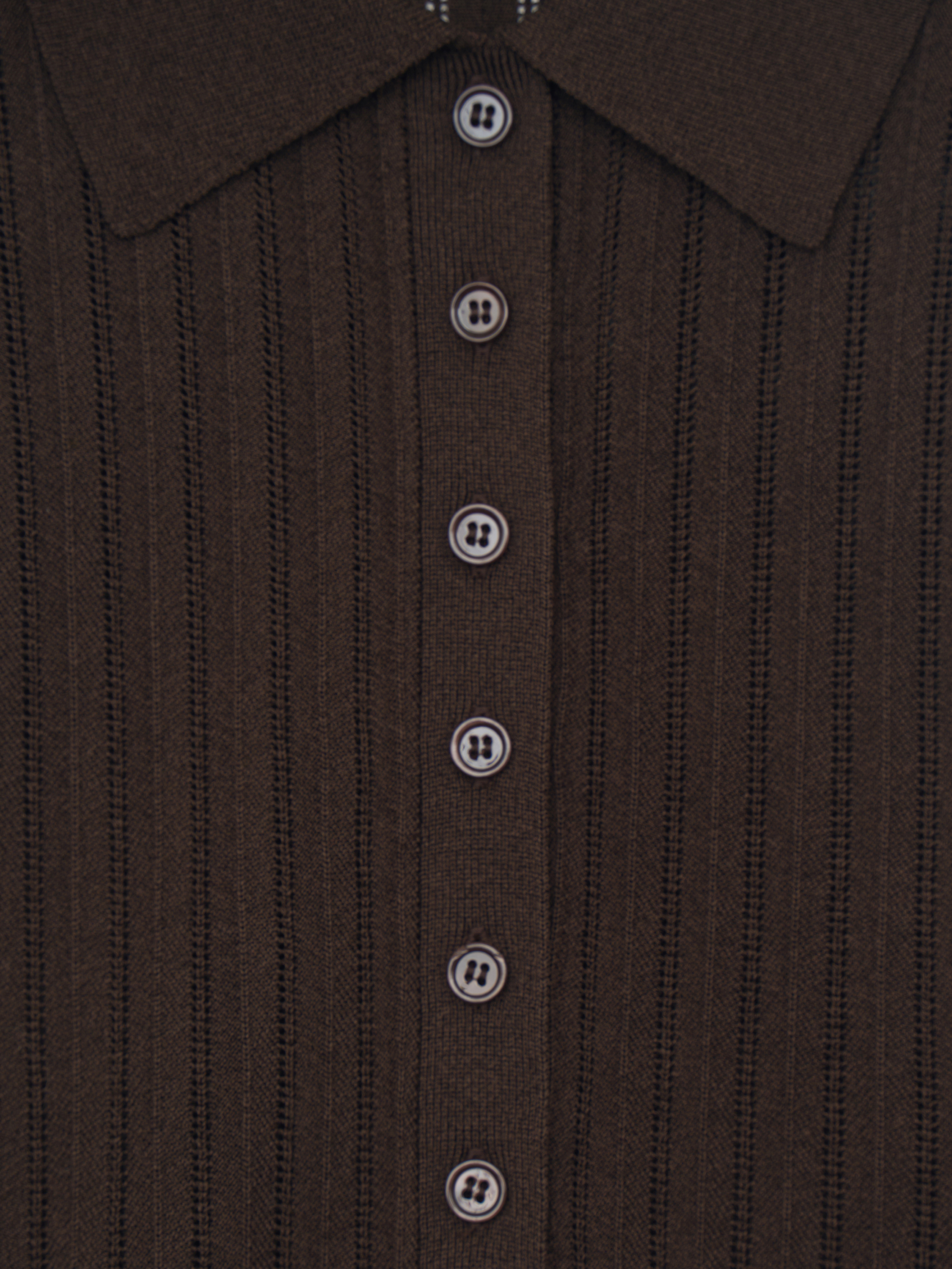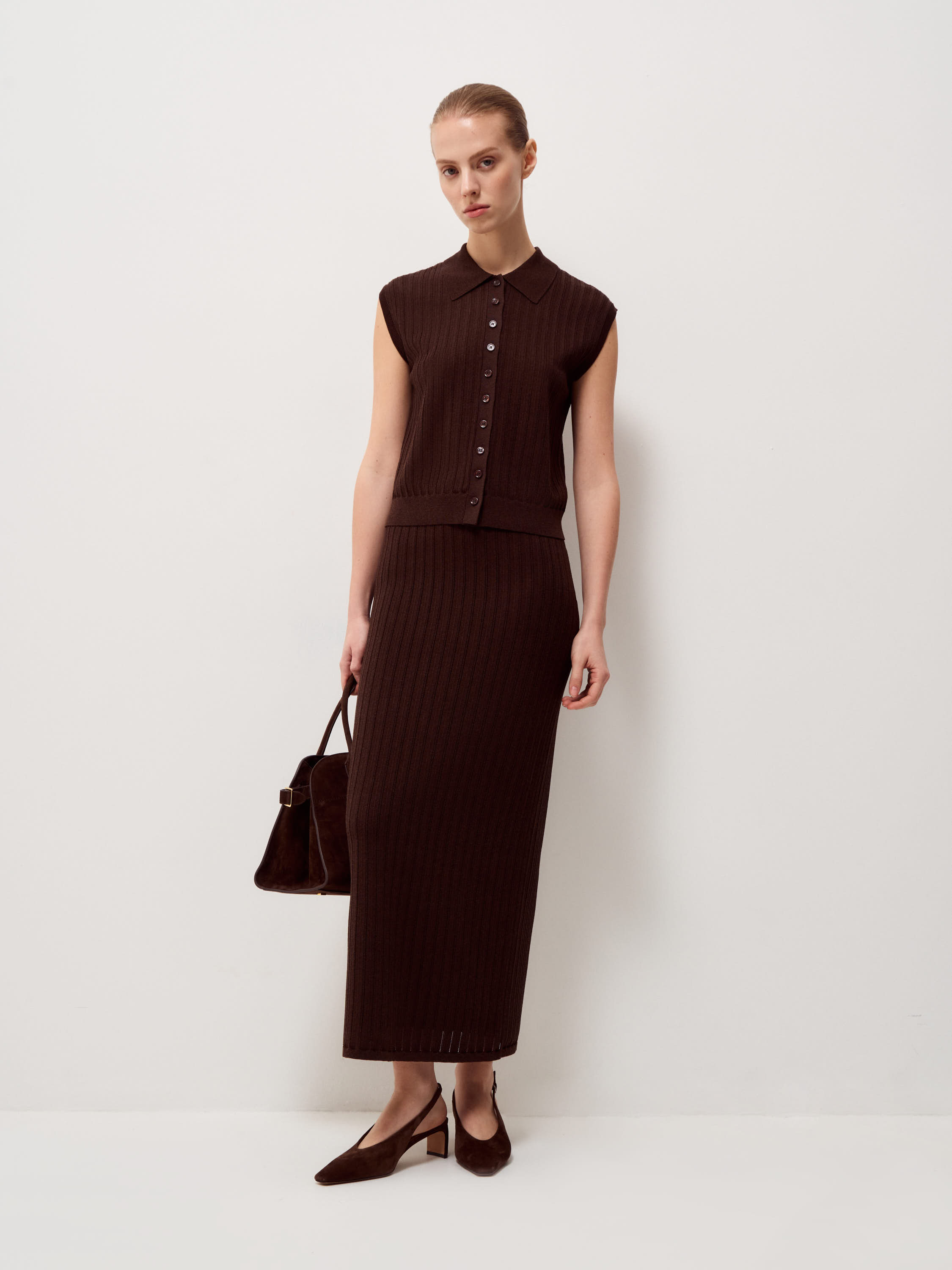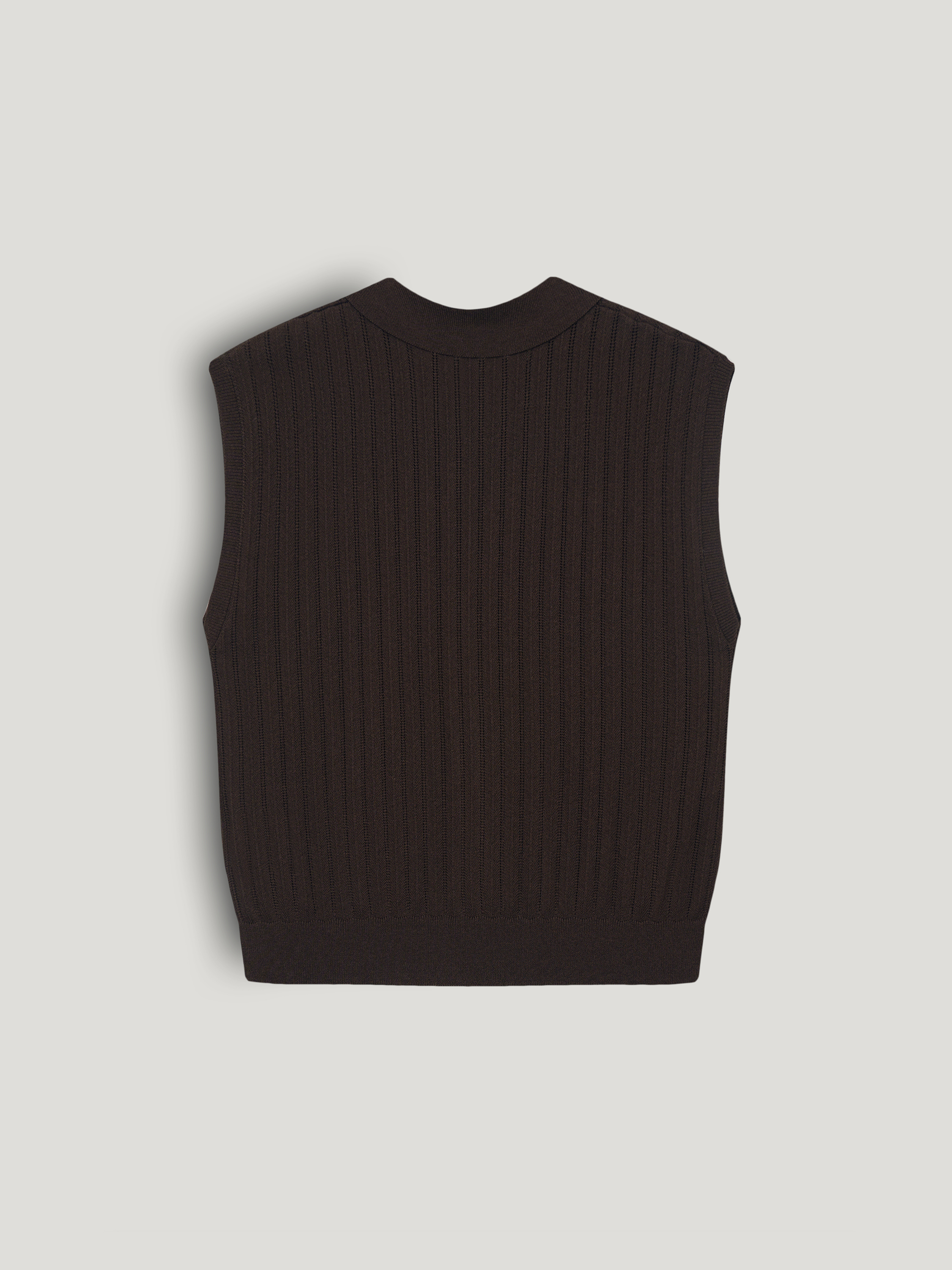 Трикотажный топ выполнен из смесового полотна на основе вискозы с добавлением хлопка и шелка, благодаря материал ощущается мягким, пластичным и при этом держит форму. Вертикальная рельефная вязка задает четкий ритм и визуально вытягивает силуэт, делая модель более собранной. Прямой крой без рукавов уравновешен аккуратным отложным воротником и планкой на пуговицах, что добавляет легкий акцент на зону декольте и позволяет варьировать степень открытости. Плотная резинка по нижнему краю фиксирует посадку и формирует аккуратную линию по талии. Глубокий темно-синий оттенок выглядит насыщенно и благородно, легко сочетается с молочным, бежевым, графитовым и коричневым и подходит как для строгих комплектов, так и для более расслабленных сочетаний.