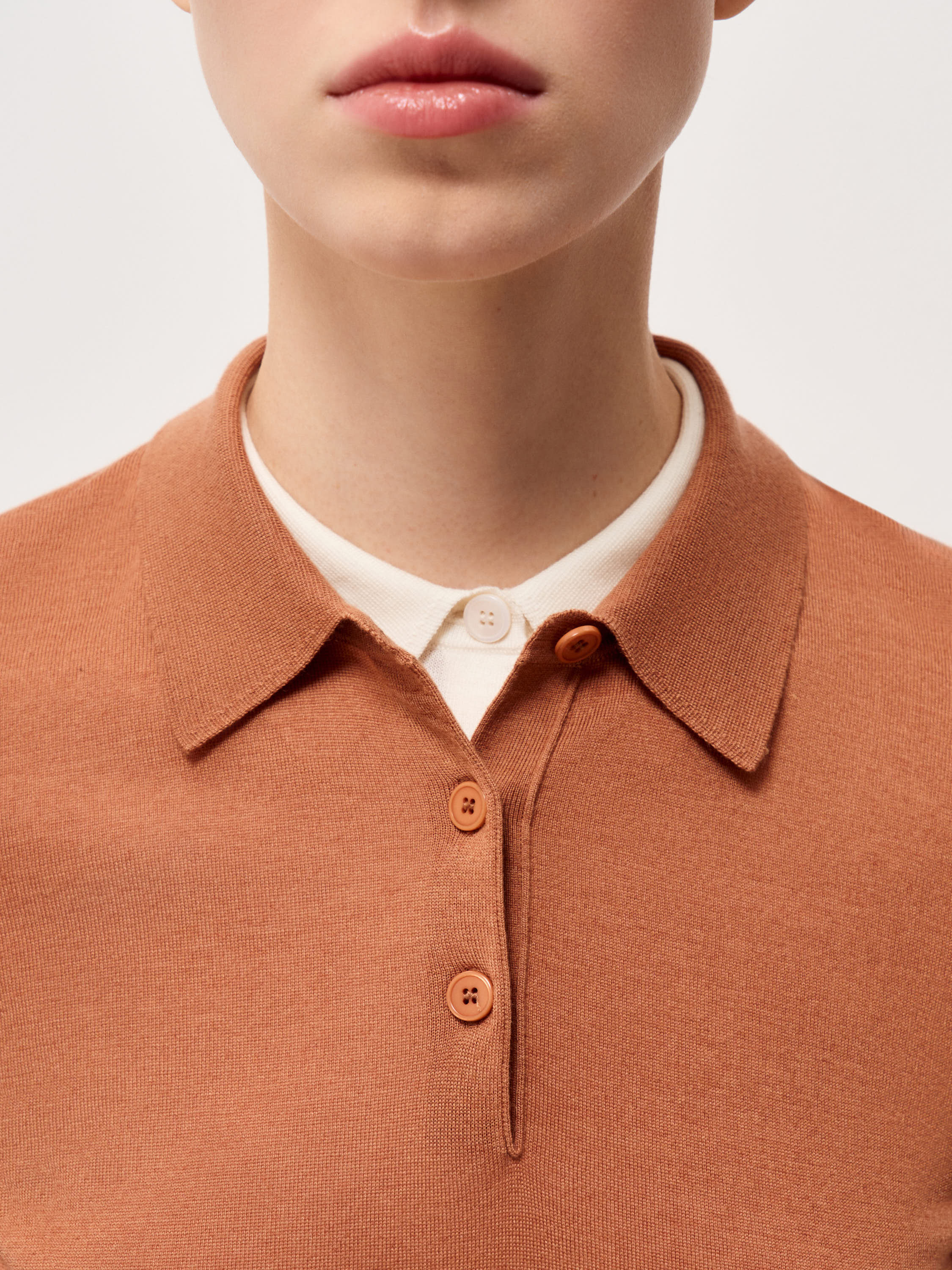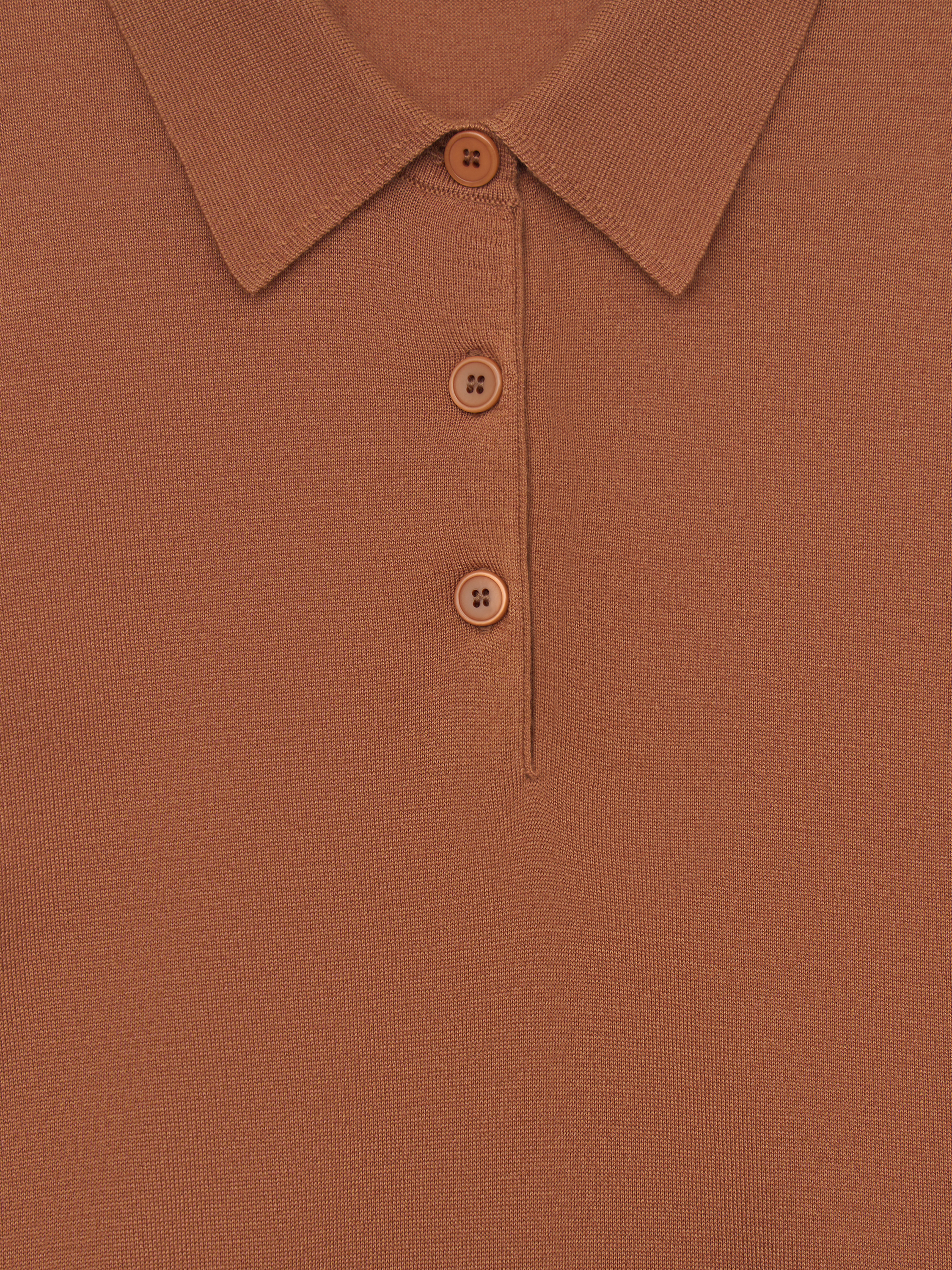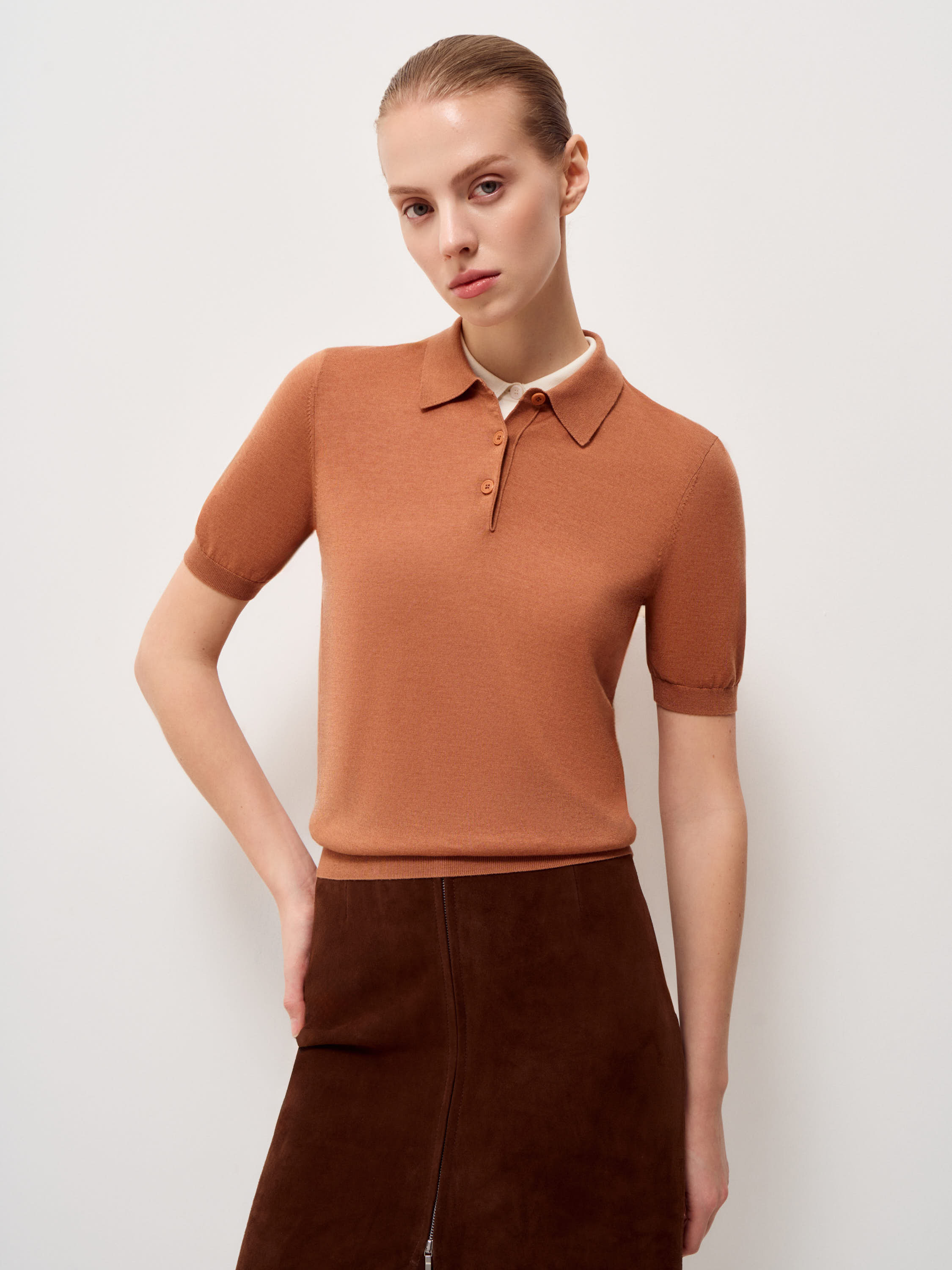 Трикотажный топ выполнен из пряжи на основе мериносовой шерсти с добавлением тенсела. Мериносовая шерсть тонкая и эластичная, хорошо регулирует тепло и не перегревает, подходит для многослойных комплектов. Тенсел добавляет гладкость полотну, повышает износостойкость и делает трикотаж более устойчивым к деформации. Модель прямого кроя, с коротким рукавом и классическим отложным воротником. Планка на три пуговицы формирует аккуратную вертикаль, низ оформлен плотной резинкой, что фиксирует посадку. Оттенок теплый карамельно-коричневый с мягким рыжим подтоном. Топ уместен в повседневных образах с денимом, а также в более собранных комплектах с костюмными брюками или юбкой.