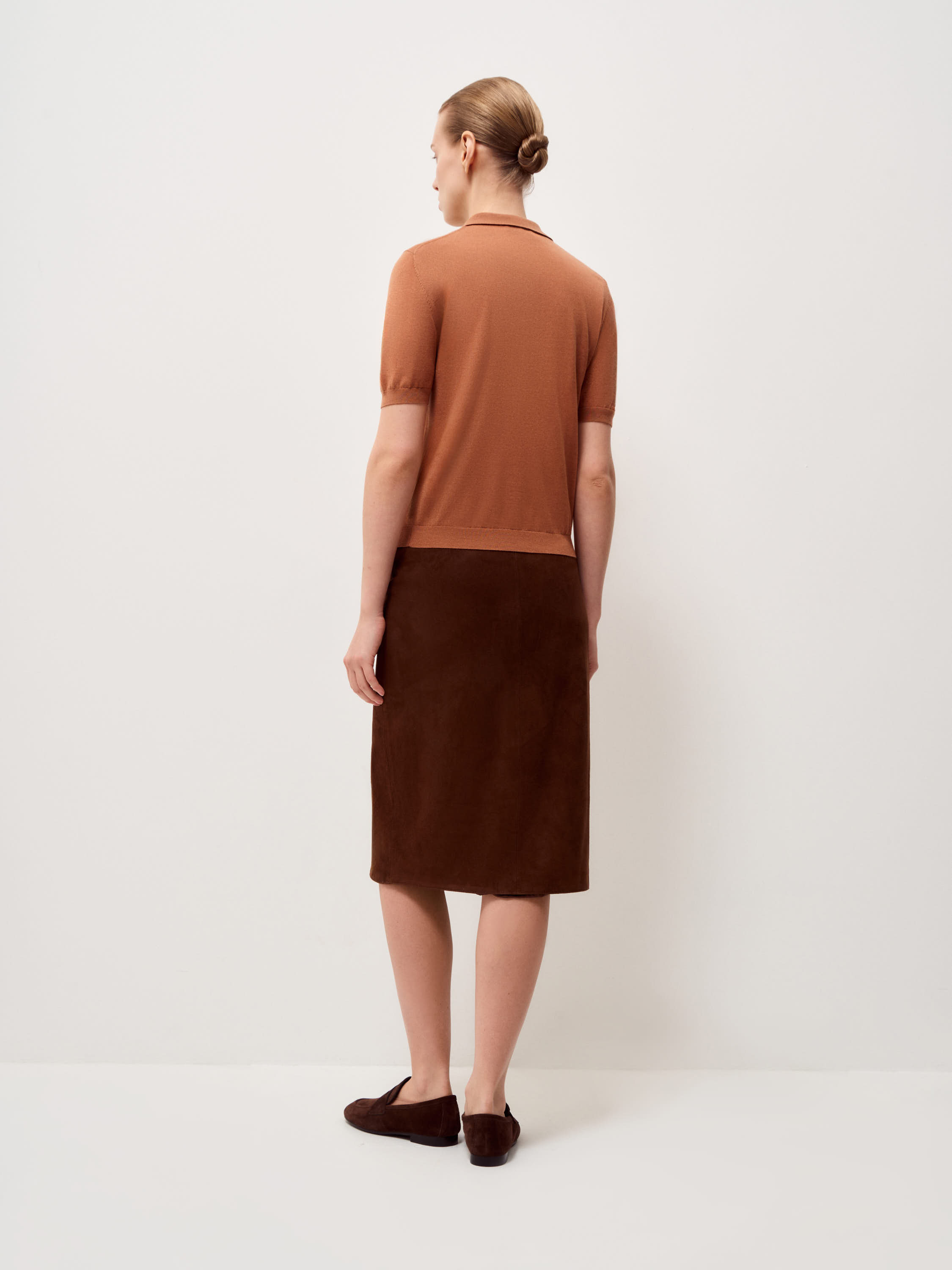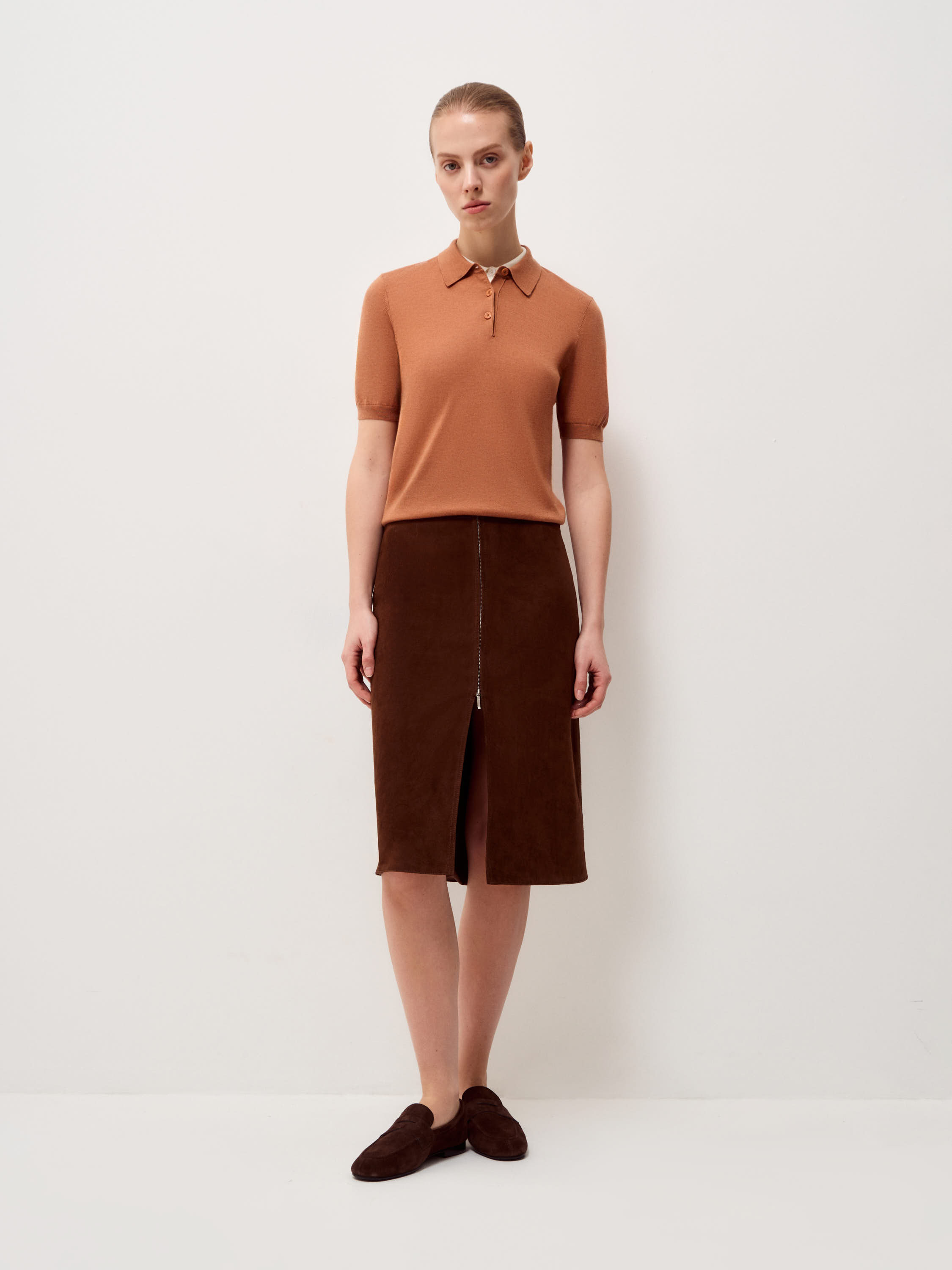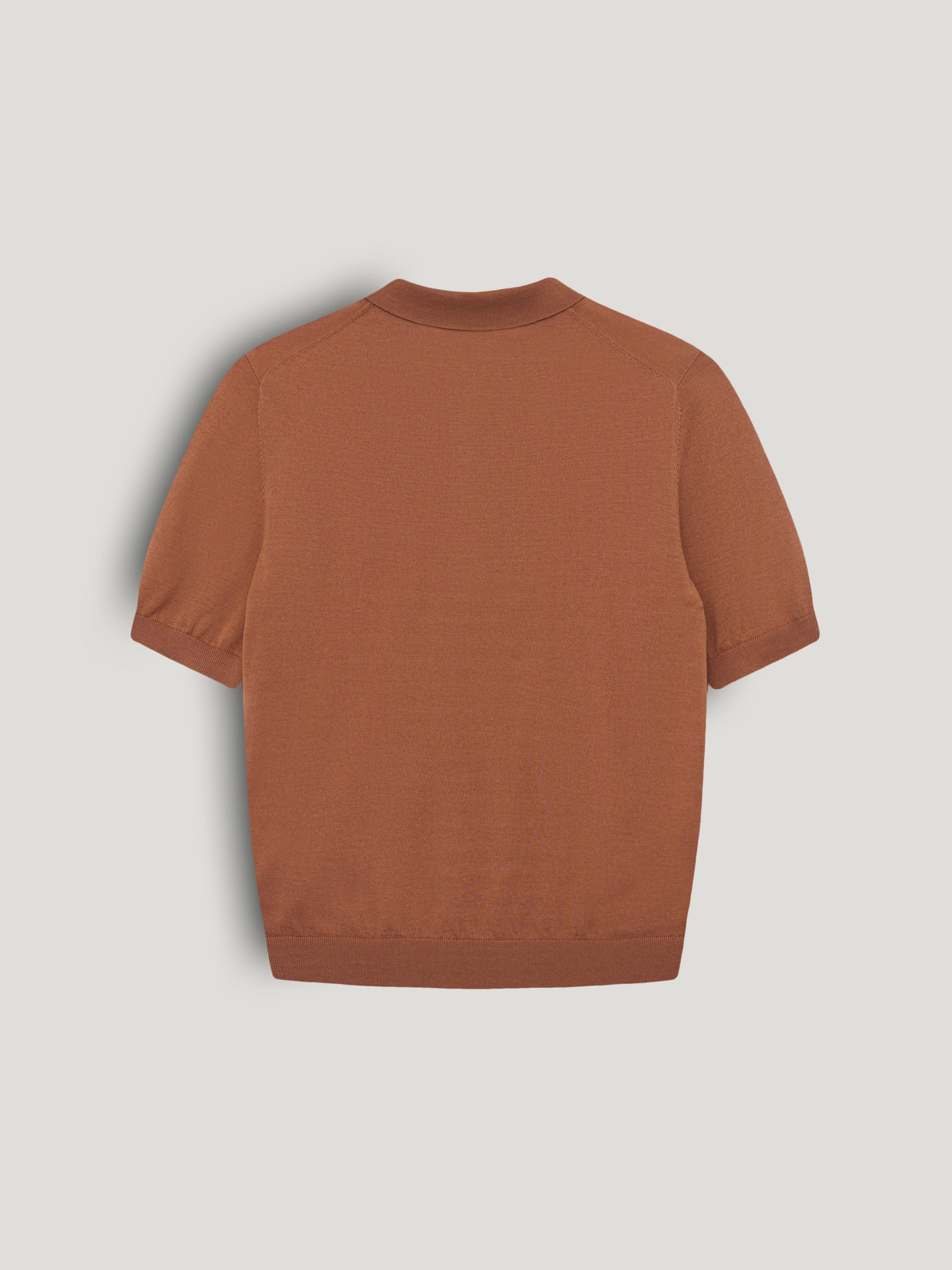 Трикотажный топ выполнен из пряжи на основе мериносовой шерсти с добавлением тенсела. Мериносовая шерсть тонкая и эластичная, хорошо регулирует тепло и не перегревает, подходит для многослойных комплектов. Тенсел добавляет гладкость полотну, повышает износостойкость и делает трикотаж более устойчивым к деформации. Модель прямого кроя, с коротким рукавом и классическим отложным воротником. Планка на три пуговицы формирует аккуратную вертикаль, низ оформлен плотной резинкой, что фиксирует посадку. Оттенок теплый карамельно-коричневый с мягким рыжим подтоном. Топ уместен в повседневных образах с денимом, а также в более собранных комплектах с костюмными брюками или юбкой.