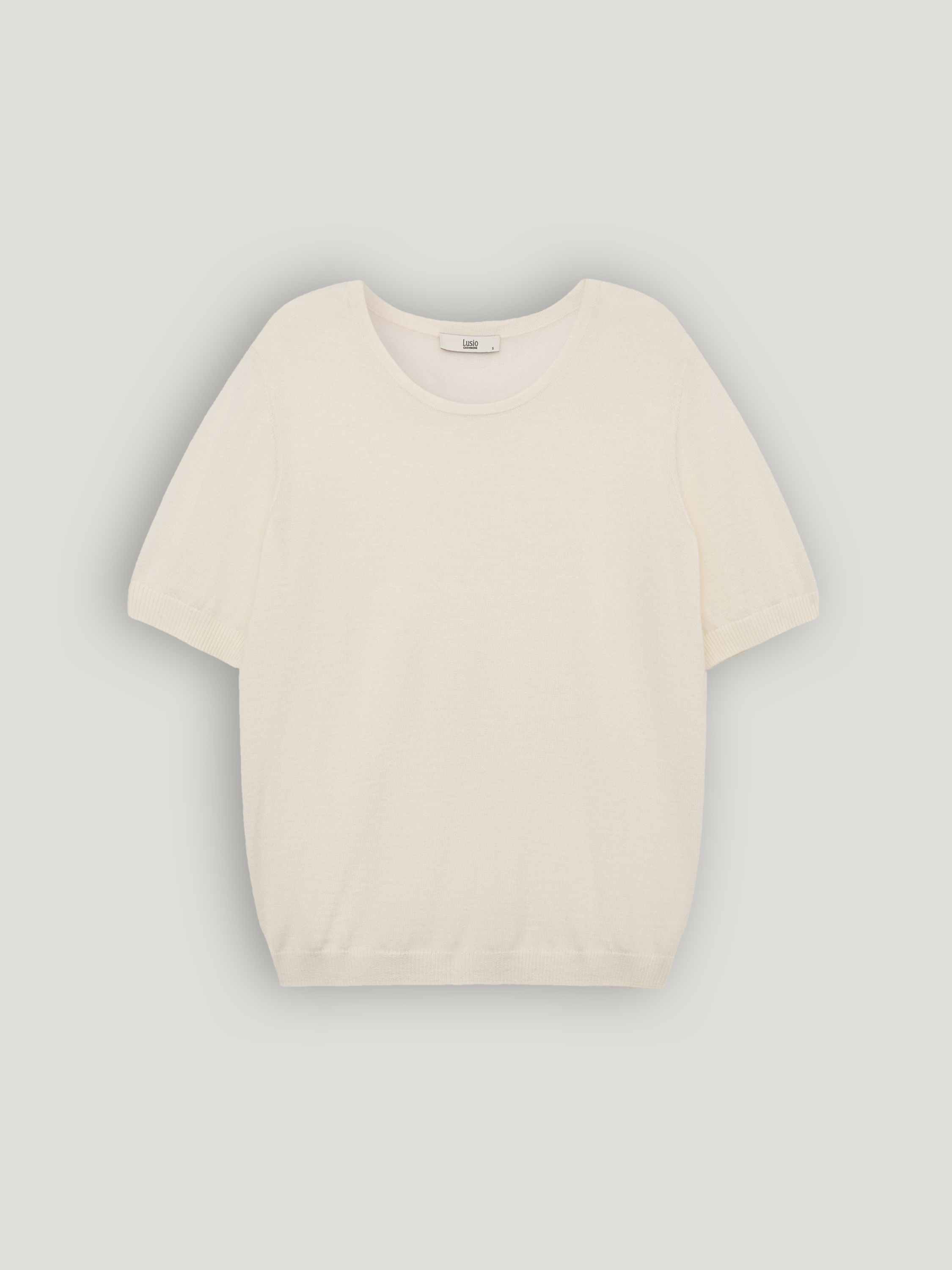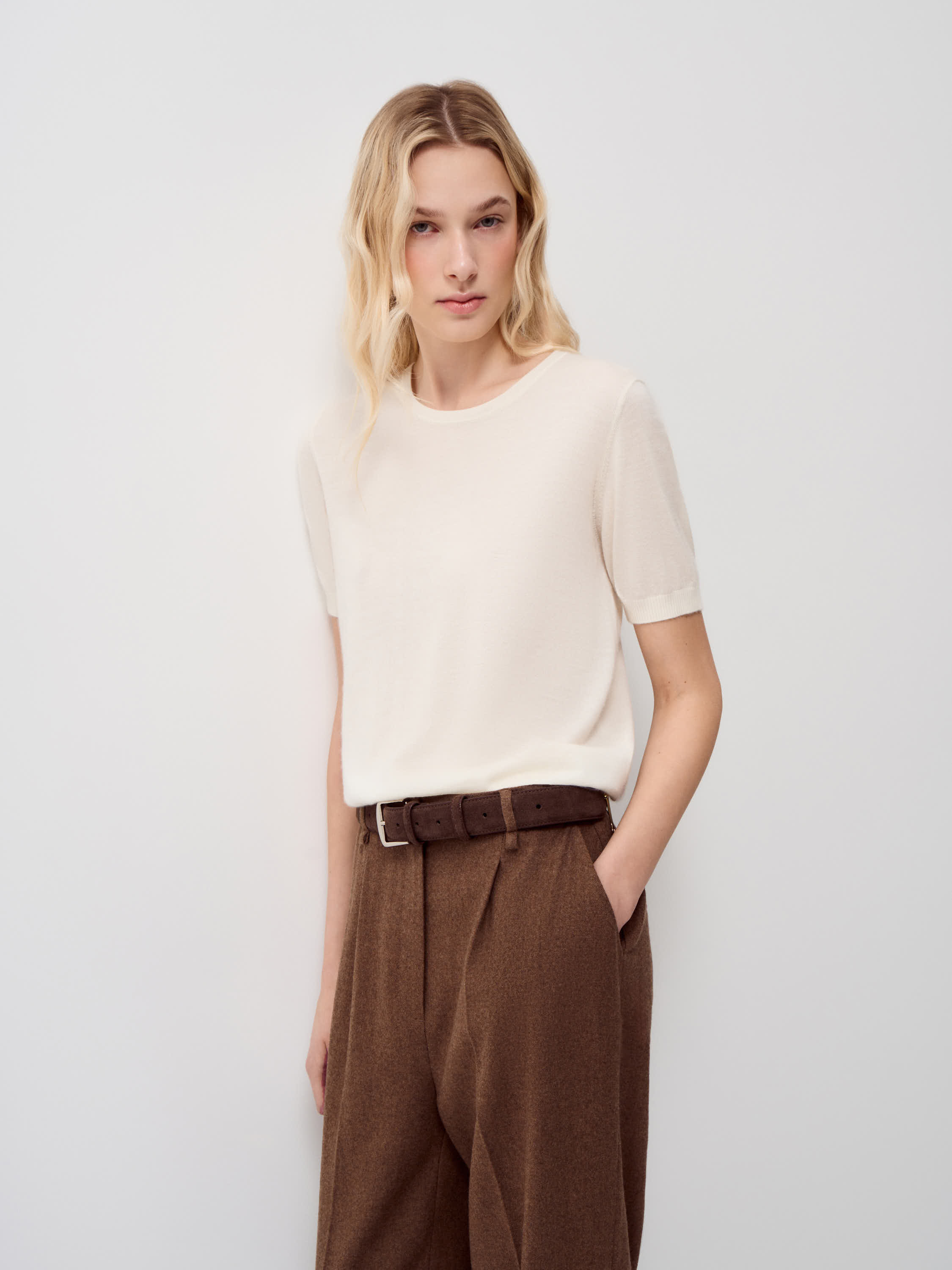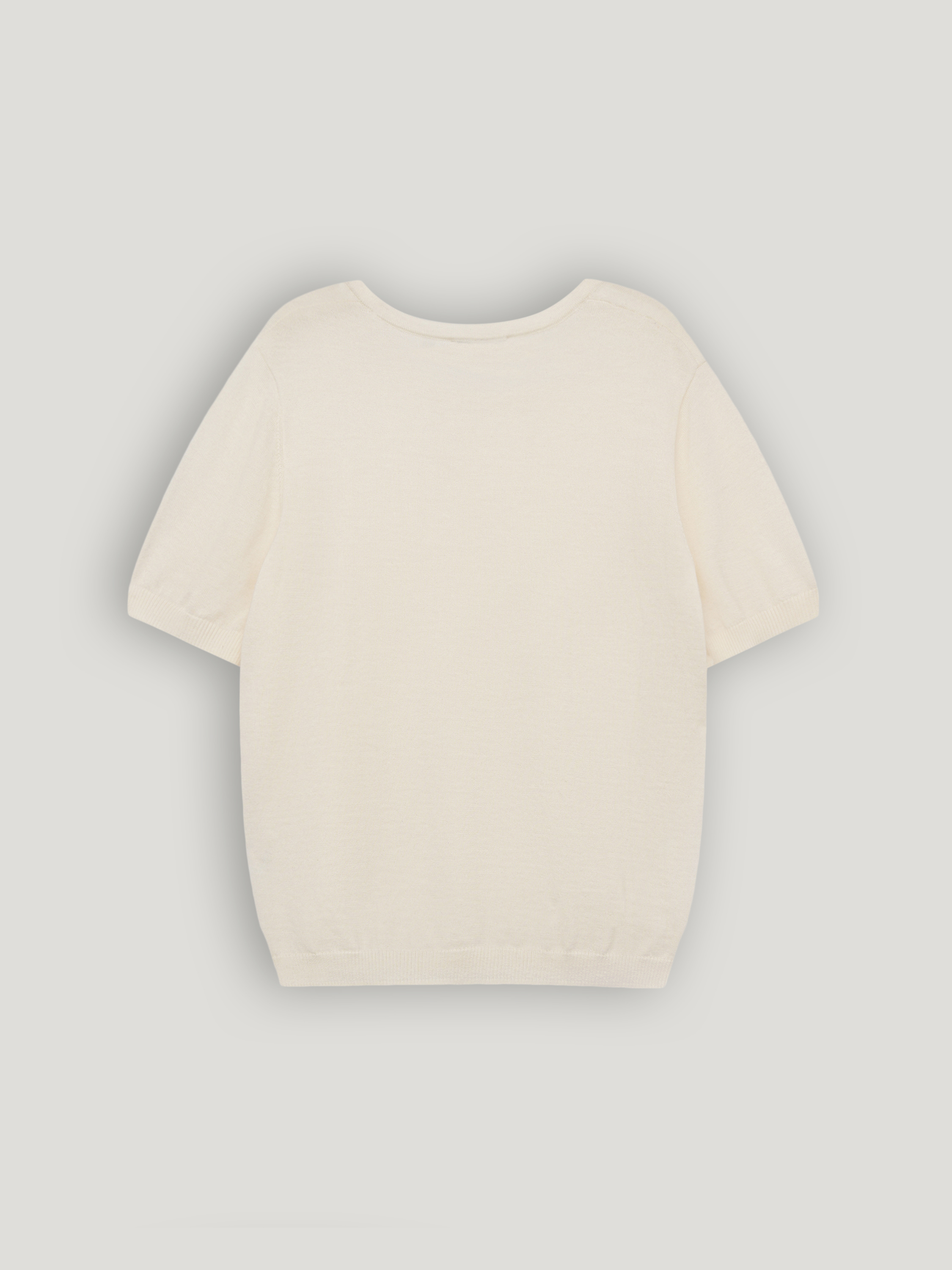 Топ из 100% кашемира с тонкой, гладкой текстурой и мягкой матовой поверхностью. Материал исключительно нежный к коже, легкий, хорошо сохраняет тепло и при этом не утяжеляет силуэт. Кашемир пластично ложится, аккуратно драпируется и комфортен в носке в течение дня. Крой прямой, с коротким рукавом и округлой линией горловины, формирует лаконичный, сбалансированный силуэт. Модель выполнена в светлом кремовом оттенке. Топ подходит для сочетаний с жакетами, кардиганами и костюмными брюками, а также органично смотрится с юбками миди и денимом в спокойных повседневных образах.