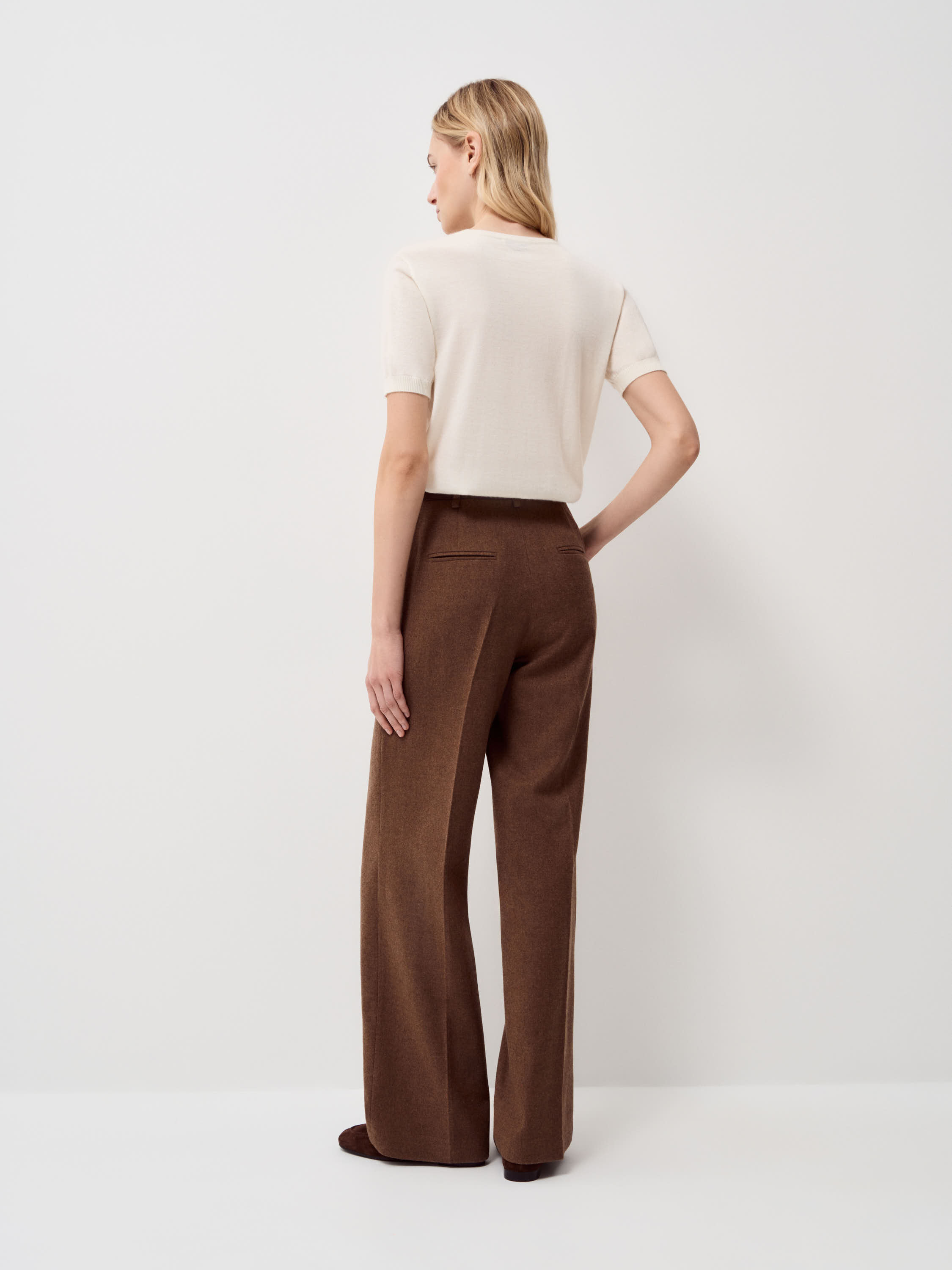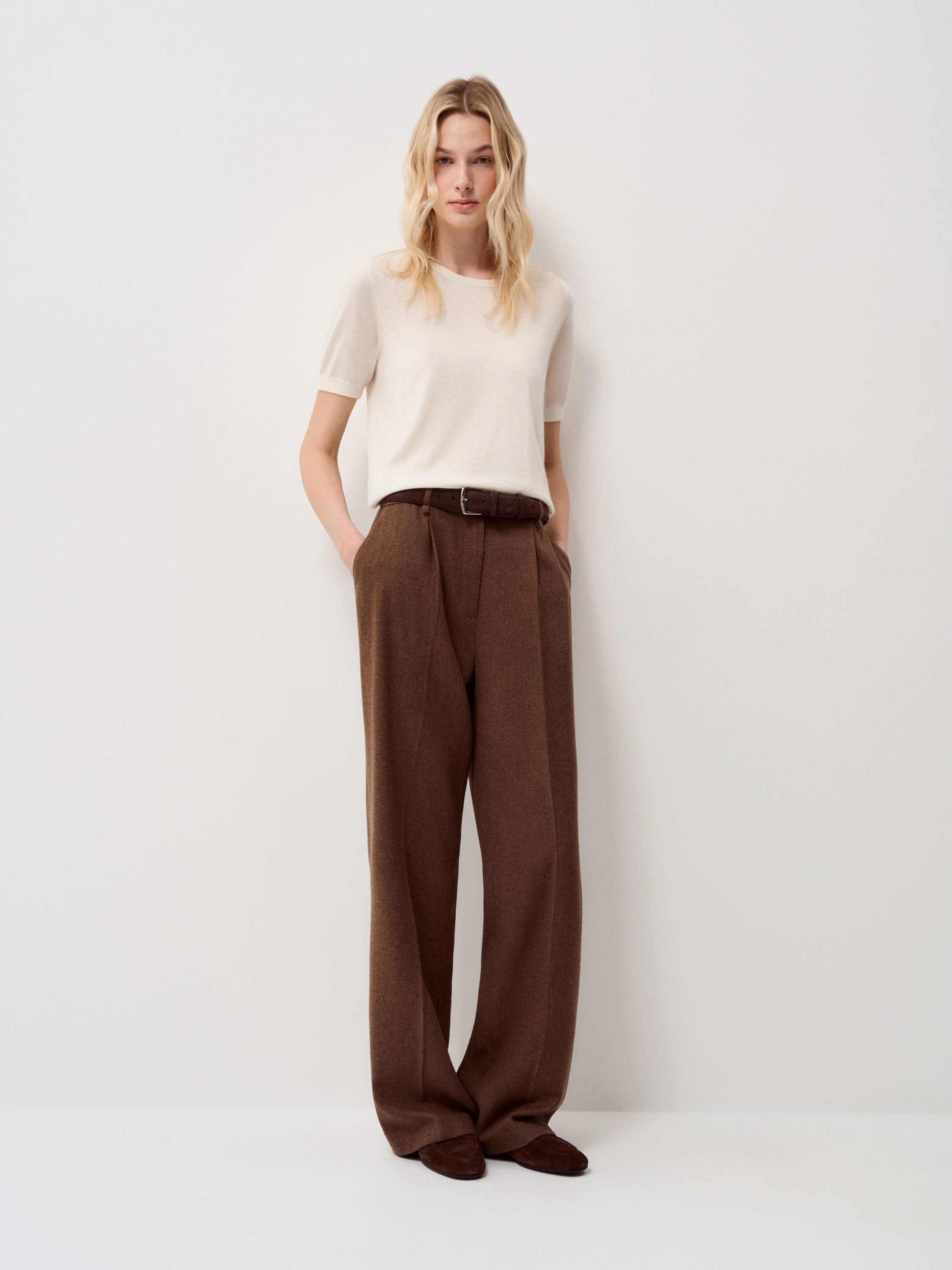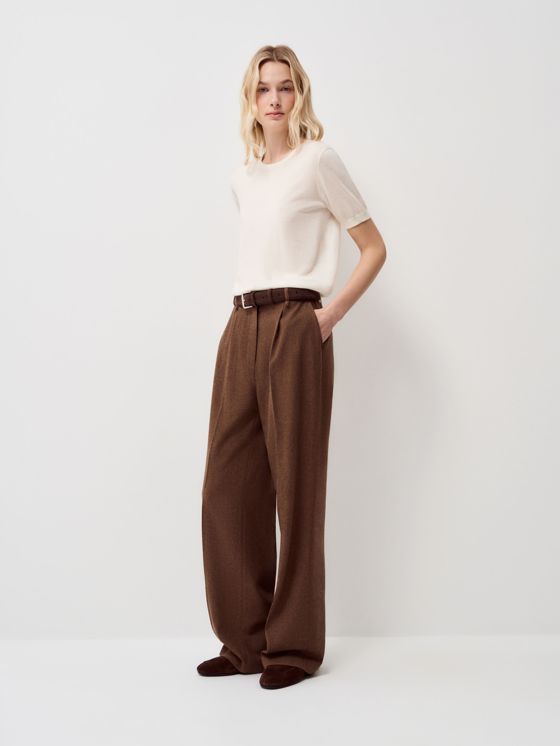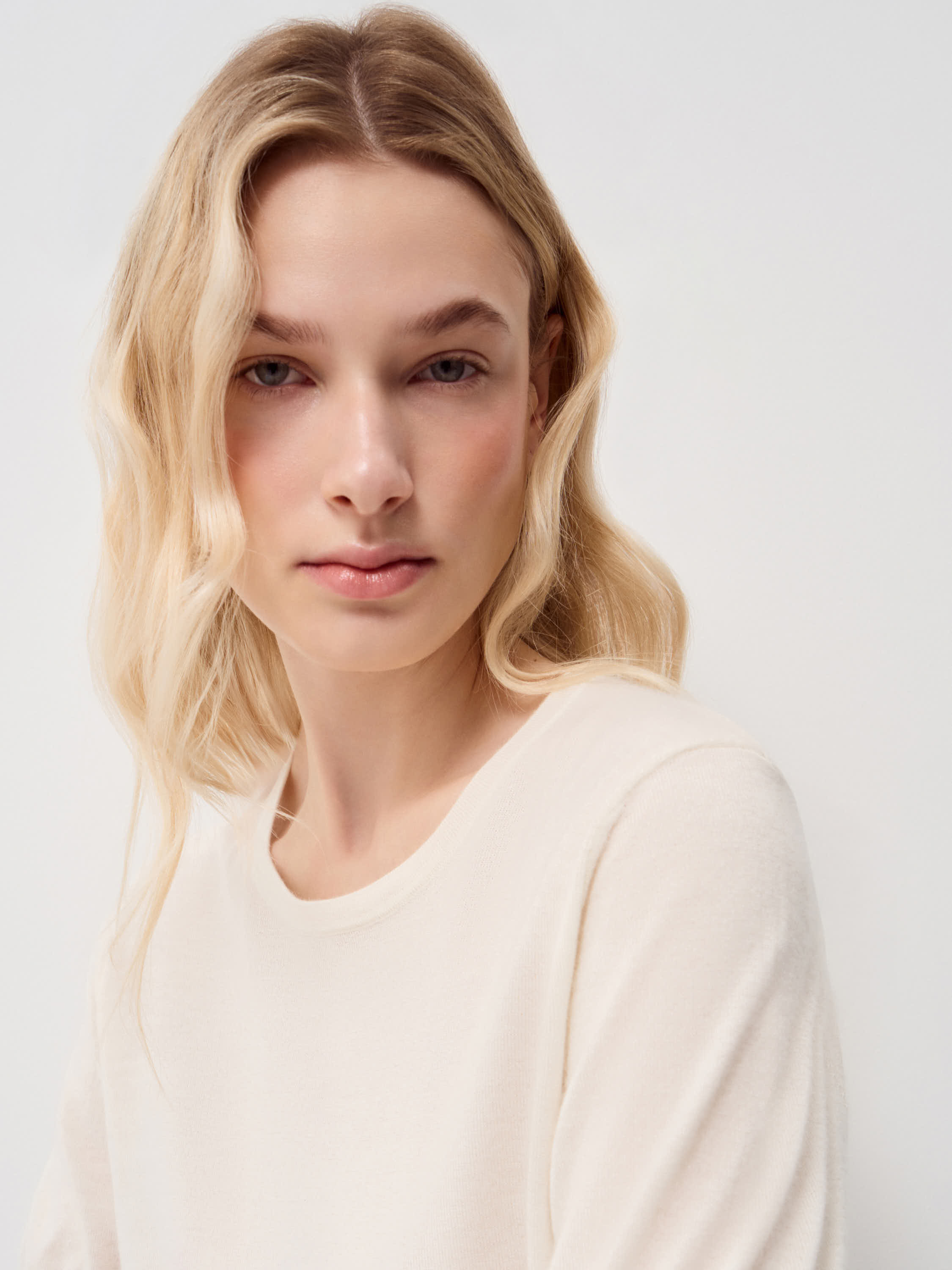 Топ из 100% кашемира с тонкой, гладкой текстурой и мягкой матовой поверхностью. Материал исключительно нежный к коже, легкий, хорошо сохраняет тепло и при этом не утяжеляет силуэт. Кашемир пластично ложится, аккуратно драпируется и комфортен в носке в течение дня. Крой прямой, с коротким рукавом и округлой линией горловины, формирует лаконичный, сбалансированный силуэт. Модель выполнена в светлом кремовом оттенке. Топ подходит для сочетаний с жакетами, кардиганами и костюмными брюками, а также органично смотрится с юбками миди и денимом в спокойных повседневных образах.