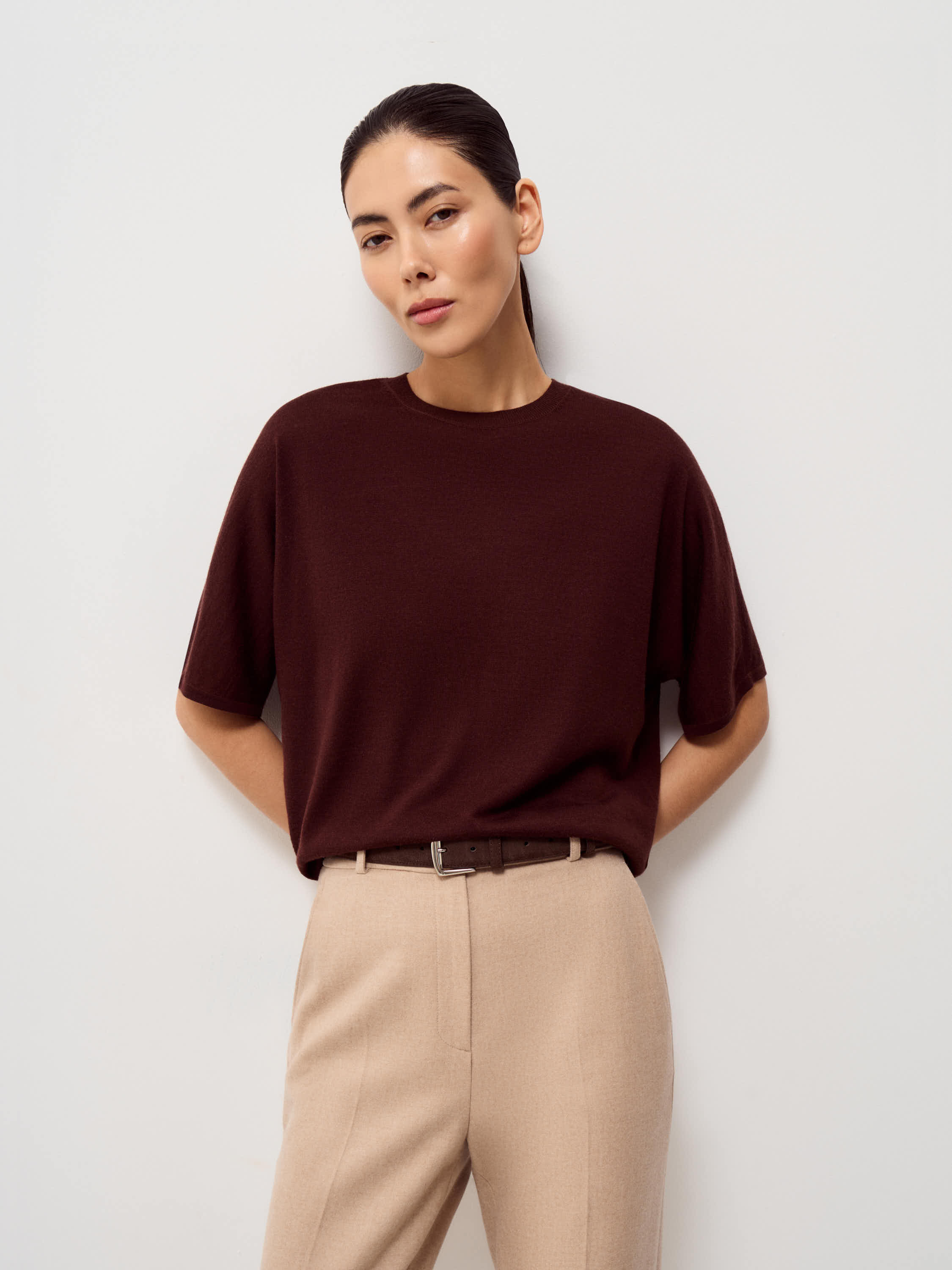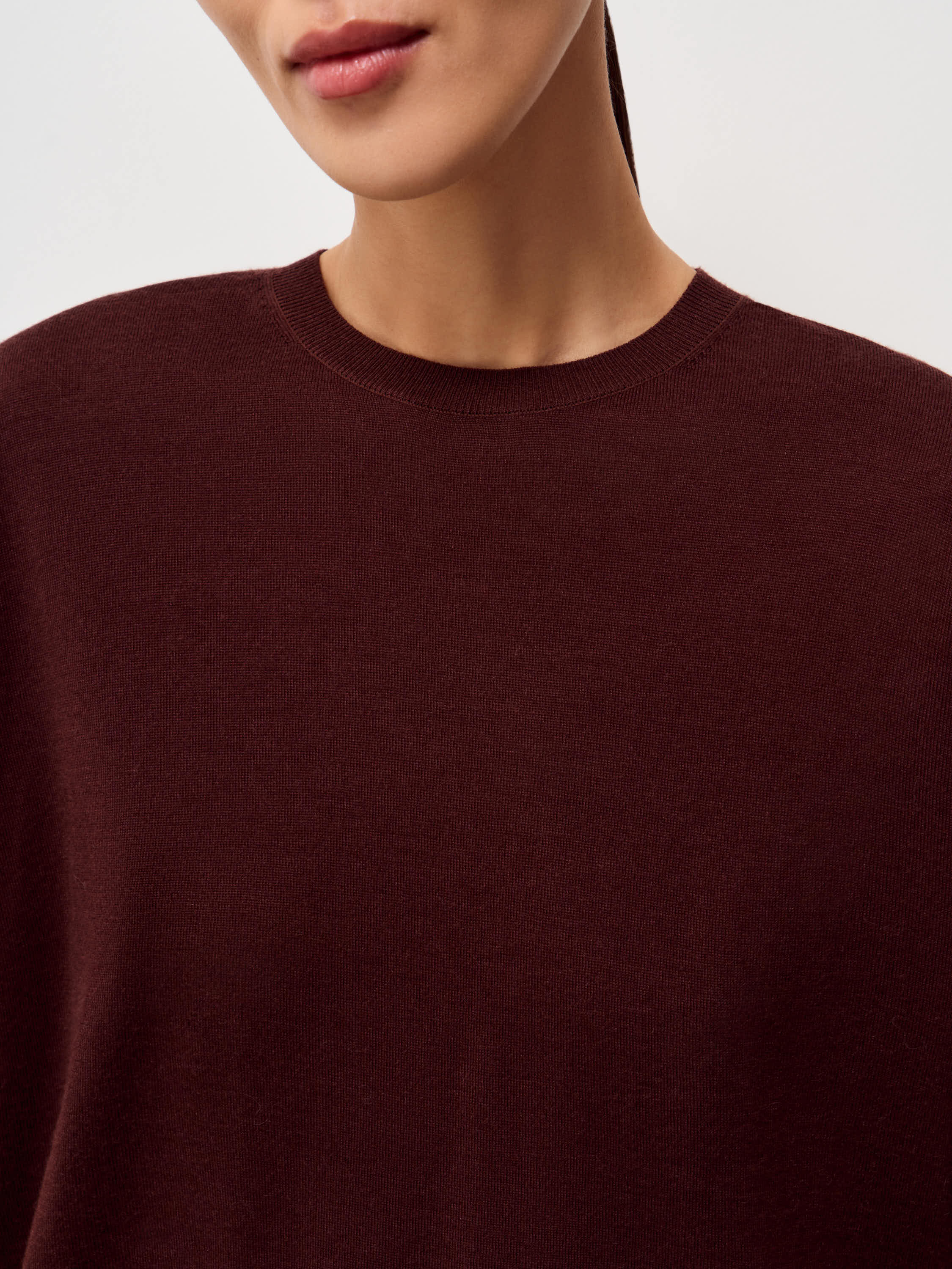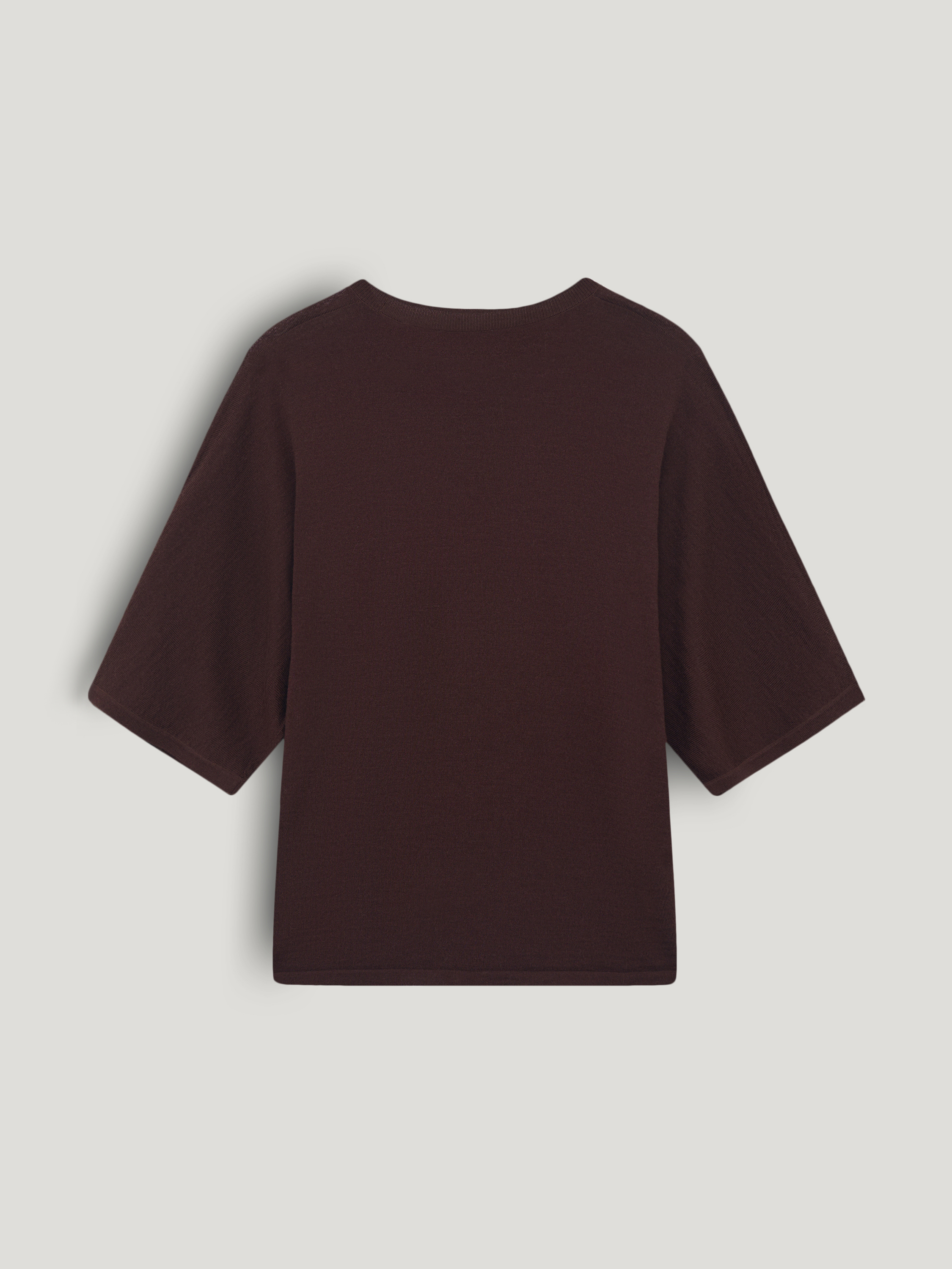 Трикотажный топ выполнен из пряжи на основе мериносовой шерсти с добавлением шелка. Мериносовая шерсть тонкая, упругая и хорошо сохраняет форму, регулирует тепло и подходит для ношения в течение всего дня. Шелк придает полотну гладкость и легкий естественный блеск, делает трикотаж более прочным и устойчивым к растяжению. Модель прямого, свободного кроя, с округлой горловиной и удлиненным рукавом до локтя. Линия плеча мягкая, силуэт ровный, без избыточного объема. Оттенок глубокий темно-коричневый, с холодным подтоном. Топ уместен в повседневных образах с денимом, а также в более собранных комплектах с костюмными брюками или юбкой.