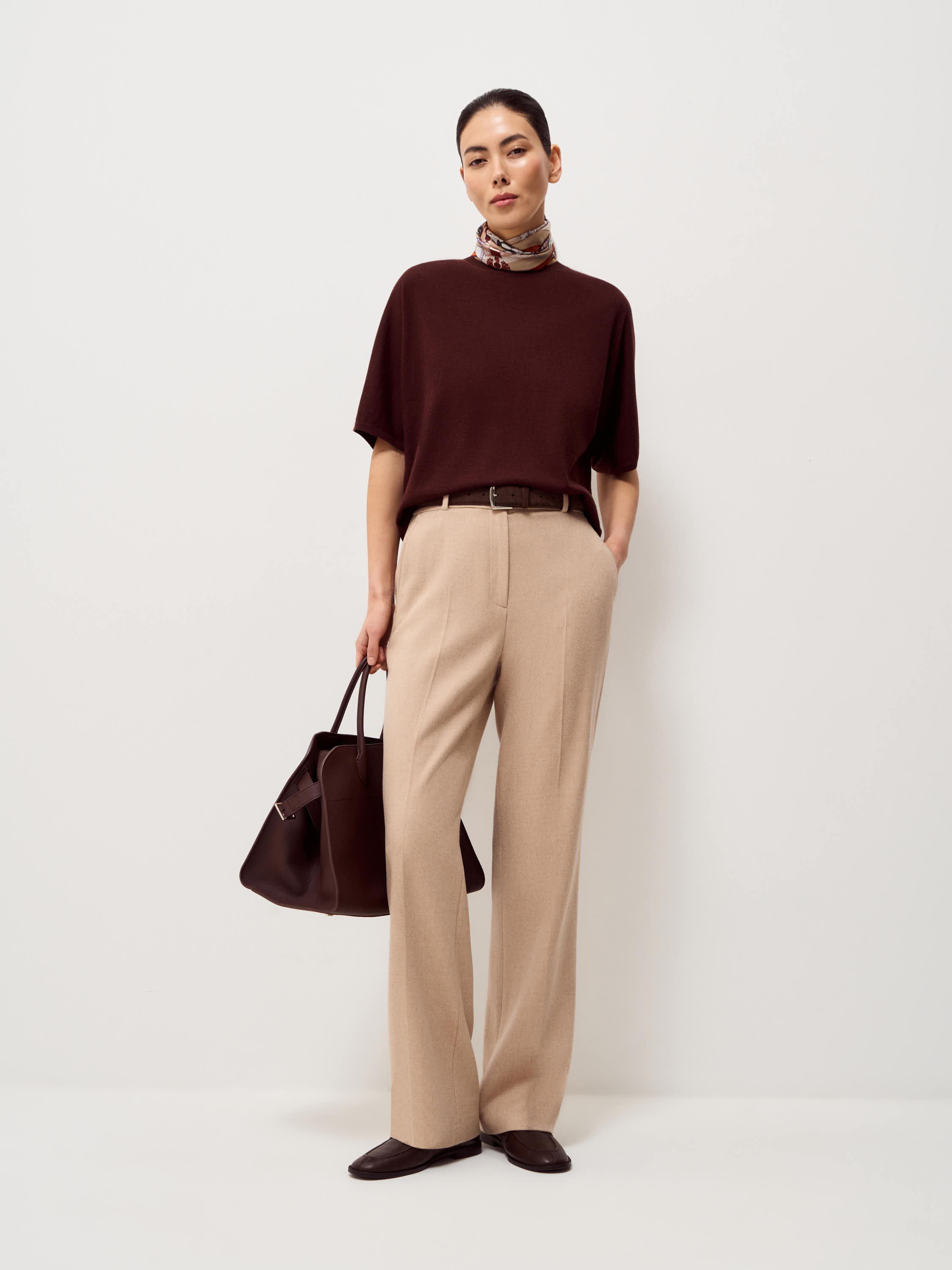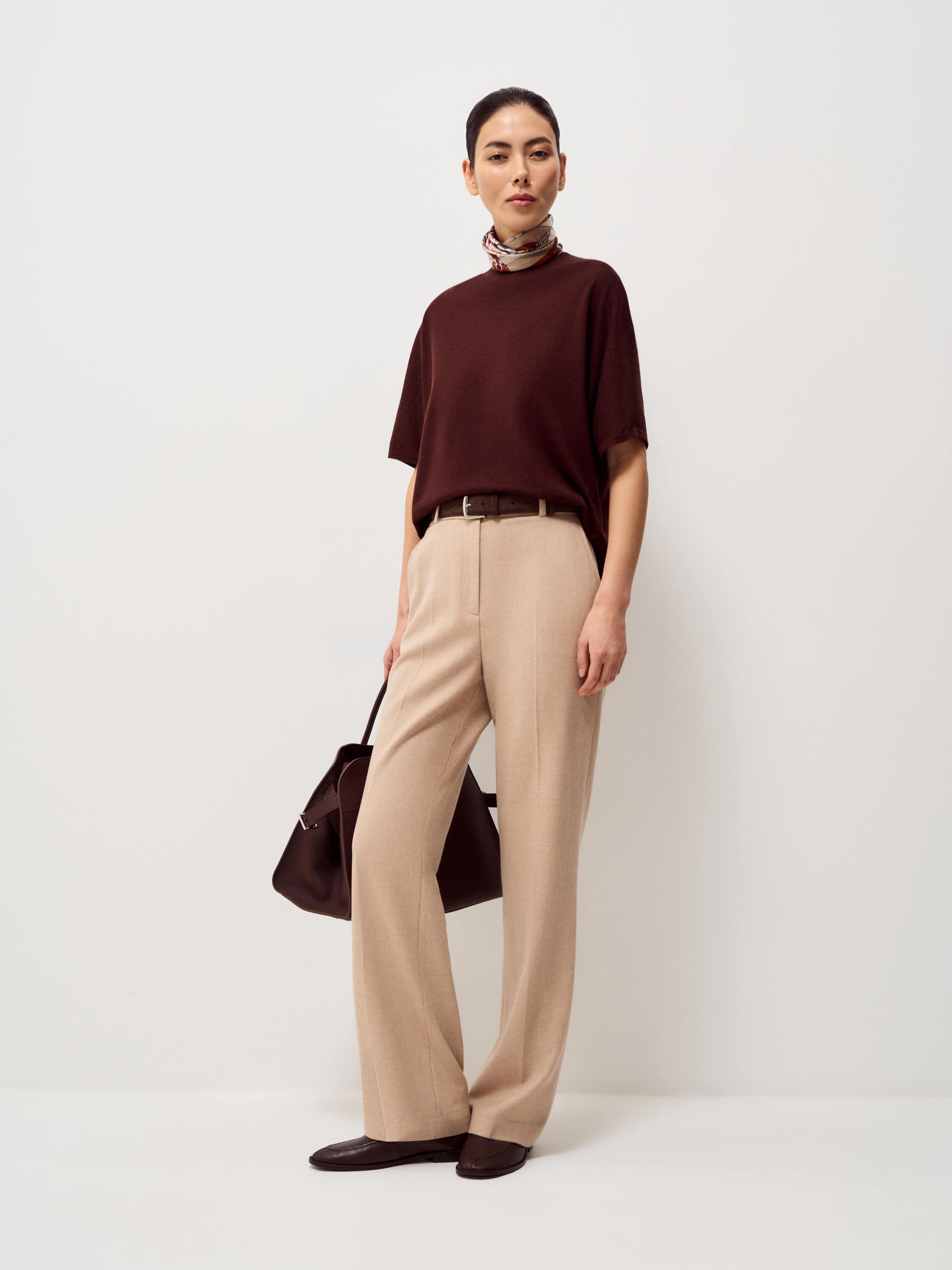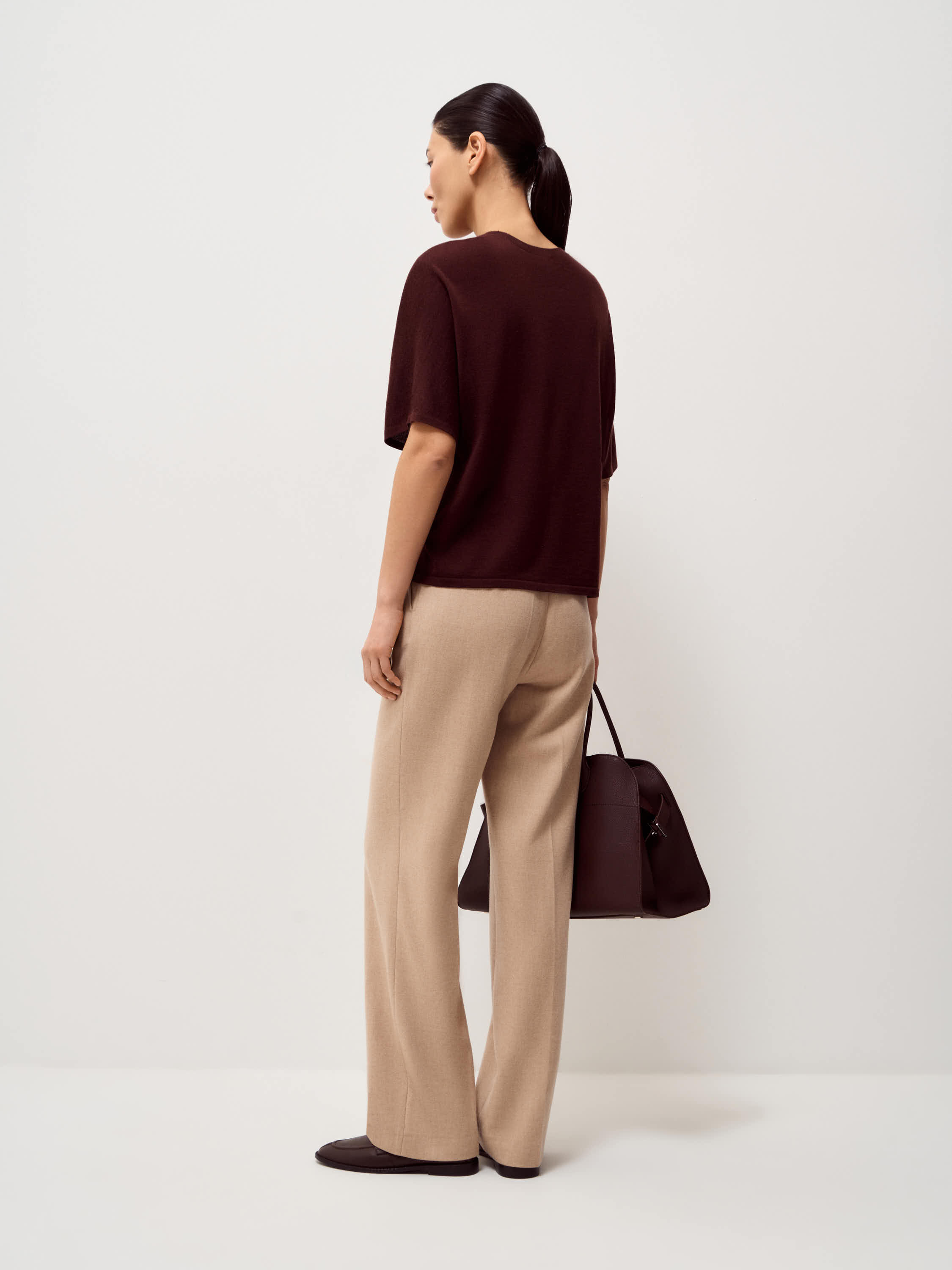 Трикотажный топ выполнен из пряжи на основе мериносовой шерсти с добавлением шелка. Мериносовая шерсть тонкая, упругая и хорошо сохраняет форму, регулирует тепло и подходит для ношения в течение всего дня. Шелк придает полотну гладкость и легкий естественный блеск, делает трикотаж более прочным и устойчивым к растяжению. Модель прямого, свободного кроя, с округлой горловиной и удлиненным рукавом до локтя. Линия плеча мягкая, силуэт ровный, без избыточного объема. Оттенок глубокий темно-коричневый, с холодным подтоном. Топ уместен в повседневных образах с денимом, а также в более собранных комплектах с костюмными брюками или юбкой.