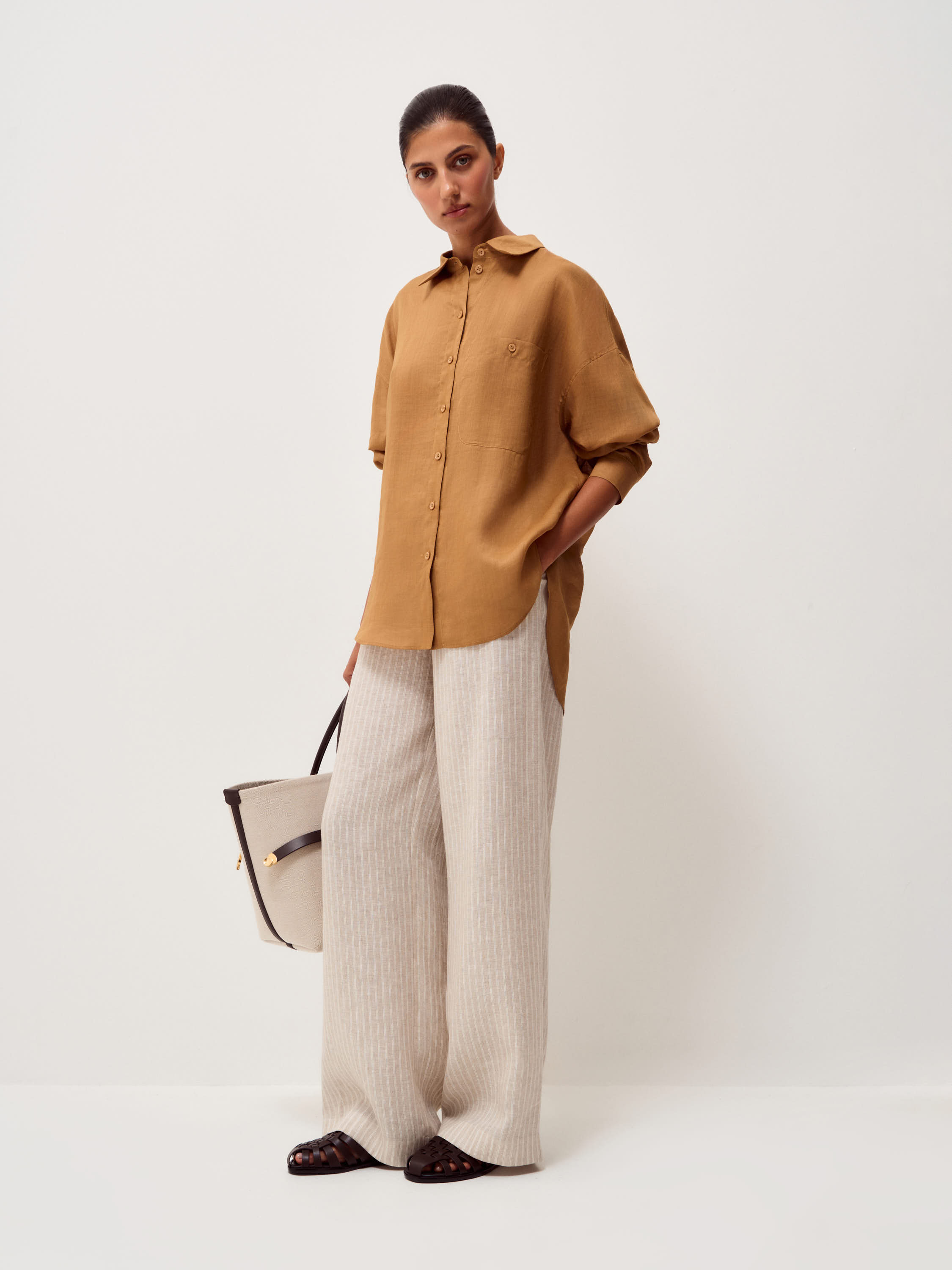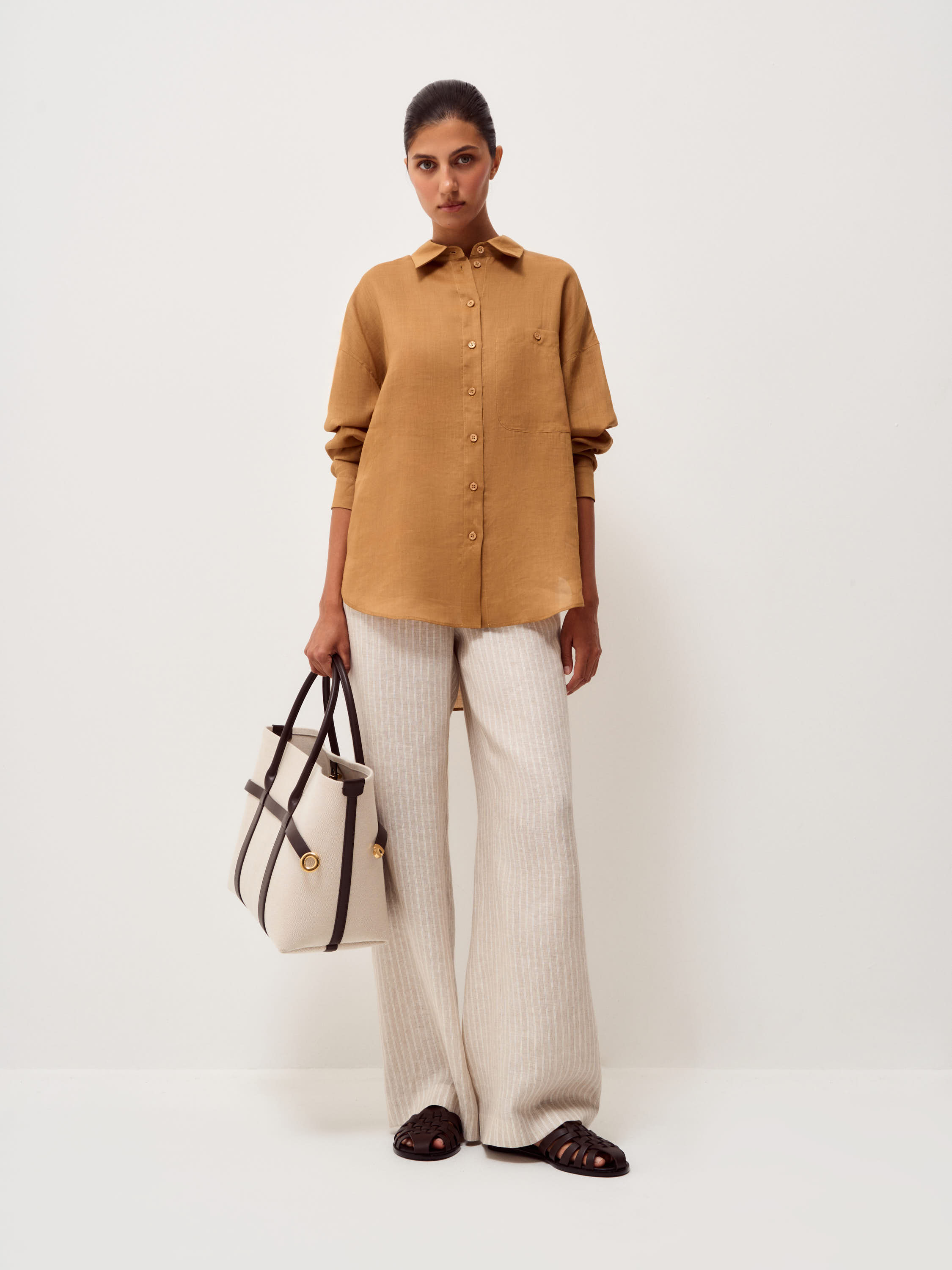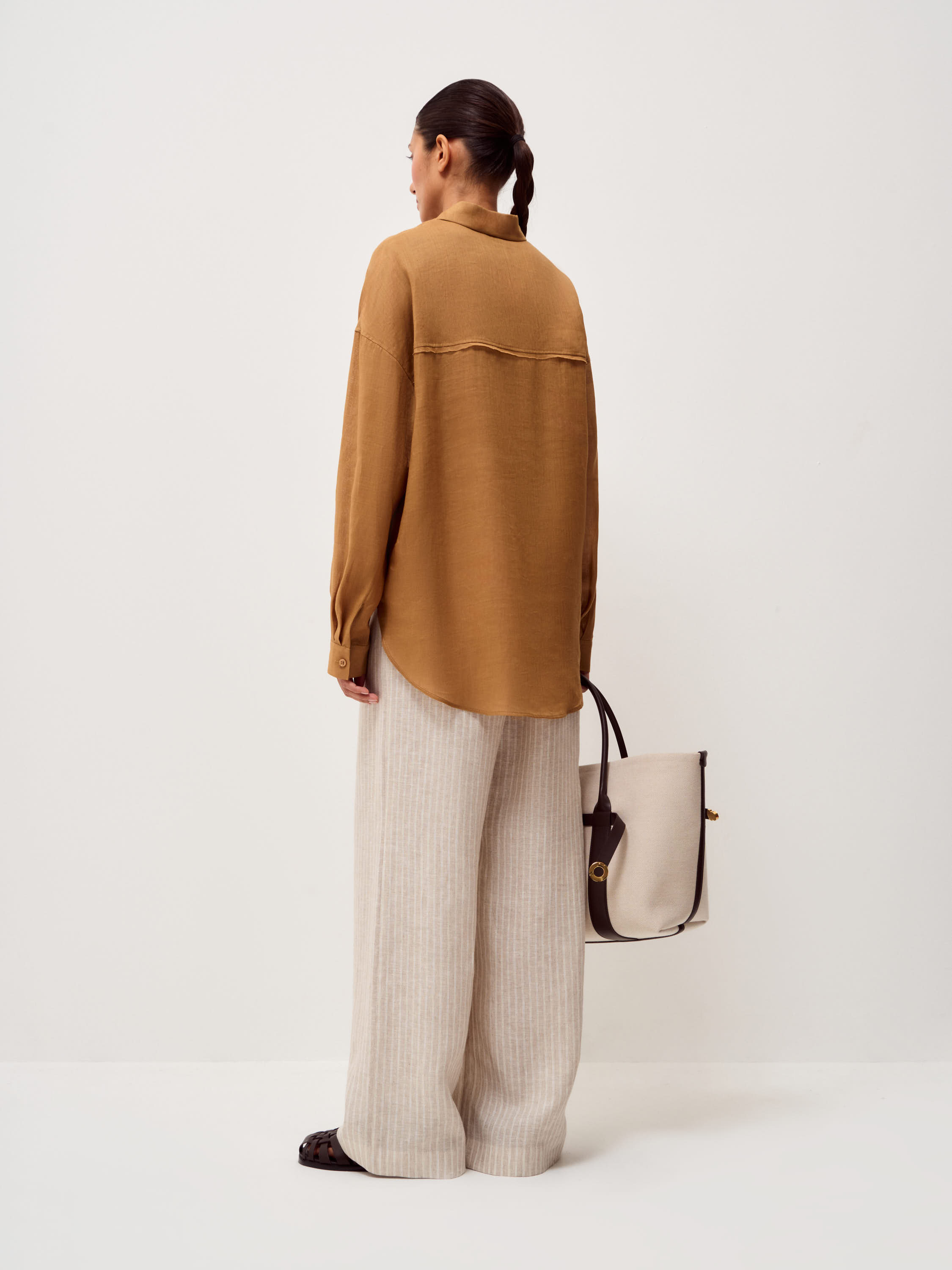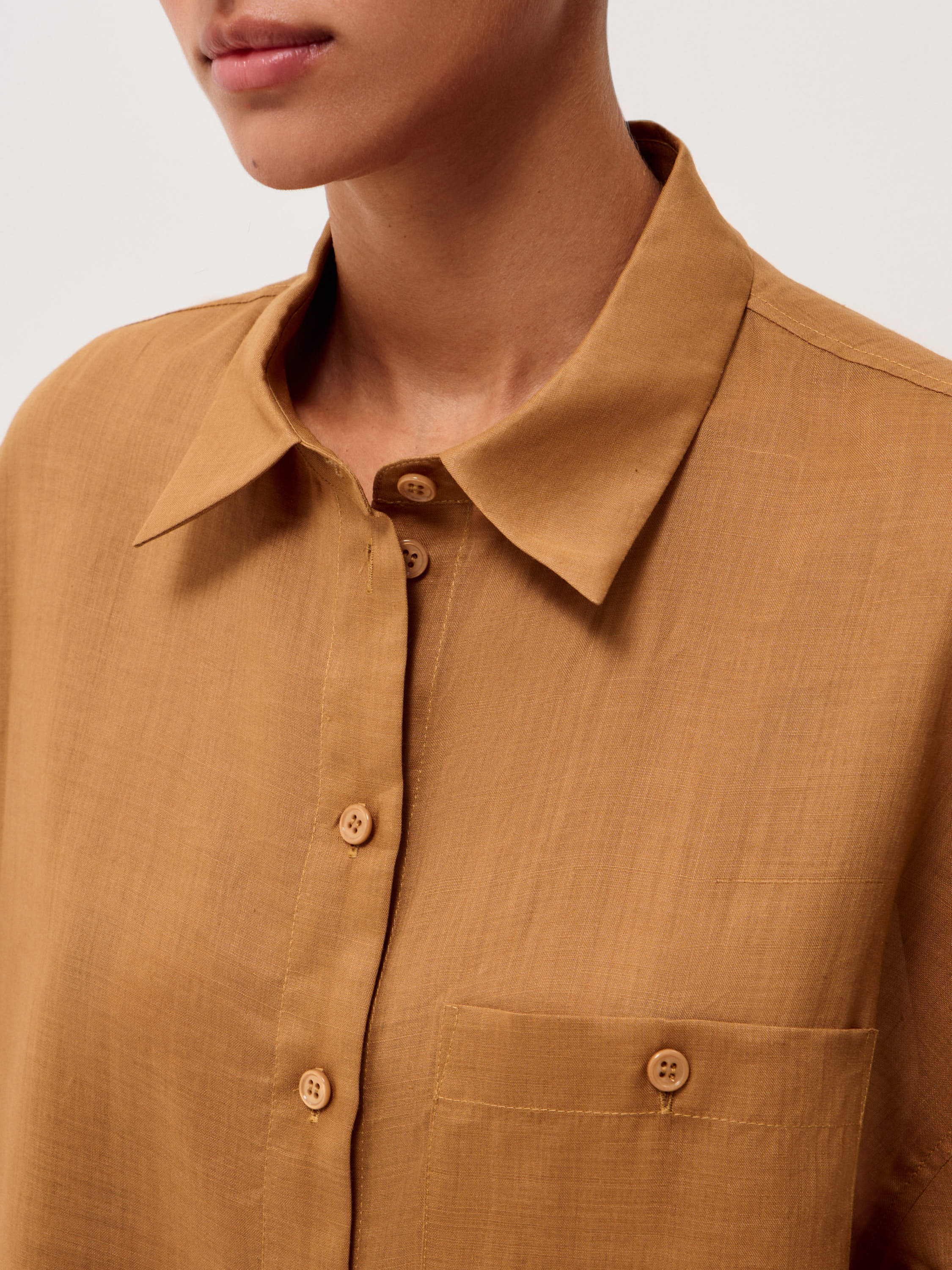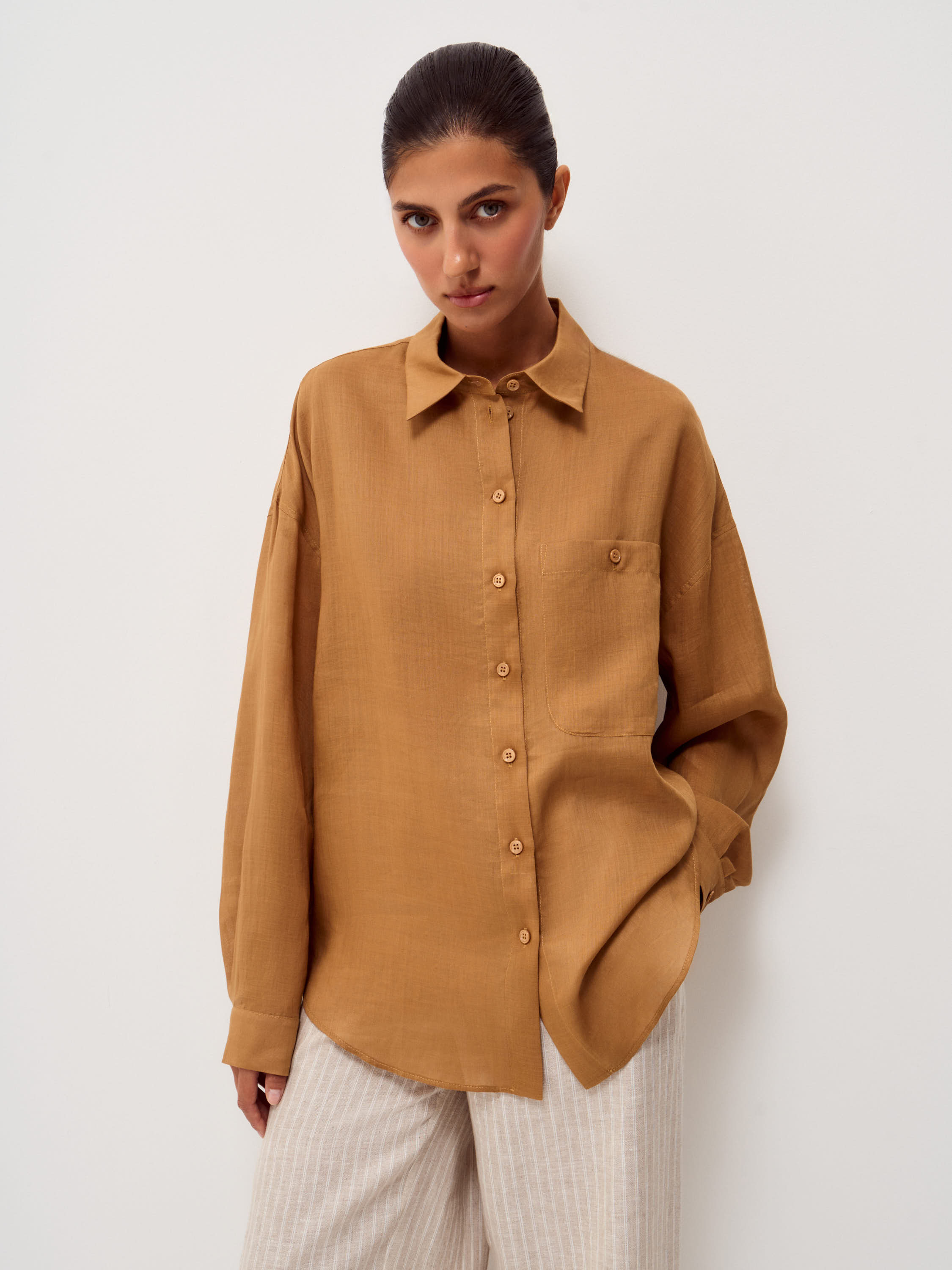 Рубашка свободного силуэта выполнена из 100% рами. Рами — натуральное волокно растительного происхождения, которое отличается прочностью, воздухопроницаемостью и характерной слегка фактурной поверхностью. Материал хорошо держит форму, сохраняет аккуратный внешний вид и обеспечивает комфорт в теплую погоду. Модель с классическим отложным воротником и застежкой на пуговицы дополнена спущенной линией плеча, что формирует более расслабленный силуэт. Длинные рукава с манжетами и накладной нагрудный карман поддерживают лаконичную архитектуру кроя. Теплый карамельно-медовый оттенок придает модели выразительность и легко сочетается с вещами в натуральной гамме.