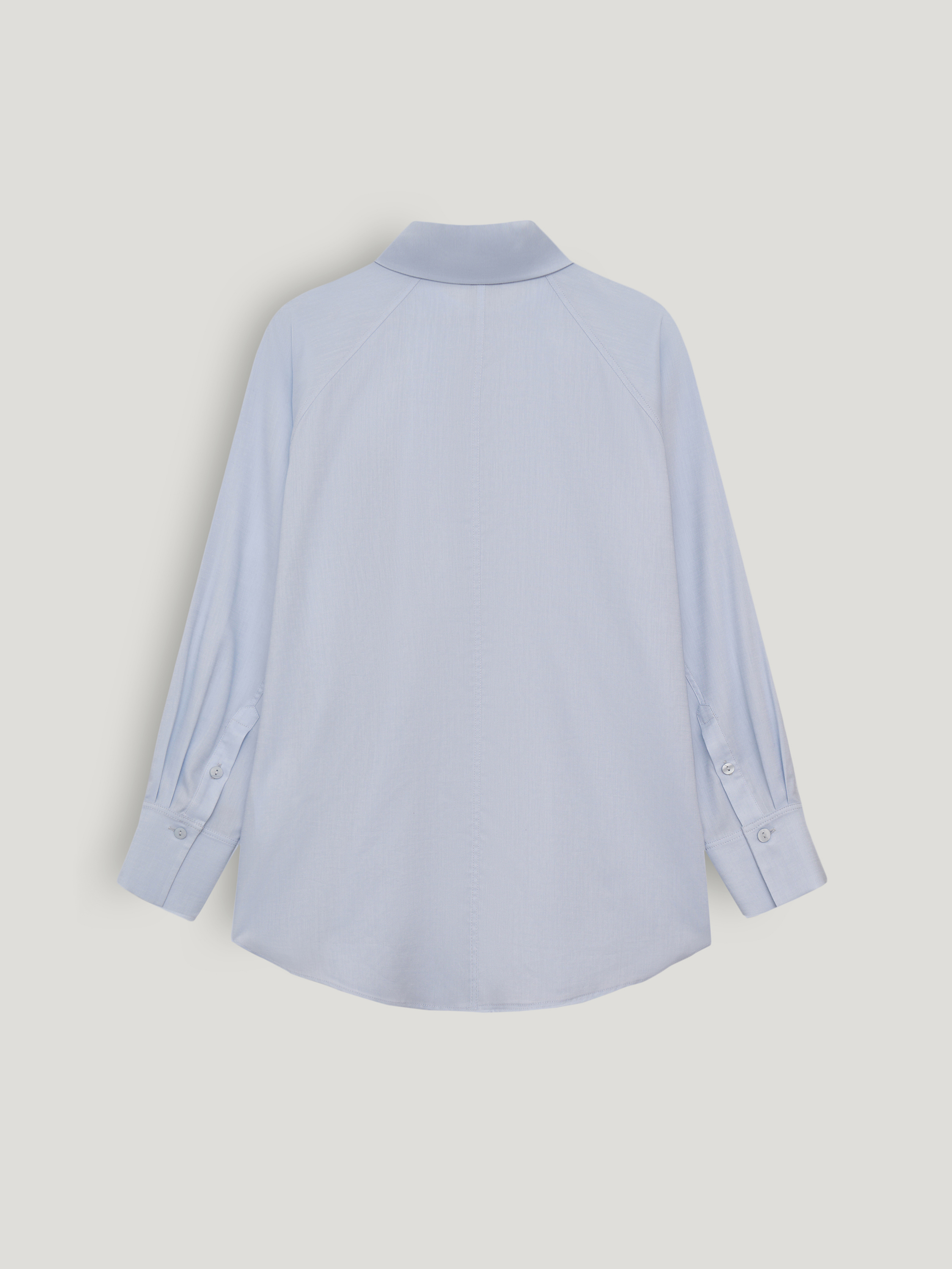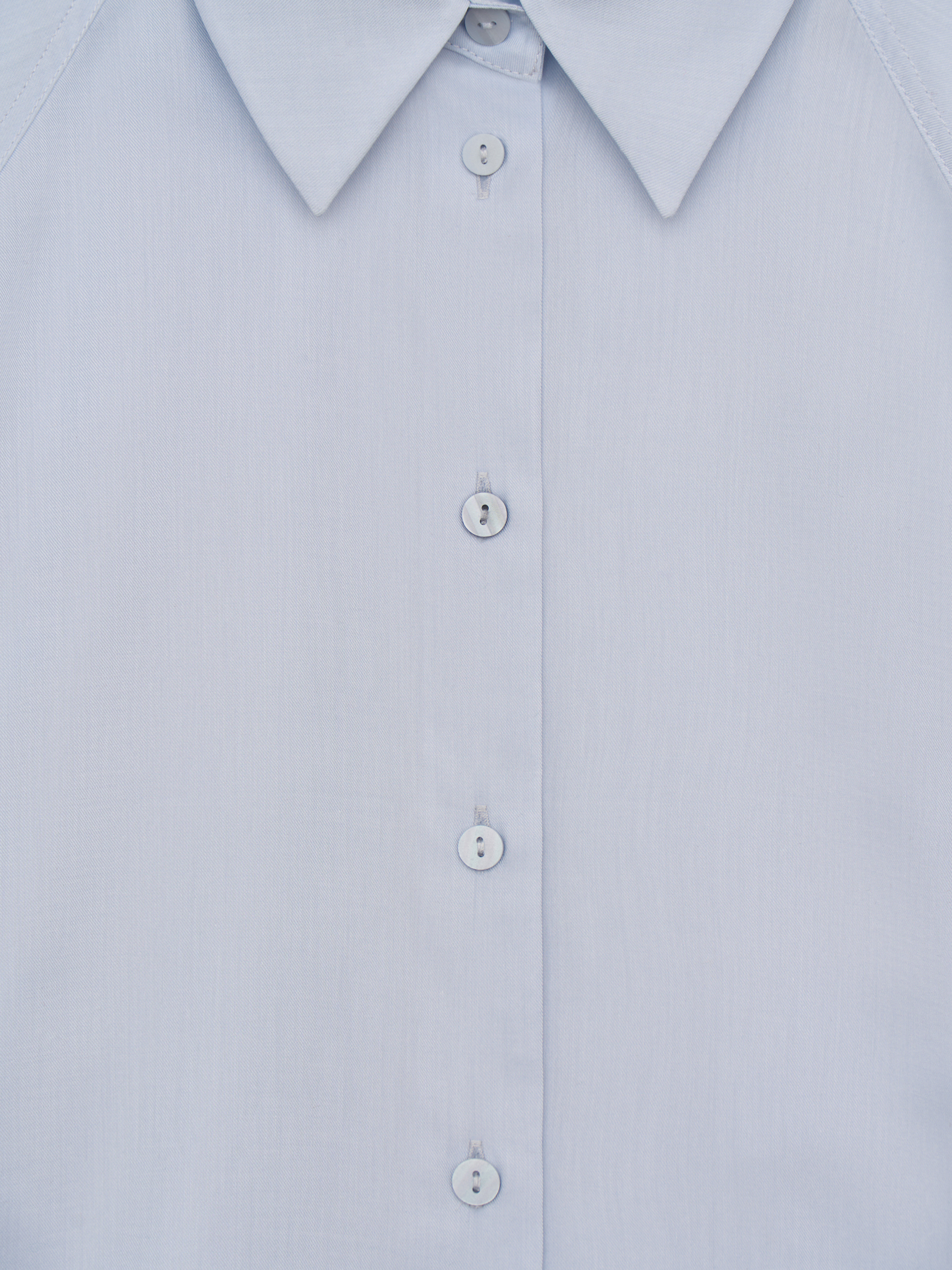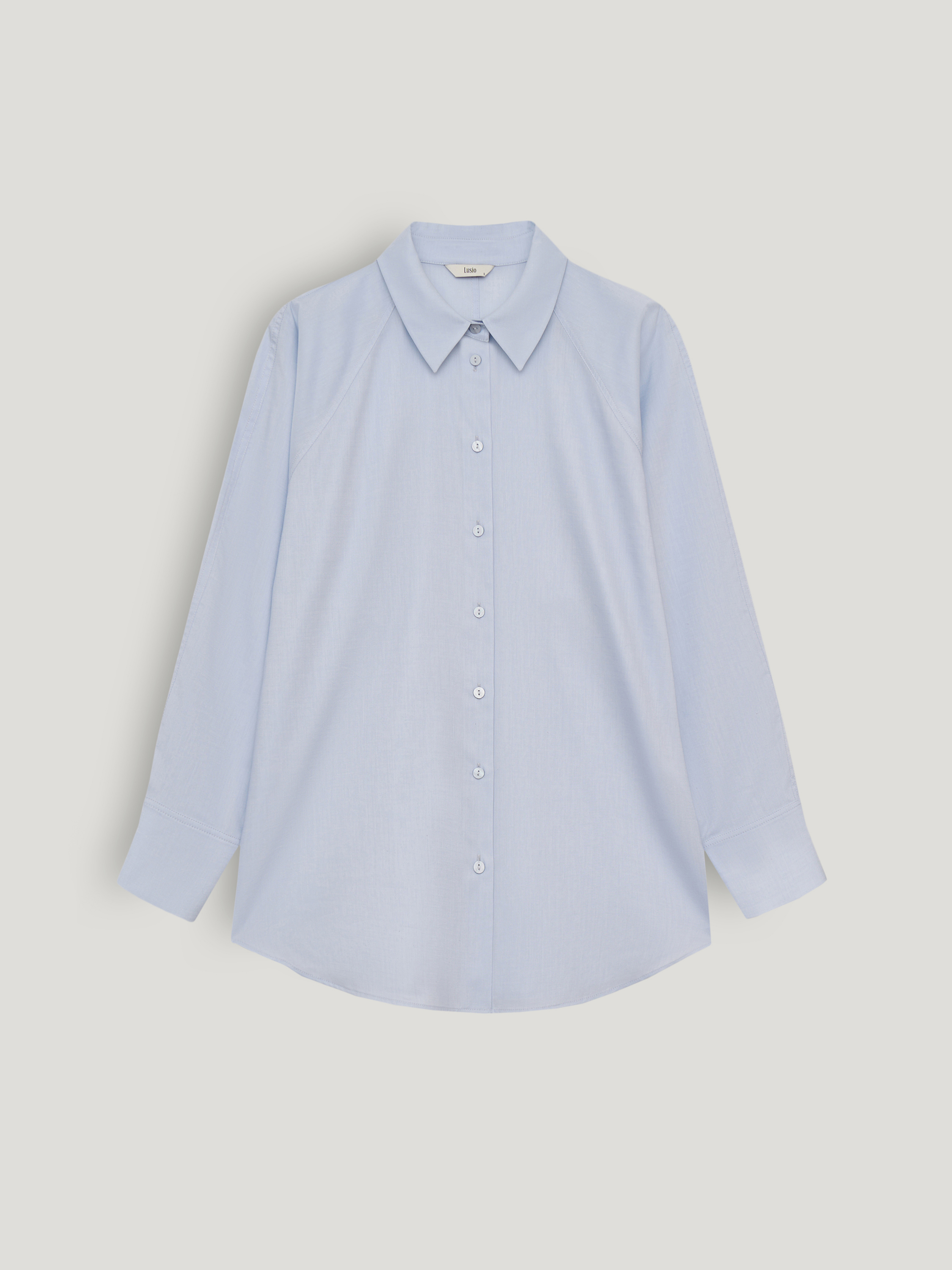 Рубашка выполнена из смесовой ткани на основе лиоцелла и хлопка. Лиоцелл делает полотно более гладким и пластичным, обеспечивает мягкое прилегание и хорошую воздухопроницаемость. Хлопок добавляет структуру и износостойкость, сохраняя ощущение естественного комфорта в течение дня. Модель свободного кроя с классическим отложным воротником и центральной застежкой на пуговицы. Линия плеча слегка смещена, рукав длинный с манжетой. Низ оформлен мягкой округлой линией. Оттенок светлый голубой с холодным подтоном. Рубашка подходит для многослойных комплектов под жакеты и трикотаж, а также сочетается с денимом, костюмными брюками и юбками в повседневных и более формальных образах.