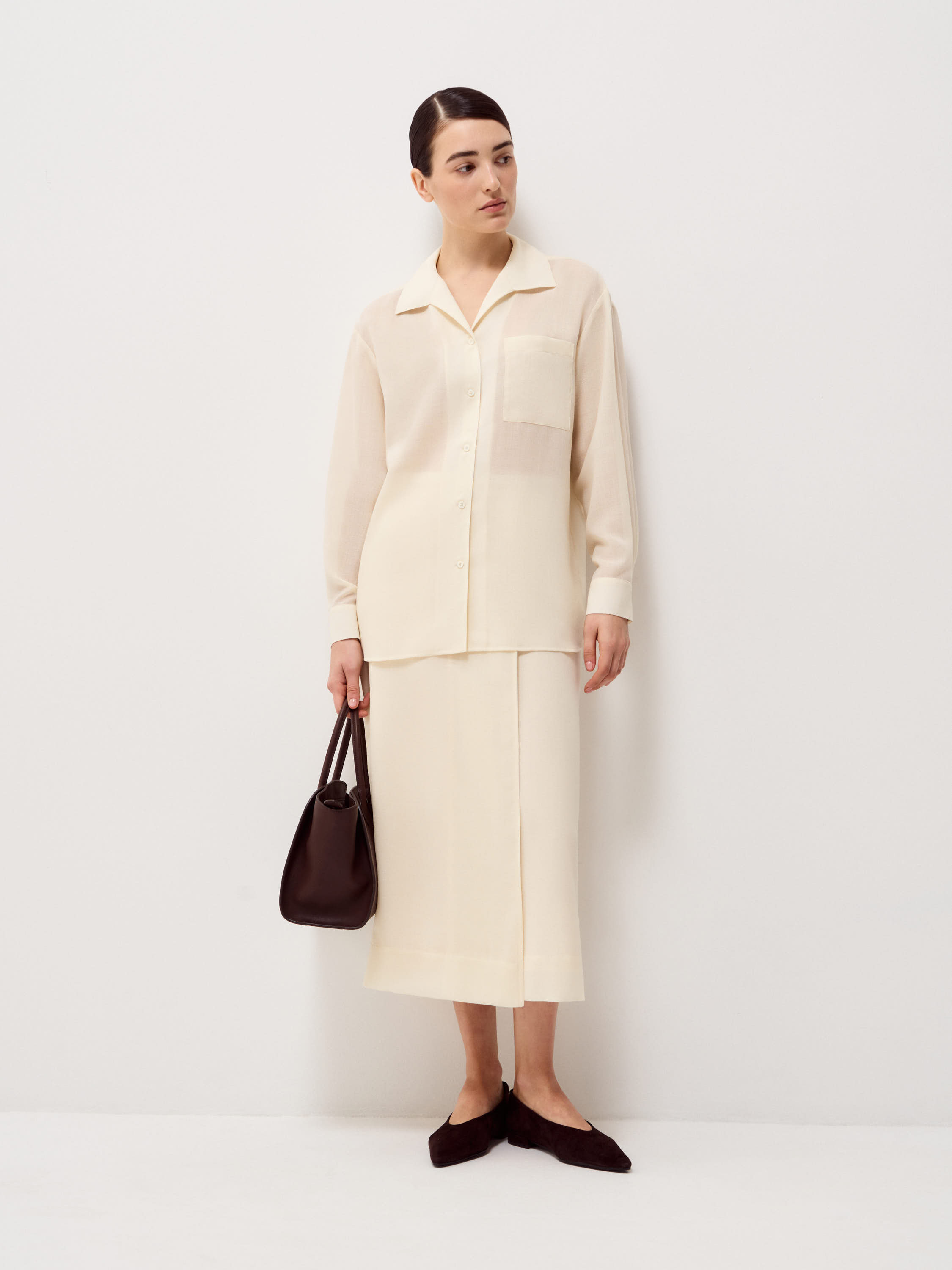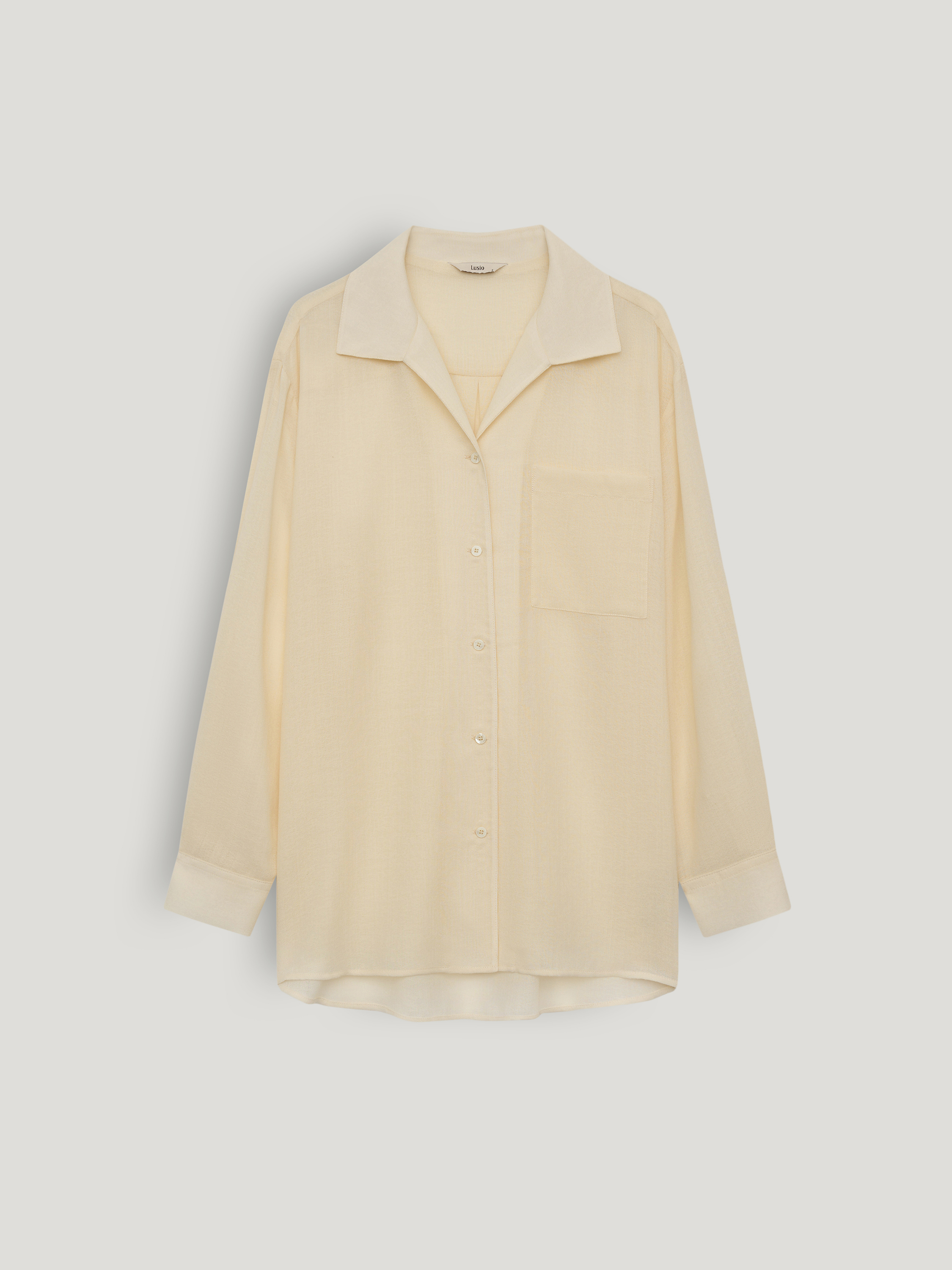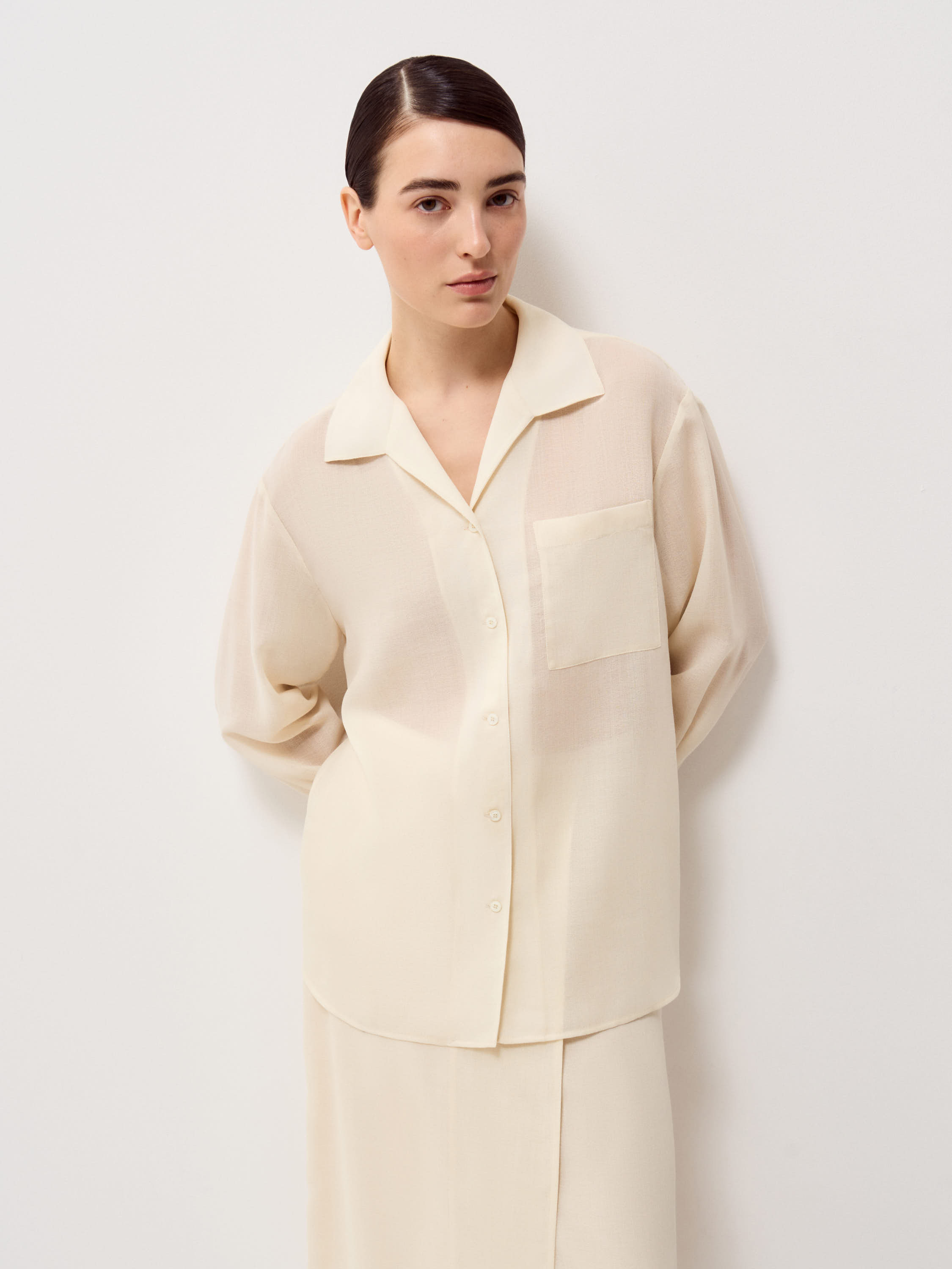 Рубашка выполнена из легкого гладкого полотна с матовой поверхностью и мягкой пластичностью, благодаря чему ткань аккуратно драпируется и сохраняет форму в течение дня. Крой прямой, умеренно свободный, с естественной линией плеча и длиной до бедра. Отложной воротник формирует аккуратную V-образную линию, центральная застежка на пуговицы выстраивает ровную вертикаль. Накладной карман на груди добавляет сдержанный акцент, длинные рукава завершены манжетами. Кремовый оттенок с теплым подтоном сочетается с молочной, карамельной и графитовой палитрой. Рубашка подходит для комплекта с юбкой или брюками в тон и может использоваться как первый или второй слой.