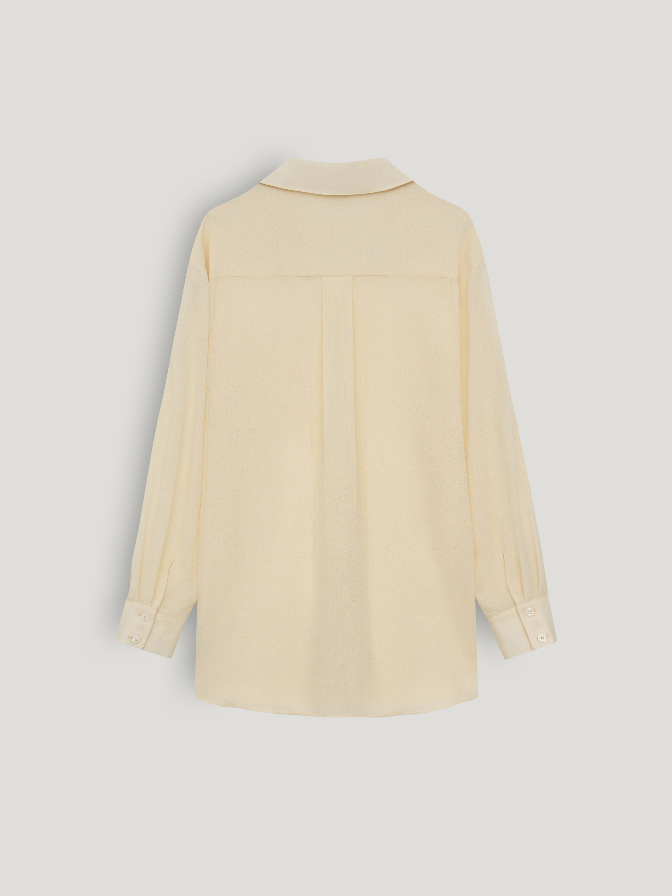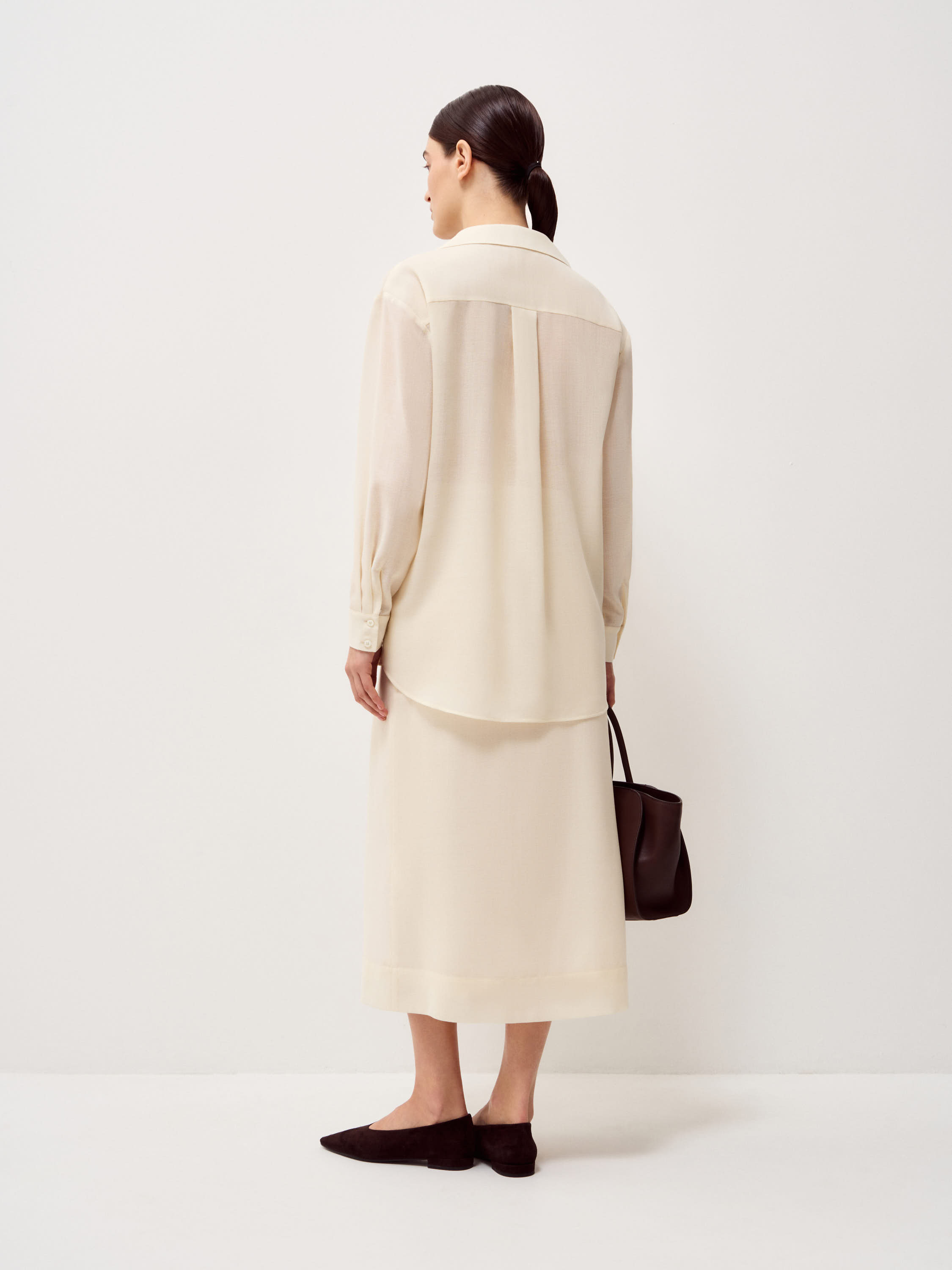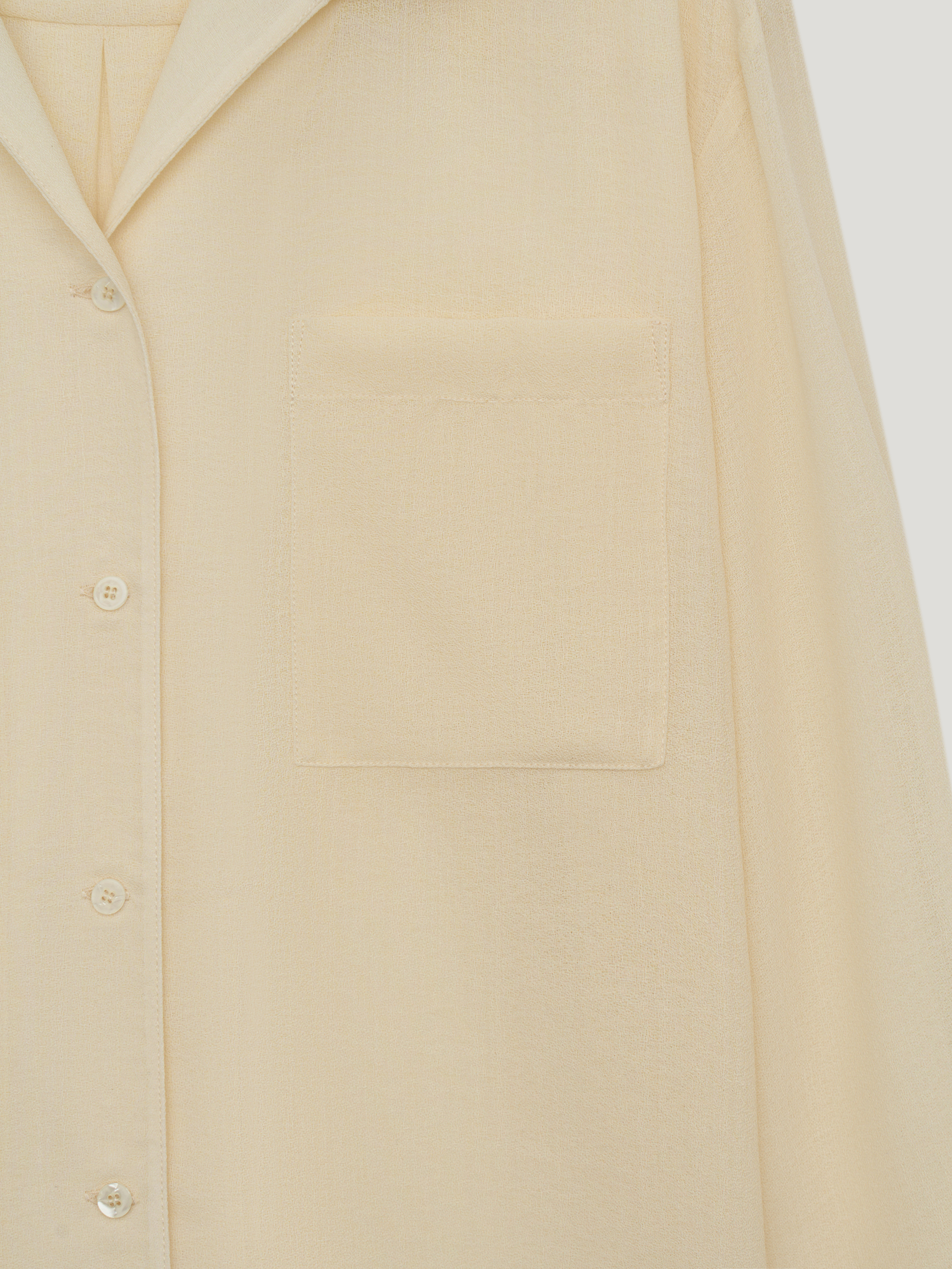Рубашка выполнена из легкого гладкого полотна с матовой поверхностью и мягкой пластичностью, благодаря чему ткань аккуратно драпируется и сохраняет форму в течение дня. Крой прямой, умеренно свободный, с естественной линией плеча и длиной до бедра. Отложной воротник формирует аккуратную V-образную линию, центральная застежка на пуговицы выстраивает ровную вертикаль. Накладной карман на груди добавляет сдержанный акцент, длинные рукава завершены манжетами. Кремовый оттенок с теплым подтоном сочетается с молочной, карамельной и графитовой палитрой. Рубашка подходит для комплекта с юбкой или брюками в тон и может использоваться как первый или второй слой.