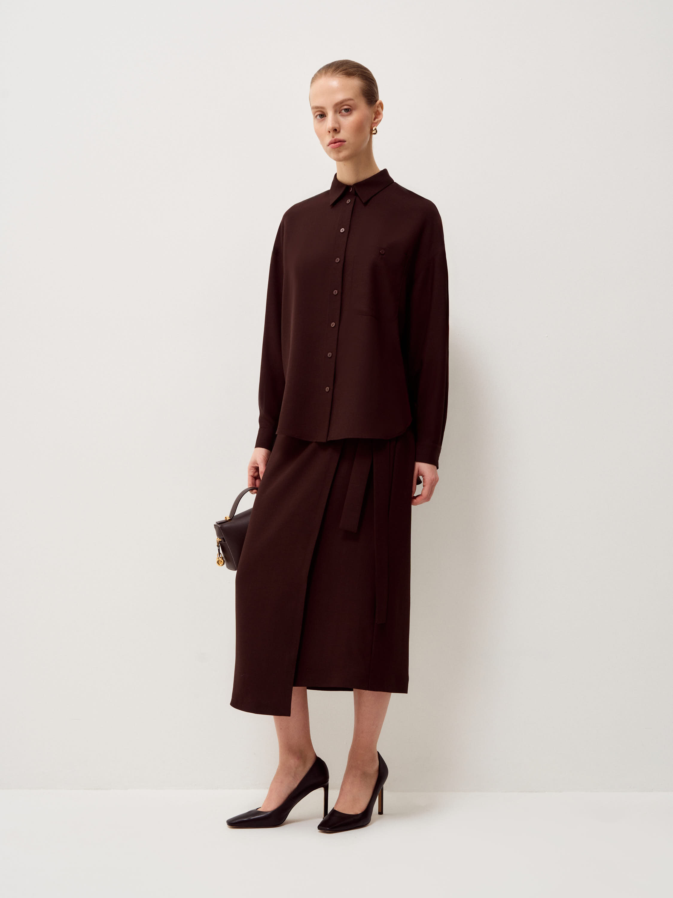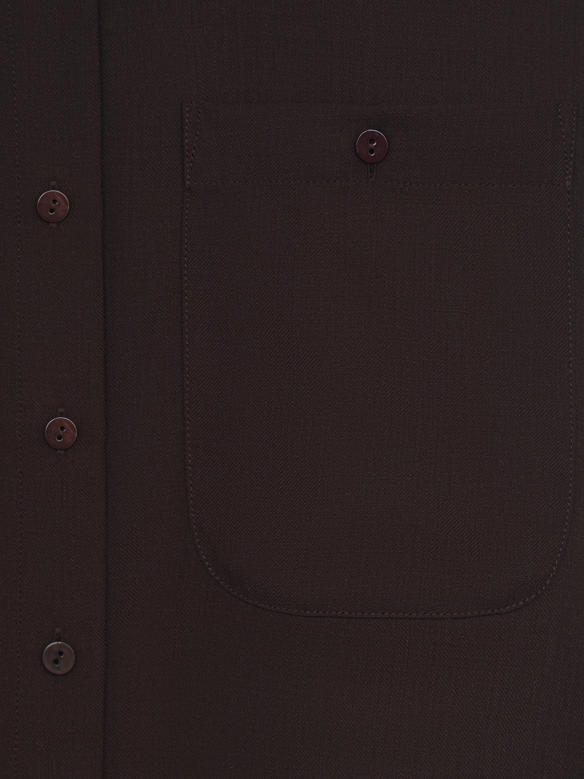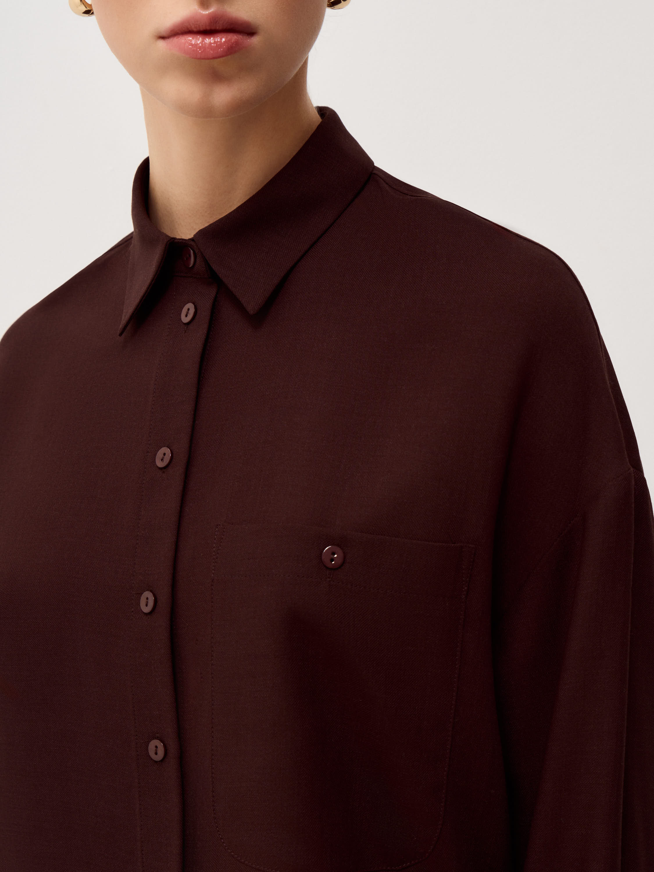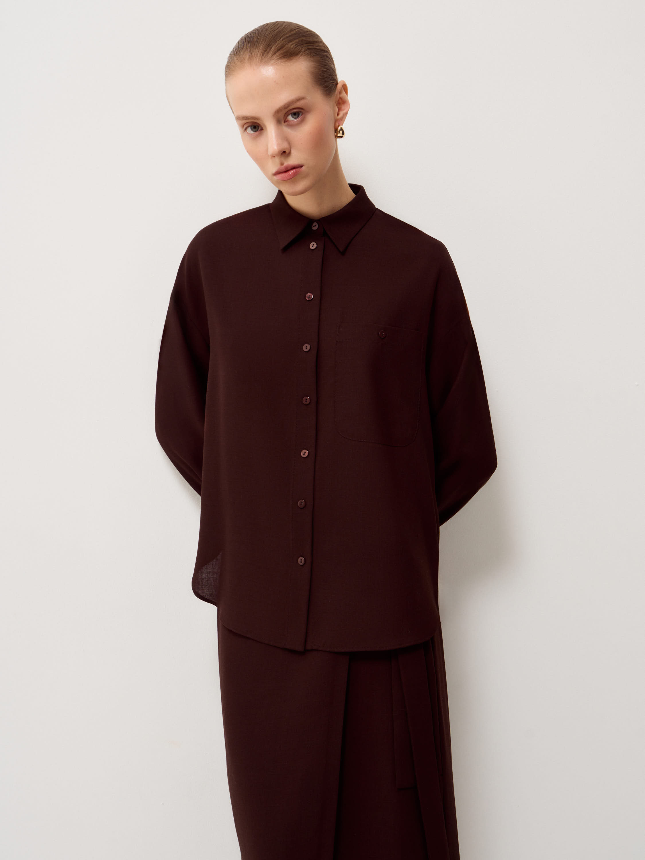 Рубашка прямого силуэта с четкой линией плеча и классическим отложным воротником выполнена из плотной шерстяной ткани, которая сохраняет форму и при этом остается комфортной в носке. Лаконичная планка на пуговицах и аккуратные манжеты подчеркивают сдержанный характер модели. Посадка свободная, без излишнего объема, что позволяет носить рубашку как самостоятельный элемент или в многослойных сочетаниях. Оттенок глубокий, насыщенный, с бордовым подтоном, который выглядит благородно и легко сочетается с молочными, кремовыми и темными базовыми цветами гардероба.