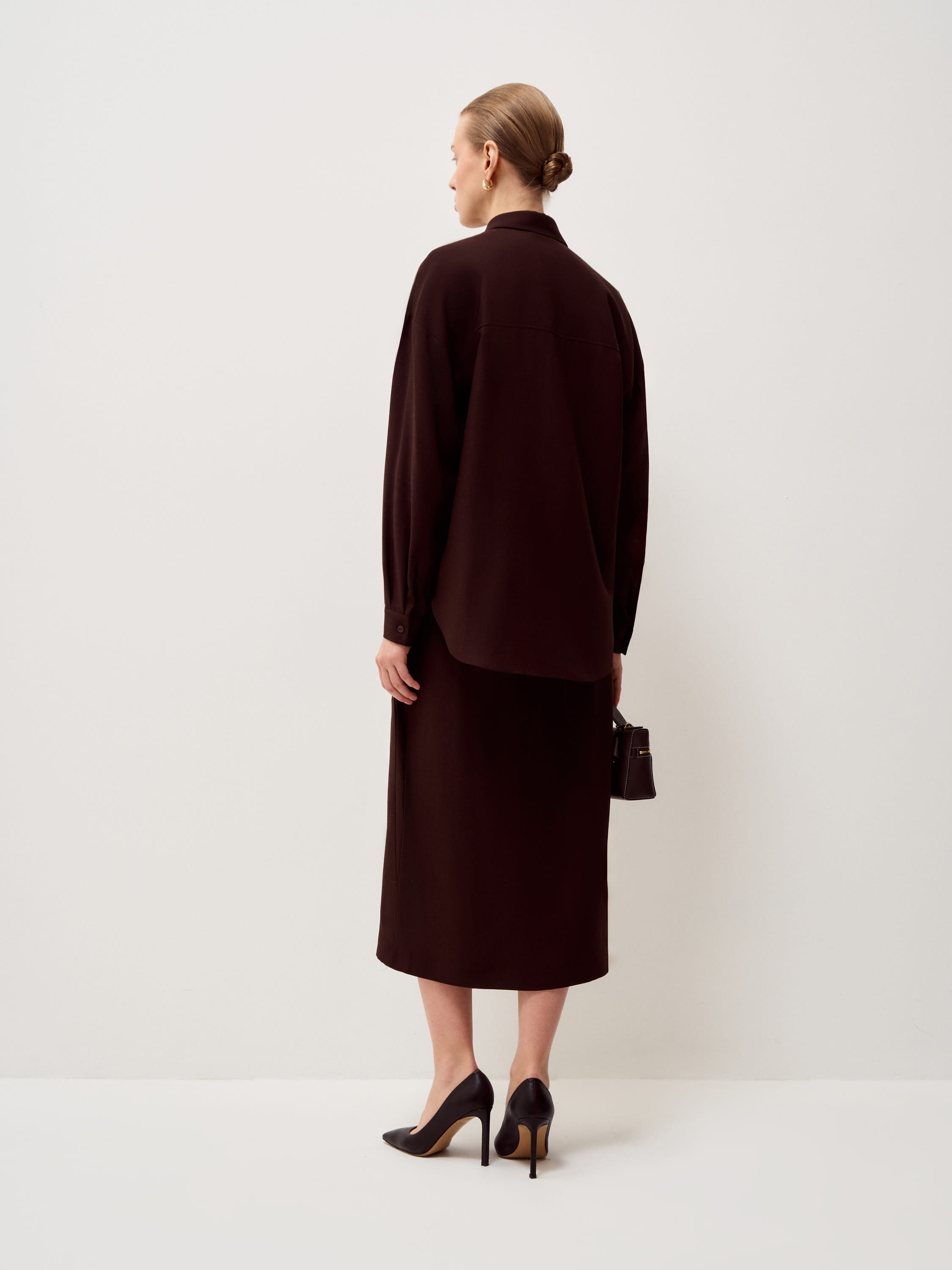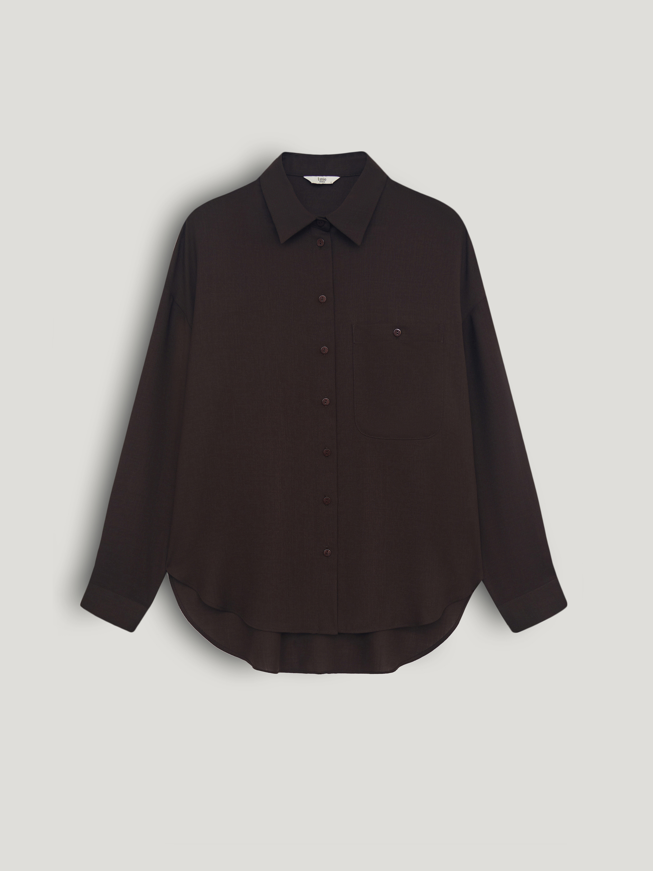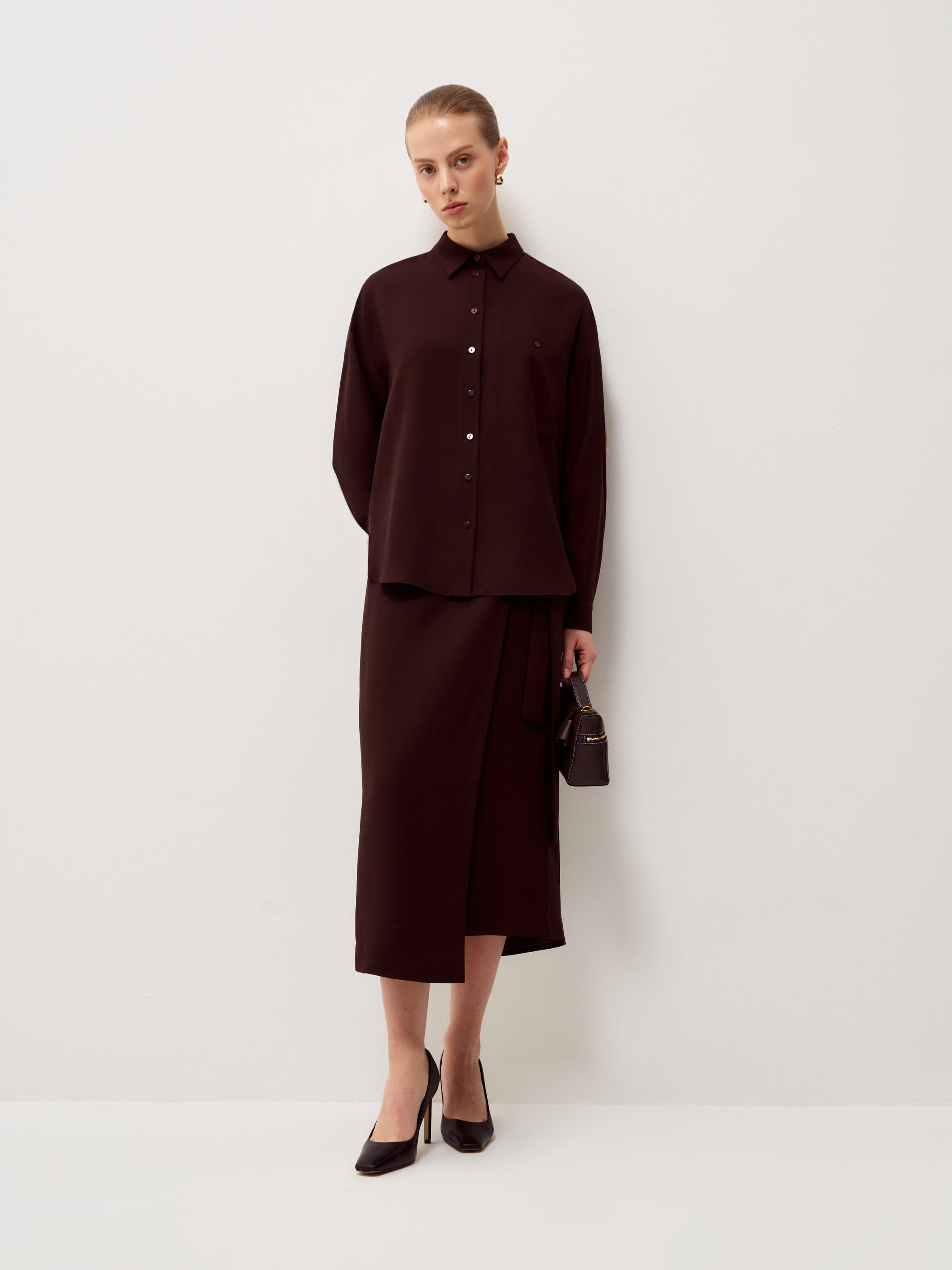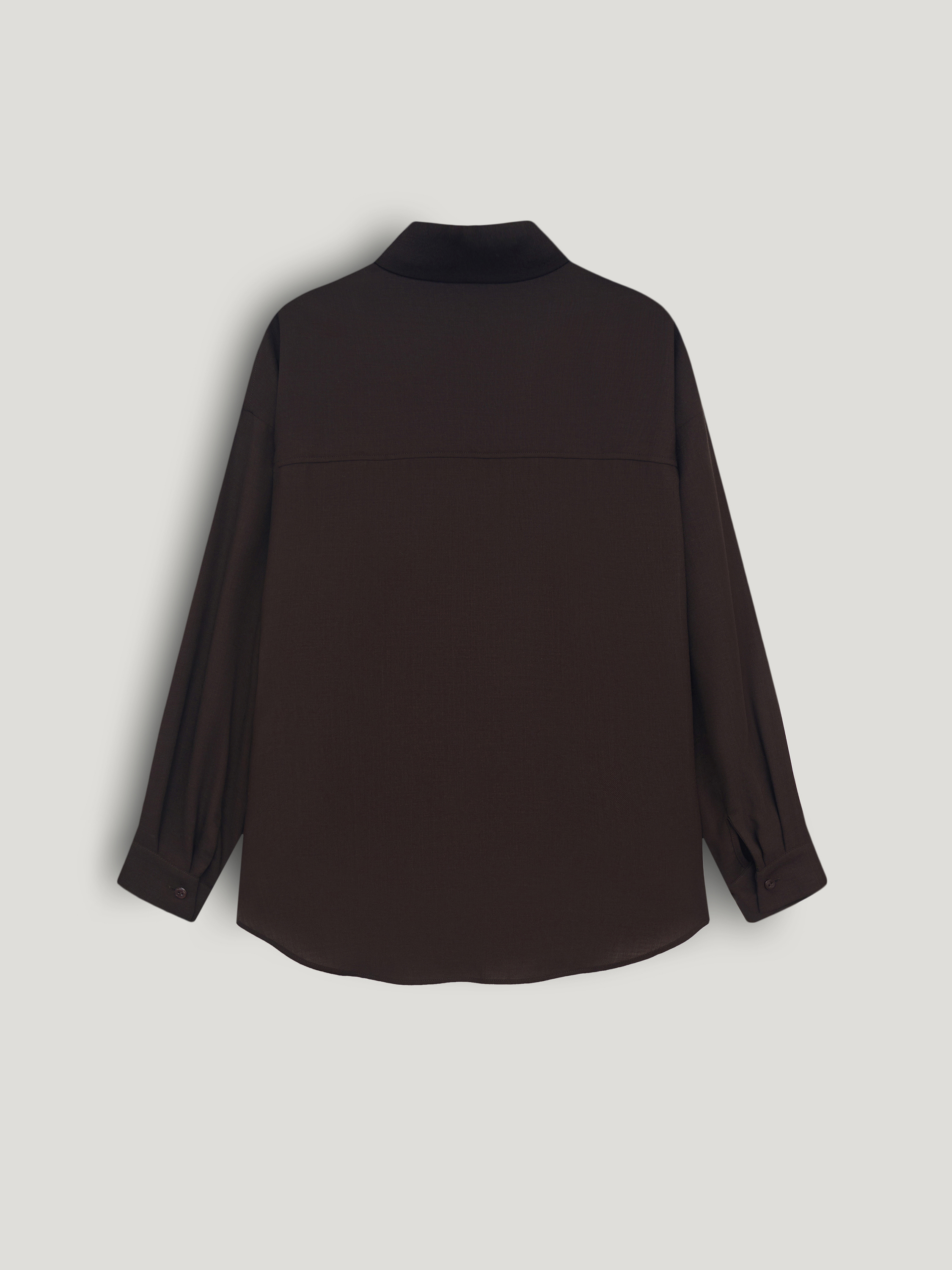 Рубашка прямого силуэта с четкой линией плеча и классическим отложным воротником выполнена из плотной шерстяной ткани, которая сохраняет форму и при этом остается комфортной в носке. Лаконичная планка на пуговицах и аккуратные манжеты подчеркивают сдержанный характер модели. Посадка свободная, без излишнего объема, что позволяет носить рубашку как самостоятельный элемент или в многослойных сочетаниях. Оттенок глубокий, насыщенный, с бордовым подтоном, который выглядит благородно и легко сочетается с молочными, кремовыми и темными базовыми цветами гардероба.
