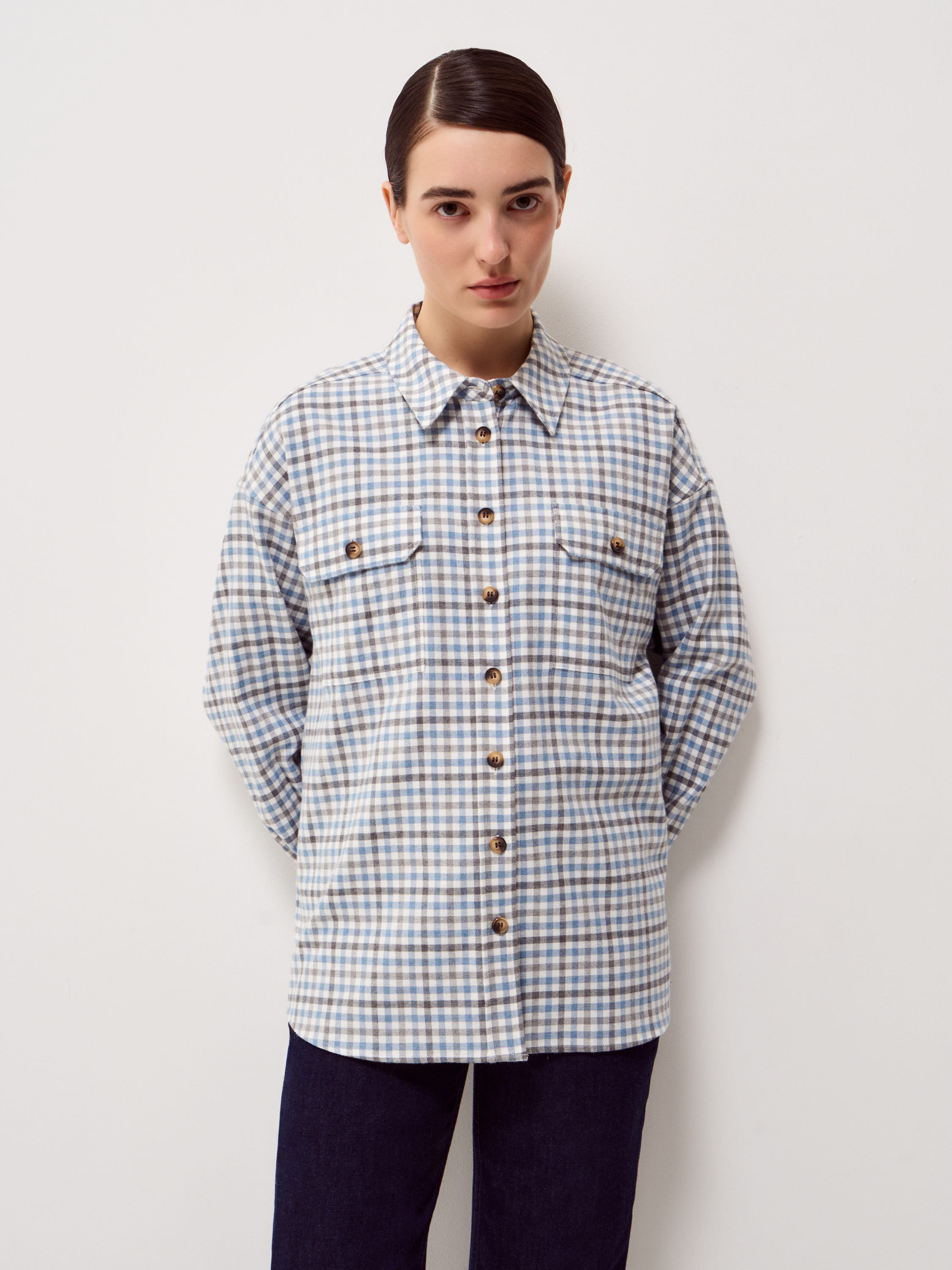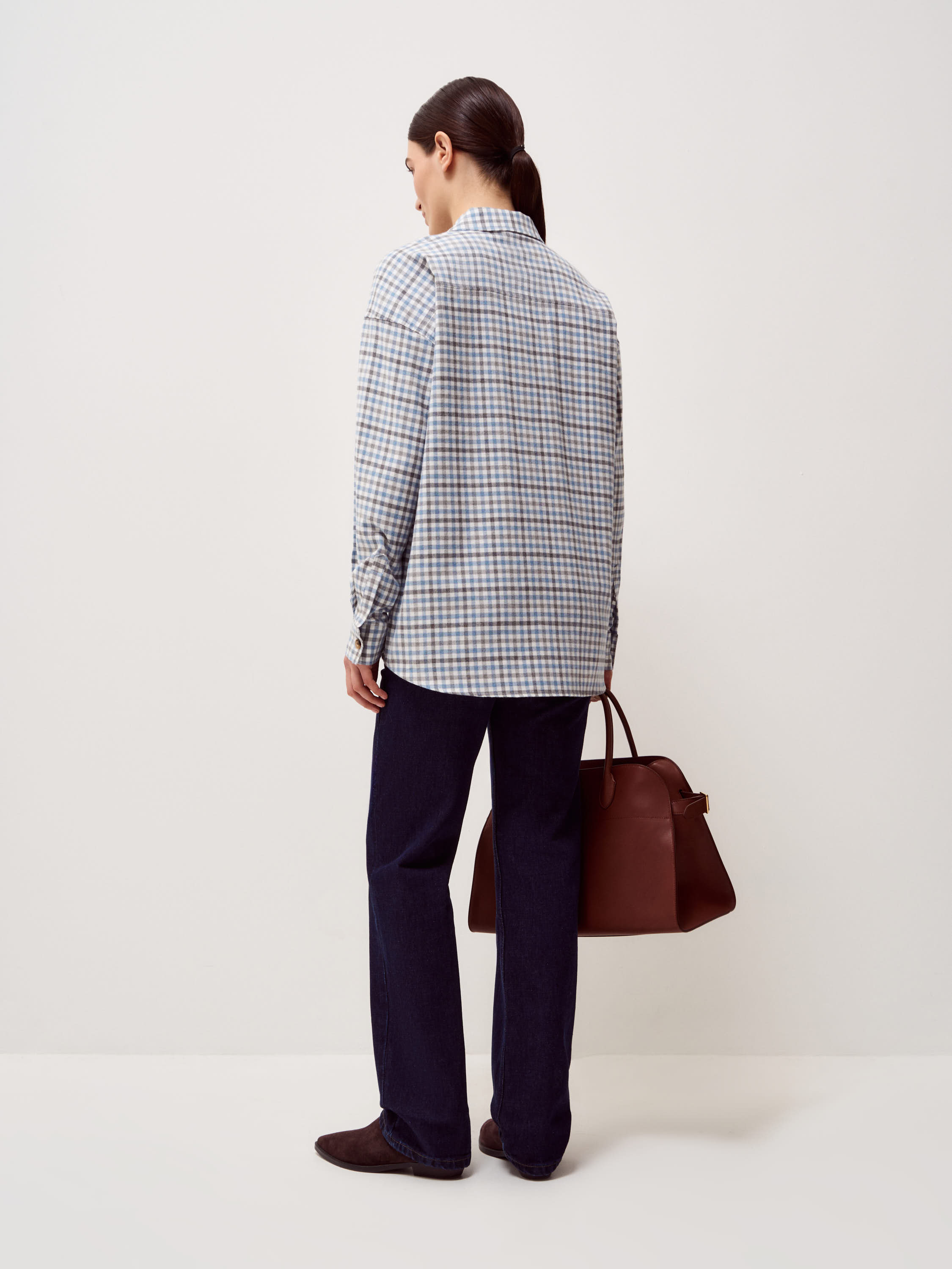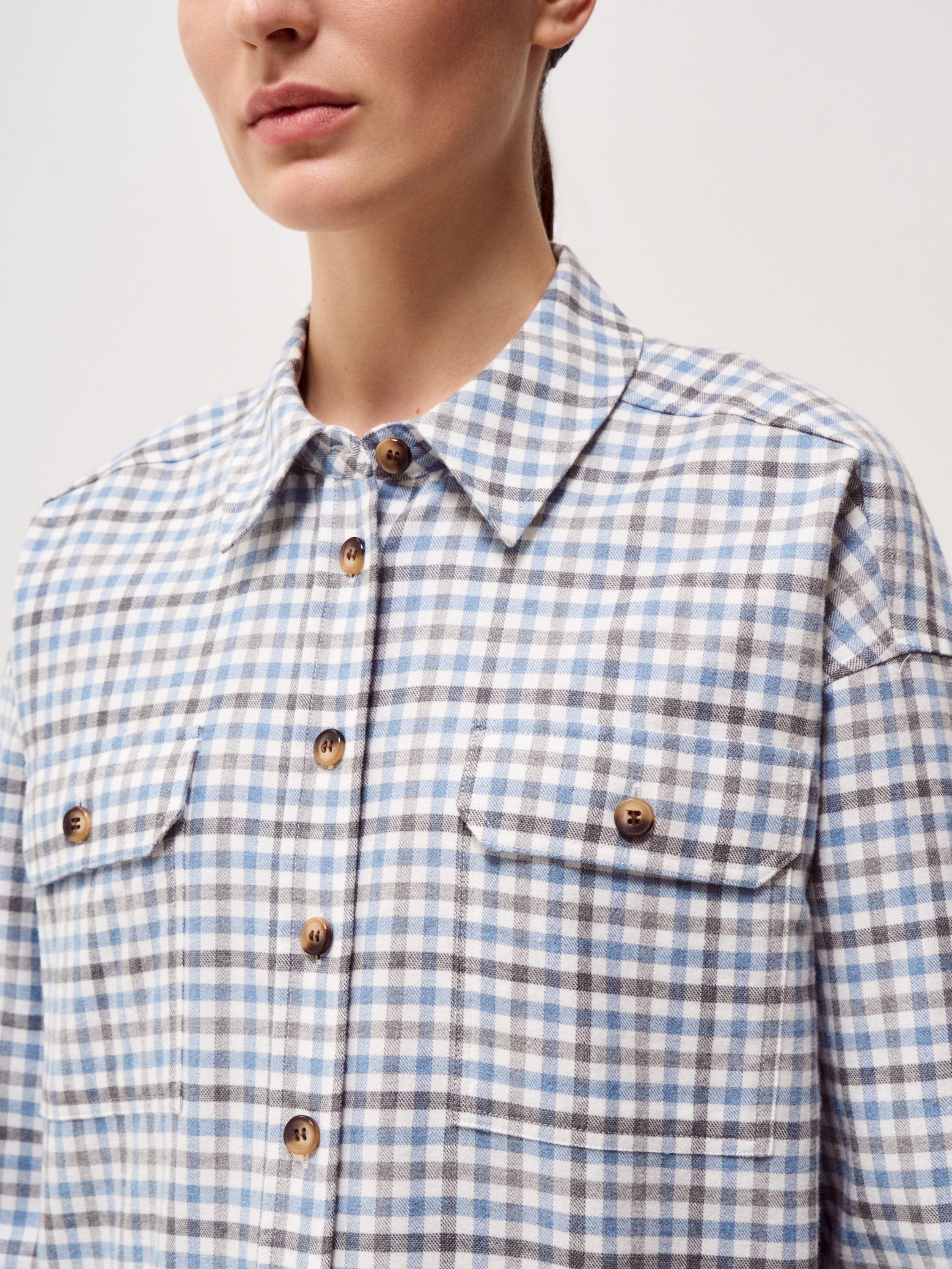 Рубашка выполнена из 100% хлопка — натурального материала с мягкой, дышащей фактурой и комфортной плотностью. Ткань приятна к коже, сохраняет форму и подходит для повседневной носки. Модель прямого силуэта с классическим отложным воротником и застежкой на пуговицы выглядит аккуратно и универсально. Нагрудные карманы с клапанами добавляют легкий утилитарный акцент, а закругленная линия низа делает силуэт более пластичным. Оттенок бежево-молочный в мелкую клетку с мягким коричневым и светло-серым акцентом легко сочетается с денимом, костюмными брюками и трикотажем.