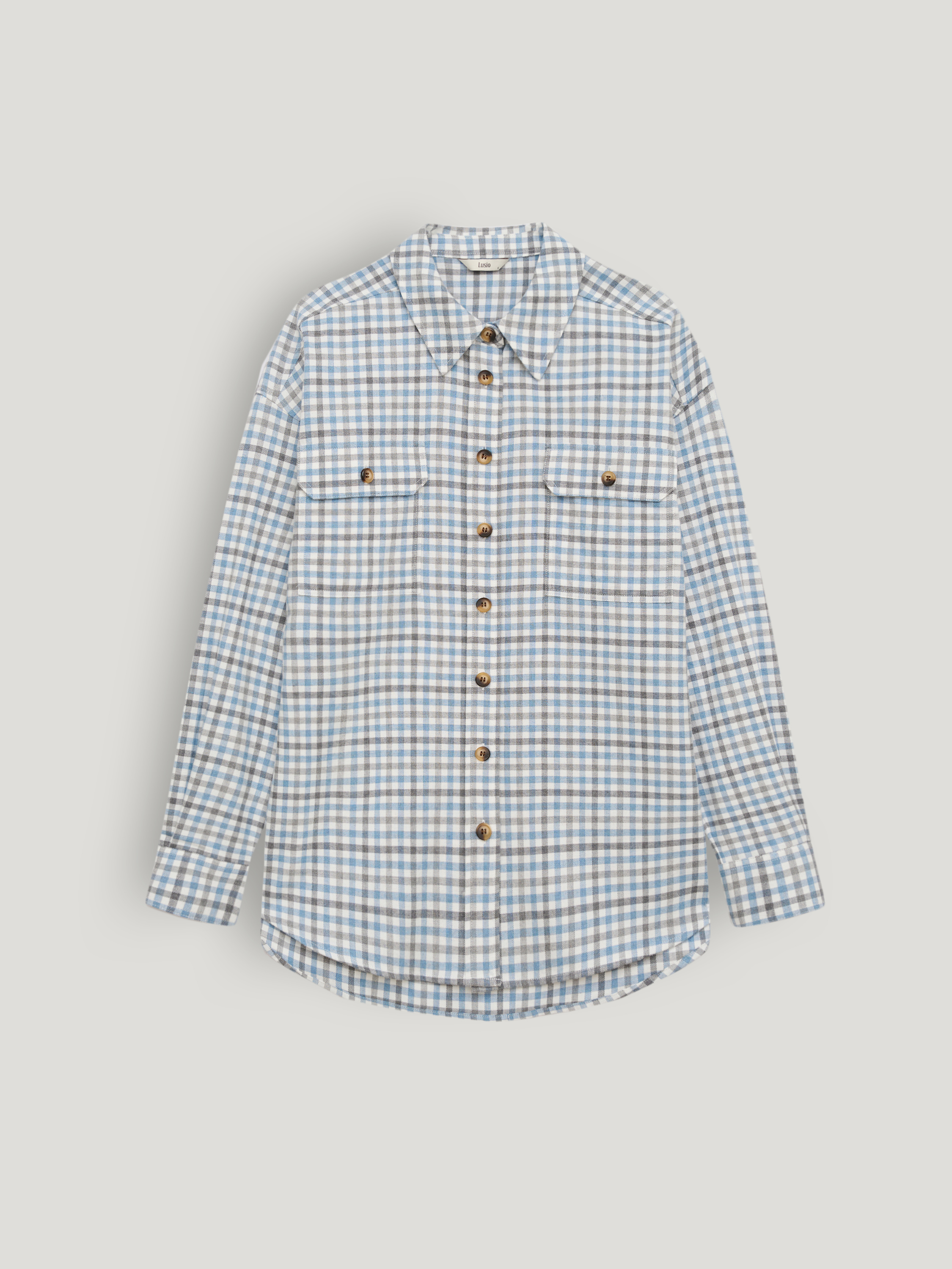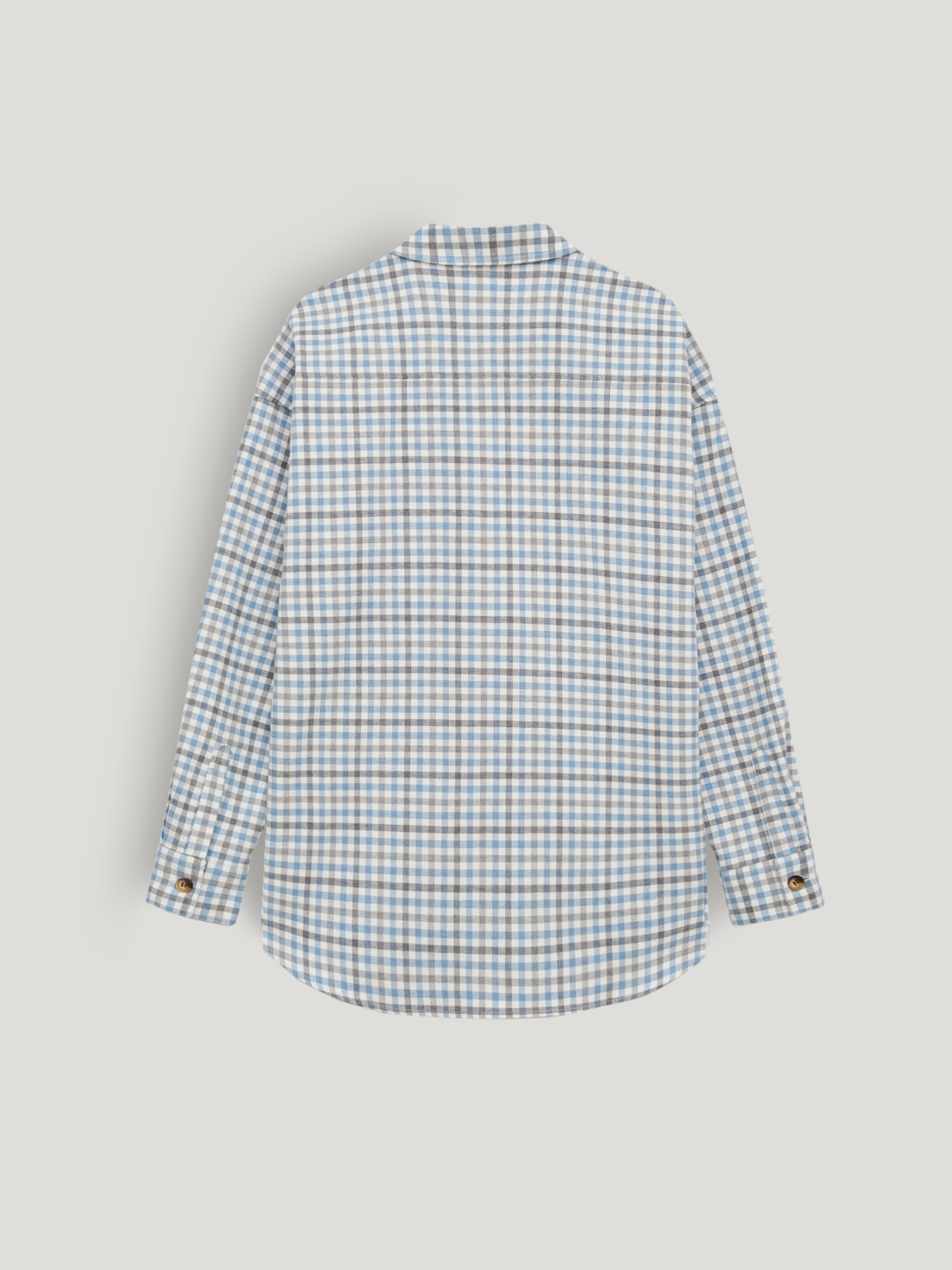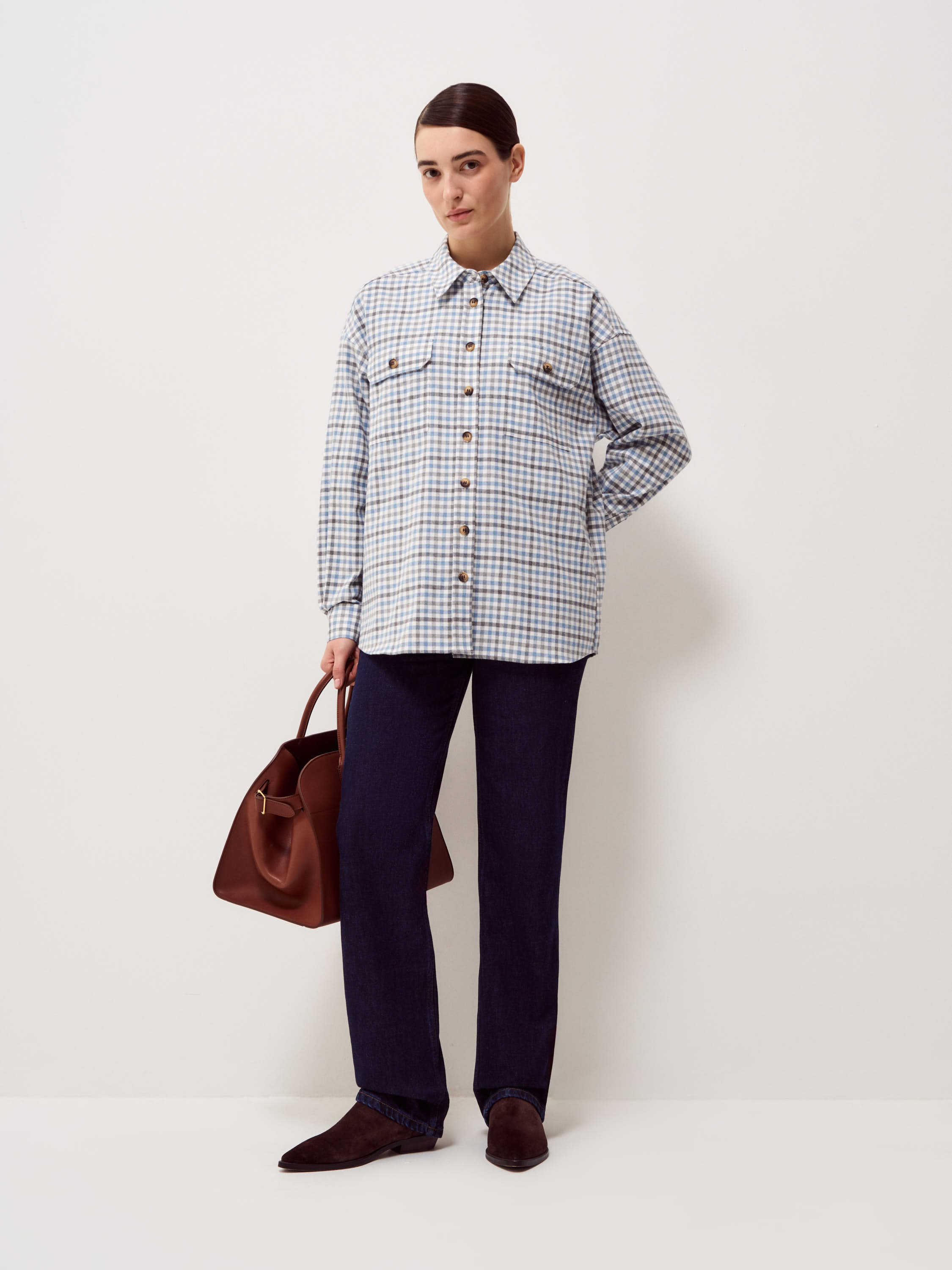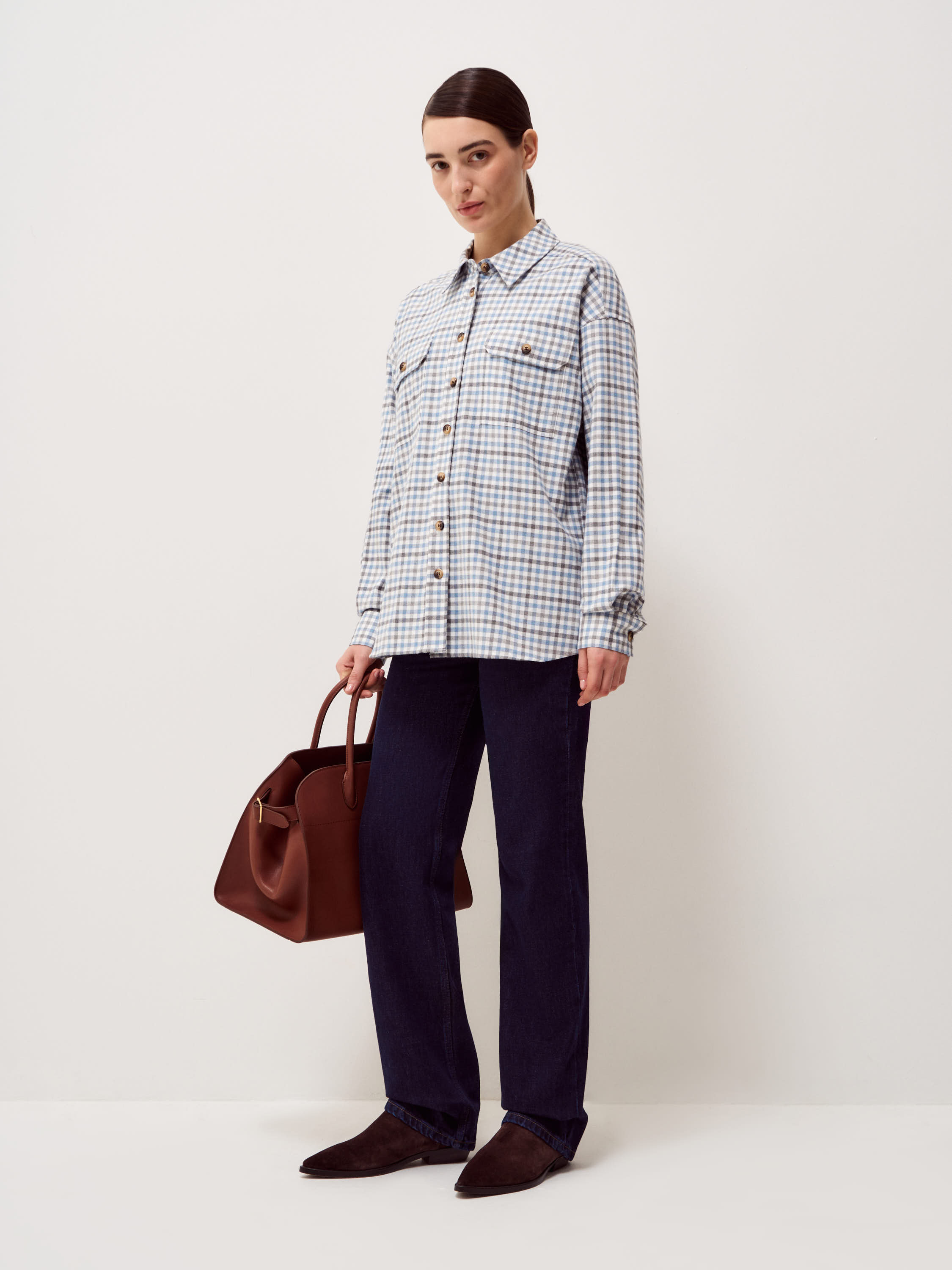 Рубашка выполнена из 100% хлопка — натурального материала с мягкой, дышащей фактурой и комфортной плотностью. Ткань приятна к коже, сохраняет форму и подходит для повседневной носки. Модель прямого силуэта с классическим отложным воротником и застежкой на пуговицы выглядит аккуратно и универсально. Нагрудные карманы с клапанами добавляют легкий утилитарный акцент, а закругленная линия низа делает силуэт более пластичным. Оттенок бежево-молочный в мелкую клетку с мягким коричневым и светло-серым акцентом легко сочетается с денимом, костюмными брюками и трикотажем.