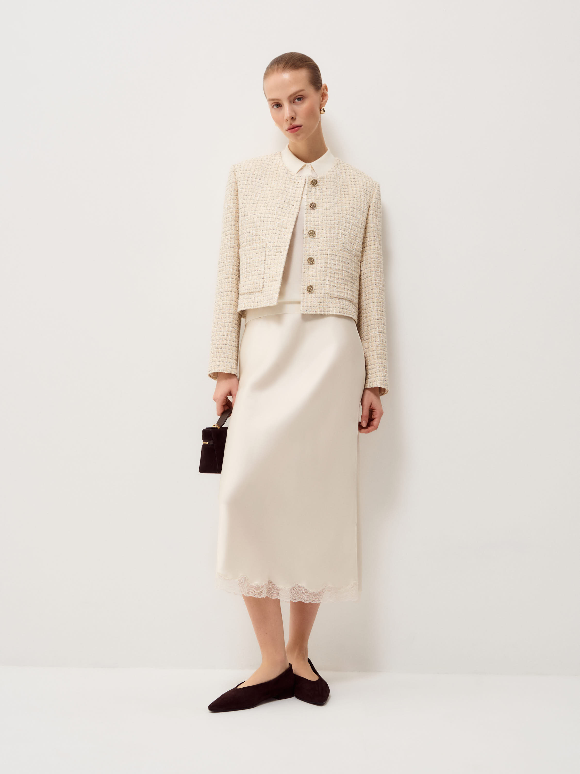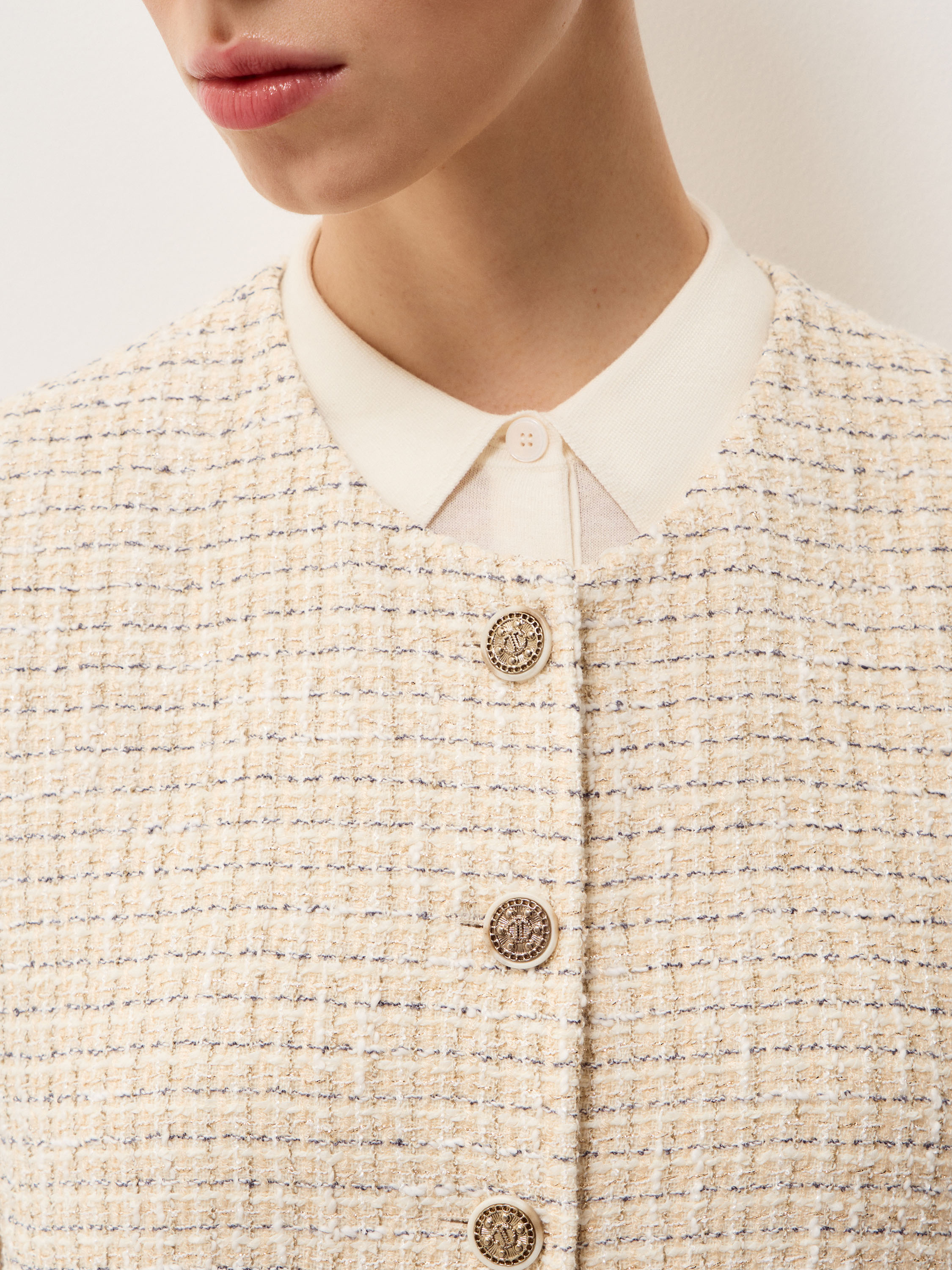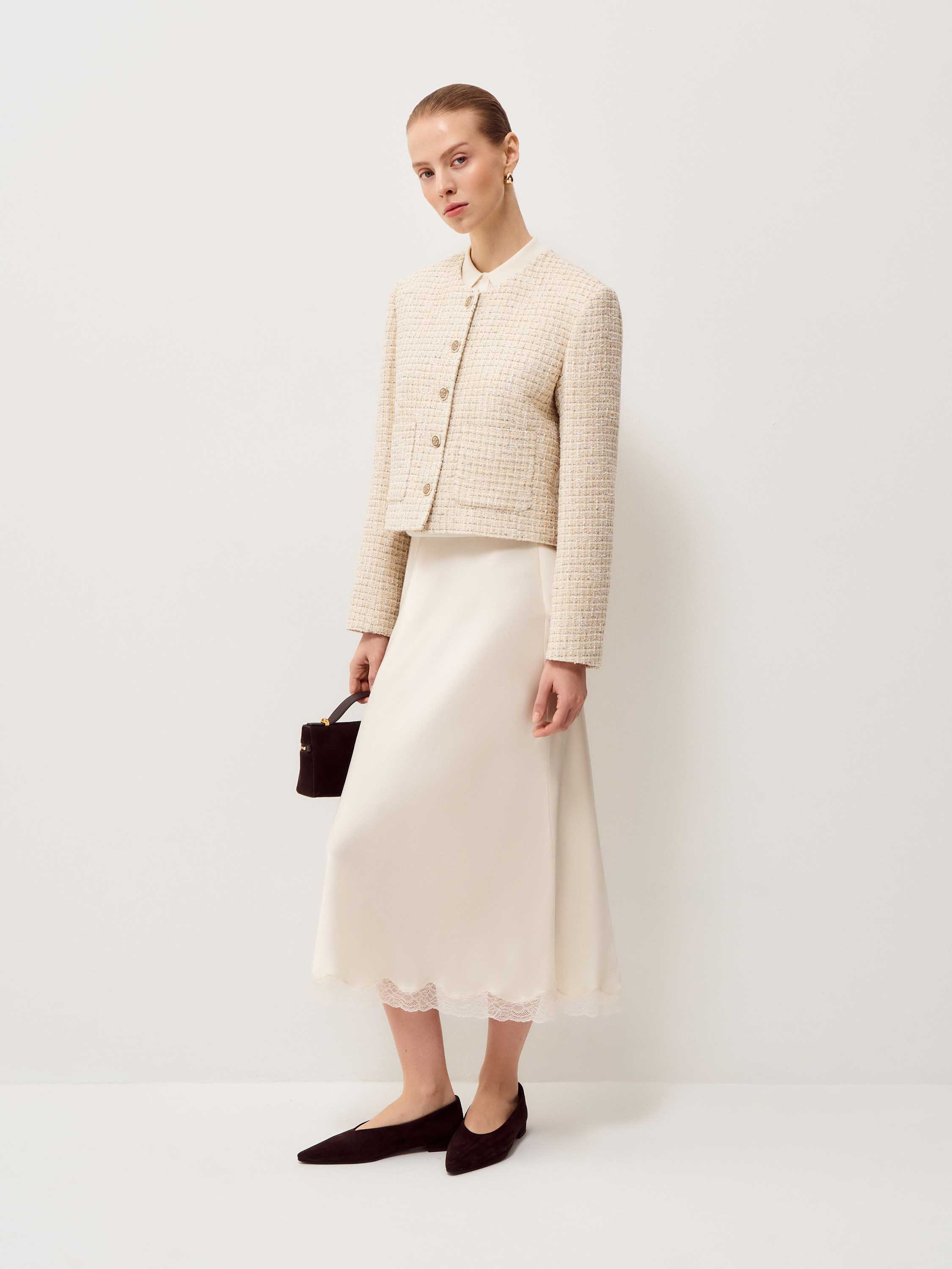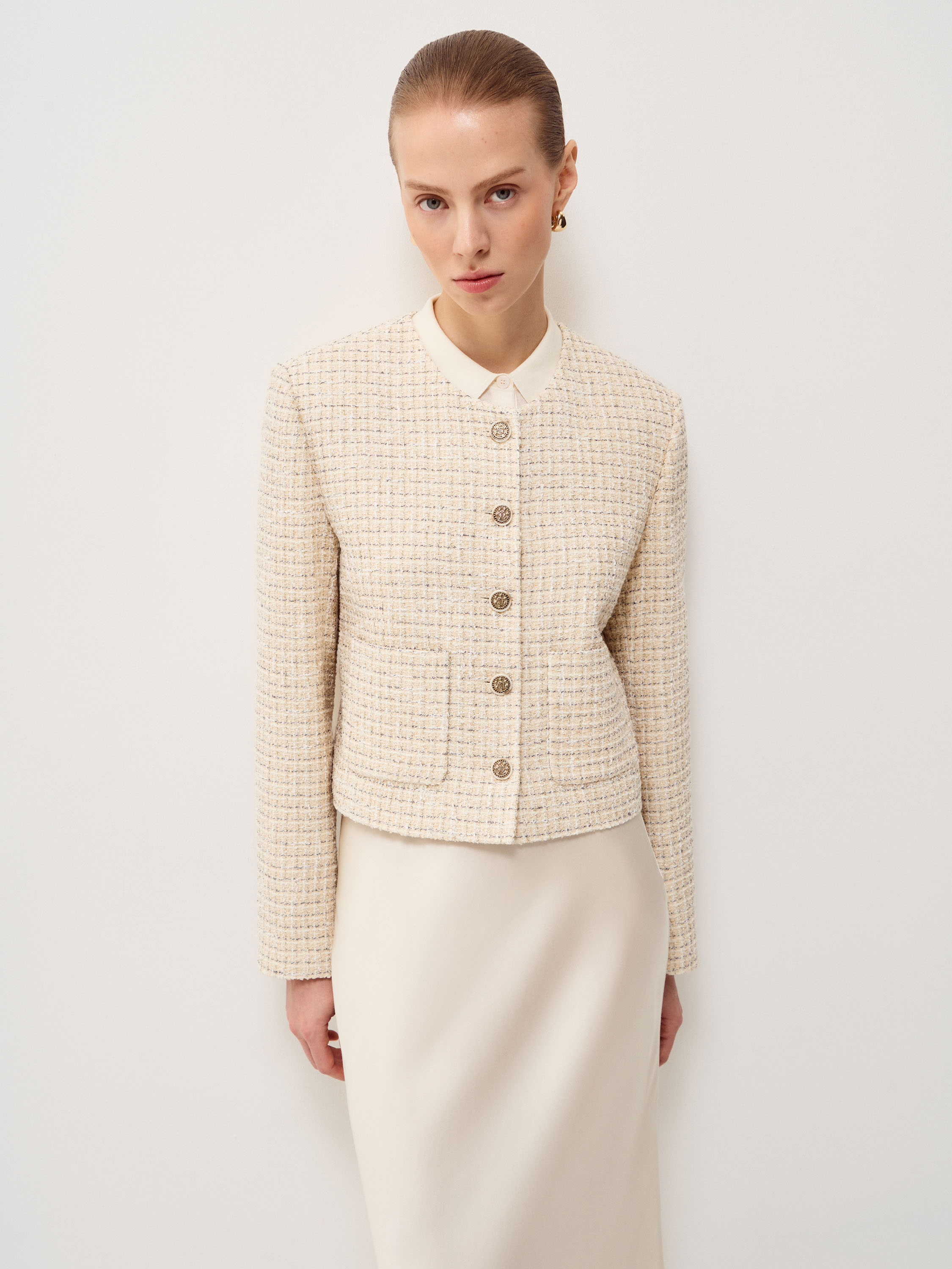 Жакет в светлом бежево-молочном оттенке выполнен из фактурной ткани с мелким плетением в стиле твид, поверхность плотная, с мягким рельефом и деликатным переплетением нитей. Модель укороченная, с аккуратной линией плеча и посадкой по фигуре без лишнего объема, длина — до линии талии, что формирует четкую пропорцию силуэта. Круглая горловина оформлена без воротника, центральная застежка на контрастные декоративные пуговицы выстраивает строгую вертикаль. Длинные рукава и лаконичные накладные карманы поддерживают структурный характер модели. Жакет сочетается с юбками миди и макси, а также с прямыми брюками, сохраняя собранный и сдержанный образ.