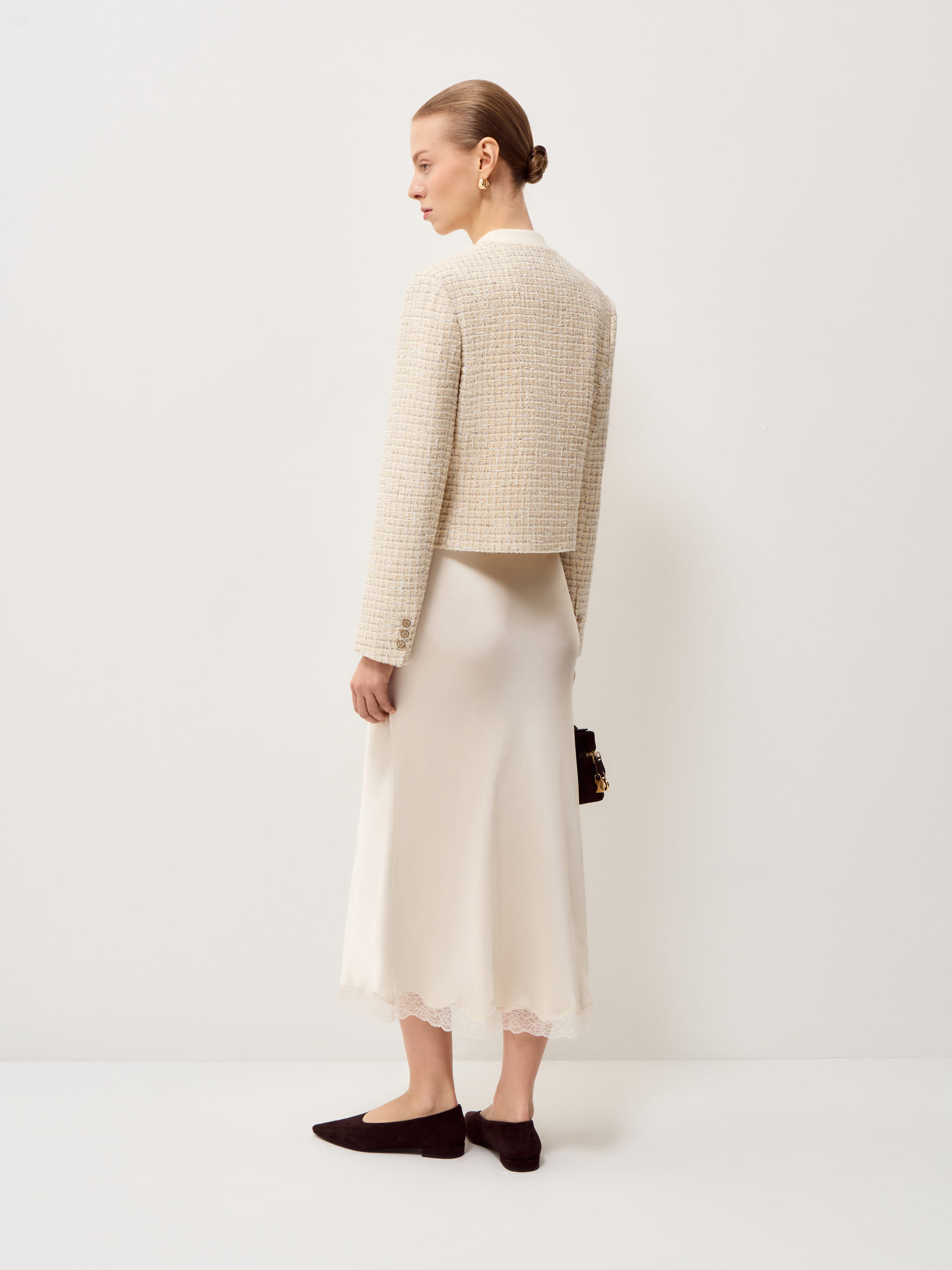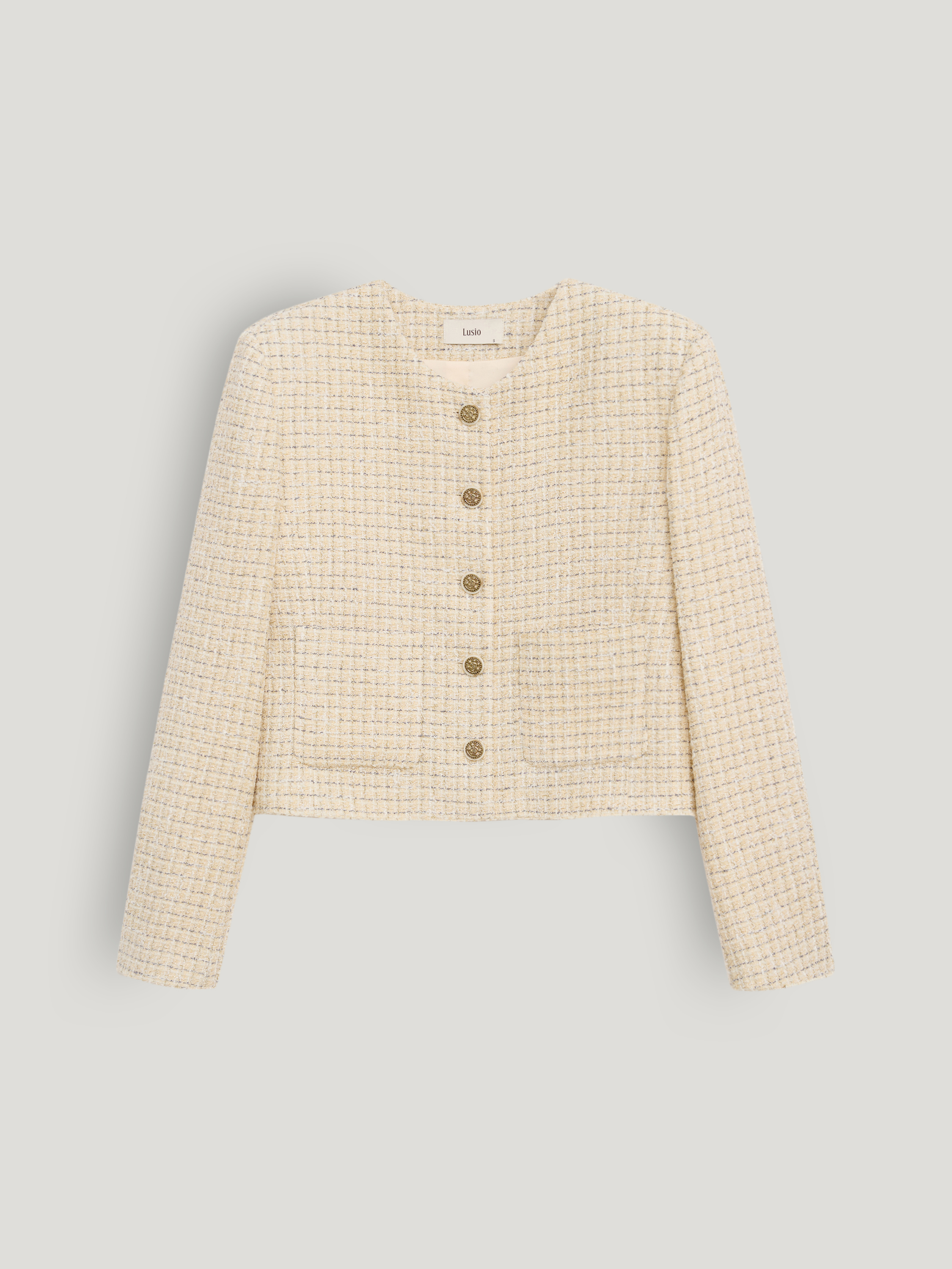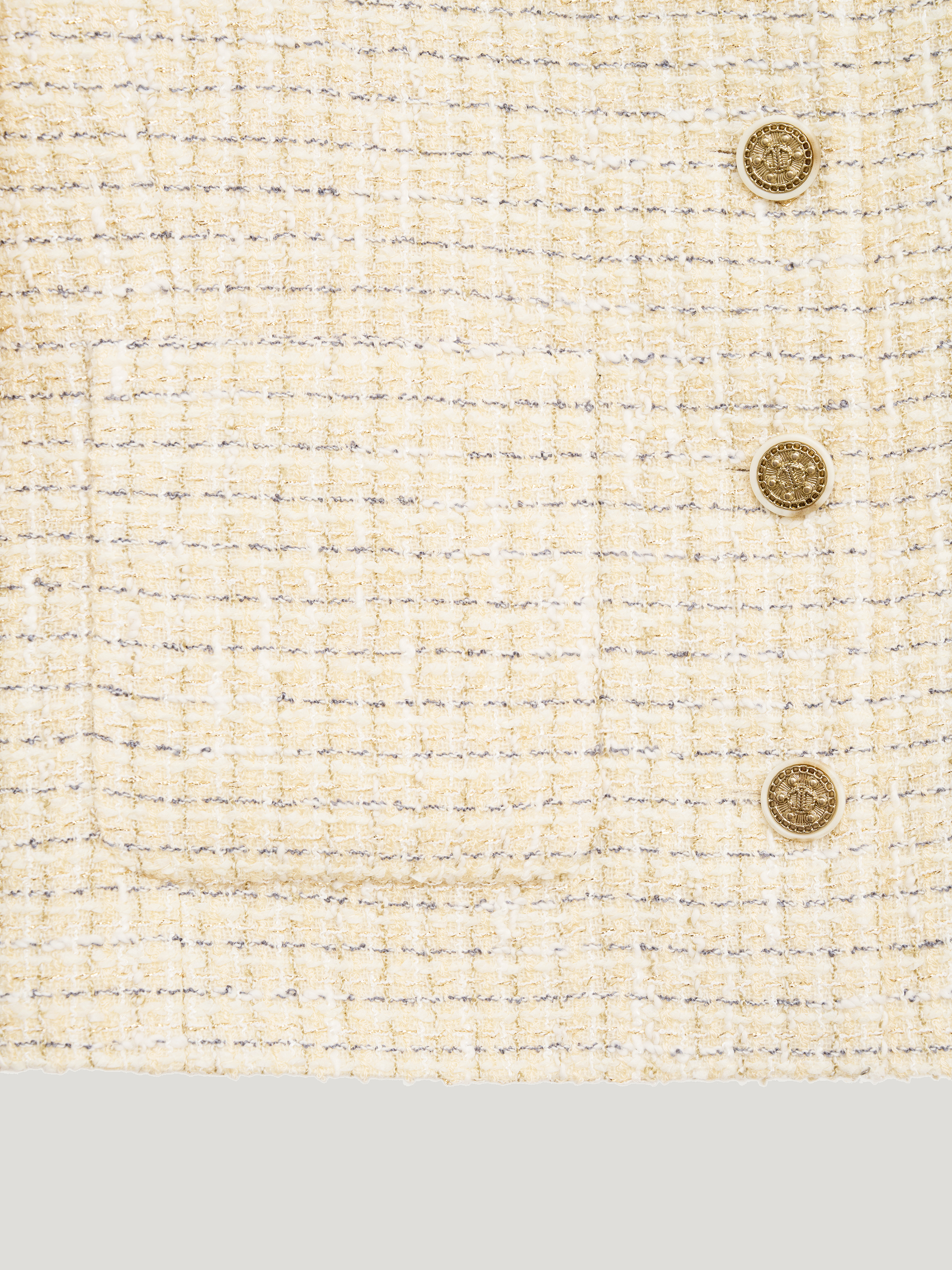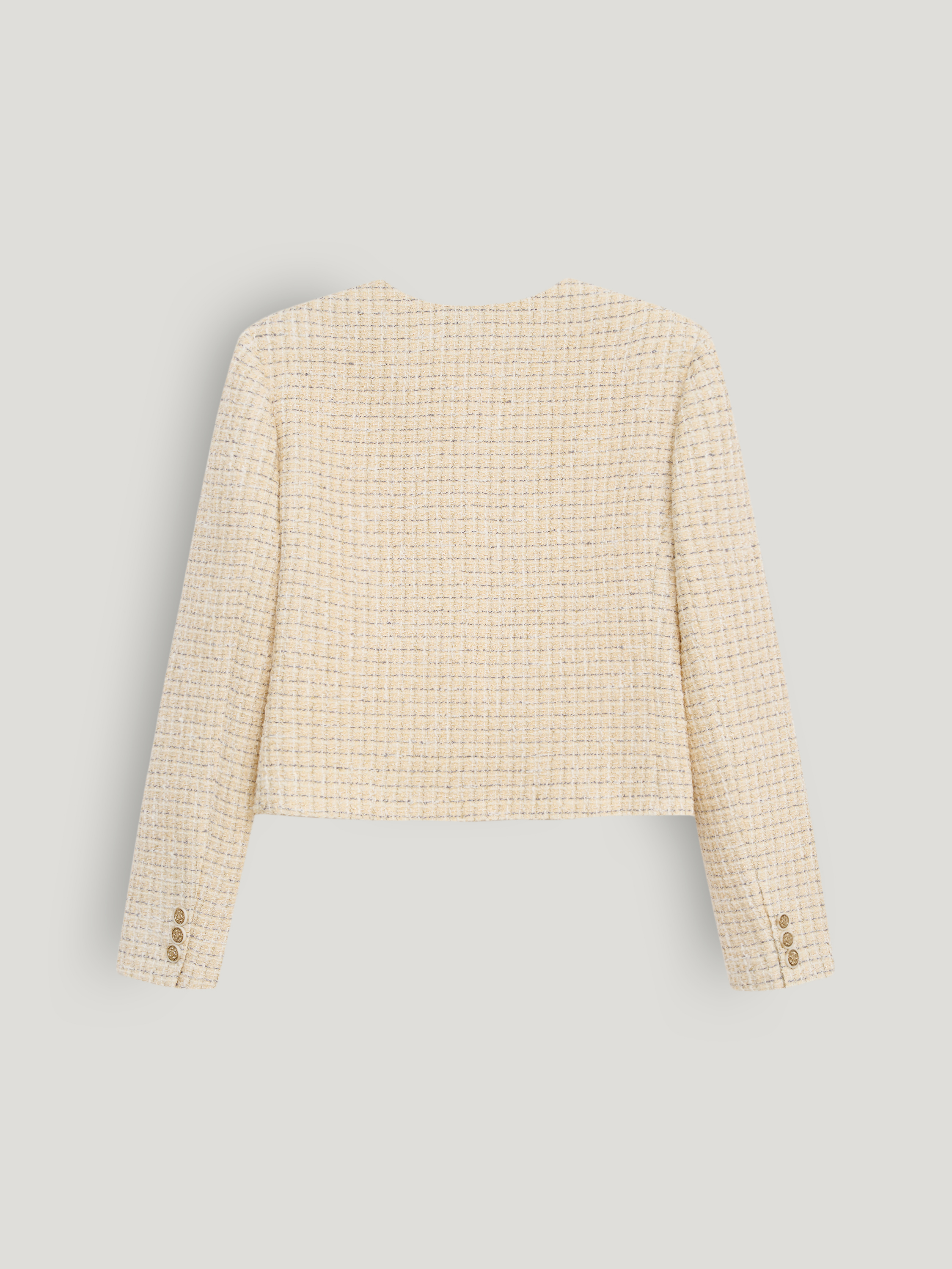 Жакет в светлом бежево-молочном оттенке выполнен из фактурной ткани с мелким плетением в стиле твид, поверхность плотная, с мягким рельефом и деликатным переплетением нитей. Модель укороченная, с аккуратной линией плеча и посадкой по фигуре без лишнего объема, длина — до линии талии, что формирует четкую пропорцию силуэта. Круглая горловина оформлена без воротника, центральная застежка на контрастные декоративные пуговицы выстраивает строгую вертикаль. Длинные рукава и лаконичные накладные карманы поддерживают структурный характер модели. Жакет сочетается с юбками миди и макси, а также с прямыми брюками, сохраняя собранный и сдержанный образ.