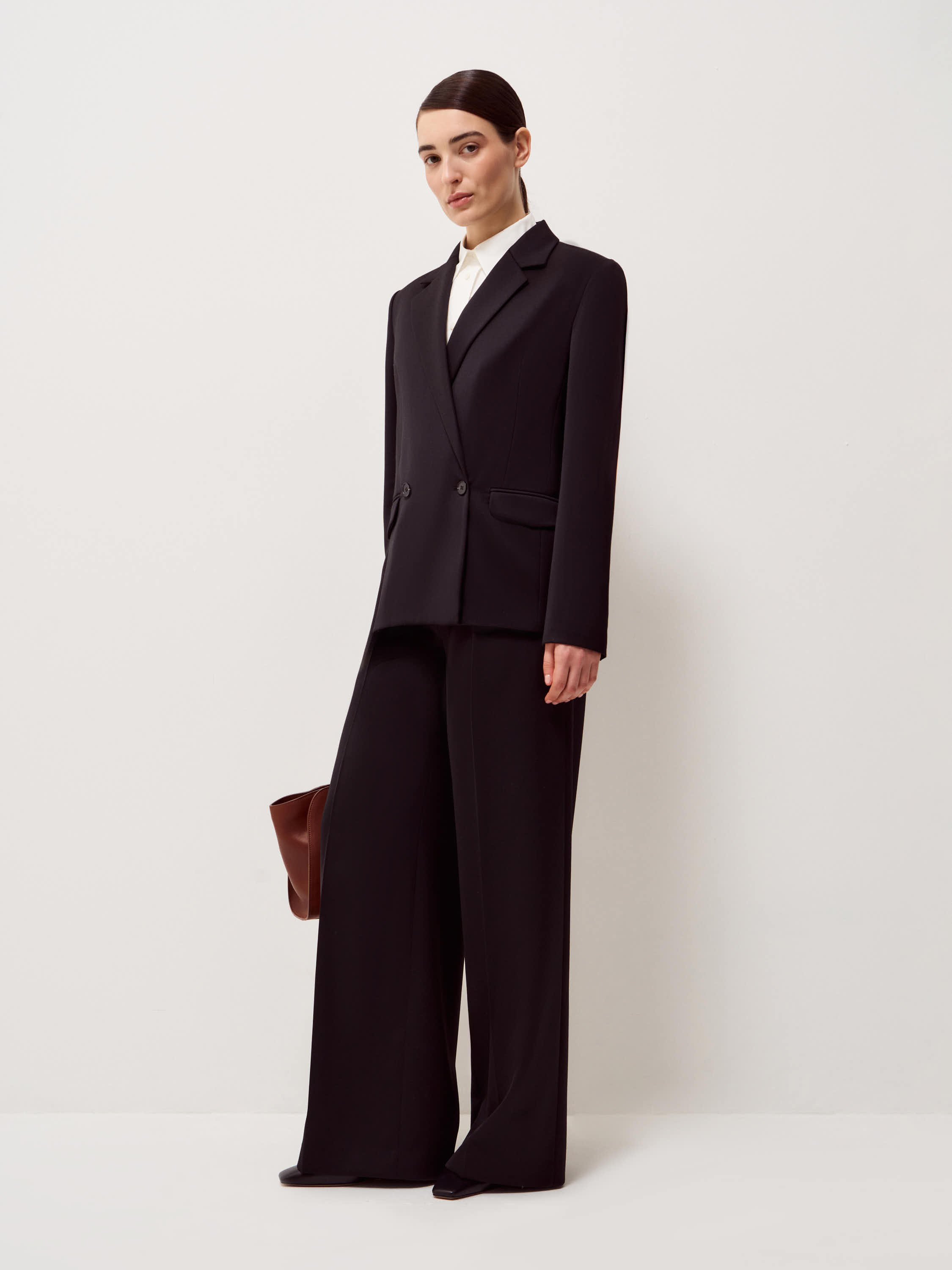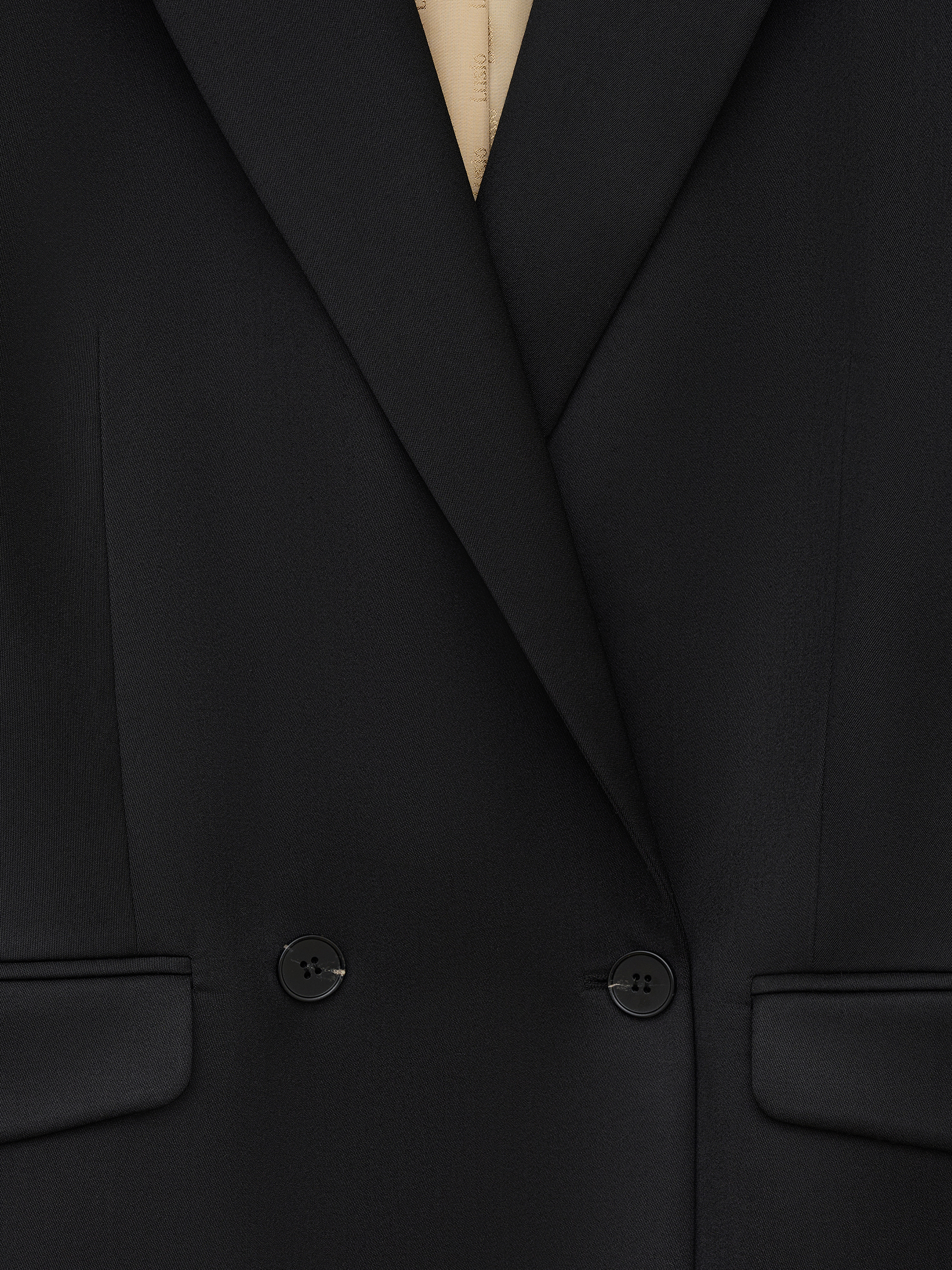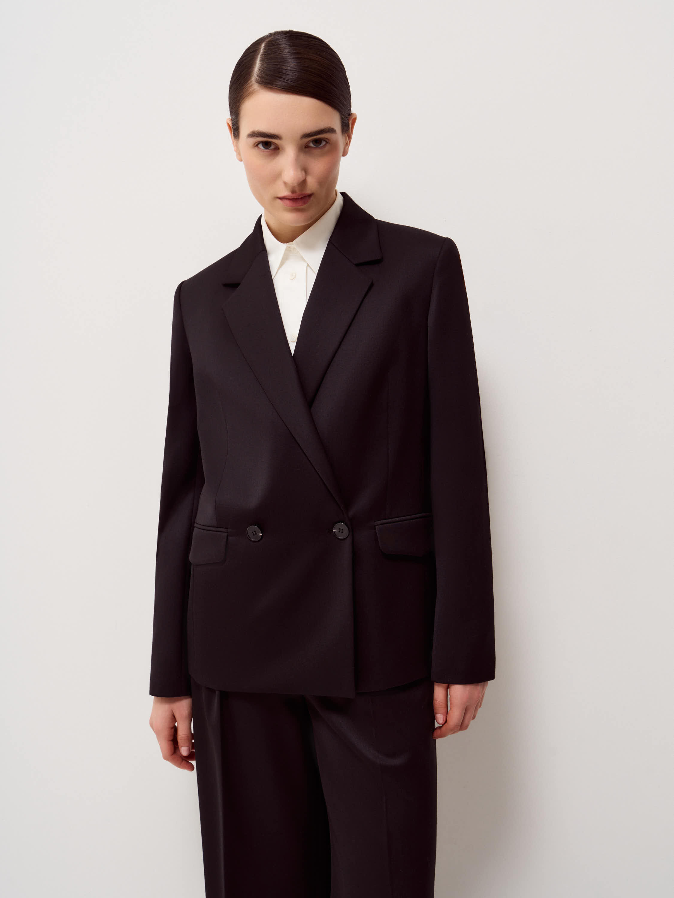 Жакет выполнен из смесовой ткани с содержанием шерсти и вискозы, благодаря чему материал сохраняет форму, выглядит структурно и при этом остается комфортным в носке. Модель прямого кроя с четкой линией плеча и умеренным объемом формирует аккуратный силуэт. Классический отложной лацкан, двубортная застежка и клапаны карманов подчеркивают сдержанный характер модели. Внутренняя отделка выполнена в контрастном светлом оттенке, что добавляет глубины в расстегнутом виде. Черный универсальный цвет легко вписывается в деловые и повседневные комплекты, сочетаясь с брюками в тон, трикотажем и лаконичными рубашками.