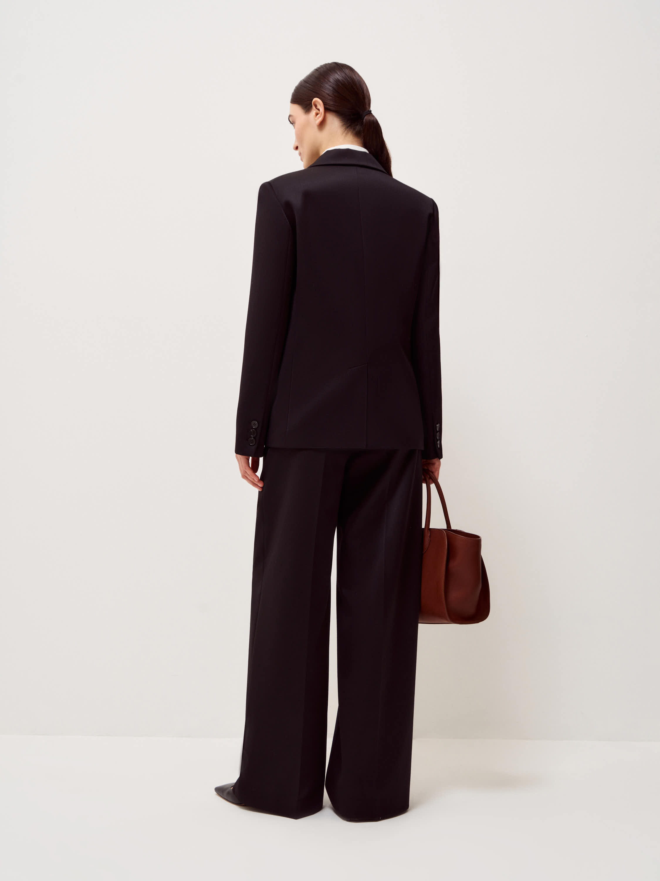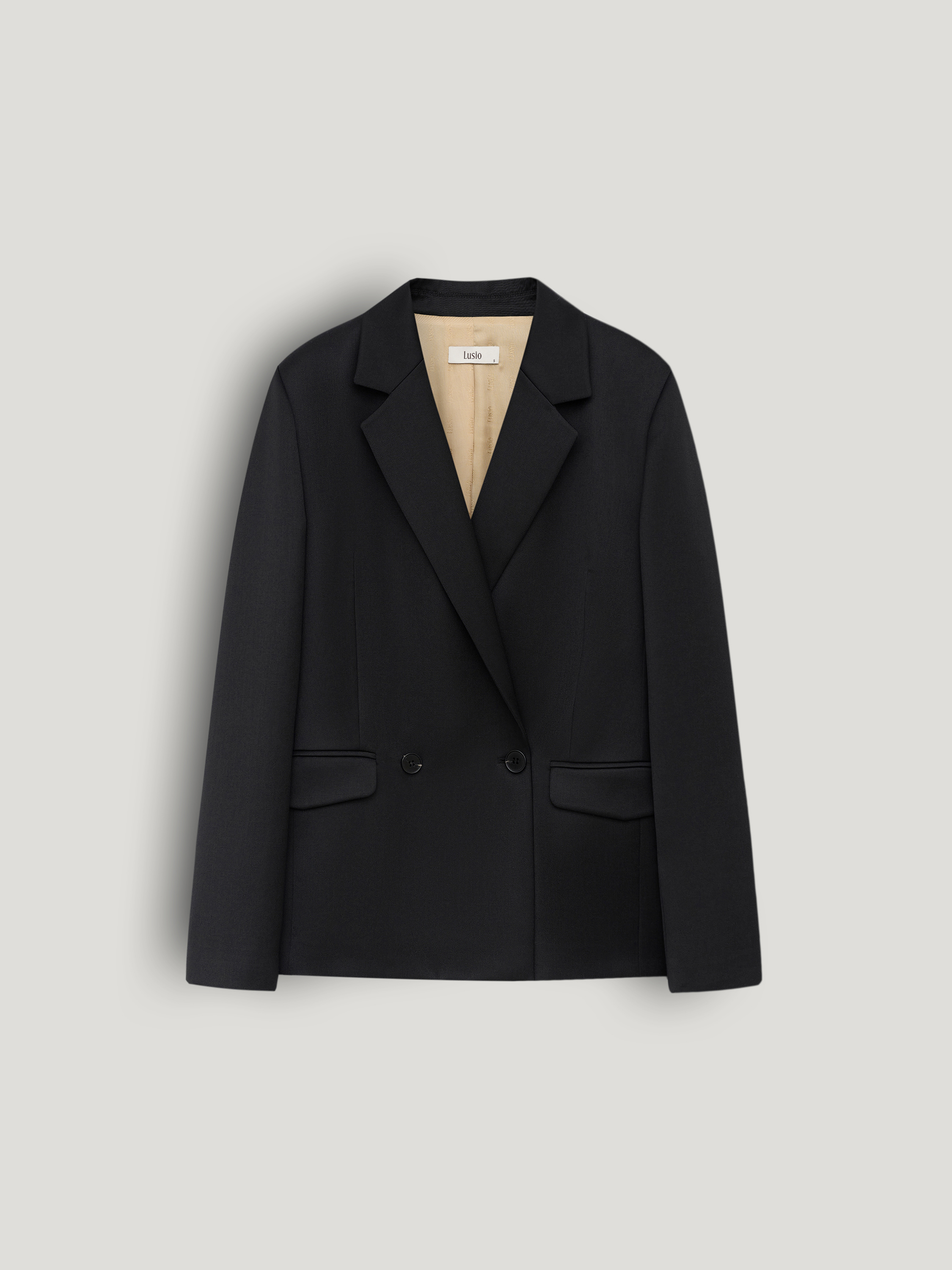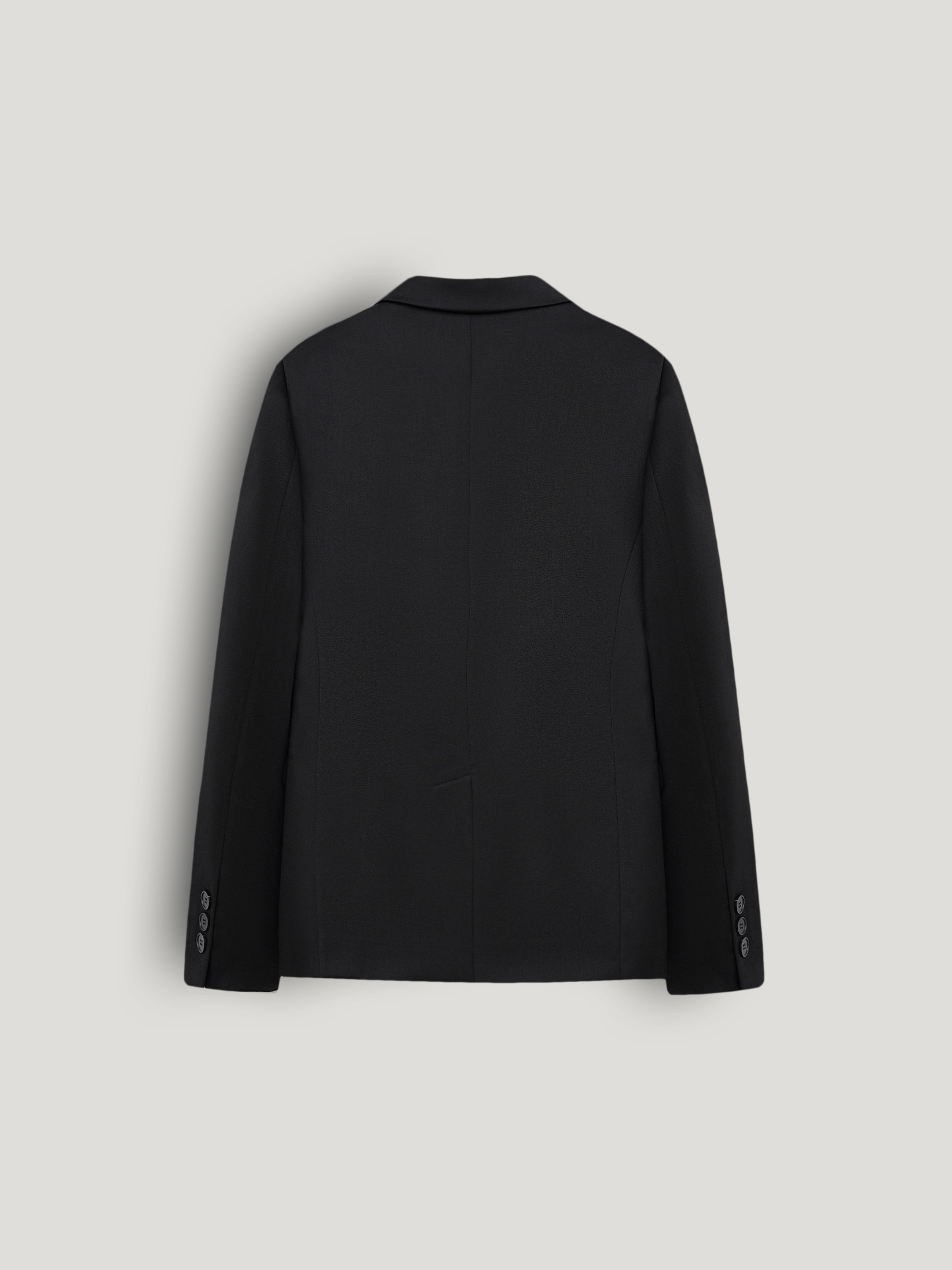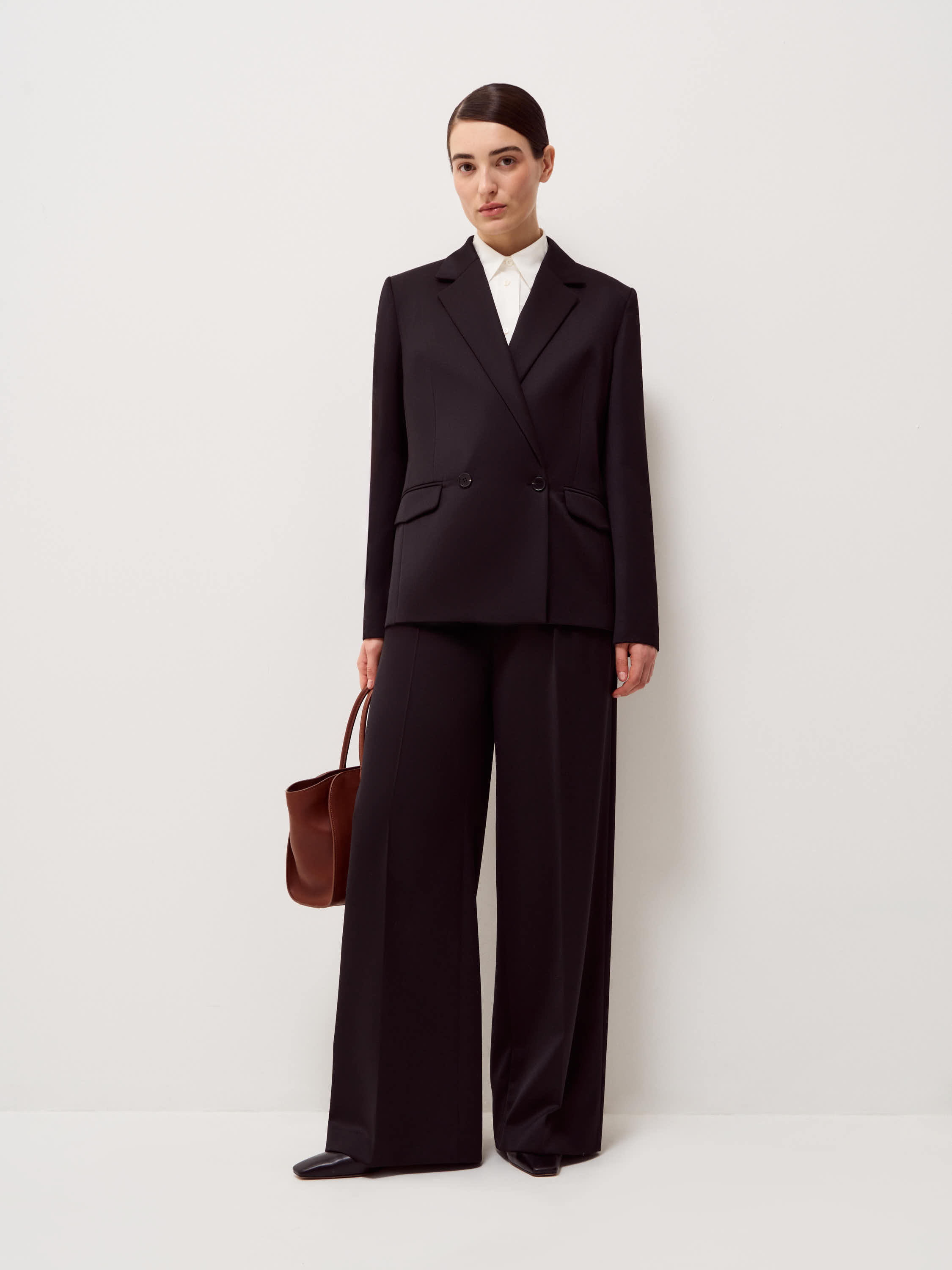 Жакет выполнен из смесовой ткани с содержанием шерсти и вискозы, благодаря чему материал сохраняет форму, выглядит структурно и при этом остается комфортным в носке. Модель прямого кроя с четкой линией плеча и умеренным объемом формирует аккуратный силуэт. Классический отложной лацкан, двубортная застежка и клапаны карманов подчеркивают сдержанный характер модели. Внутренняя отделка выполнена в контрастном светлом оттенке, что добавляет глубины в расстегнутом виде. Черный универсальный цвет легко вписывается в деловые и повседневные комплекты, сочетаясь с брюками в тон, трикотажем и лаконичными рубашками.