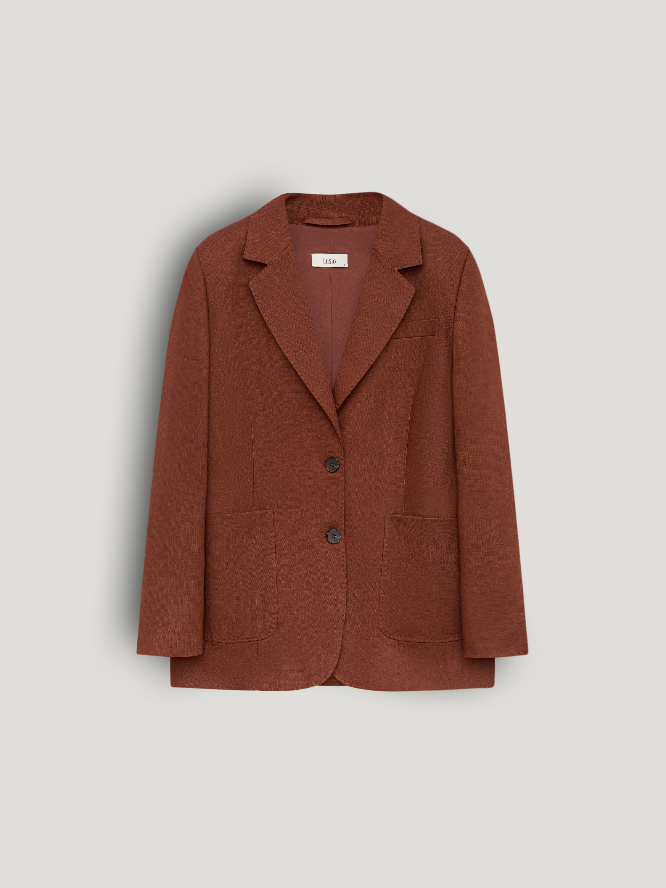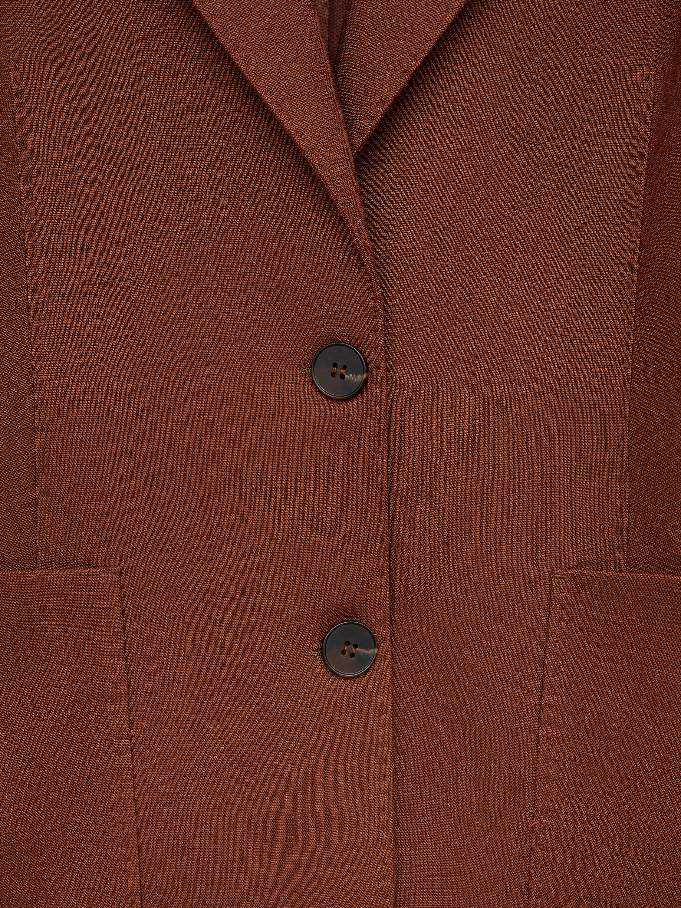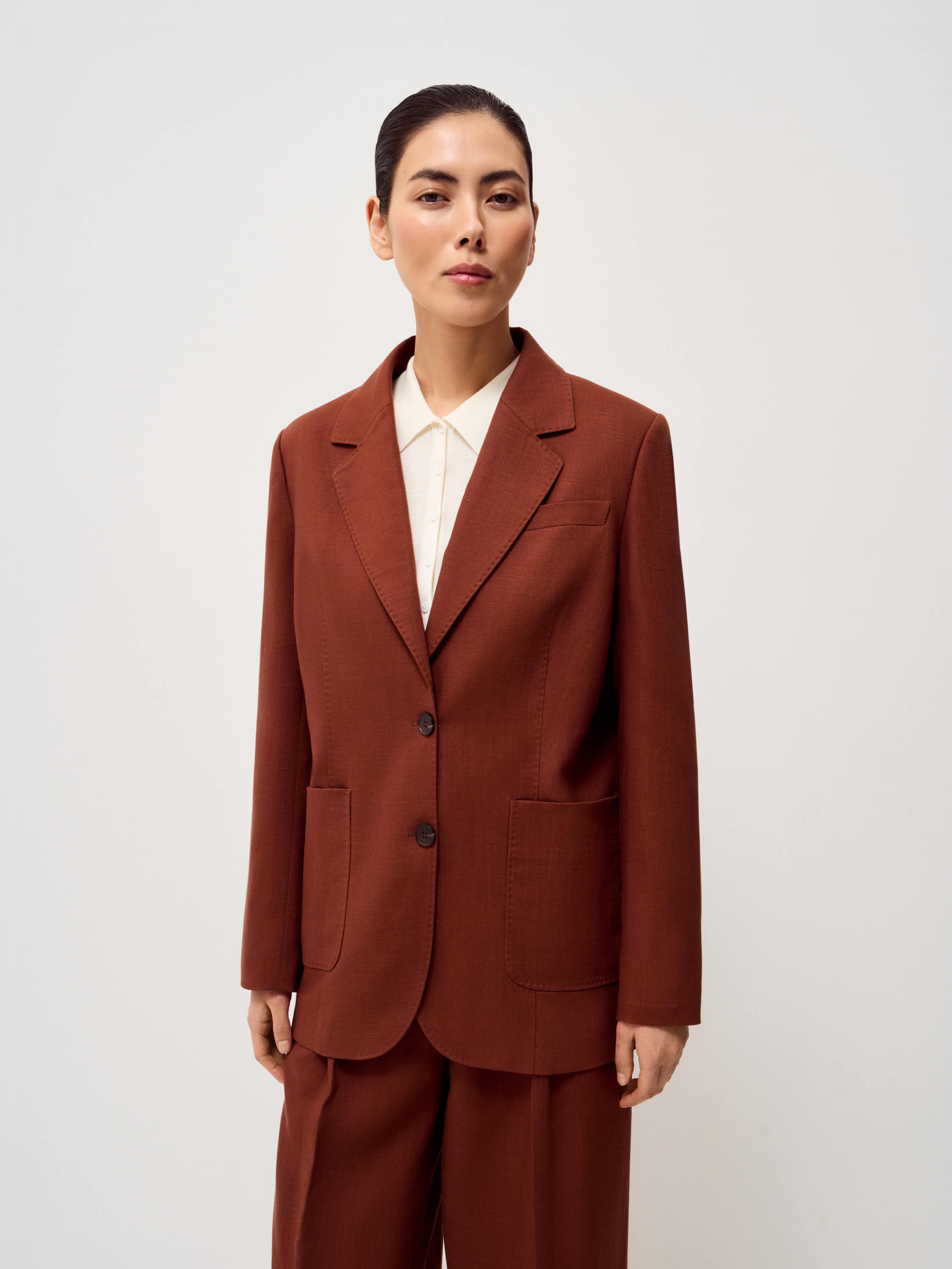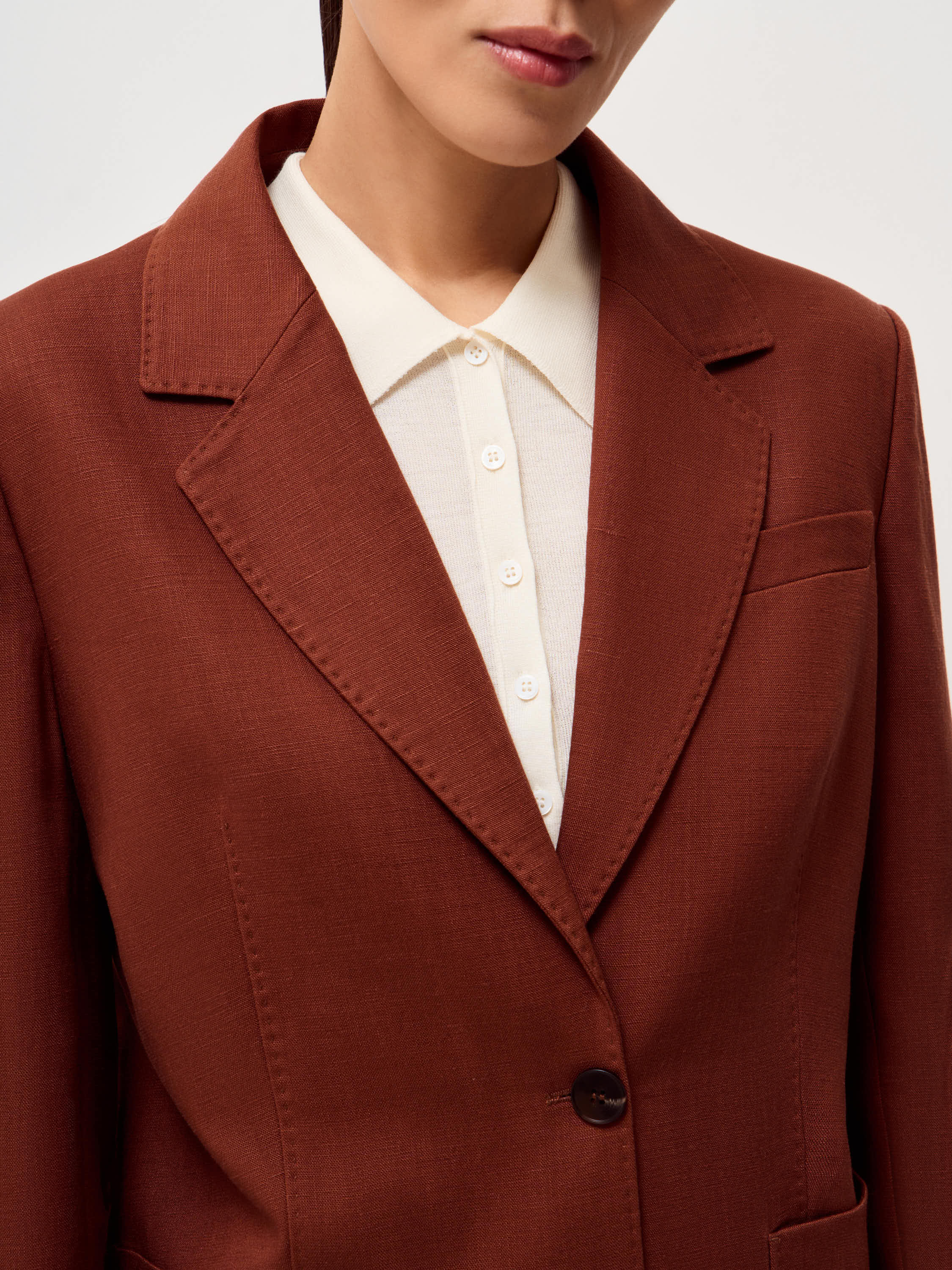 Жакет прямого силуэта с классическими лацканами и застежкой на две пуговицы. Модель выполнена из смесовой ткани на основе тенсела и льна. Материал сочетает мягкость и пластичность тенсела с характерной для льна легкой фактурностью и способностью хорошо держать форму. Ткань приятна на ощупь, обладает хорошей воздухопроницаемостью и сохраняет аккуратный внешний вид в течение дня. Подкладка из хлопка делает модель более комфортной в носке. Жакет дополнен нагрудным карманом и двумя накладными карманами по нижней линии переда. Лаконичный крой и мягкая линия плеча формируют сдержанный силуэт, благодаря чему модель легко вписывается как в деловые, так и в повседневные образы. Глубокий терракотовый оттенок добавляет образу выразительности и хорошо сочетается с нейтральной палитрой гардероба.