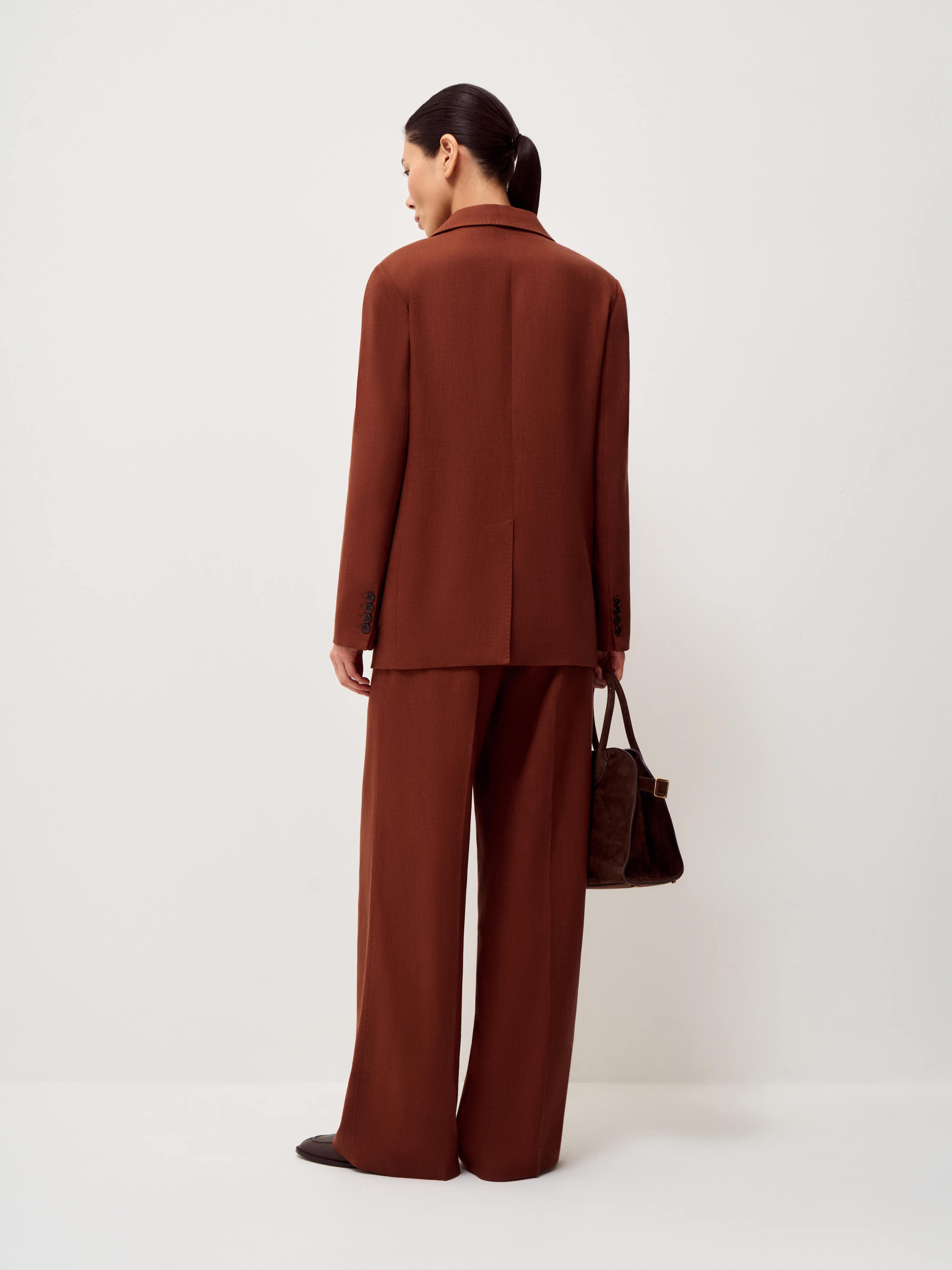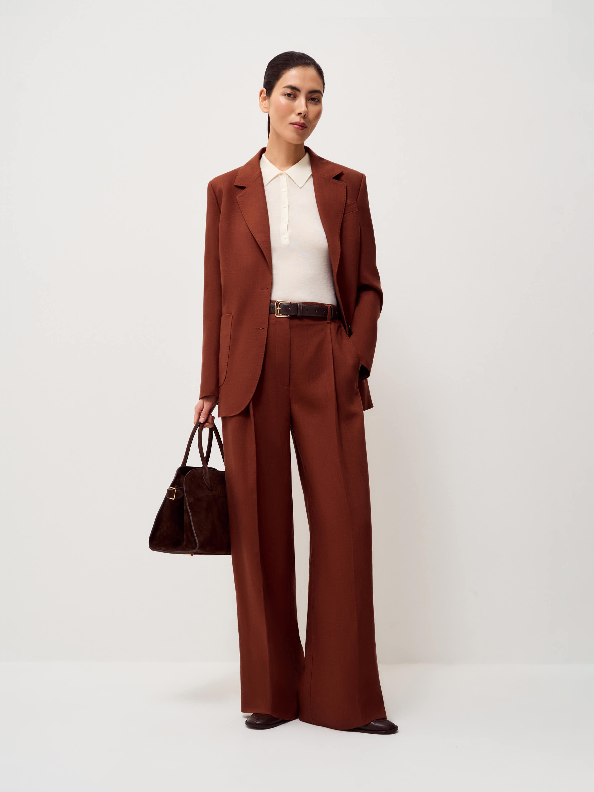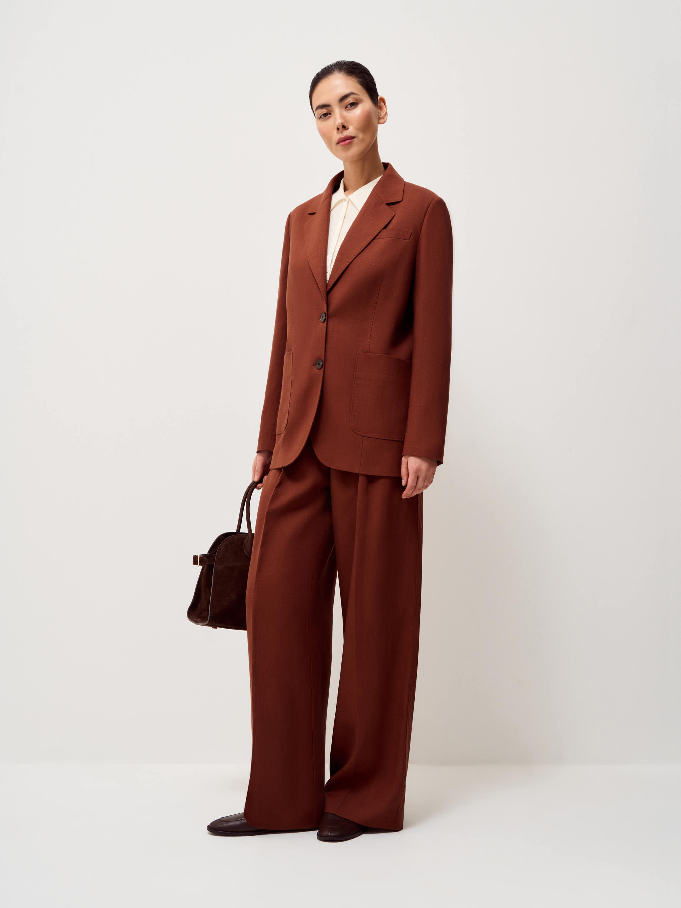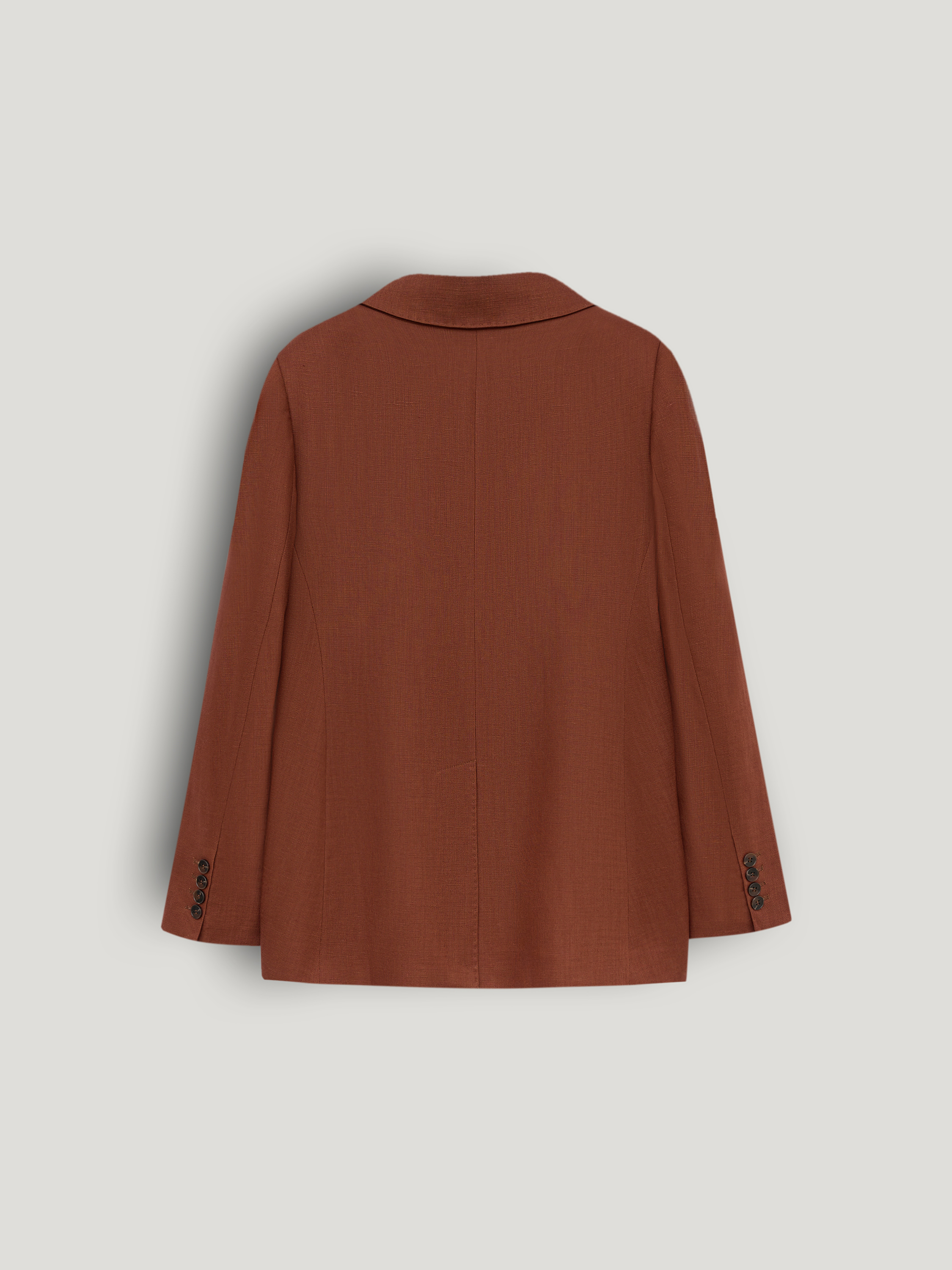 Жакет прямого силуэта с классическими лацканами и застежкой на две пуговицы. Модель выполнена из смесовой ткани на основе тенсела и льна. Материал сочетает мягкость и пластичность тенсела с характерной для льна легкой фактурностью и способностью хорошо держать форму. Ткань приятна на ощупь, обладает хорошей воздухопроницаемостью и сохраняет аккуратный внешний вид в течение дня. Подкладка из хлопка делает модель более комфортной в носке. Жакет дополнен нагрудным карманом и двумя накладными карманами по нижней линии переда. Лаконичный крой и мягкая линия плеча формируют сдержанный силуэт, благодаря чему модель легко вписывается как в деловые, так и в повседневные образы. Глубокий терракотовый оттенок добавляет образу выразительности и хорошо сочетается с нейтральной палитрой гардероба.