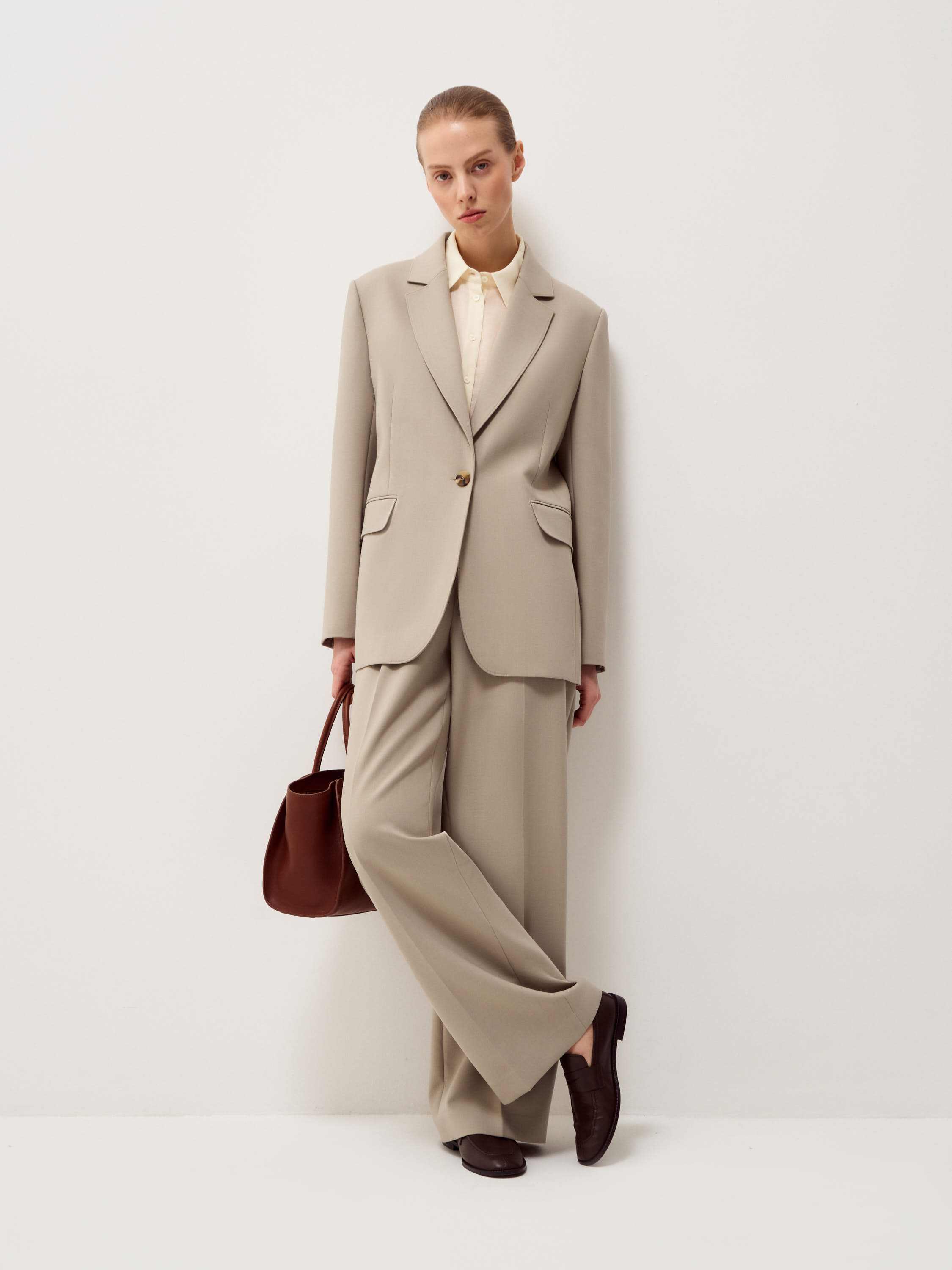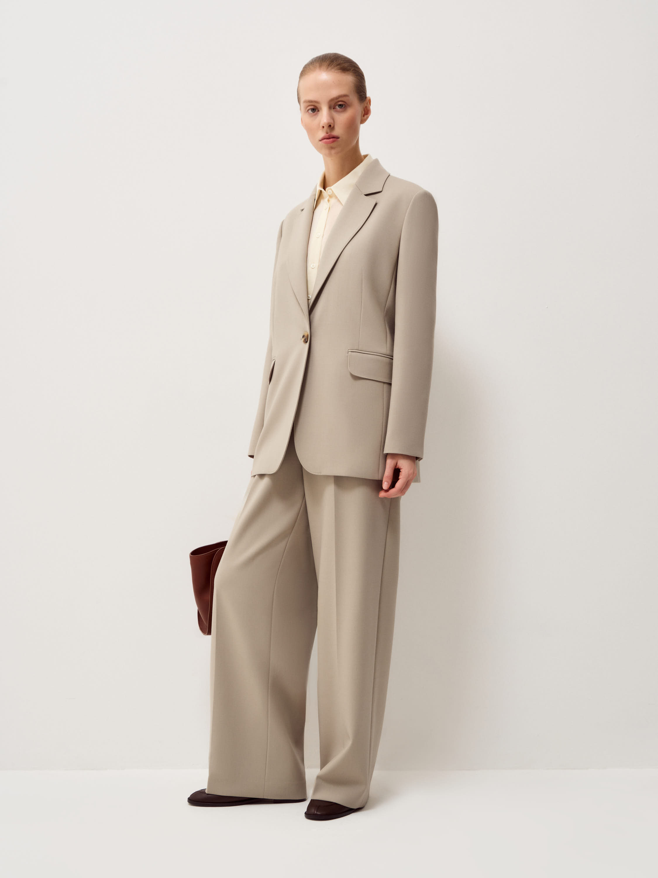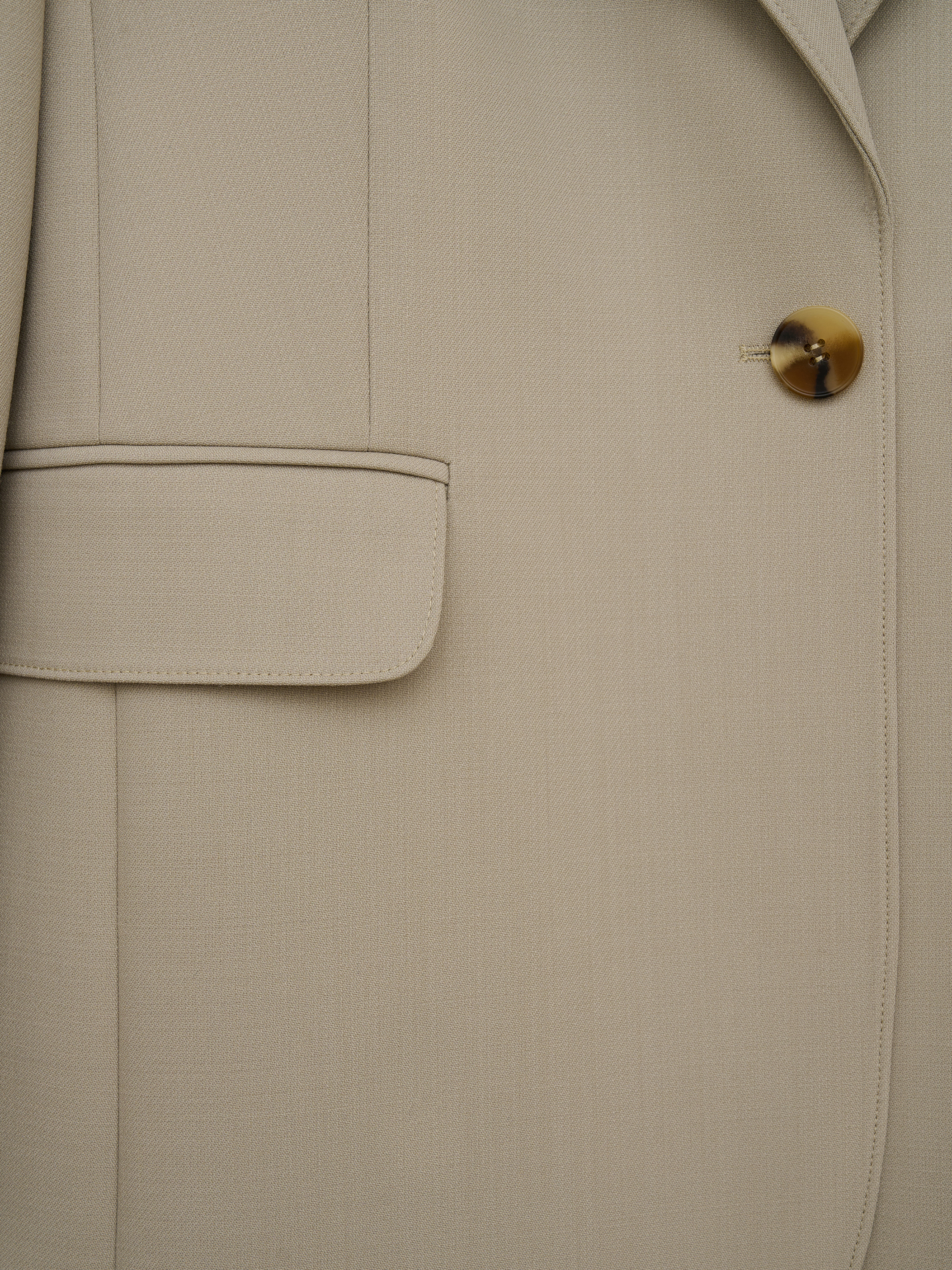 Жакет выполнен из плотной костюмной ткани с высоким содержанием шерсти и вискозы, что обеспечивает мягкость, комфорт и аккуратную форму силуэта. Материал пластичный, держит структуру и подходит для повседневной и деловой носки. Модель прямого кроя с классическими лацканами и застежкой на одну пуговицу формирует сдержанный, собранный силуэт. Прорезные карманы с клапанами подчеркивают чистоту линий и добавляют функциональность. Оттенок сложный беж с легким холодным, едва заметным ментоловым подтоном выглядит современно и легко сочетается с брюками в тон, светлым трикотажем и денимом.