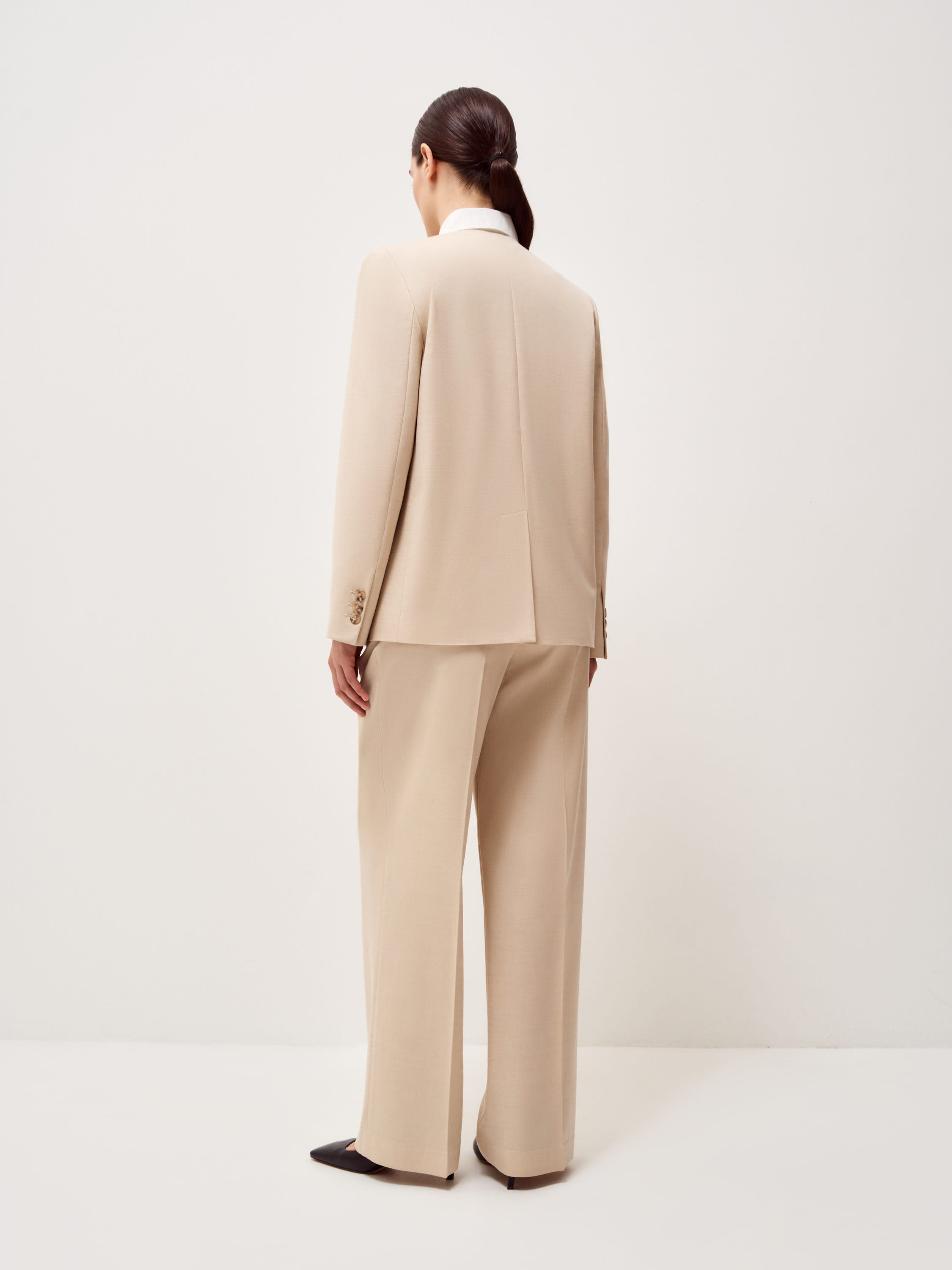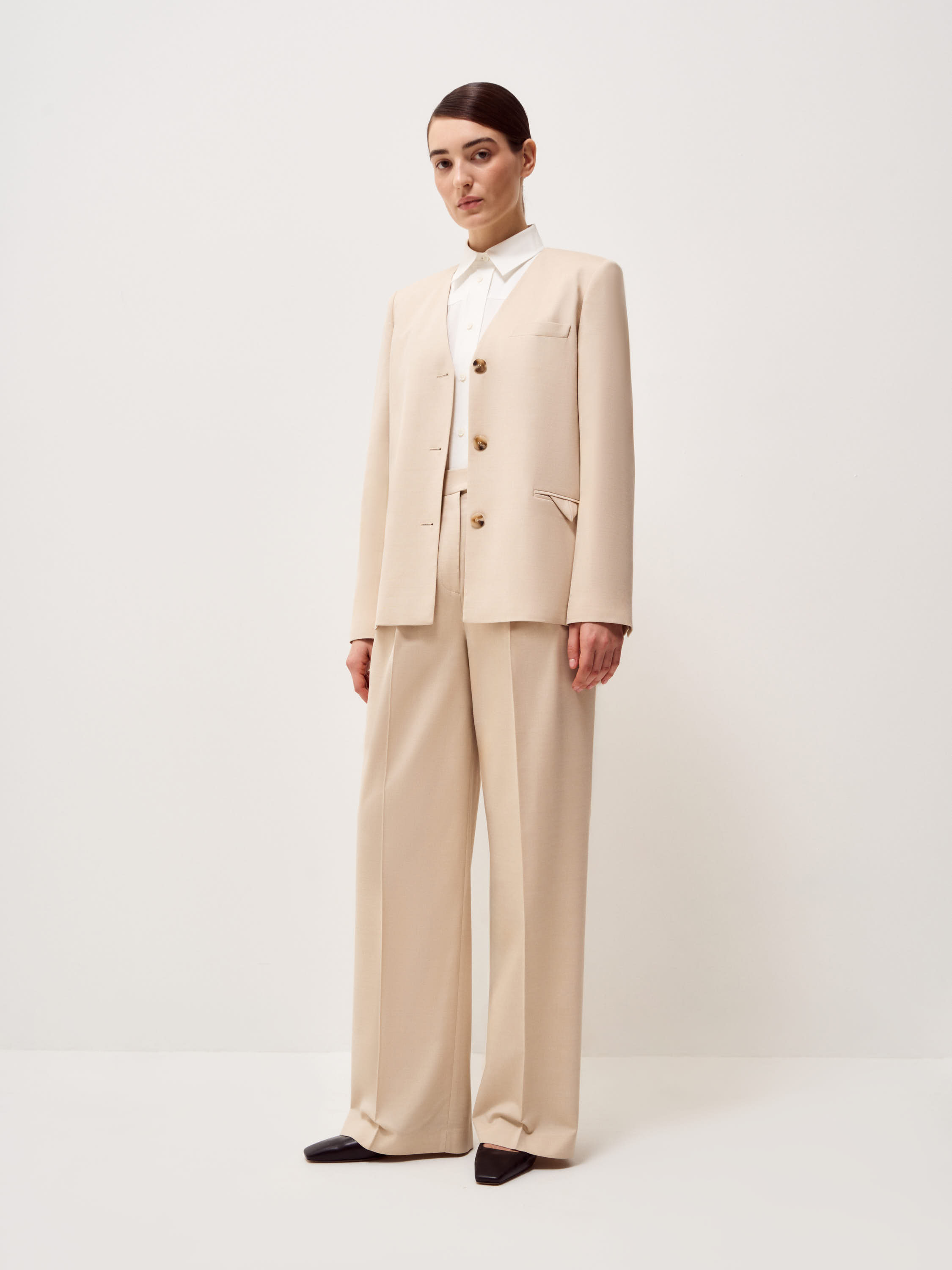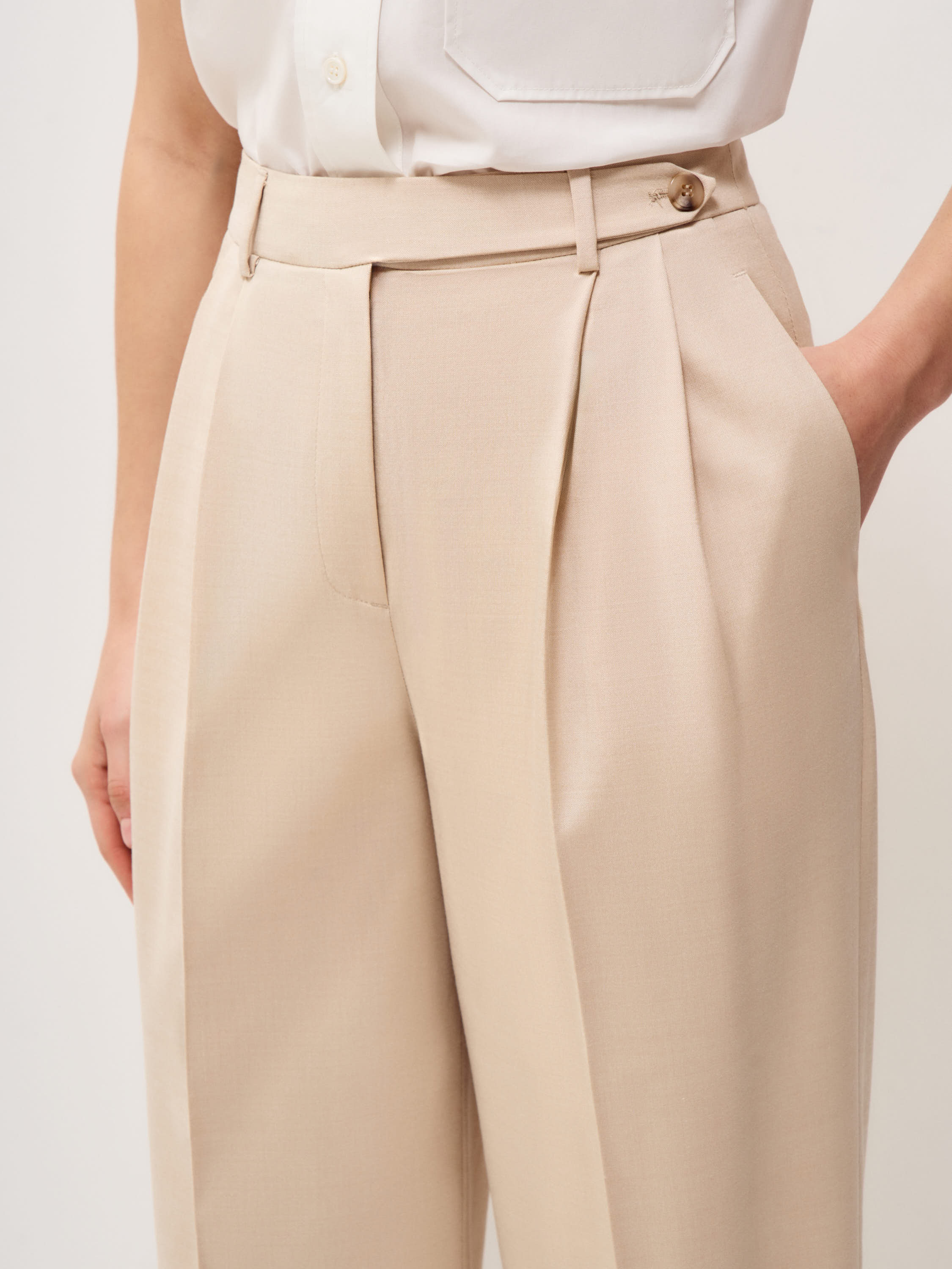 Брюки выполнены из смесовой костюмной ткани на основе шерсти. Модель с высокой посадкой и мягкими складками у пояса, которые формируют объем в верхней части и обеспечивают свободу движения. Силуэт прямой, с легким расширением к низу, длина в пол, линия низа закрывает обувь. Стрелки выстраивают четкую вертикаль и задают аккуратную геометрию. Пояс со шлевками под ремень, застежка скрытая, предусмотрены боковые карманы. Оттенок светлый беж с теплым подтоном сочетается с молочной, карамельной и темно-коричневой палитрой. Подходят для комплектов с жилетом или жакетом в тон, а также с лаконичным трикотажем.
