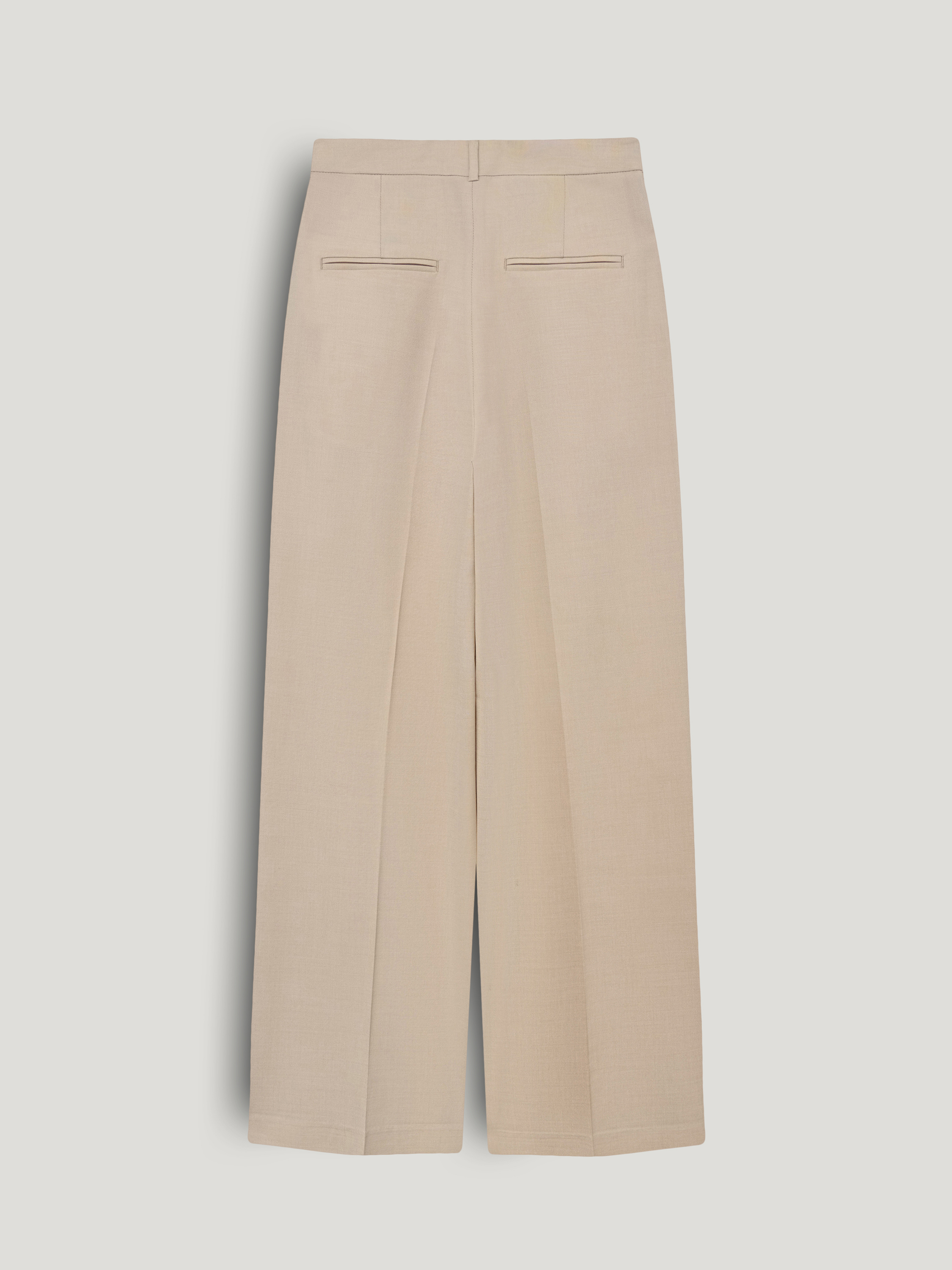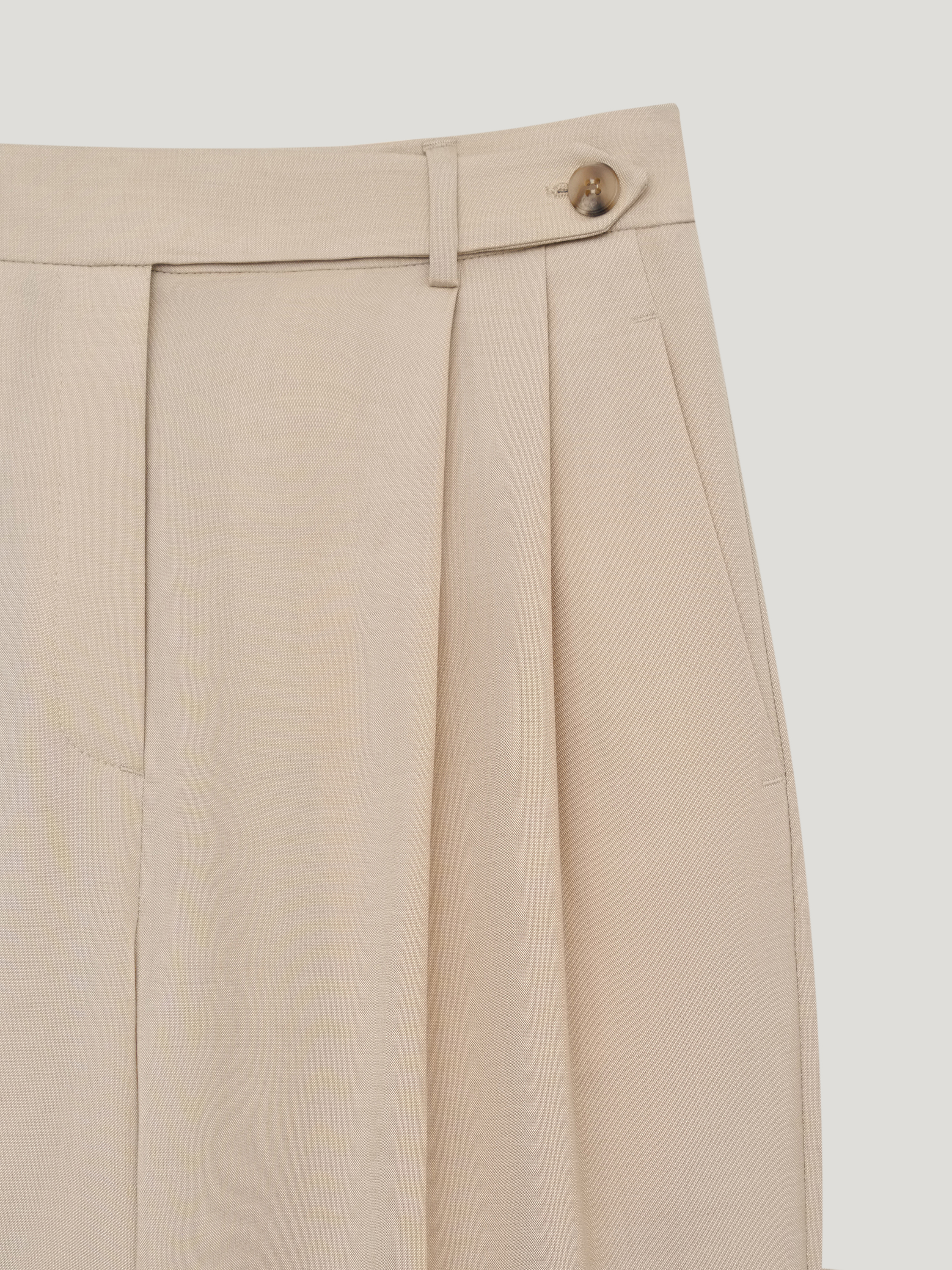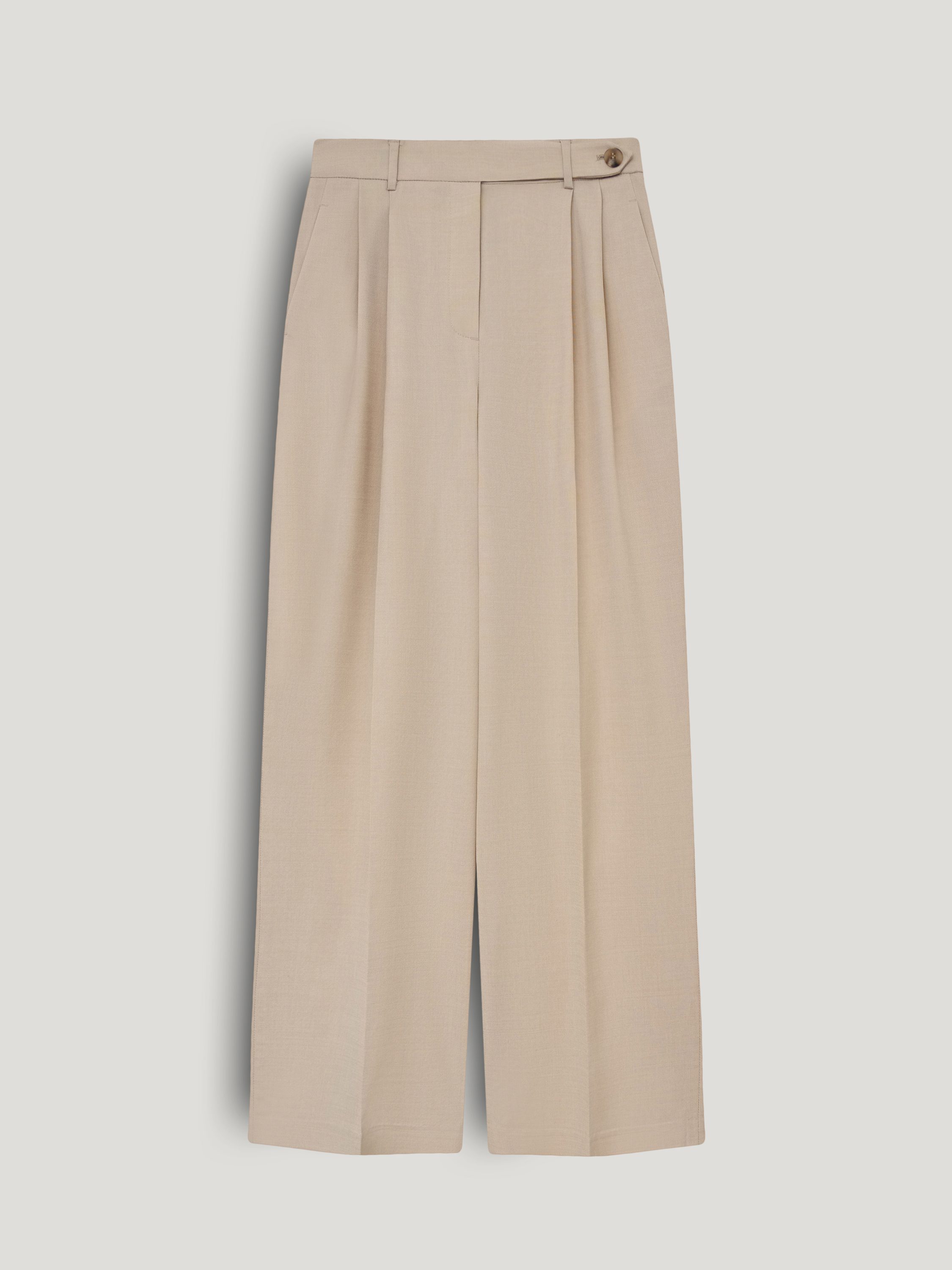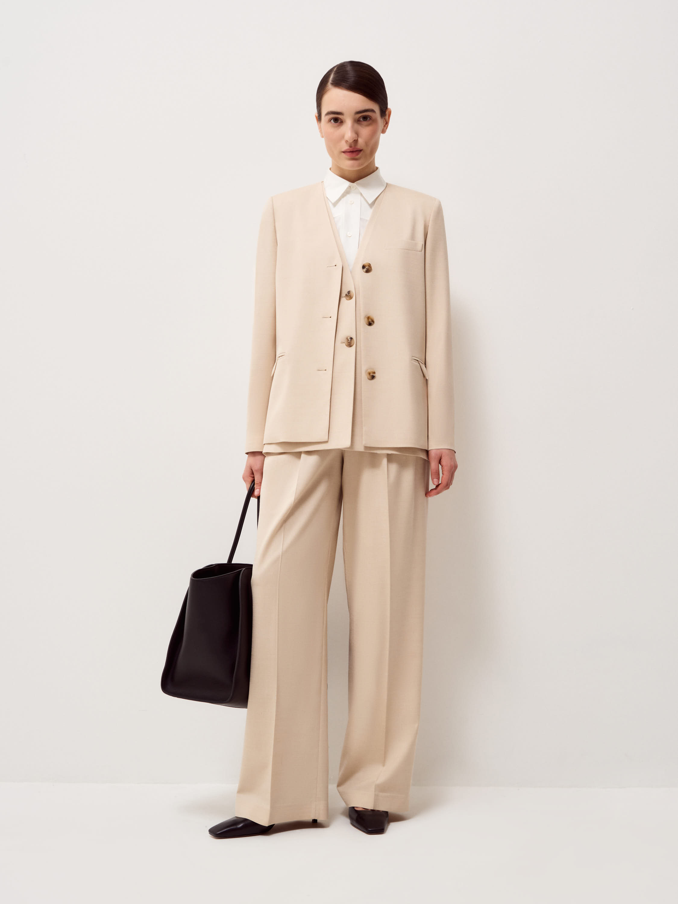 Брюки выполнены из смесовой костюмной ткани на основе шерсти. Модель с высокой посадкой и мягкими складками у пояса, которые формируют объем в верхней части и обеспечивают свободу движения. Силуэт прямой, с легким расширением к низу, длина в пол, линия низа закрывает обувь. Стрелки выстраивают четкую вертикаль и задают аккуратную геометрию. Пояс со шлевками под ремень, застежка скрытая, предусмотрены боковые карманы. Оттенок светлый беж с теплым подтоном сочетается с молочной, карамельной и темно-коричневой палитрой. Подходят для комплектов с жилетом или жакетом в тон, а также с лаконичным трикотажем.