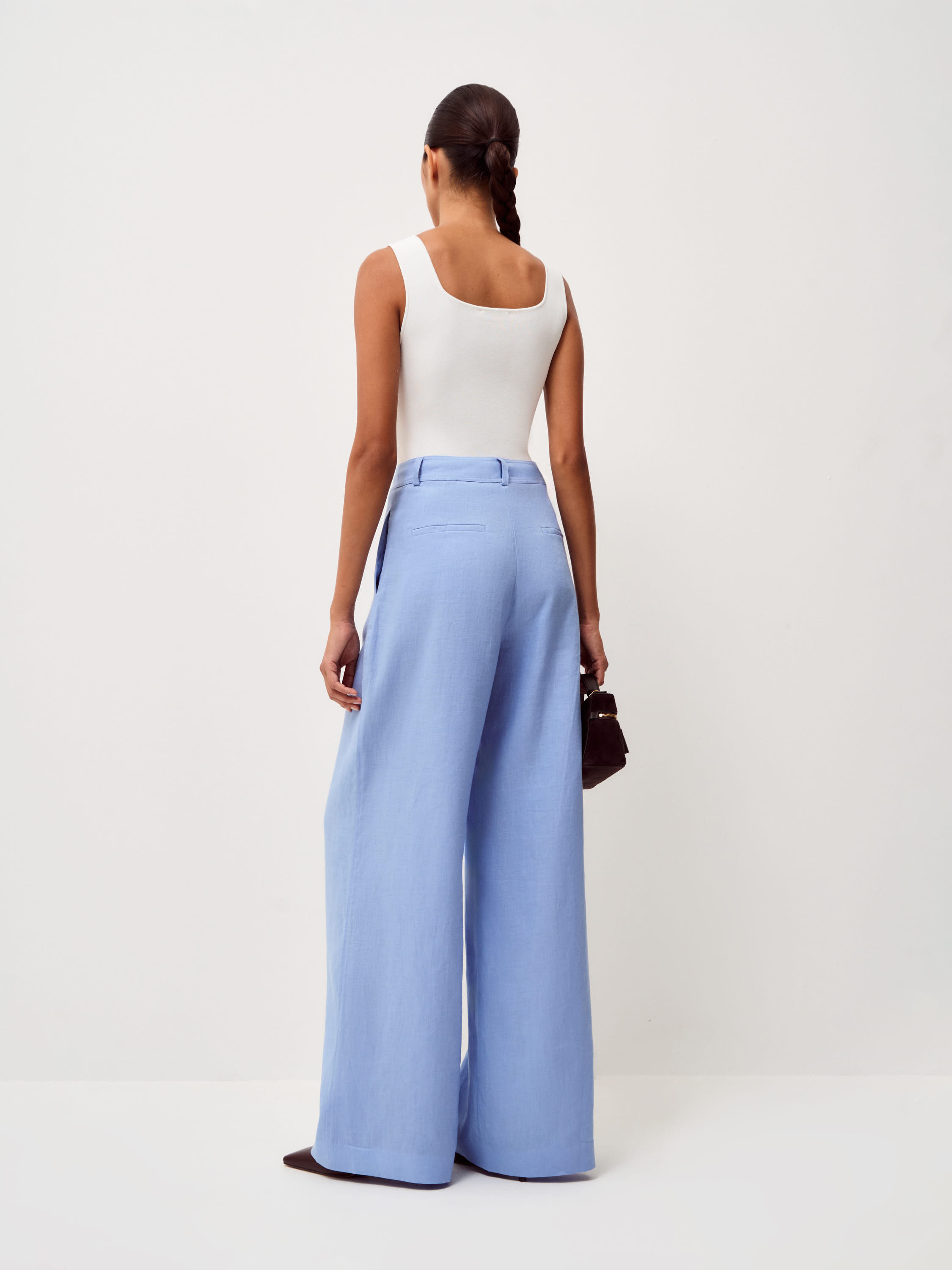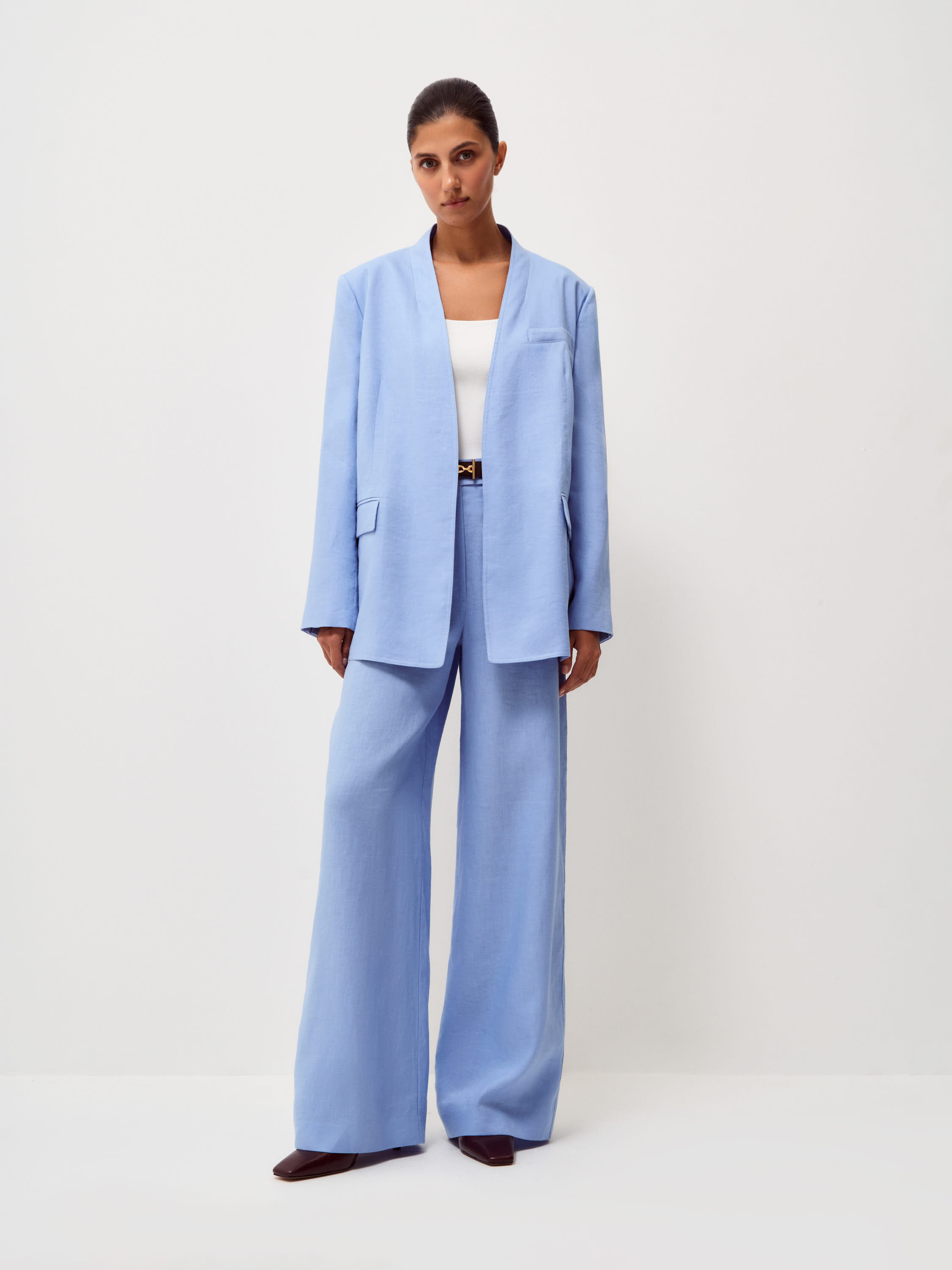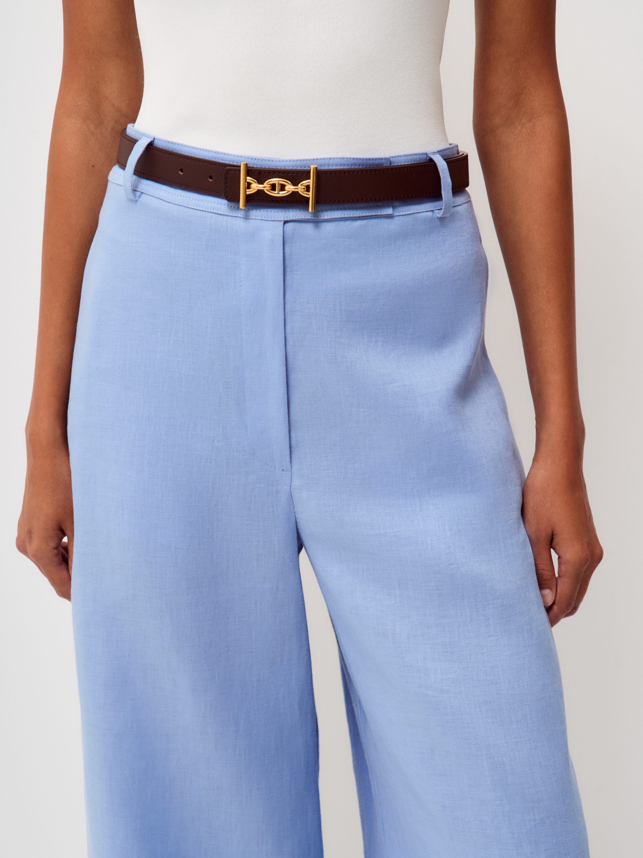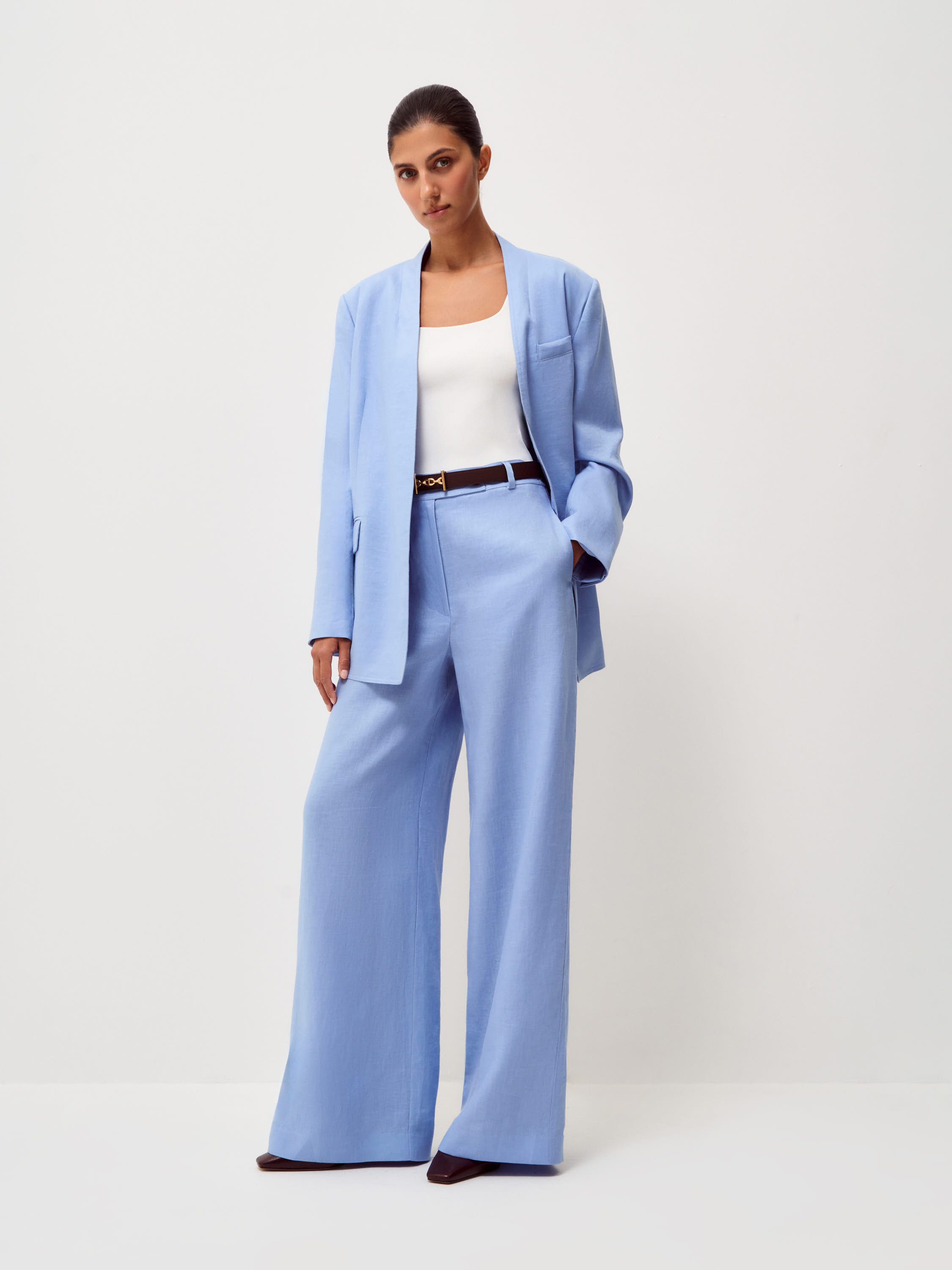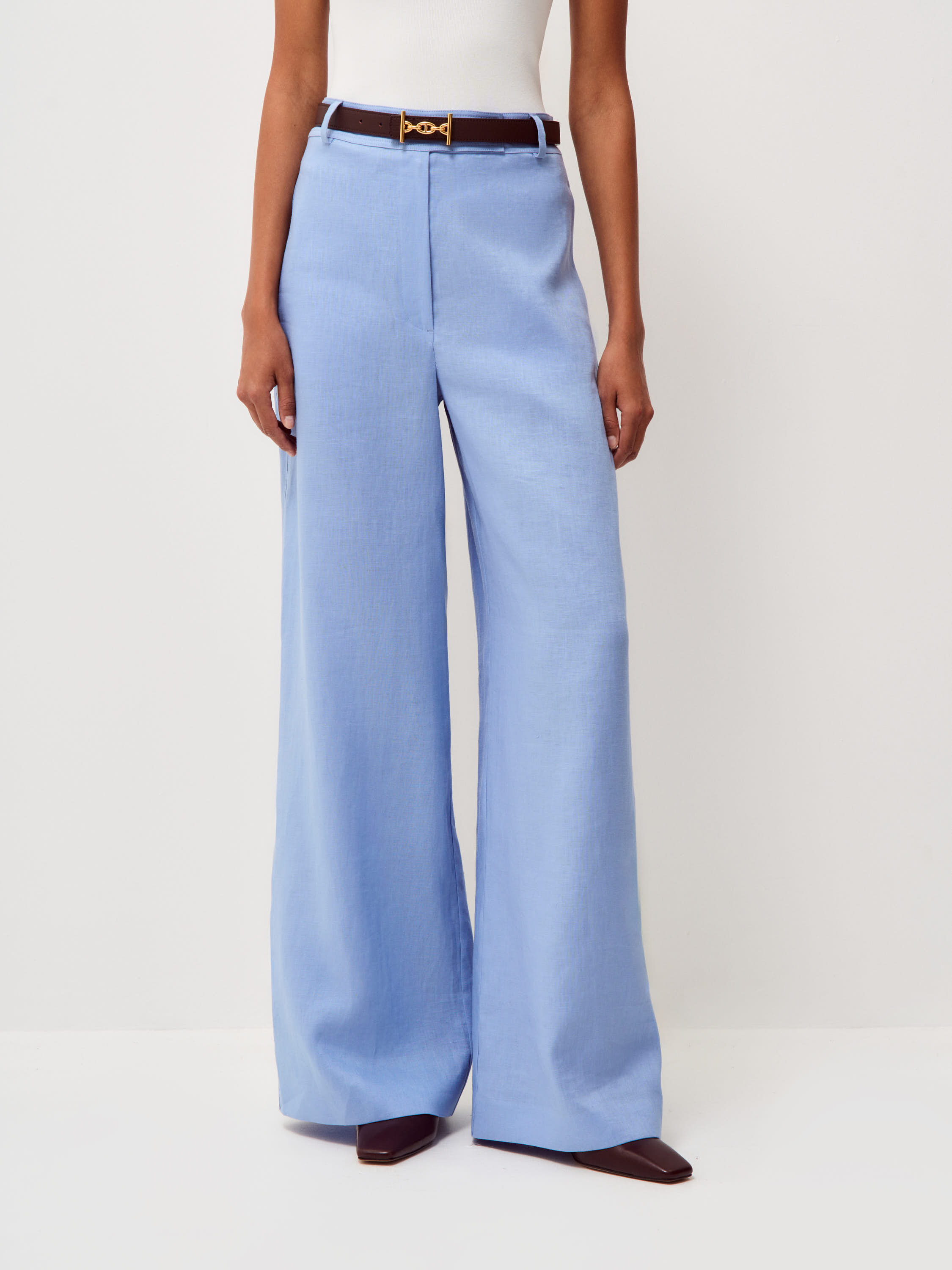Брюки прямого широкого силуэта выполнены изо льна с хлопковой подкладкой. Лен отличается воздухопроницаемостью, легкостью и характерной натуральной фактурой, благодаря чему материал комфортен в теплую погоду и хорошо сохраняет форму, а хлопковая подкладка делает посадку более мягкой и аккуратной. Модель с высокой посадкой и четкой линией талии формирует вытянутую пропорцию силуэта. Широкие брючины свободно спадают по линии ноги и создают выразительную вертикаль, а мягкий голубой оттенок подчеркивает легкость образа и легко сочетается с базовыми элементами гардероба.