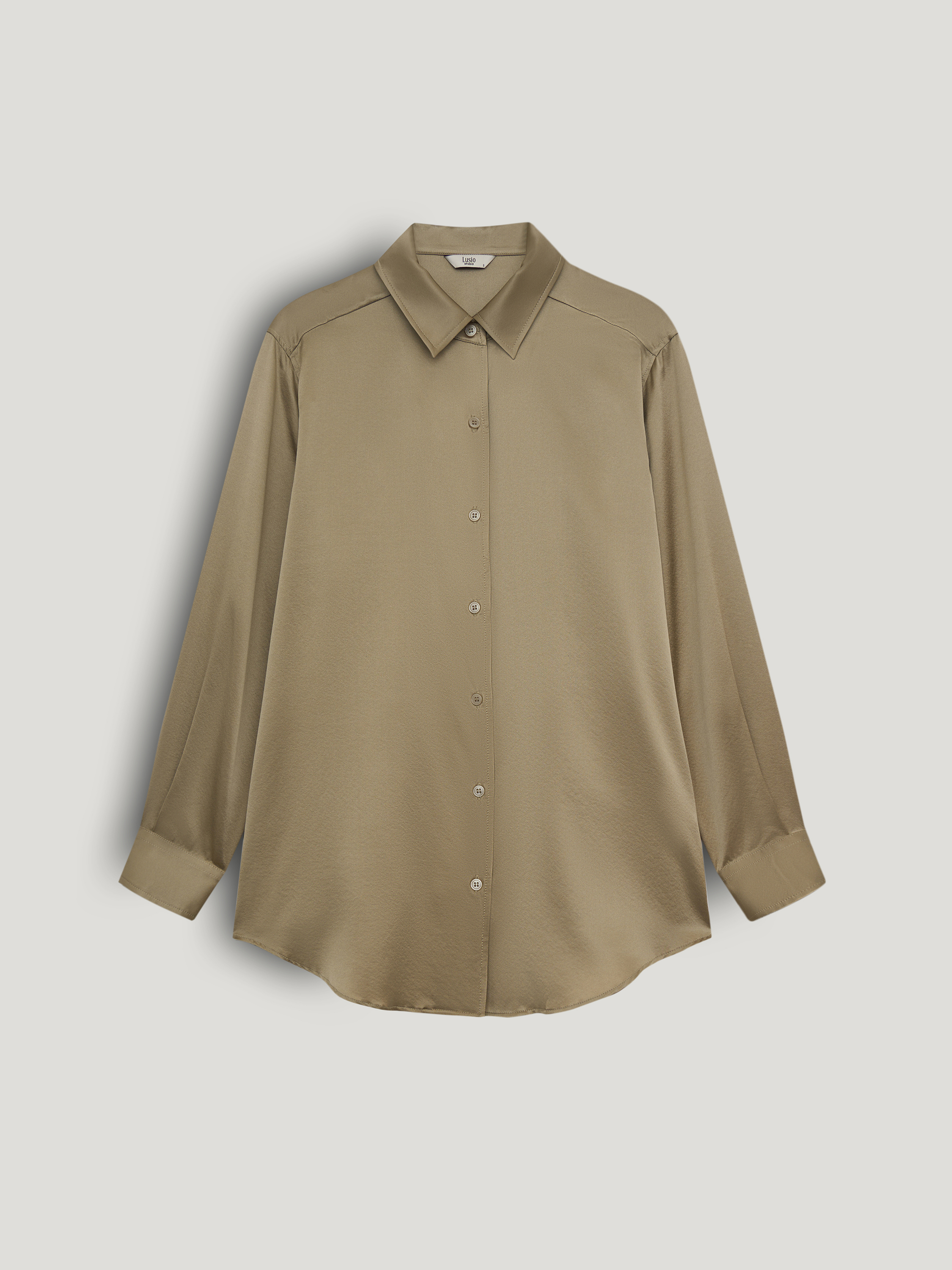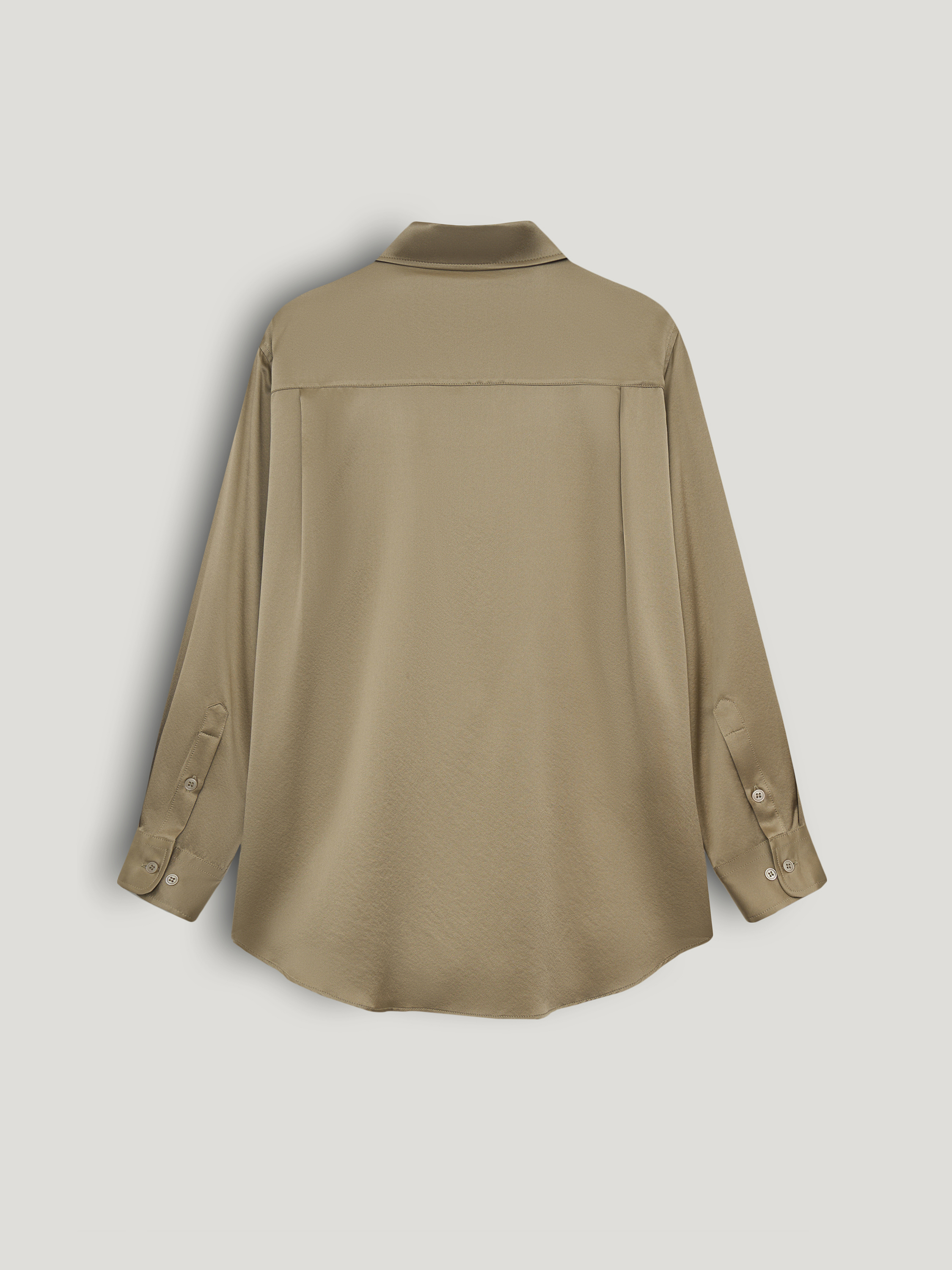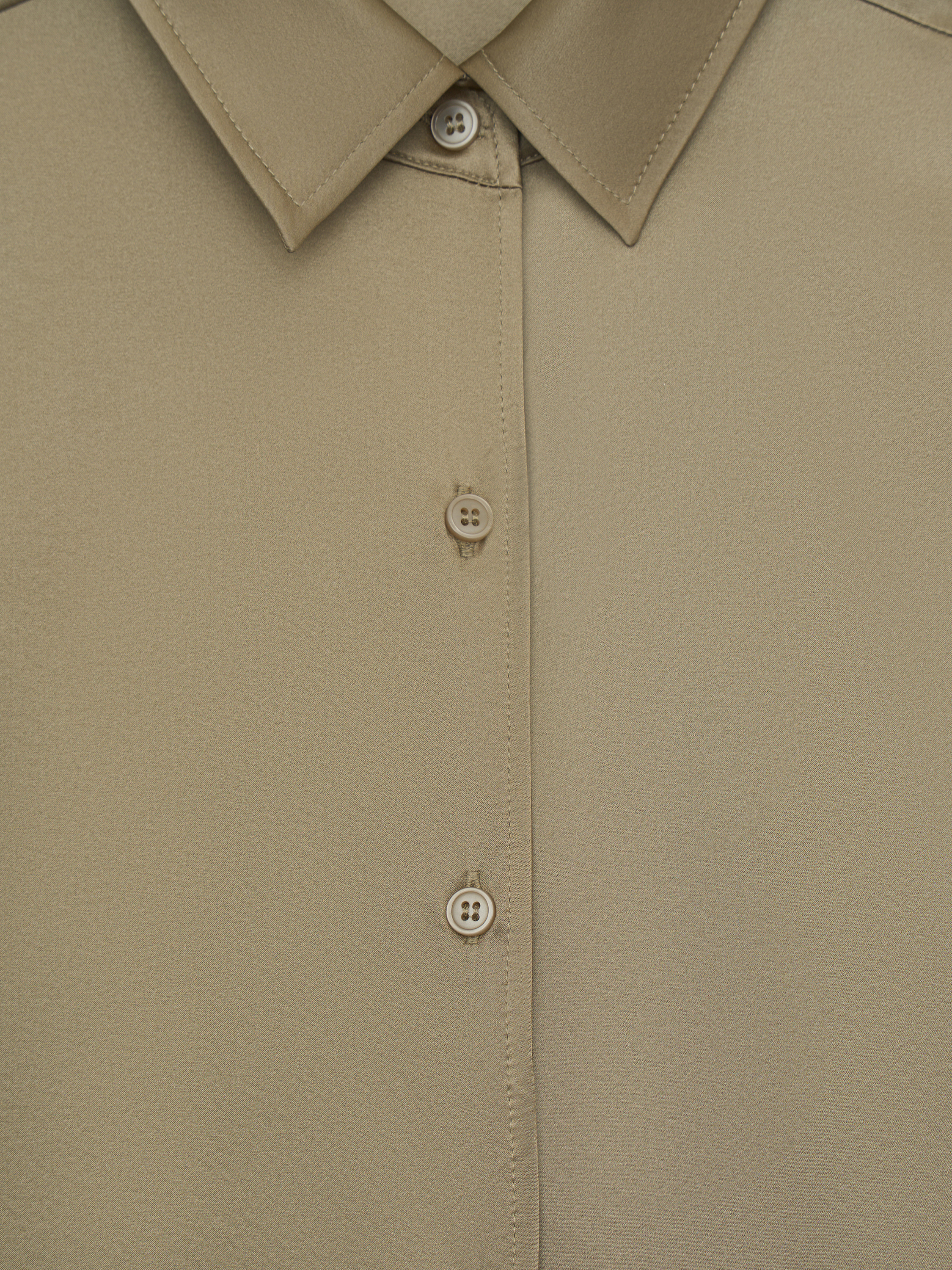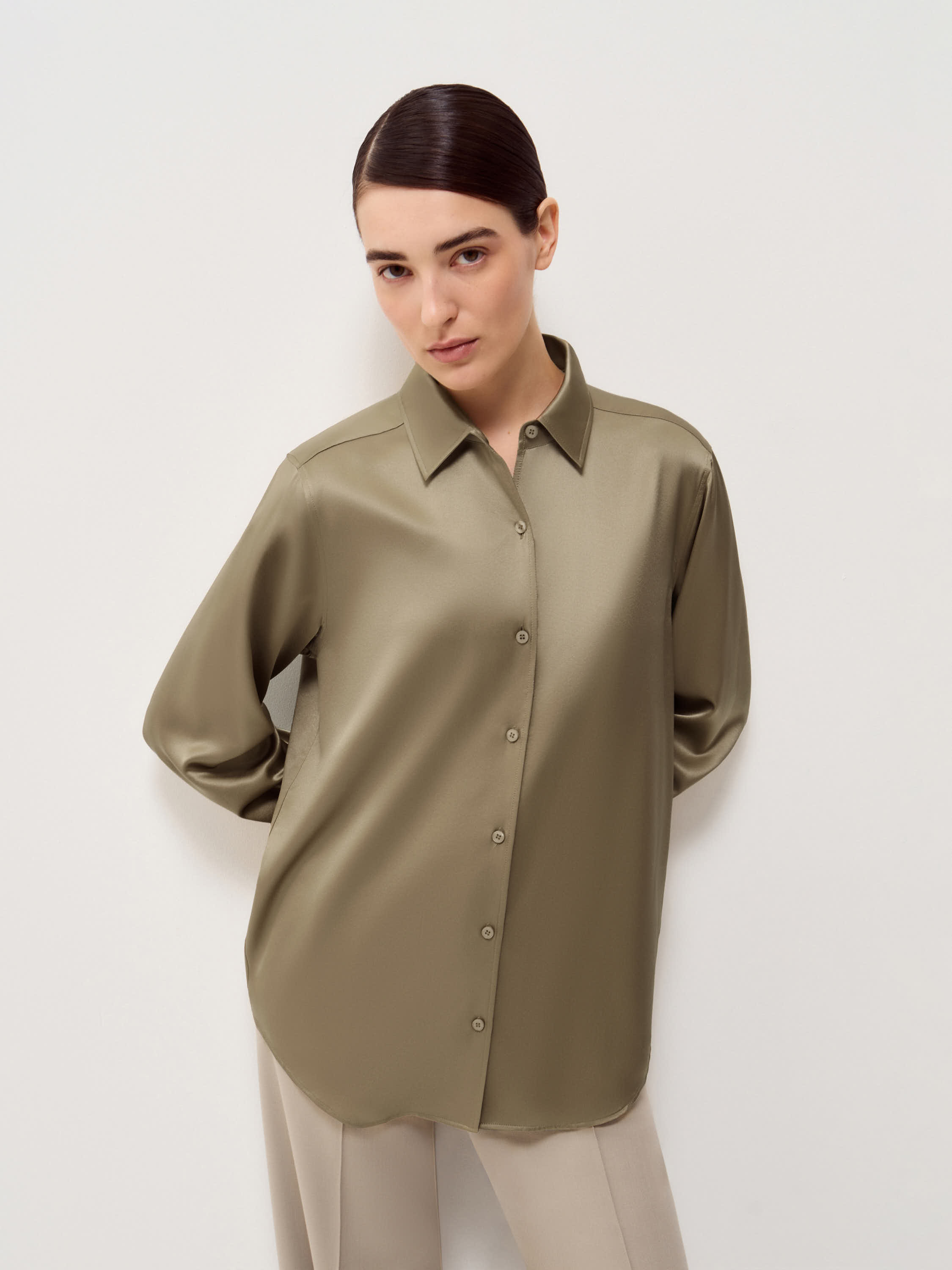 Блуза из шелка в теплом бежевом оттенке с мягким сатиновым блеском и гладкой поверхностью. Прямой крой без излишнего объема, естественная линия плеча и удлиненная спинка формируют аккуратную посадку, классический отложной воротник и застежка на пуговицы в тон сохраняют лаконичность, широкие манжеты добавляют структуру. Модель органично сочетается с костюмными брюками и юбками, а также подходит для более расслабленных образов с денимом и трикотажем.