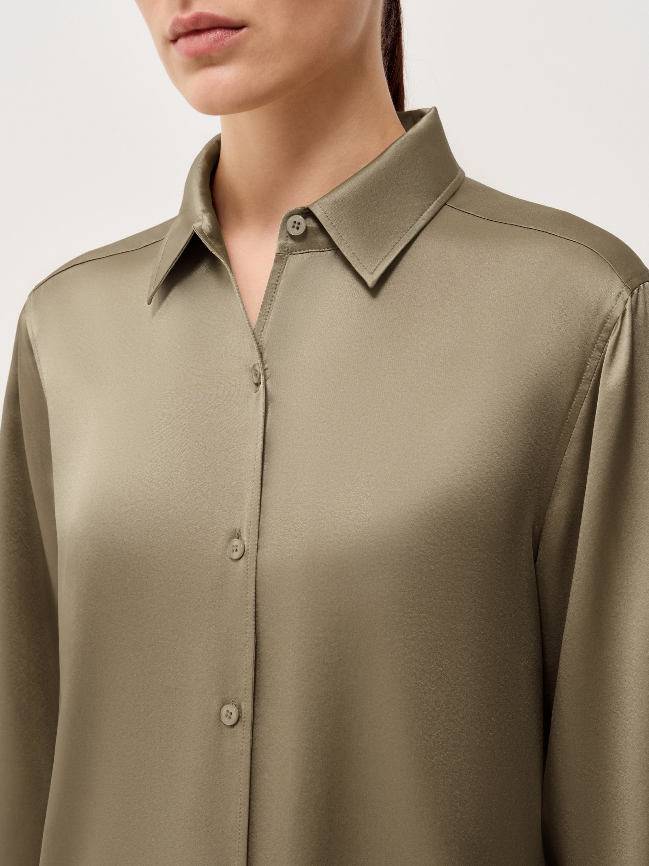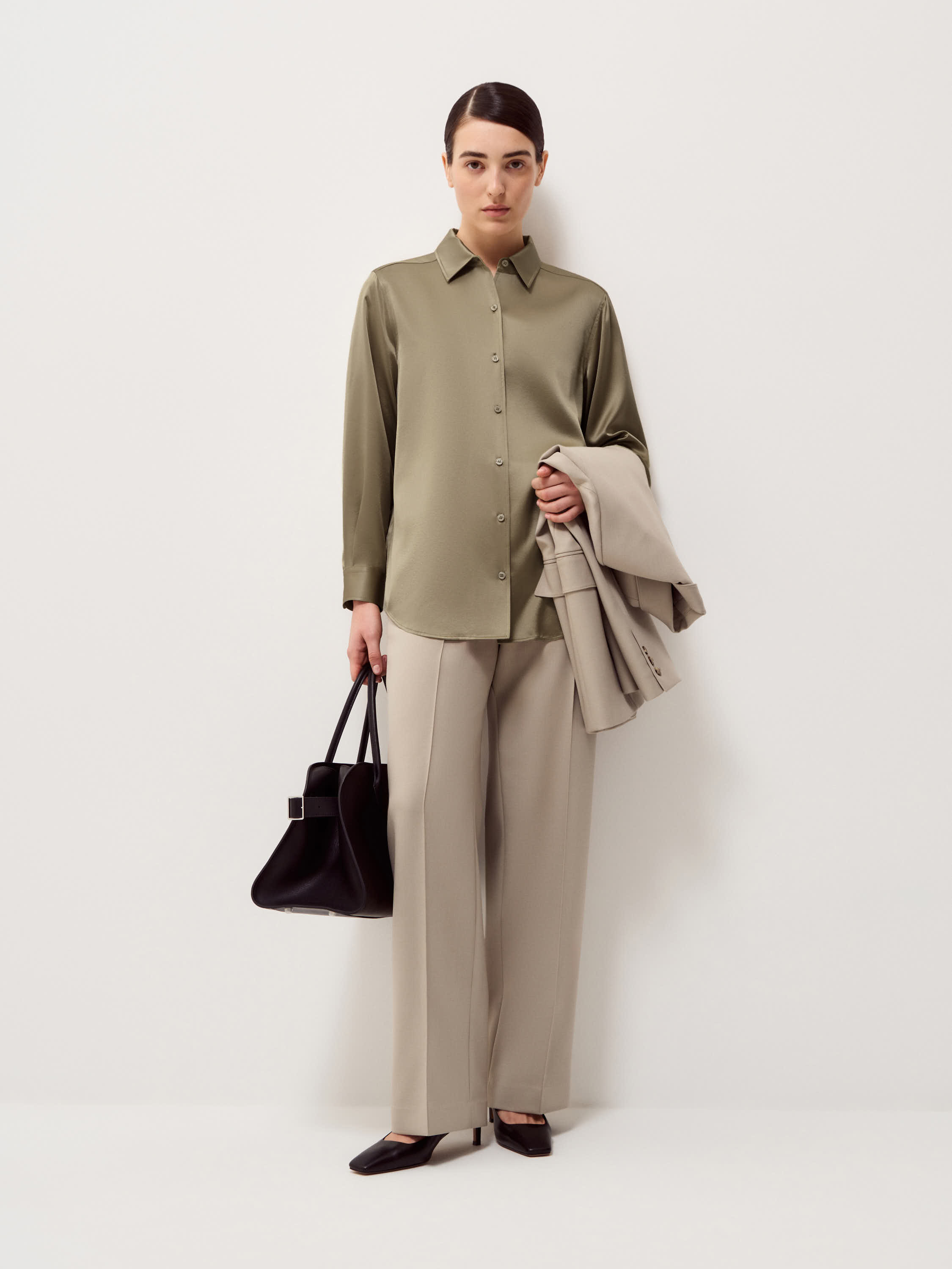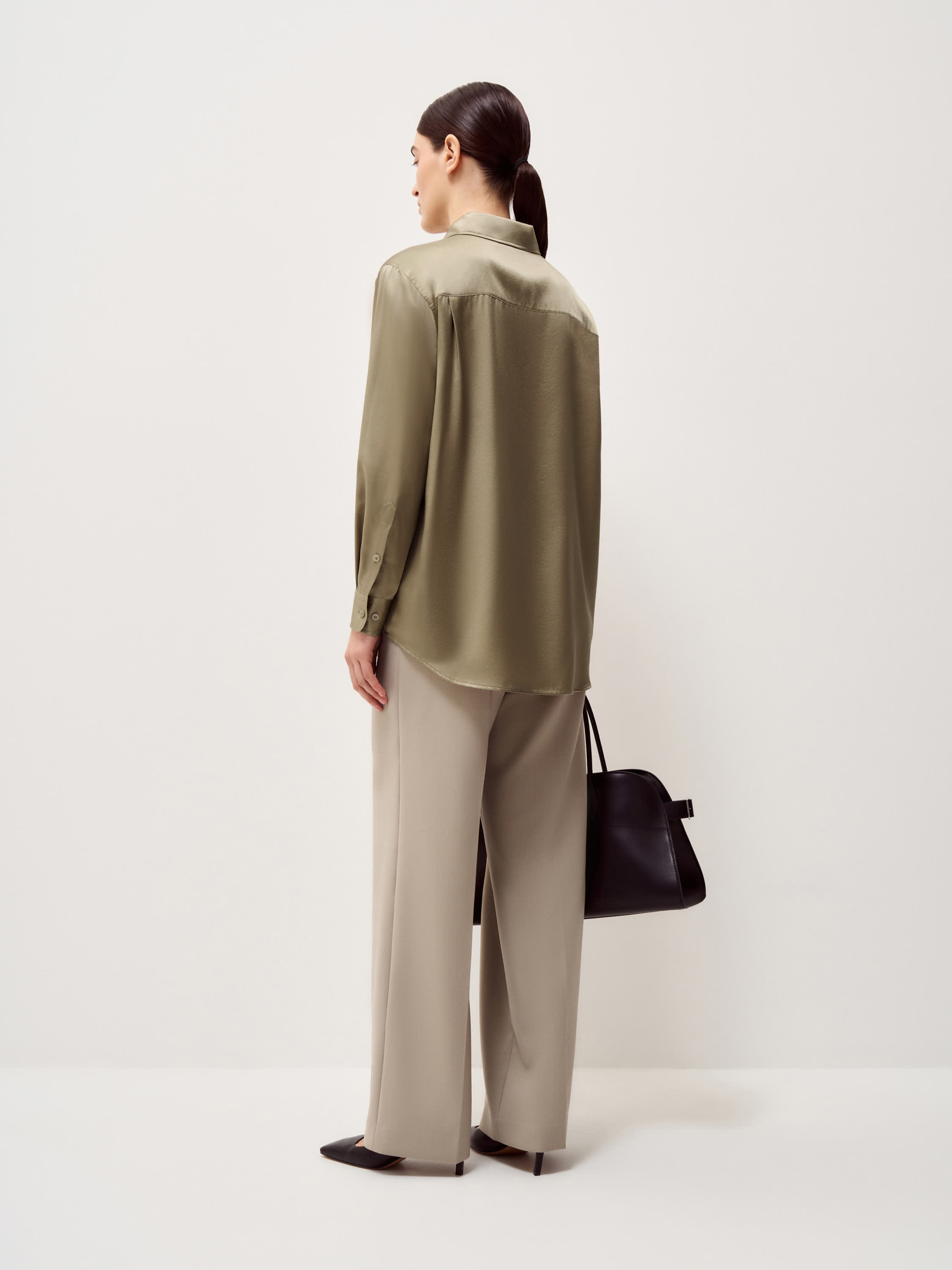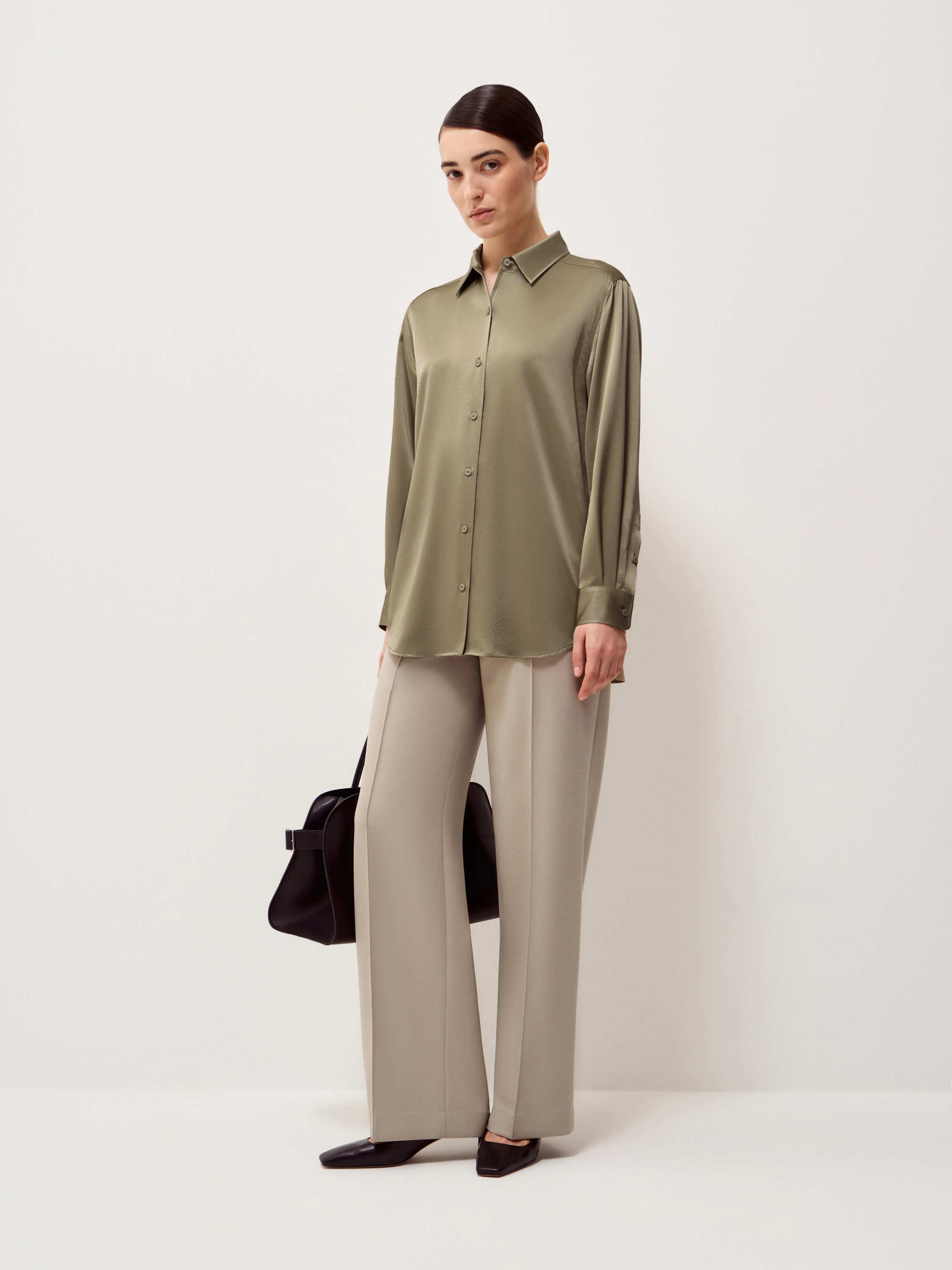 Блуза из шелка в теплом бежевом оттенке с мягким сатиновым блеском и гладкой поверхностью. Прямой крой без излишнего объема, естественная линия плеча и удлиненная спинка формируют аккуратную посадку, классический отложной воротник и застежка на пуговицы в тон сохраняют лаконичность, широкие манжеты добавляют структуру. Модель органично сочетается с костюмными брюками и юбками, а также подходит для более расслабленных образов с денимом и трикотажем.