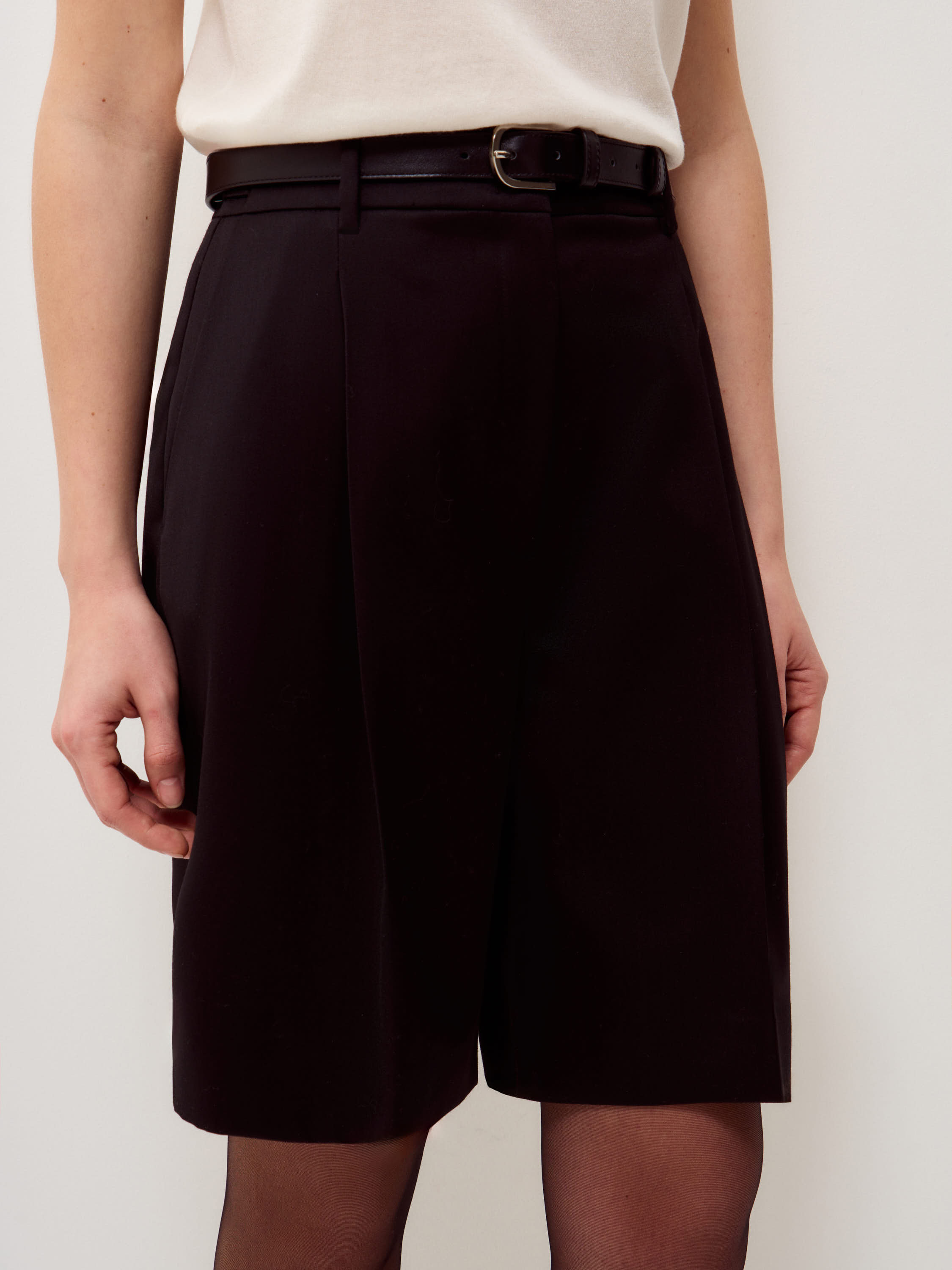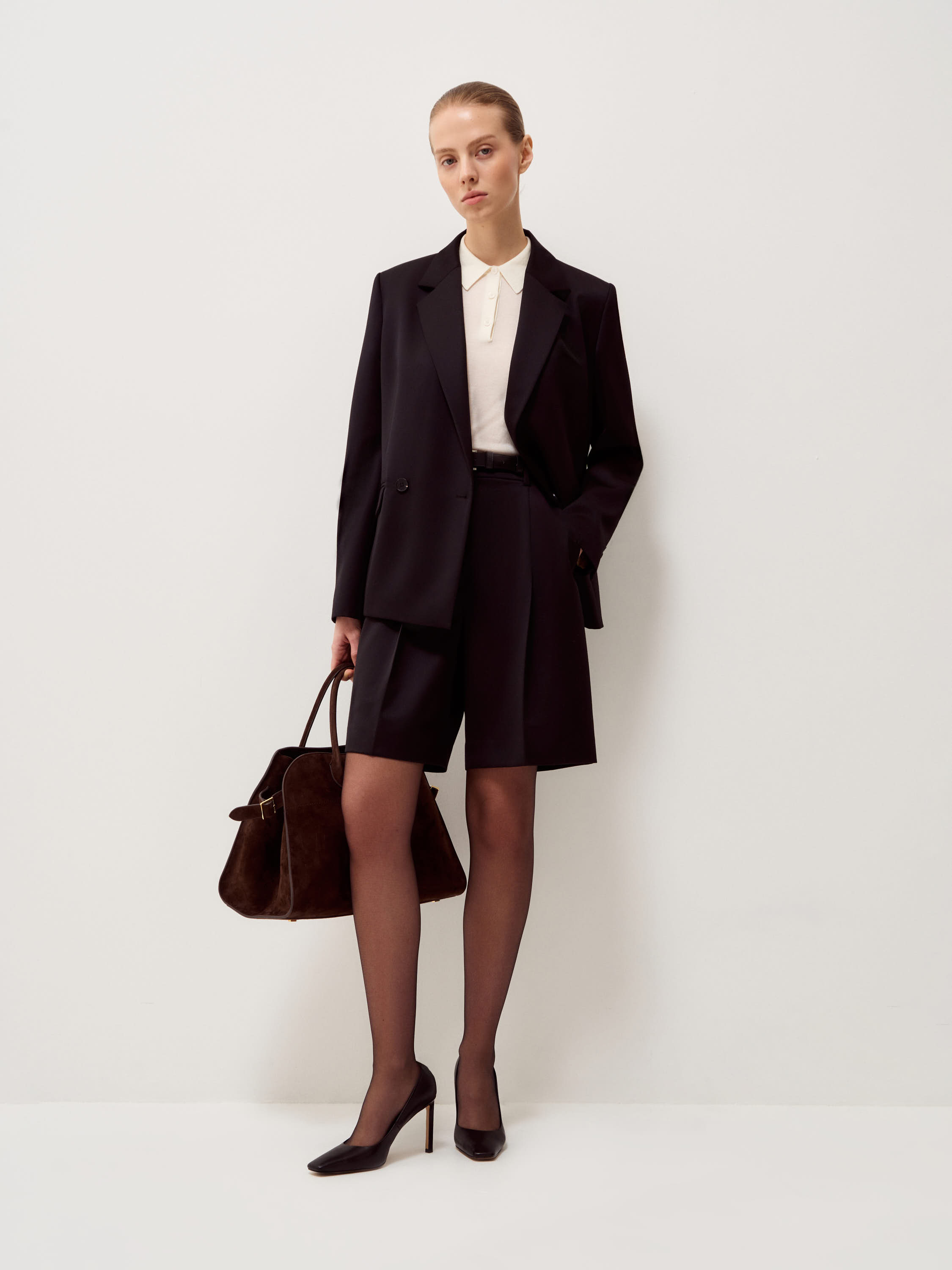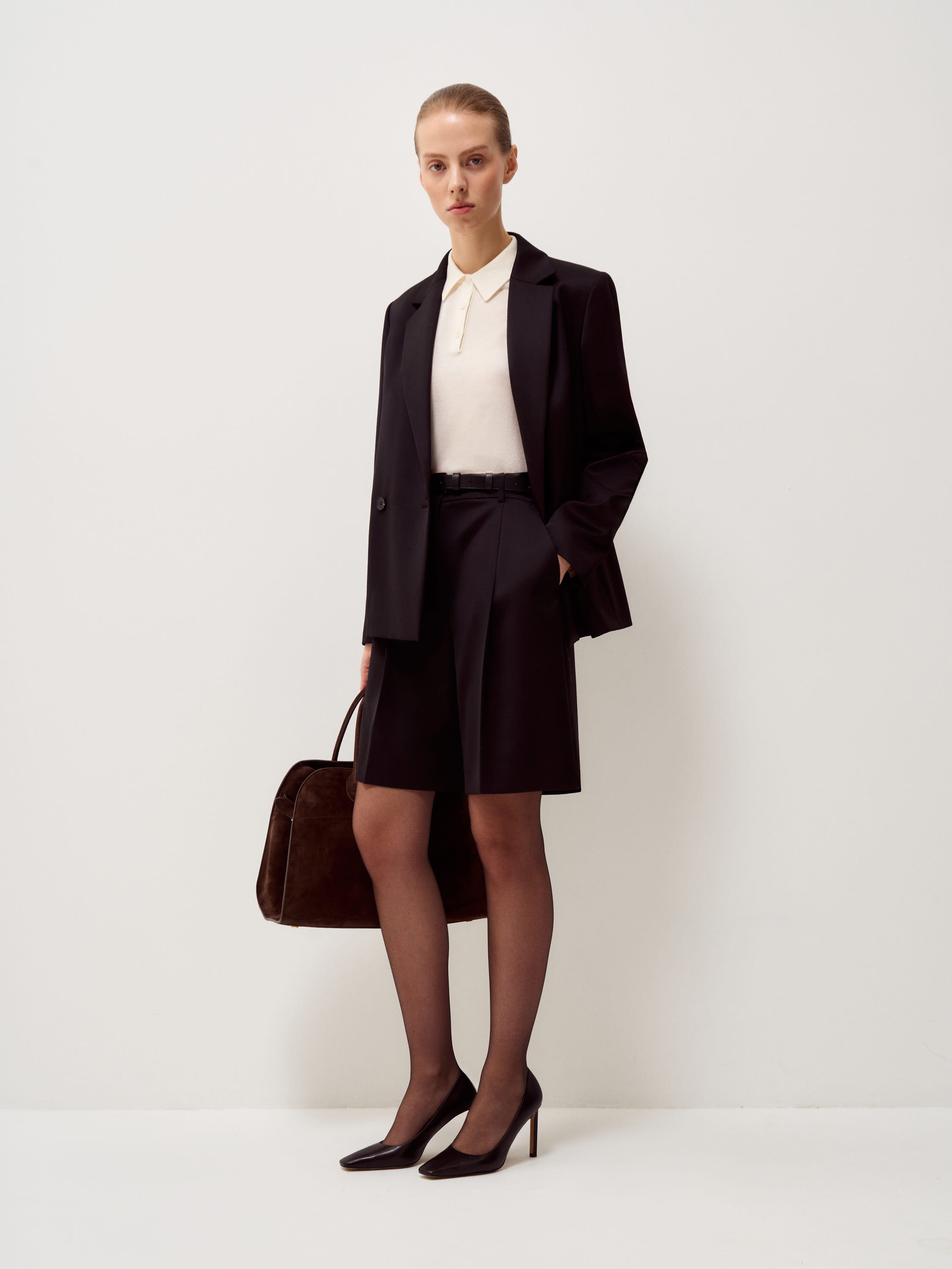 Шорты выполнены из смесовой ткани с высоким содержанием шерсти и вискозы, благодаря чему материал сохраняет форму, выглядит гладким и сохраняет четкость силуэта. Посадка средняя, линия талии оформлена поясом со шлевками и аккуратной застежкой. Спереди заложены мягкие складки, которые добавляют объема и обеспечивают комфорт в движении. Длина до колена формирует сдержанный, выстроенный силуэт и делает модель уместной как в деловых, так и в повседневных сочетаниях. Оттенок глубокий черный, без дополнительного блеска, легко комбинируется с контрастными и нейтральными элементами гардероба.