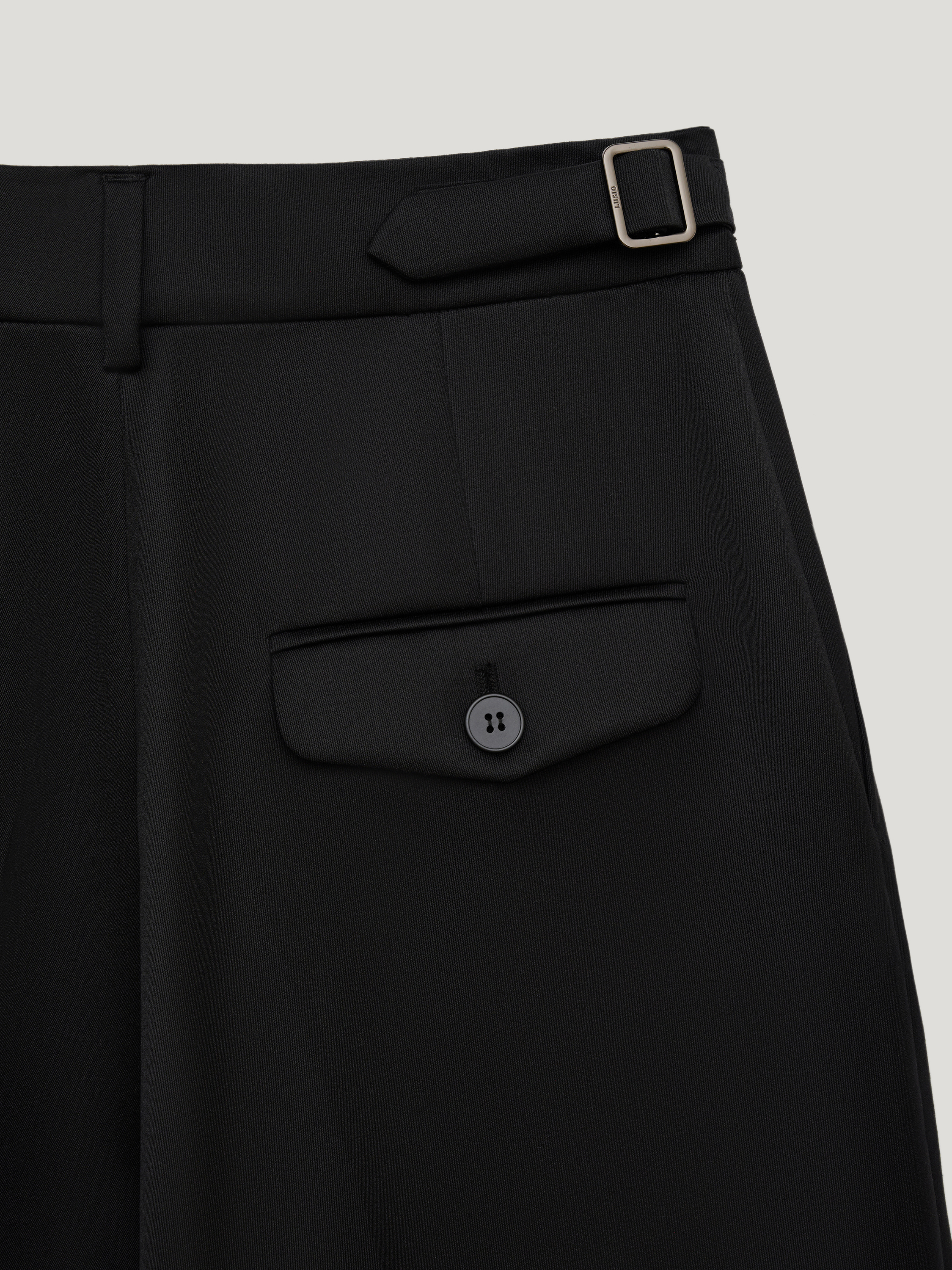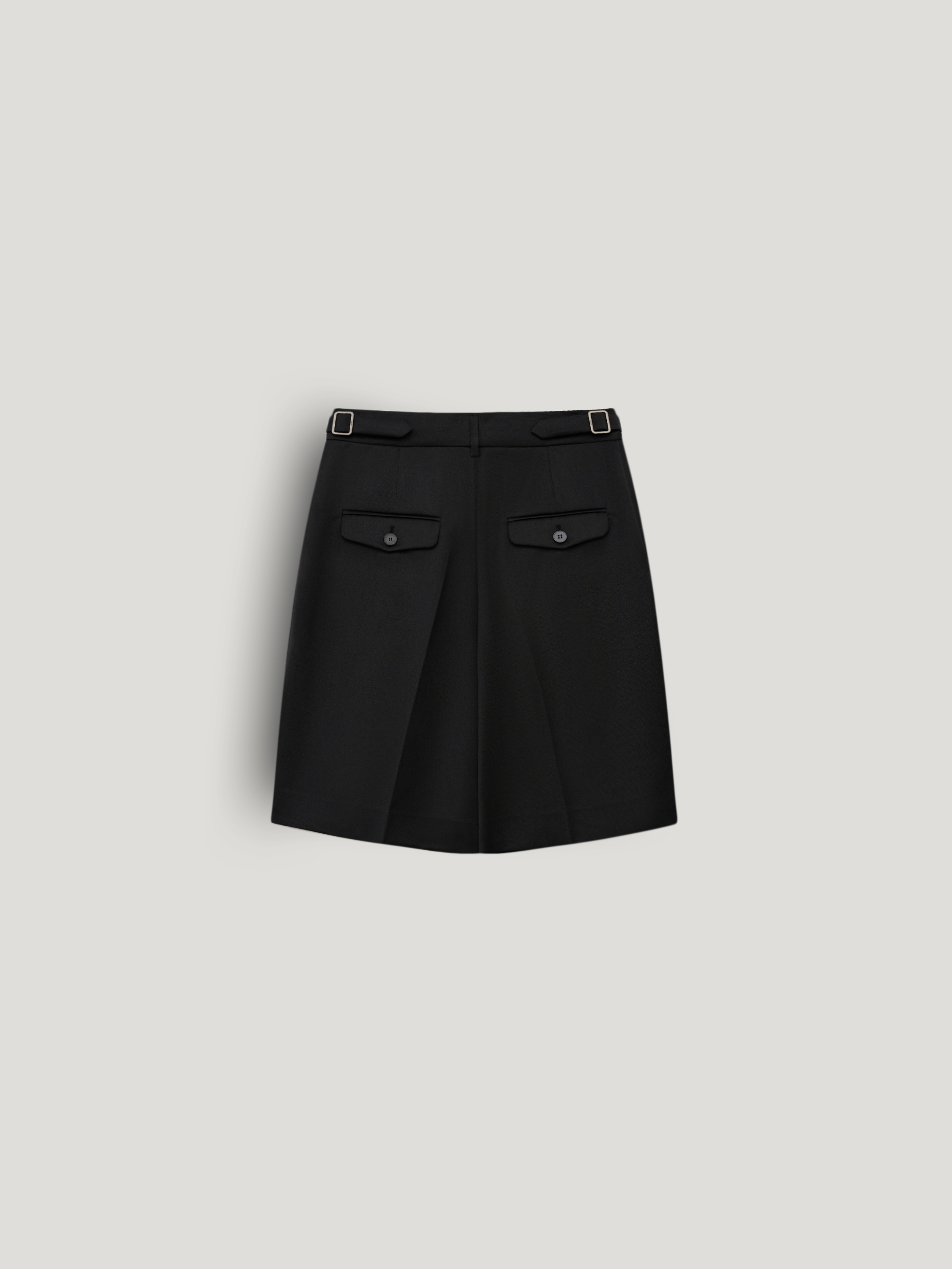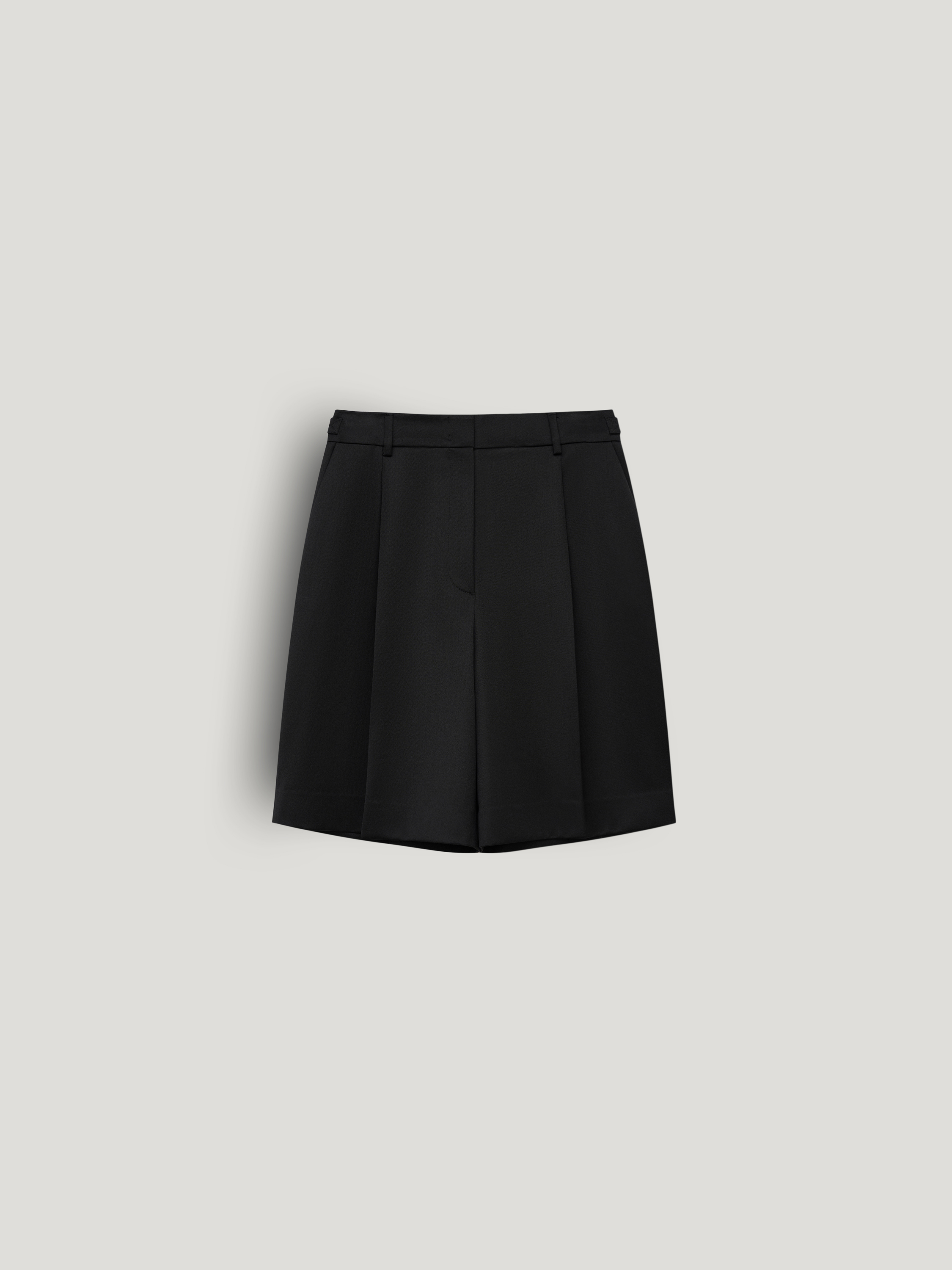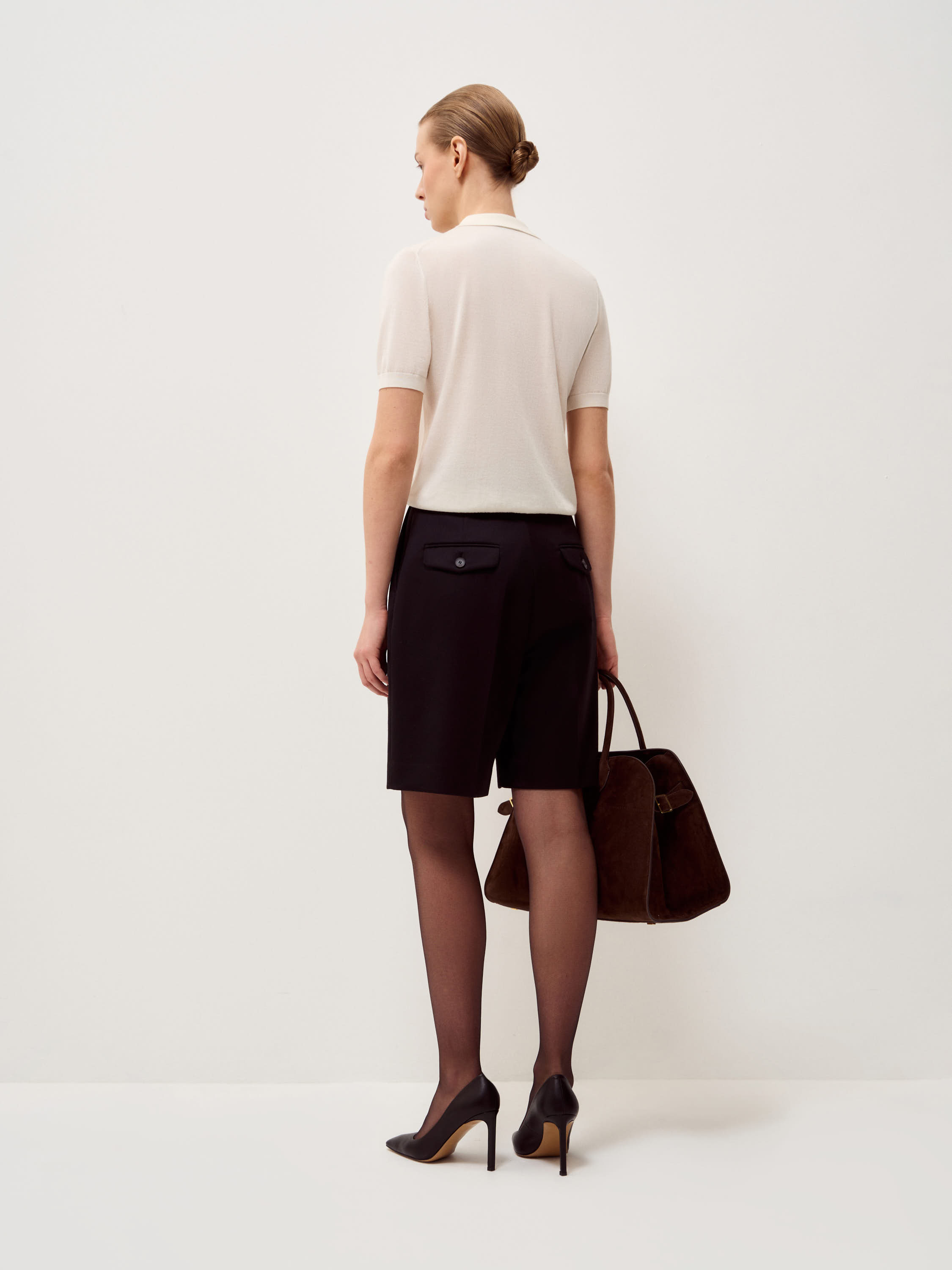 Шорты выполнены из смесовой ткани с высоким содержанием шерсти и вискозы, благодаря чему материал сохраняет форму, выглядит гладким и сохраняет четкость силуэта. Посадка средняя, линия талии оформлена поясом со шлевками и аккуратной застежкой. Спереди заложены мягкие складки, которые добавляют объема и обеспечивают комфорт в движении. Длина до колена формирует сдержанный, выстроенный силуэт и делает модель уместной как в деловых, так и в повседневных сочетаниях. Оттенок глубокий черный, без дополнительного блеска, легко комбинируется с контрастными и нейтральными элементами гардероба.