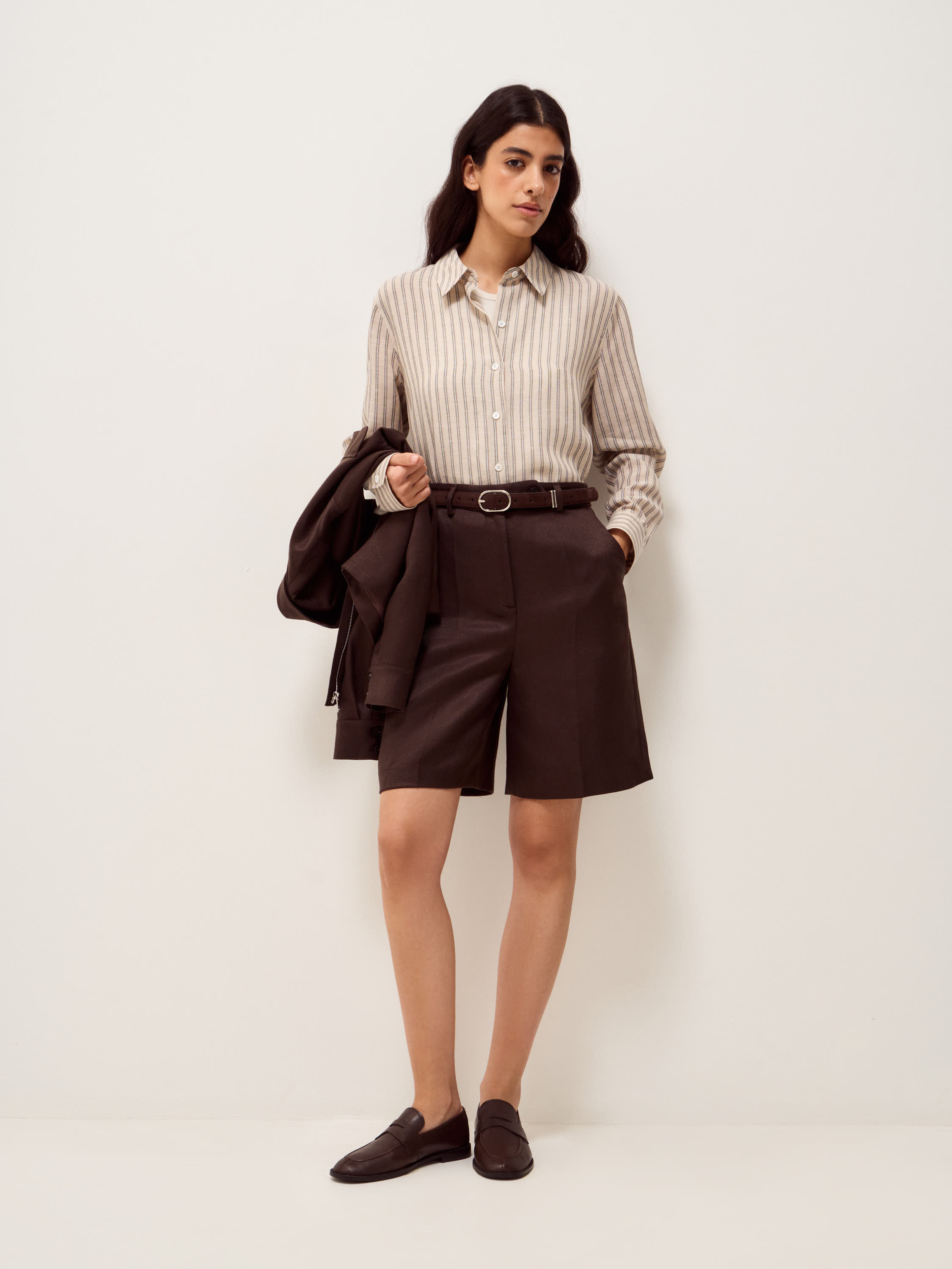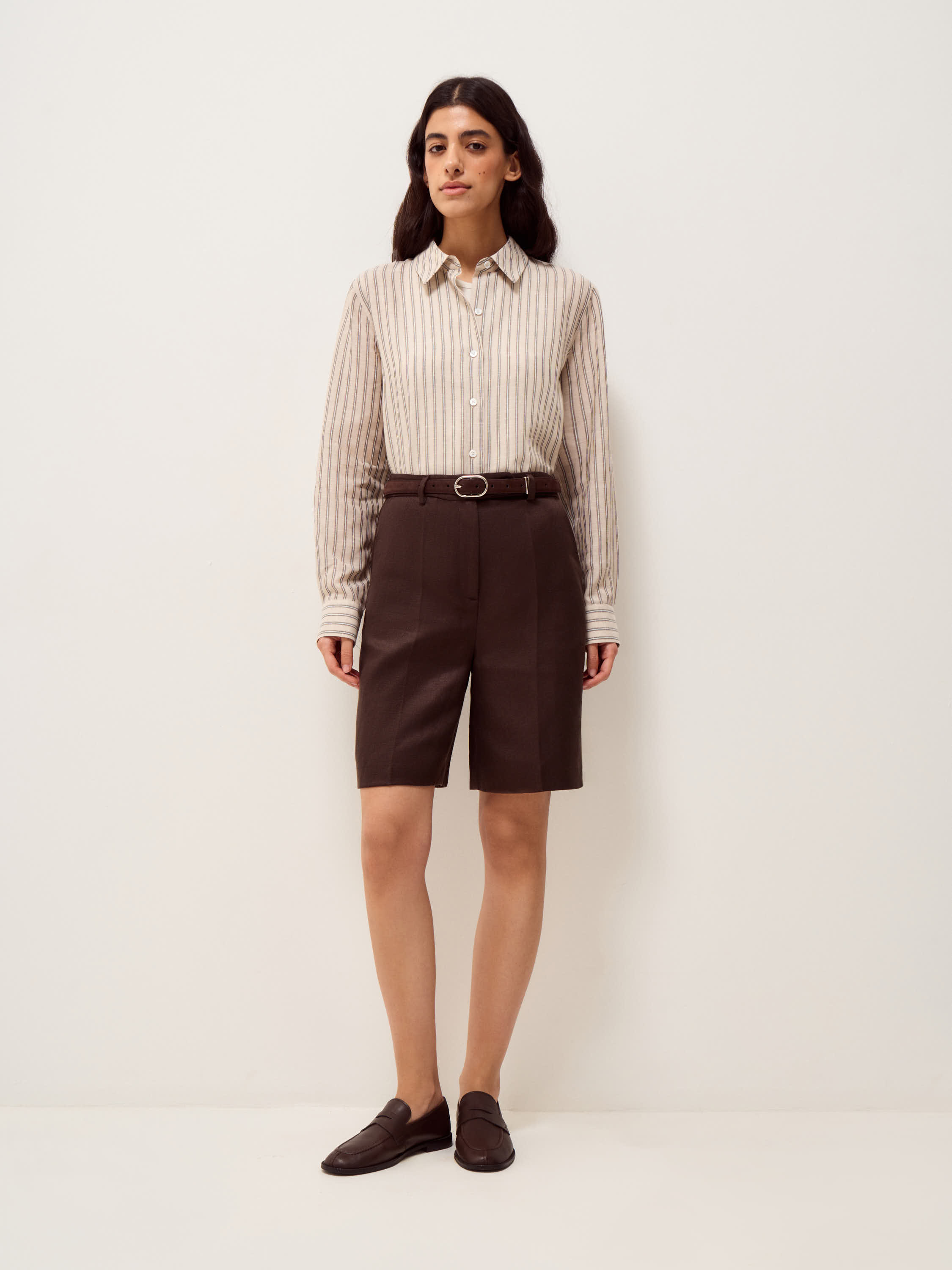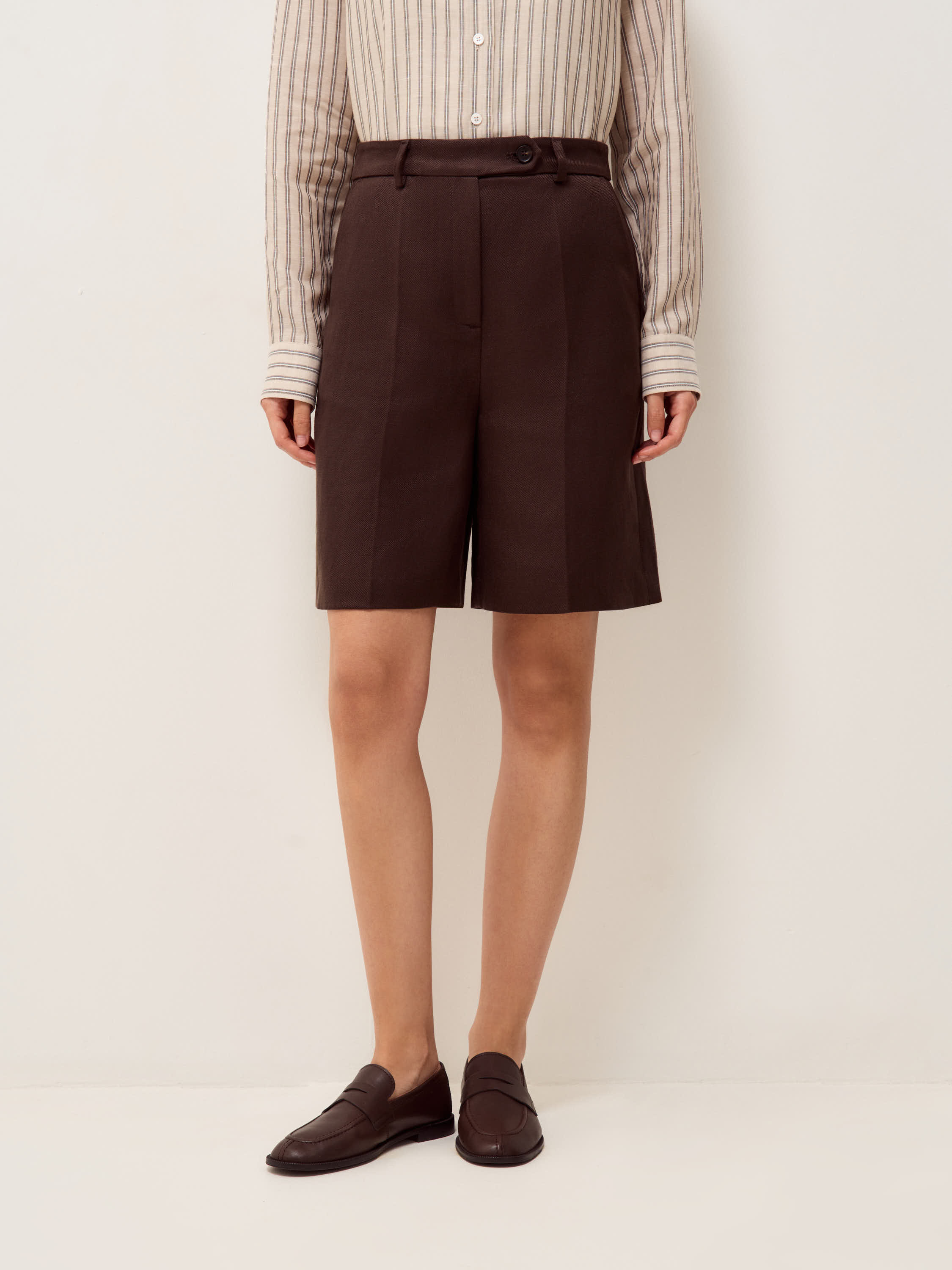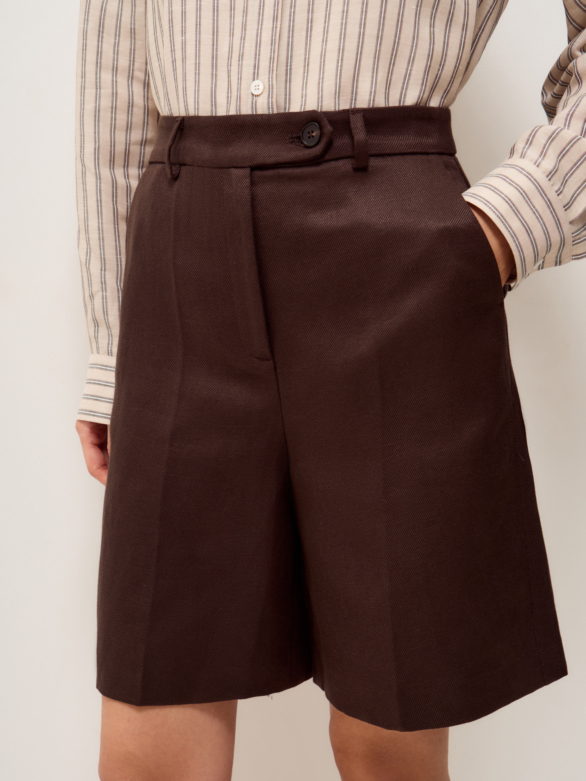 Шорты прямого силуэта с высокой посадкой и четко оформленной линией талии. Пояс со шлевками, защипы спереди и вертикальные складки задают структуру и формируют аккуратную геометрию. Длина до середины бедра сохраняет выверенные пропорции и делает модель универсальной для повседневных сочетаний. Боковые карманы встроены в швы, сзади — прорезные карманы с клапанами, которые добавляют графичность и поддерживают строгий характер кроя. Материал — смесовое полотно на основе лиоцелла и льна: поверхность матовая, с легкой природной фактурой, сочетает способность держать форму с пластичностью и комфортна в носке. Подкладка выполнена из хлопка. Темно-коричневый оттенок выглядит глубоко и сдержанно, легко сочетается с нейтральной гаммой и теплыми природными цветами.