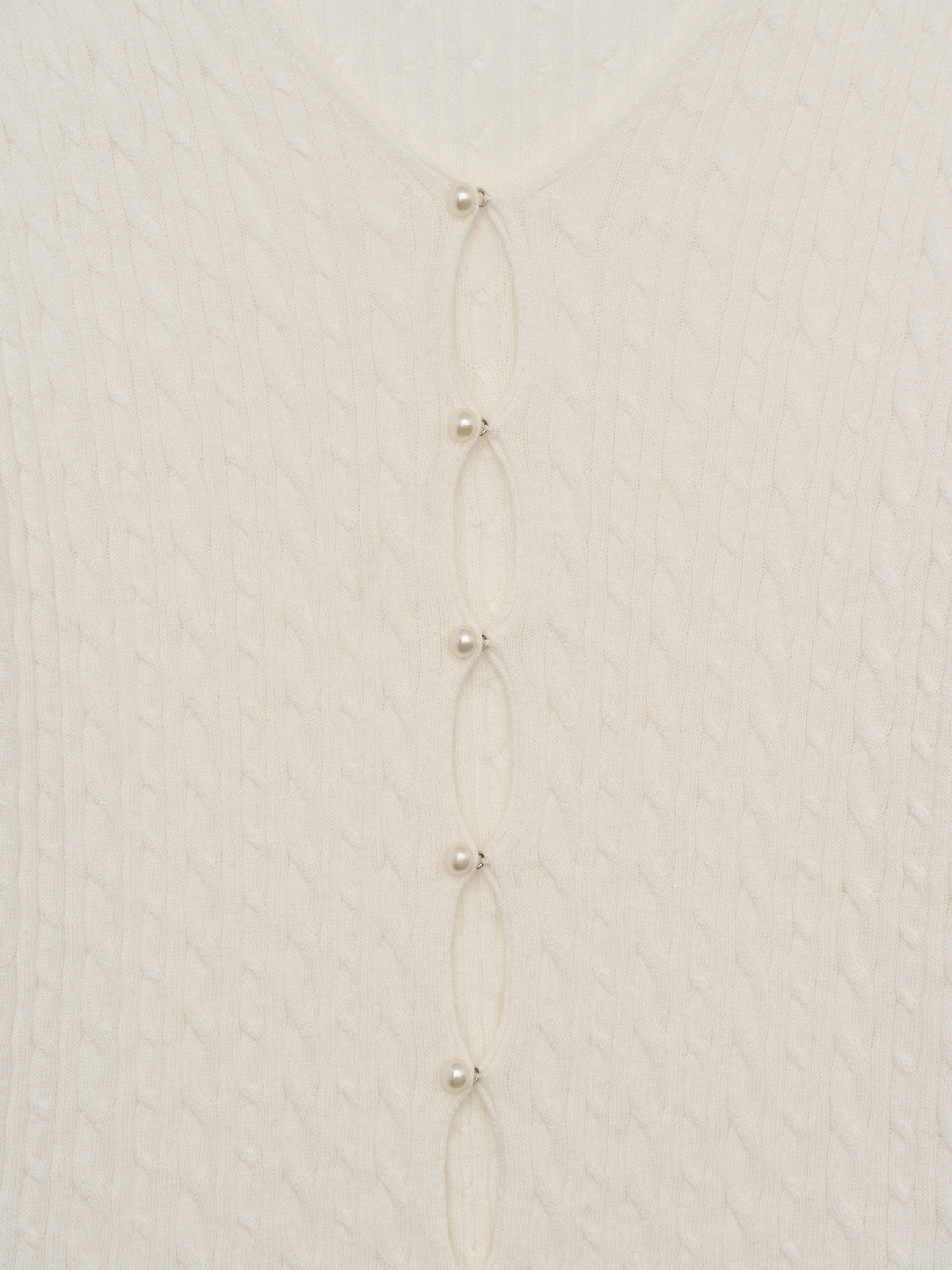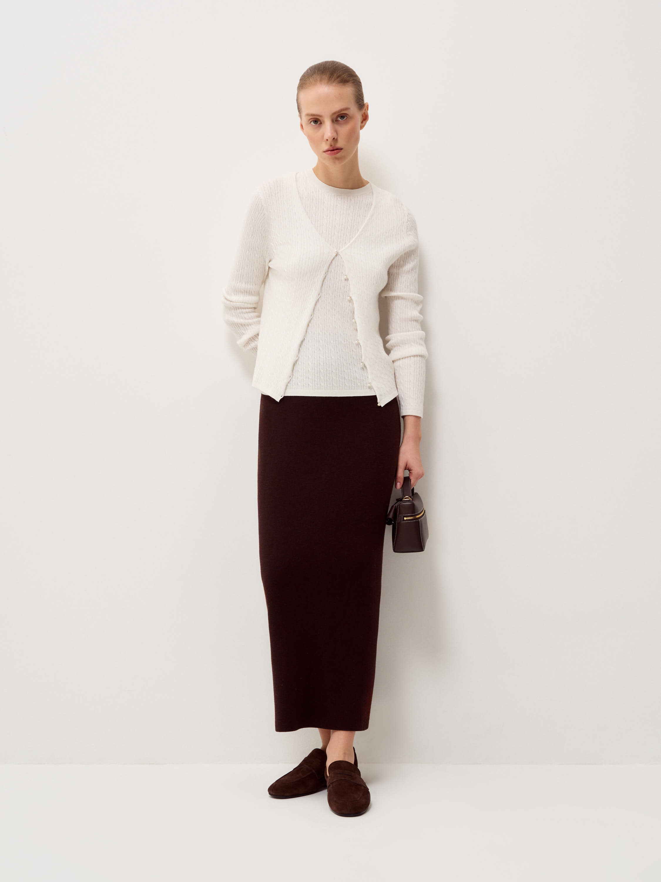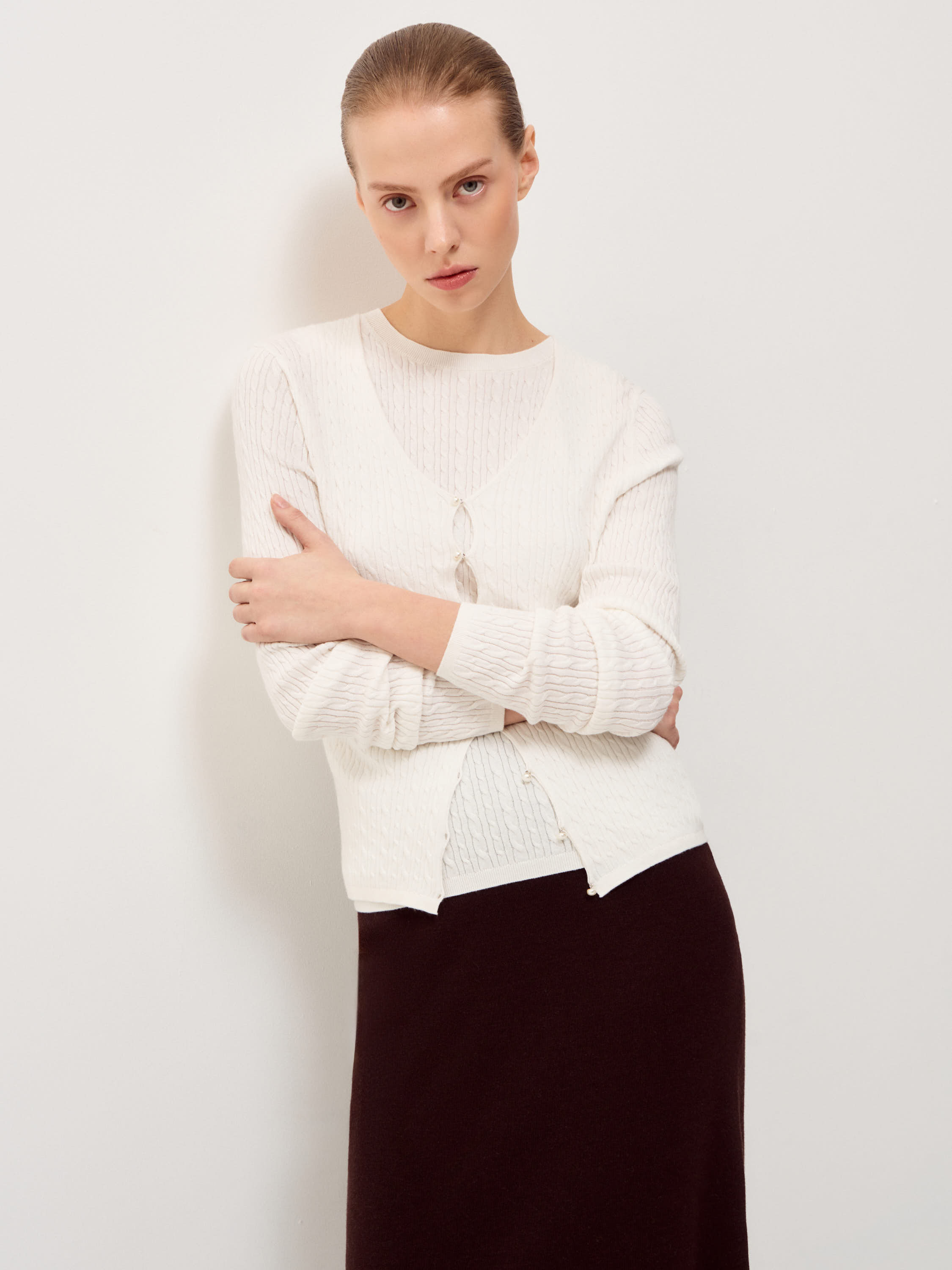 Кардиган в молочном оттенке выполнен из хлопка с добавлением кашемира. Трикотаж мягкий, тонкий, с деликатной вертикальной фактурой, которая придает поверхности аккуратный рельеф и сохраняет четкость силуэта. Модель прилегающего кроя с V-образной горловиной и застежкой на небольшие пуговицы в тон формирует вытянутую линию по центру и подчеркивает пропорции. Длинные рукава и нижний край оформлены эластичной вязкой, обеспечивающей ровную посадку без излишнего объема. Кардиган сочетается с трикотажными топами, блузами или рубашками, юбками миди или брюками высокой посадки, оставаясь универсальным элементом для многослойных образов.