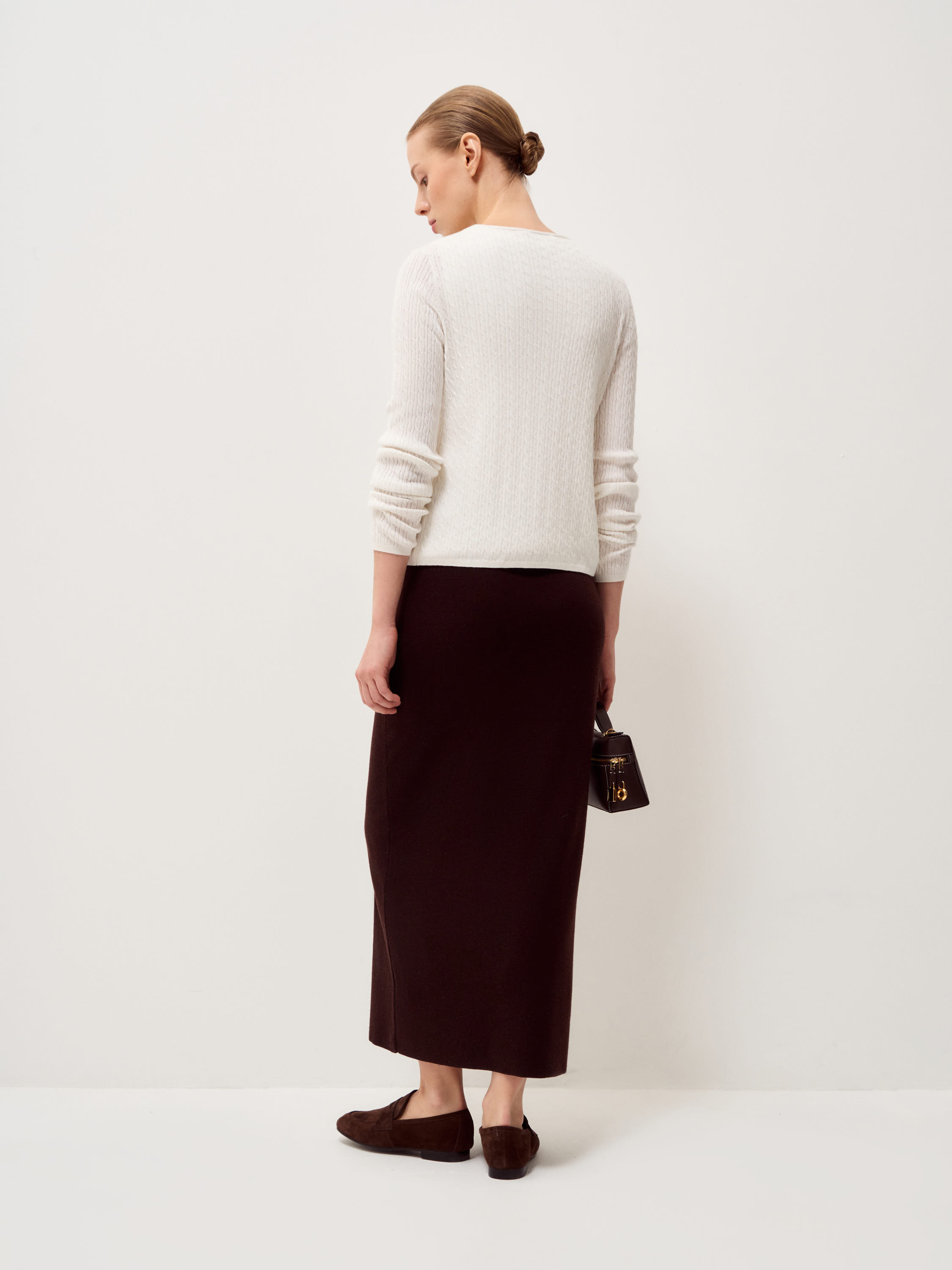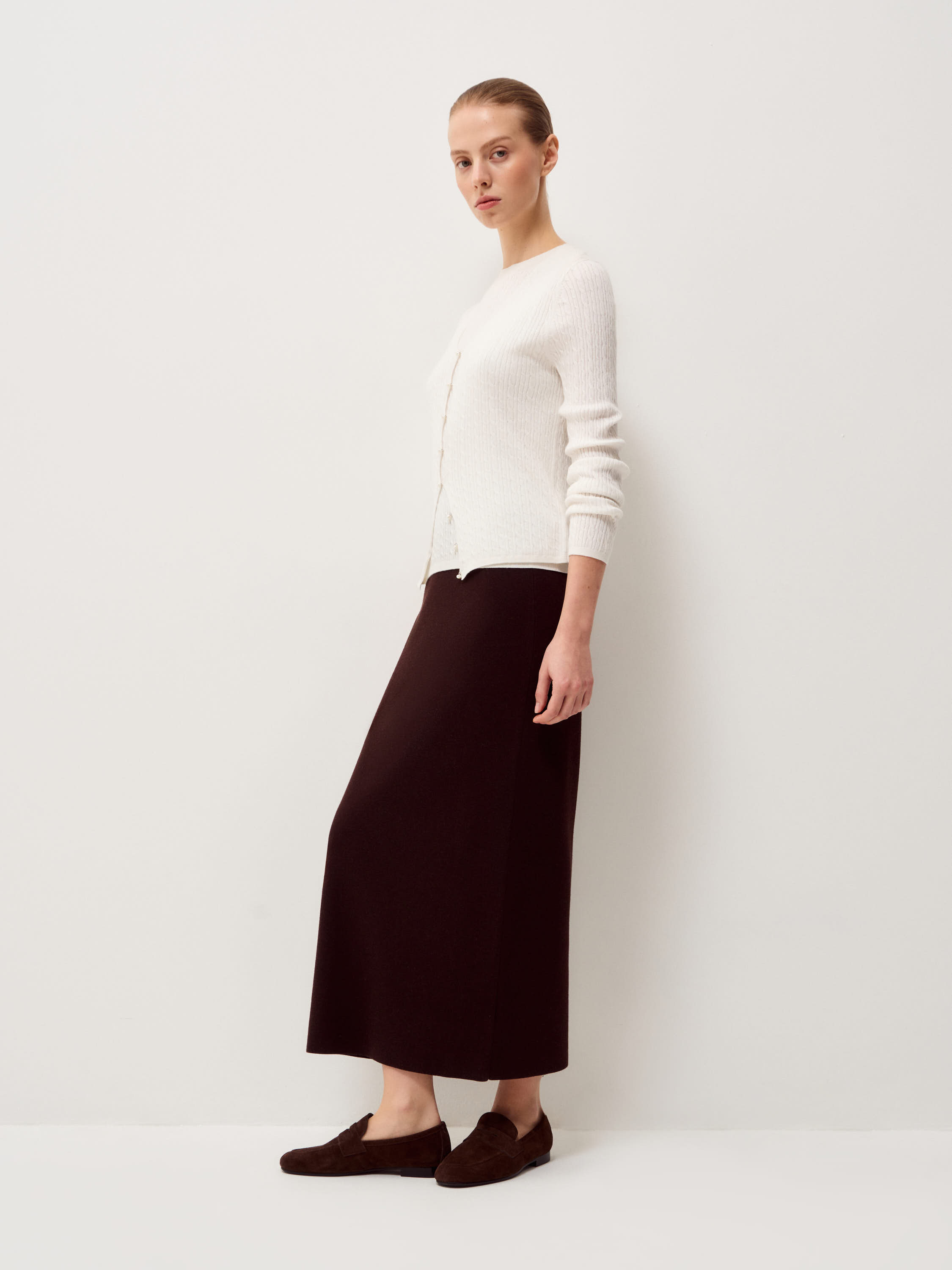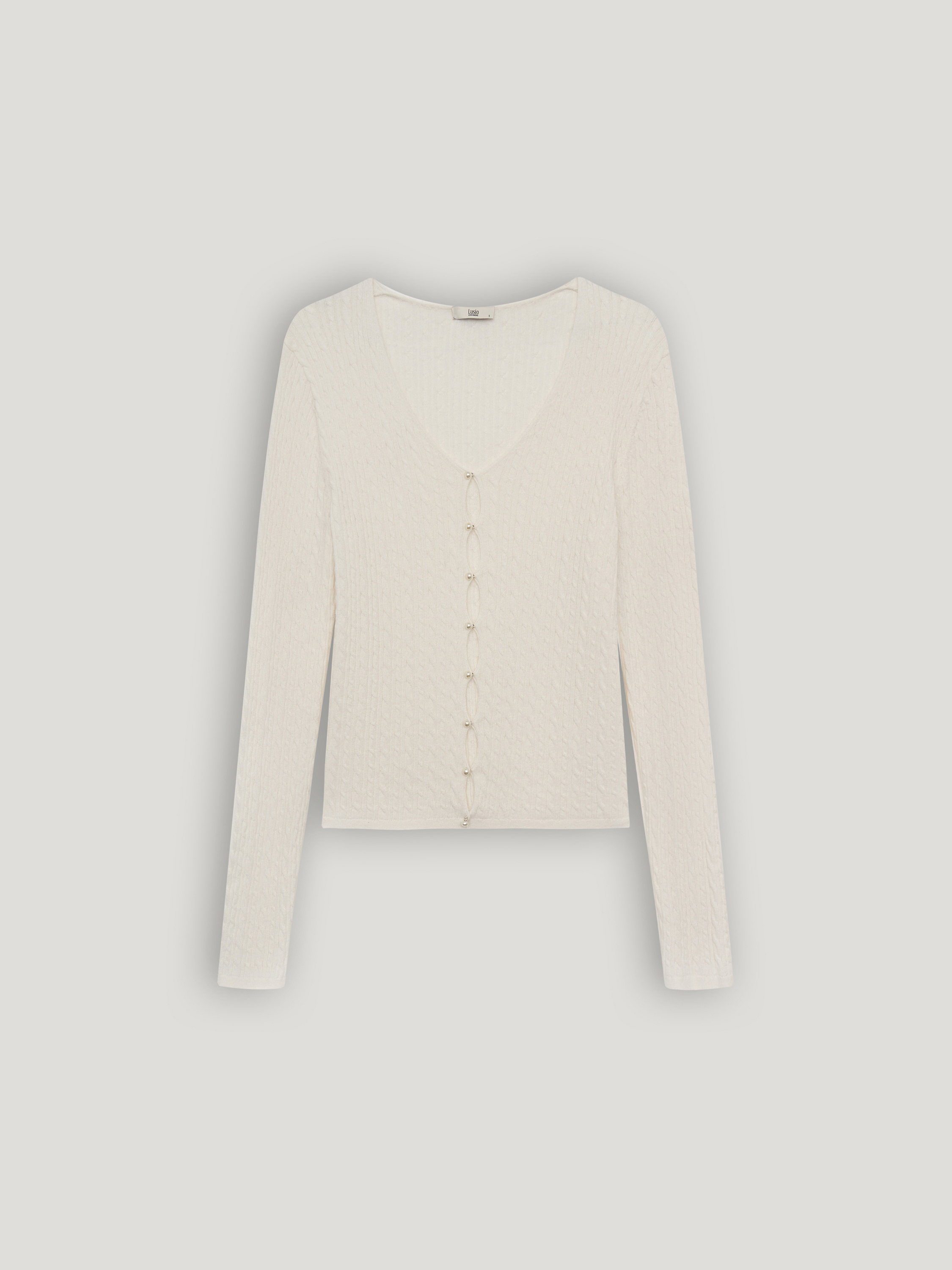 Кардиган в молочном оттенке выполнен из хлопка с добавлением кашемира. Трикотаж мягкий, тонкий, с деликатной вертикальной фактурой, которая придает поверхности аккуратный рельеф и сохраняет четкость силуэта. Модель прилегающего кроя с V-образной горловиной и застежкой на небольшие пуговицы в тон формирует вытянутую линию по центру и подчеркивает пропорции. Длинные рукава и нижний край оформлены эластичной вязкой, обеспечивающей ровную посадку без излишнего объема. Кардиган сочетается с трикотажными топами, блузами или рубашками, юбками миди или брюками высокой посадки, оставаясь универсальным элементом для многослойных образов.