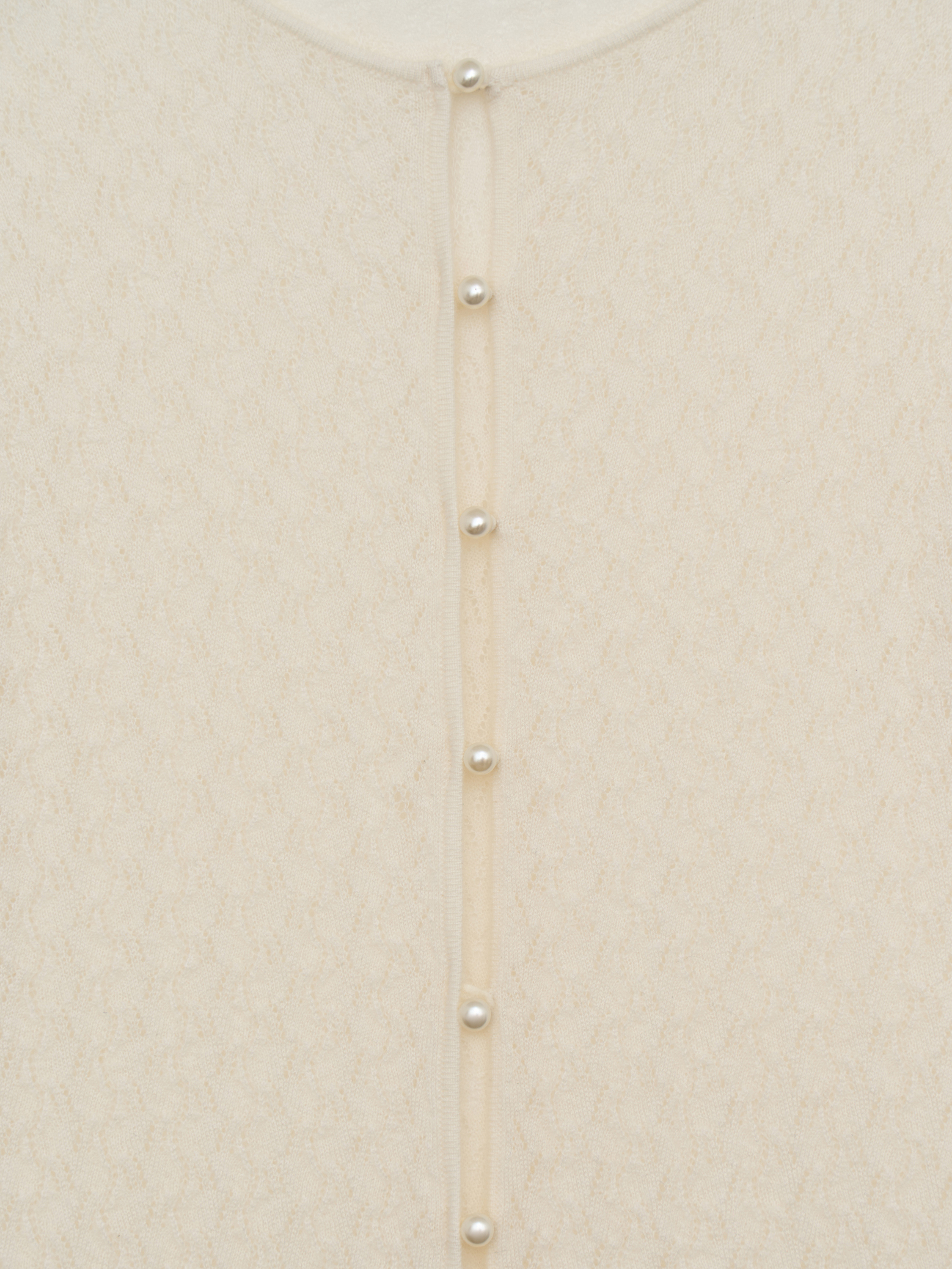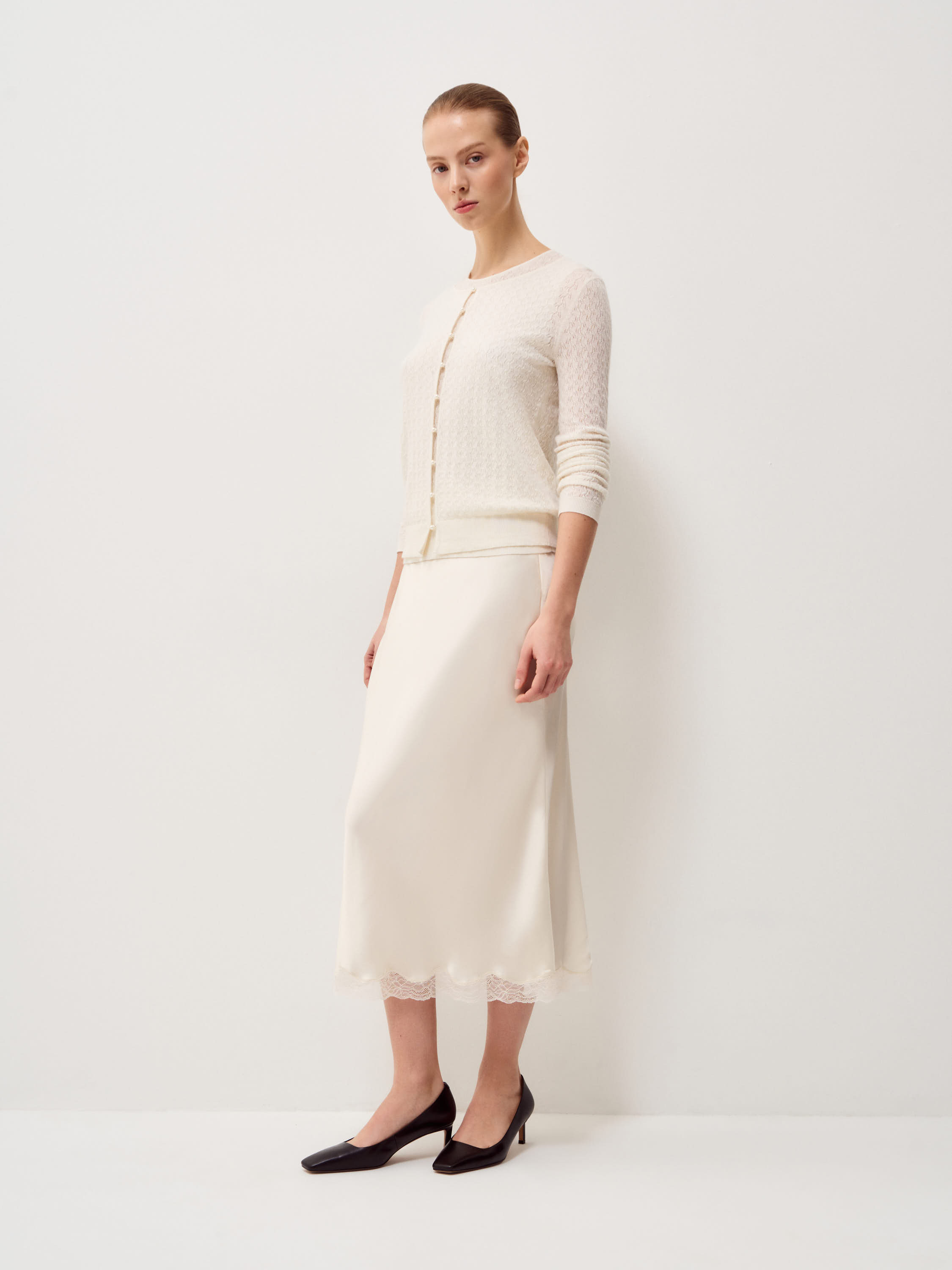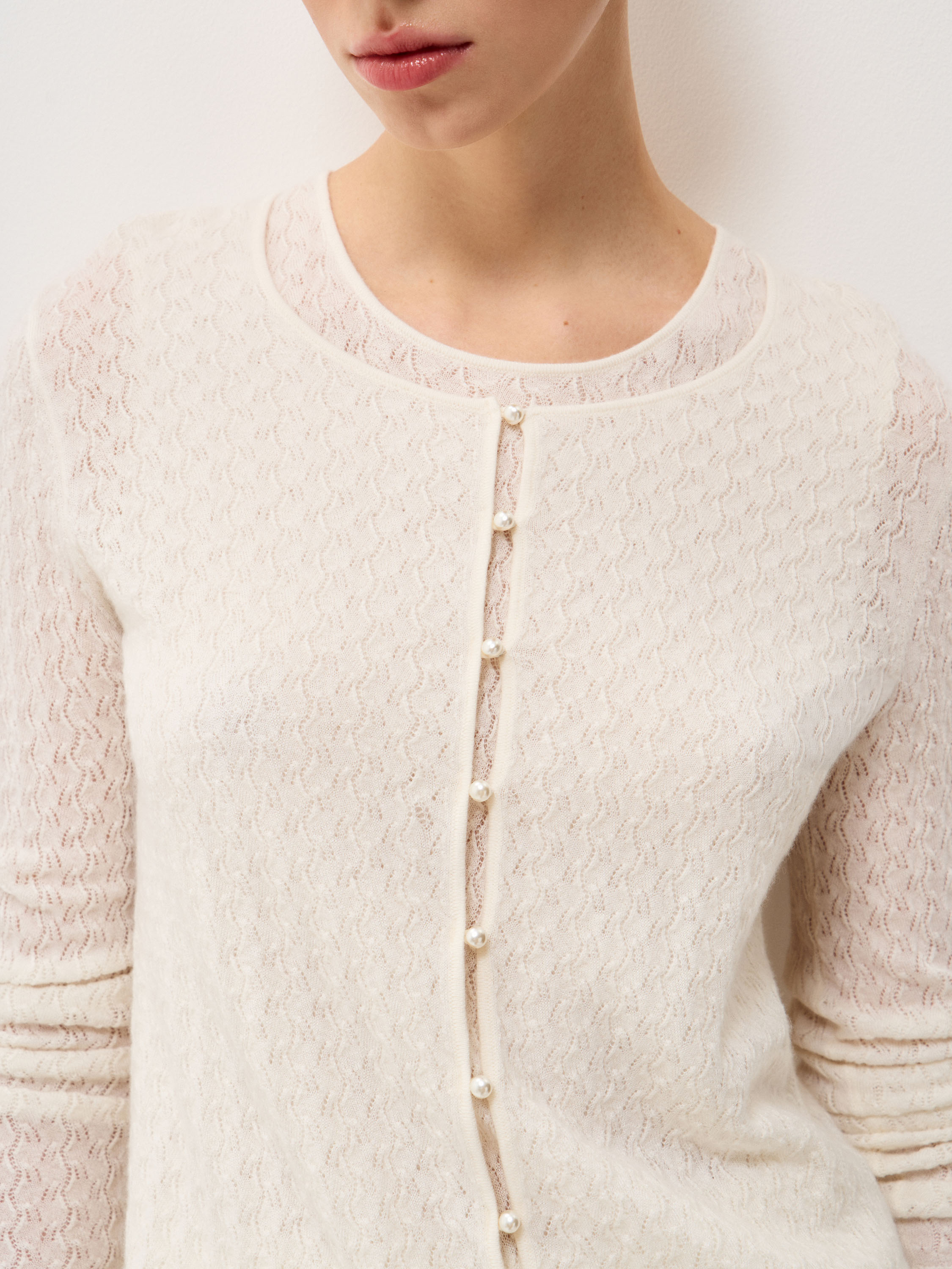 Кардиган в светлом молочном оттенке выполнен из тонкого трикотажа с выразительной узорной вязкой: фактура мелкая, с деликатным ритмом и легкой прозрачностью, за счет чего поверхность выглядит объемной. Модель с круглой горловиной и центральной застежкой на небольшие пуговицы в тон сохраняет лаконичную вертикаль. Посадка прилегающая, без лишнего объема, линия плеча естественная, рукава полной длины с узкими манжетами фиксируют форму. Нижний край оформлен эластичной планкой, которая стабилизирует силуэт и аккуратно обозначает линию талии. Кардиган подходит для сочетаний с юбками миди и макси, а также может использоваться как самостоятельный верх или как легкий слой в более сложных комплектах.