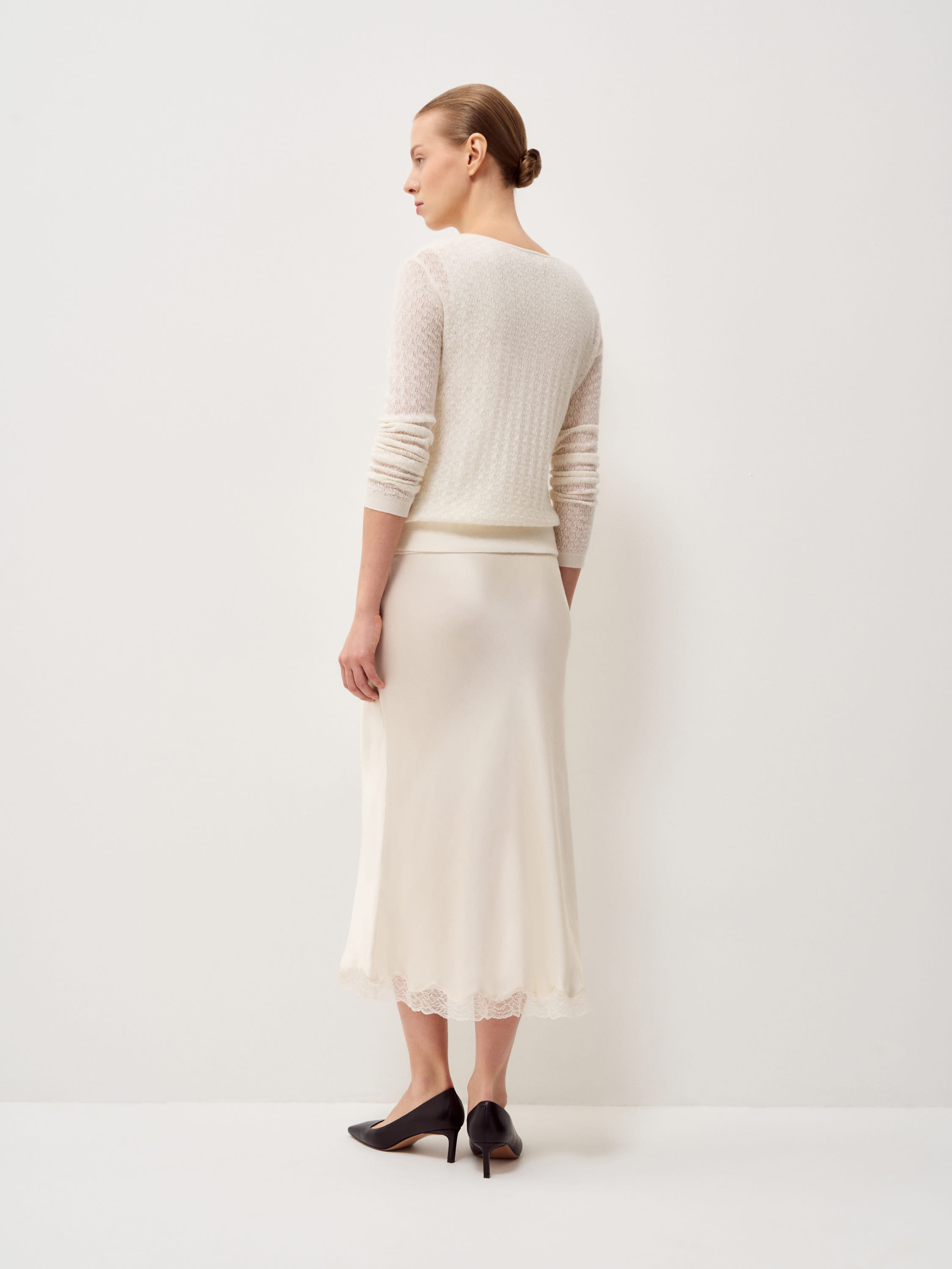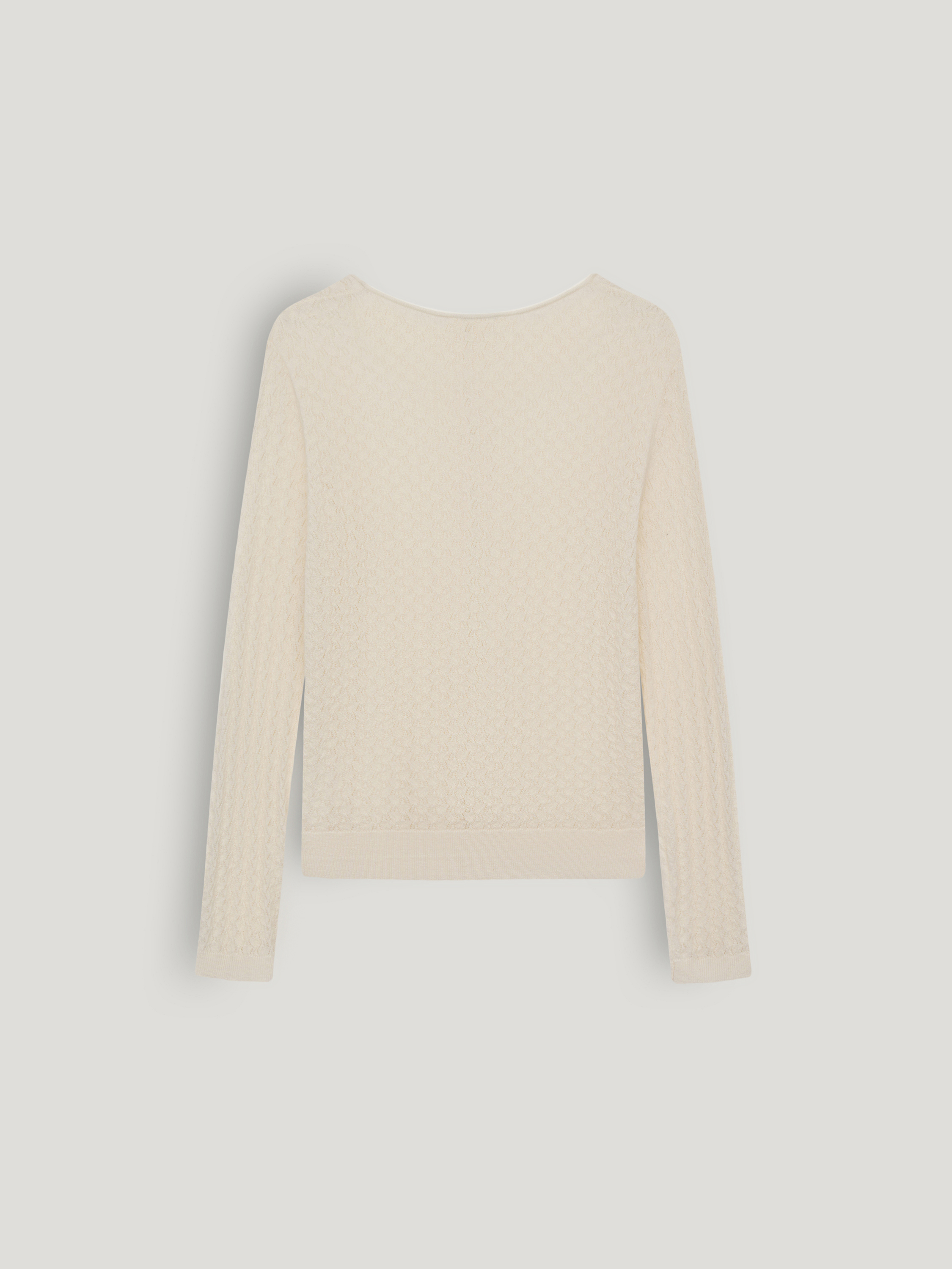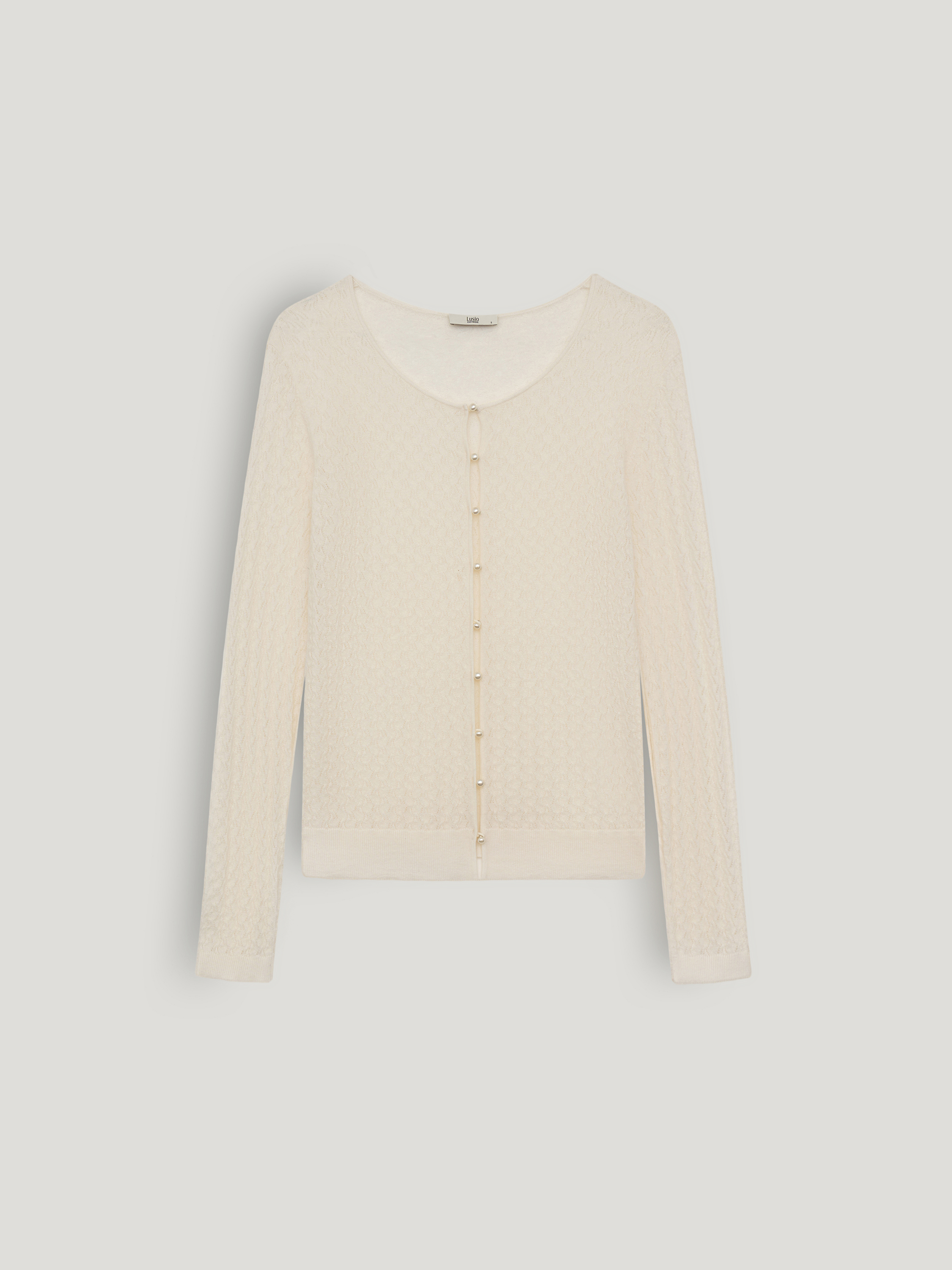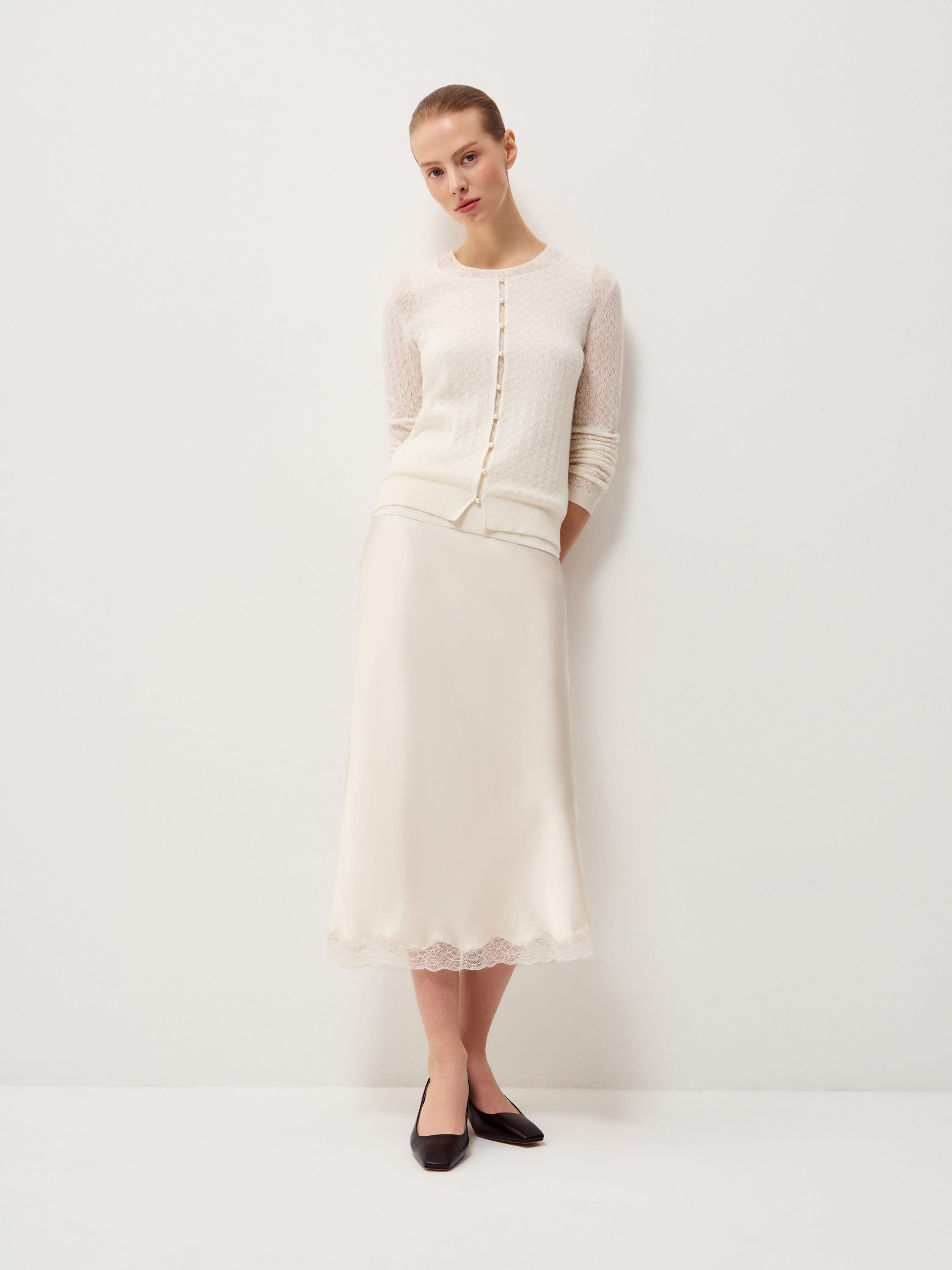 Кардиган в светлом молочном оттенке выполнен из тонкого трикотажа с выразительной узорной вязкой: фактура мелкая, с деликатным ритмом и легкой прозрачностью, за счет чего поверхность выглядит объемной. Модель с круглой горловиной и центральной застежкой на небольшие пуговицы в тон сохраняет лаконичную вертикаль. Посадка прилегающая, без лишнего объема, линия плеча естественная, рукава полной длины с узкими манжетами фиксируют форму. Нижний край оформлен эластичной планкой, которая стабилизирует силуэт и аккуратно обозначает линию талии. Кардиган подходит для сочетаний с юбками миди и макси, а также может использоваться как самостоятельный верх или как легкий слой в более сложных комплектах.