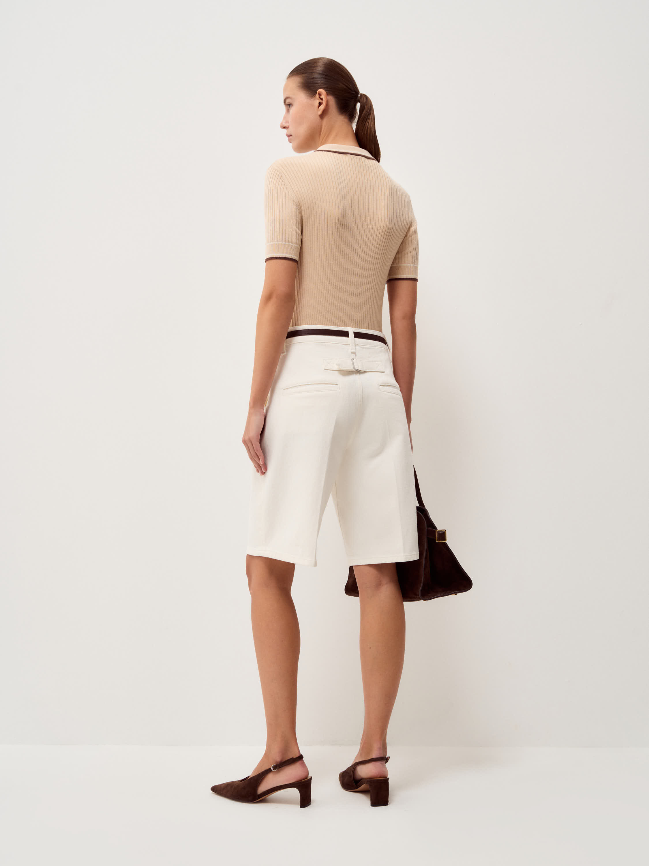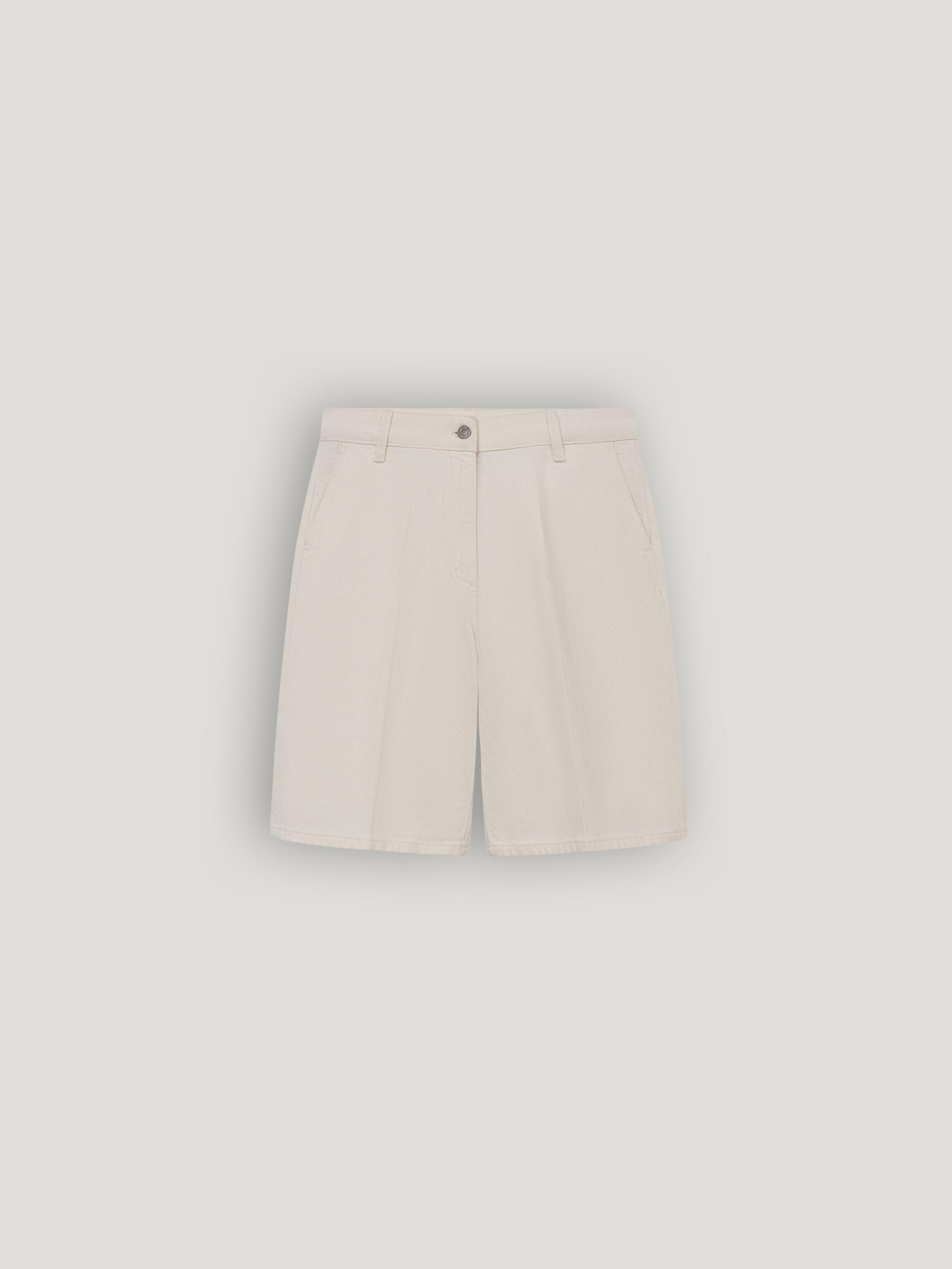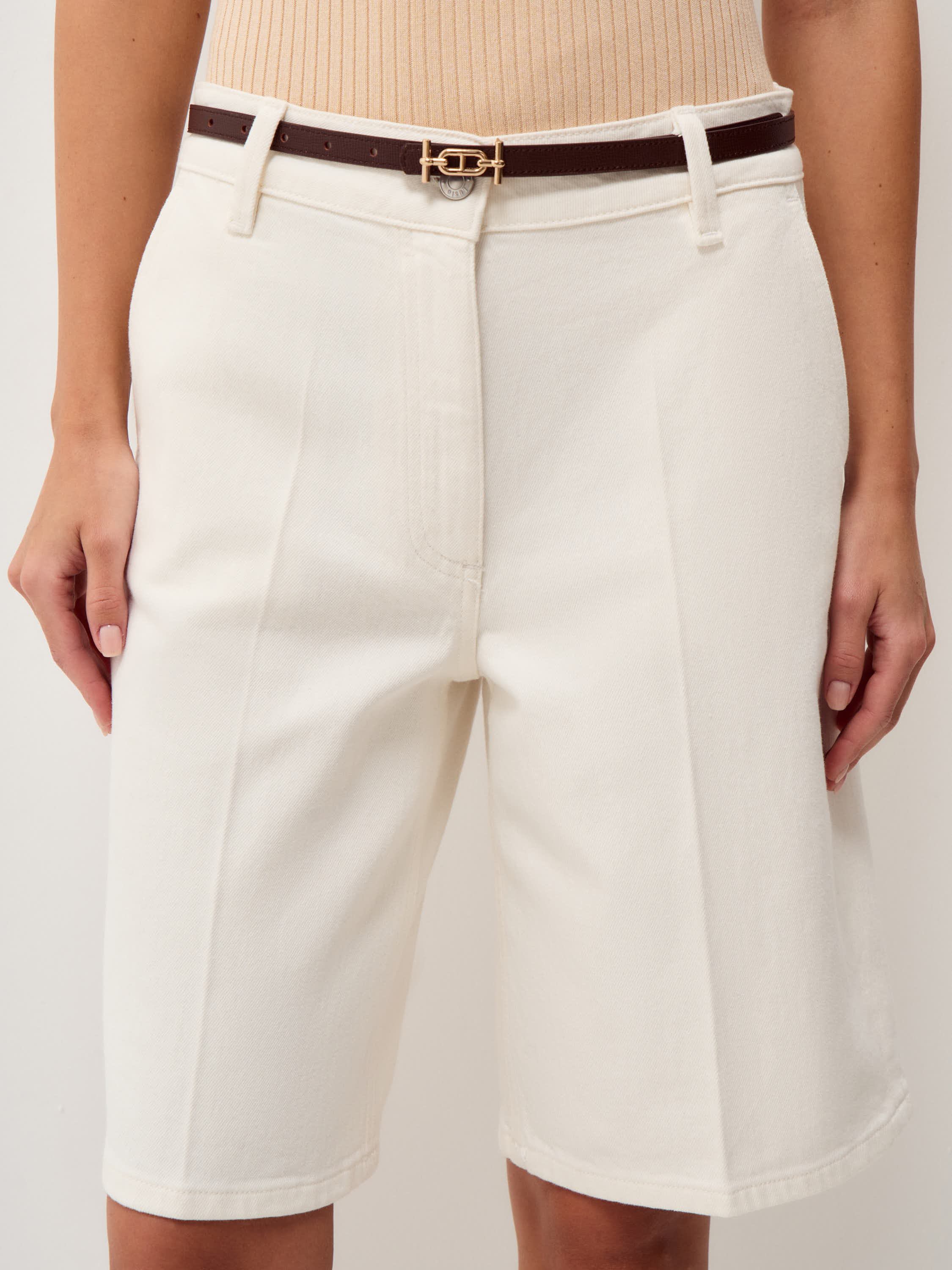 Шорты прямого кроя с умеренно свободной посадкой и оформленной линией талии со шлевками под ремень. Аккуратные защипы спереди задают форму и добавляют объем в области бедер. Длина до колена сохраняет баланс между сдержанностью и удобством в повседневной носке. Выполнены из хлопка с плотной матовой фактурой, которая держит форму и комфортна в течение дня. Оттенок молочного белого универсален и сочетается с трикотажем, рубашками и жакетами, вписываясь как в повседневные, так и в более собранные комплекты.