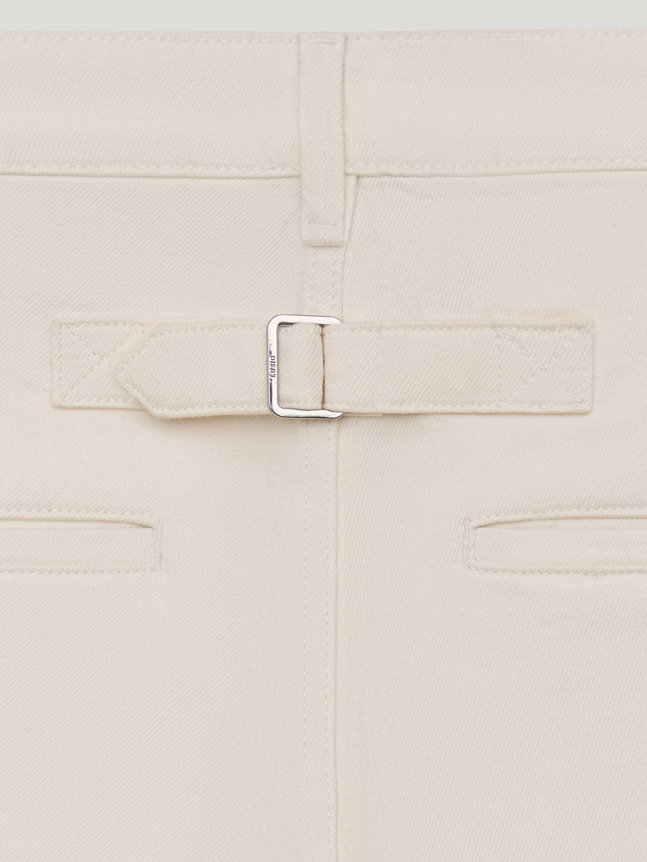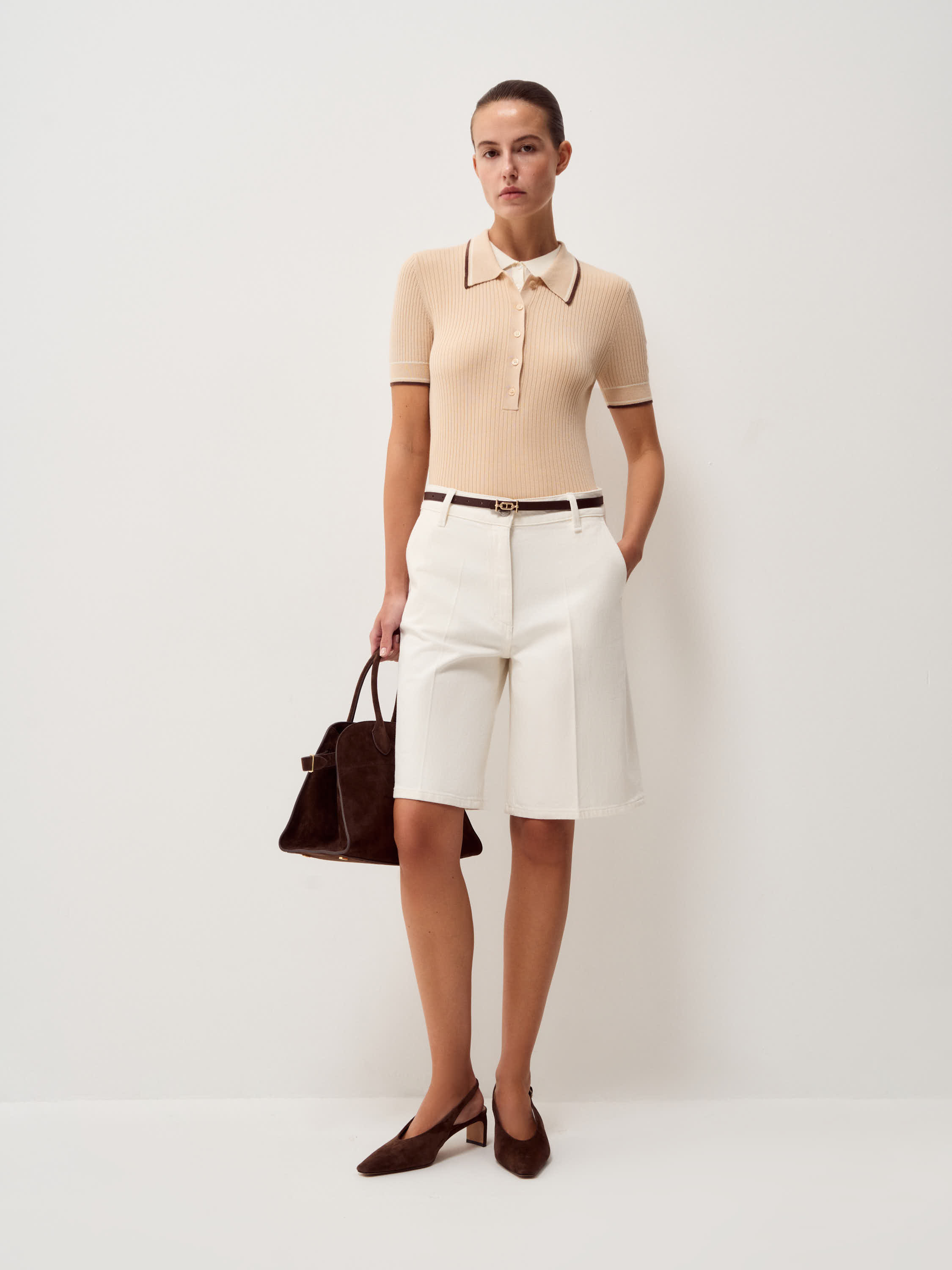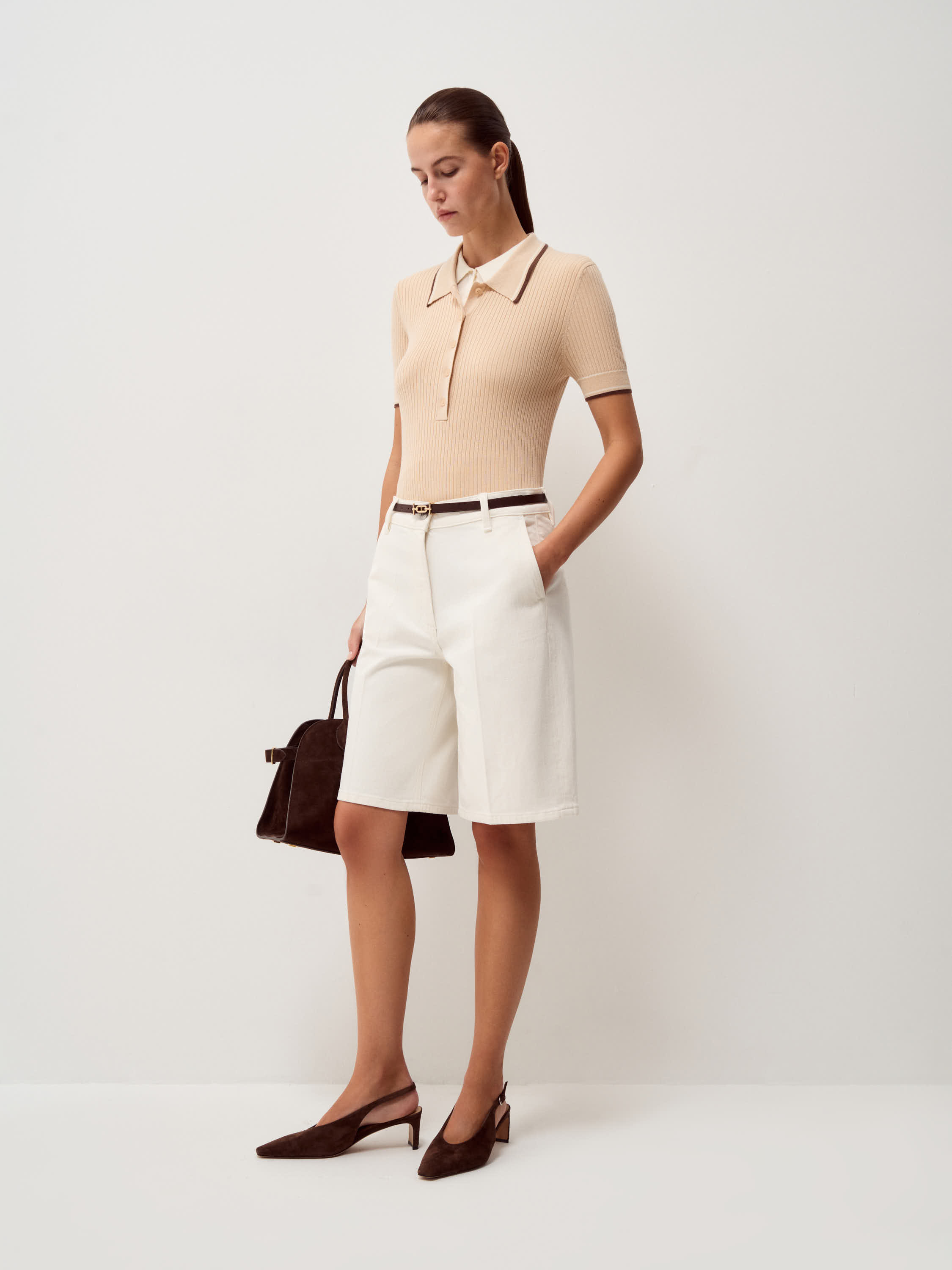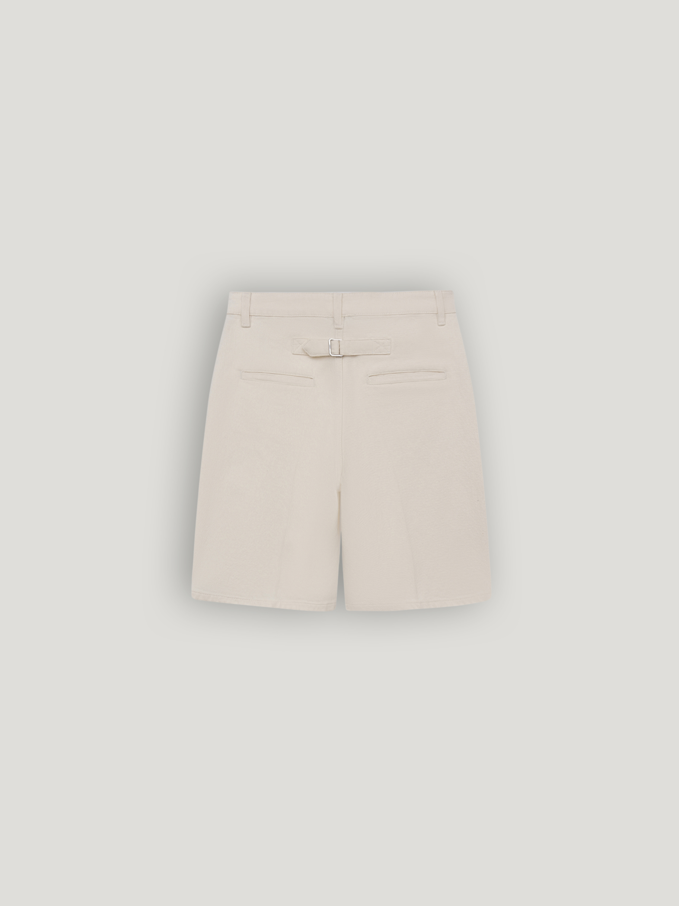 Шорты прямого кроя с умеренно свободной посадкой и оформленной линией талии со шлевками под ремень. Аккуратные защипы спереди задают форму и добавляют объем в области бедер. Длина до колена сохраняет баланс между сдержанностью и удобством в повседневной носке. Выполнены из хлопка с плотной матовой фактурой, которая держит форму и комфортна в течение дня. Оттенок молочного белого универсален и сочетается с трикотажем, рубашками и жакетами, вписываясь как в повседневные, так и в более собранные комплекты.