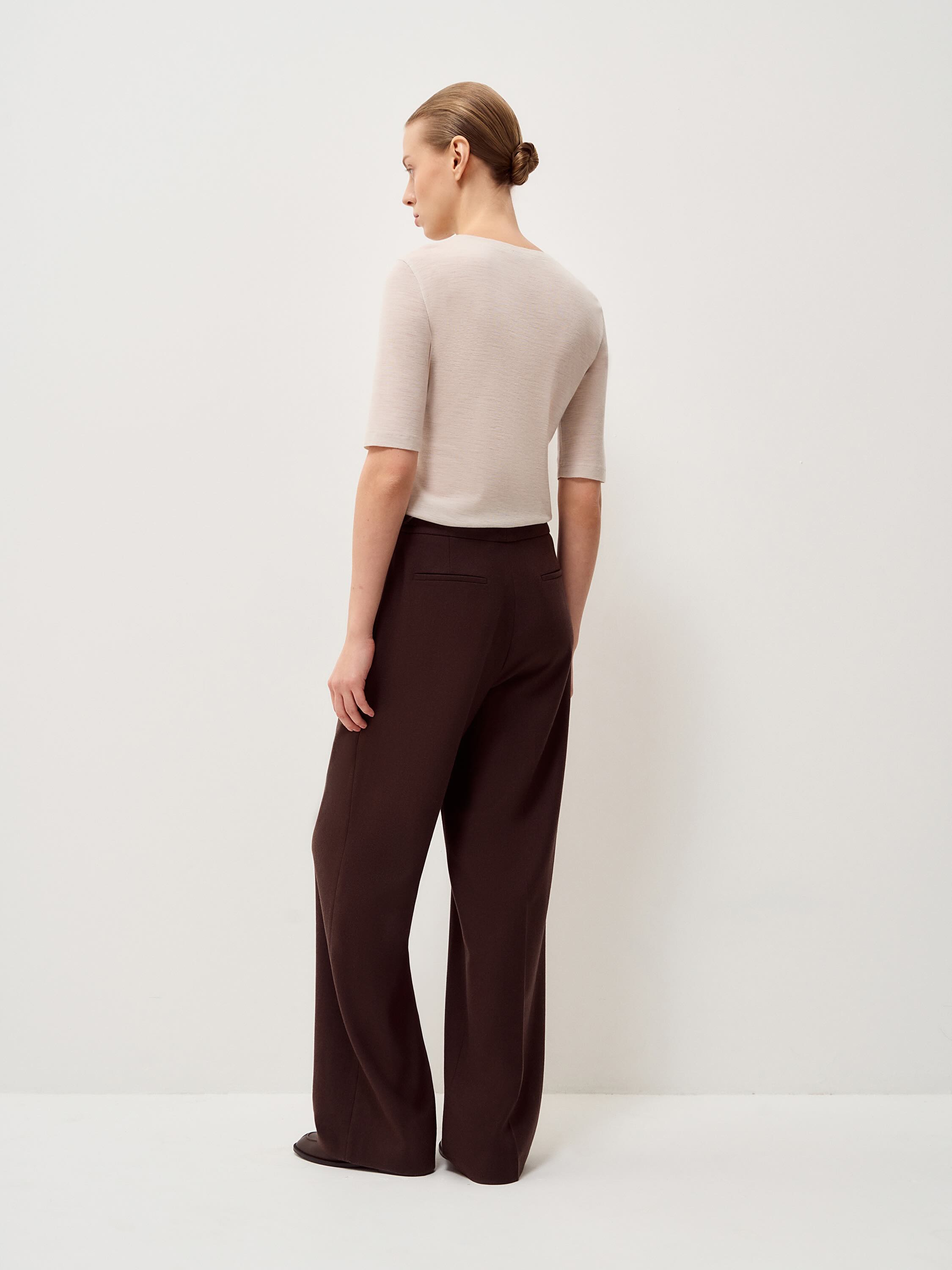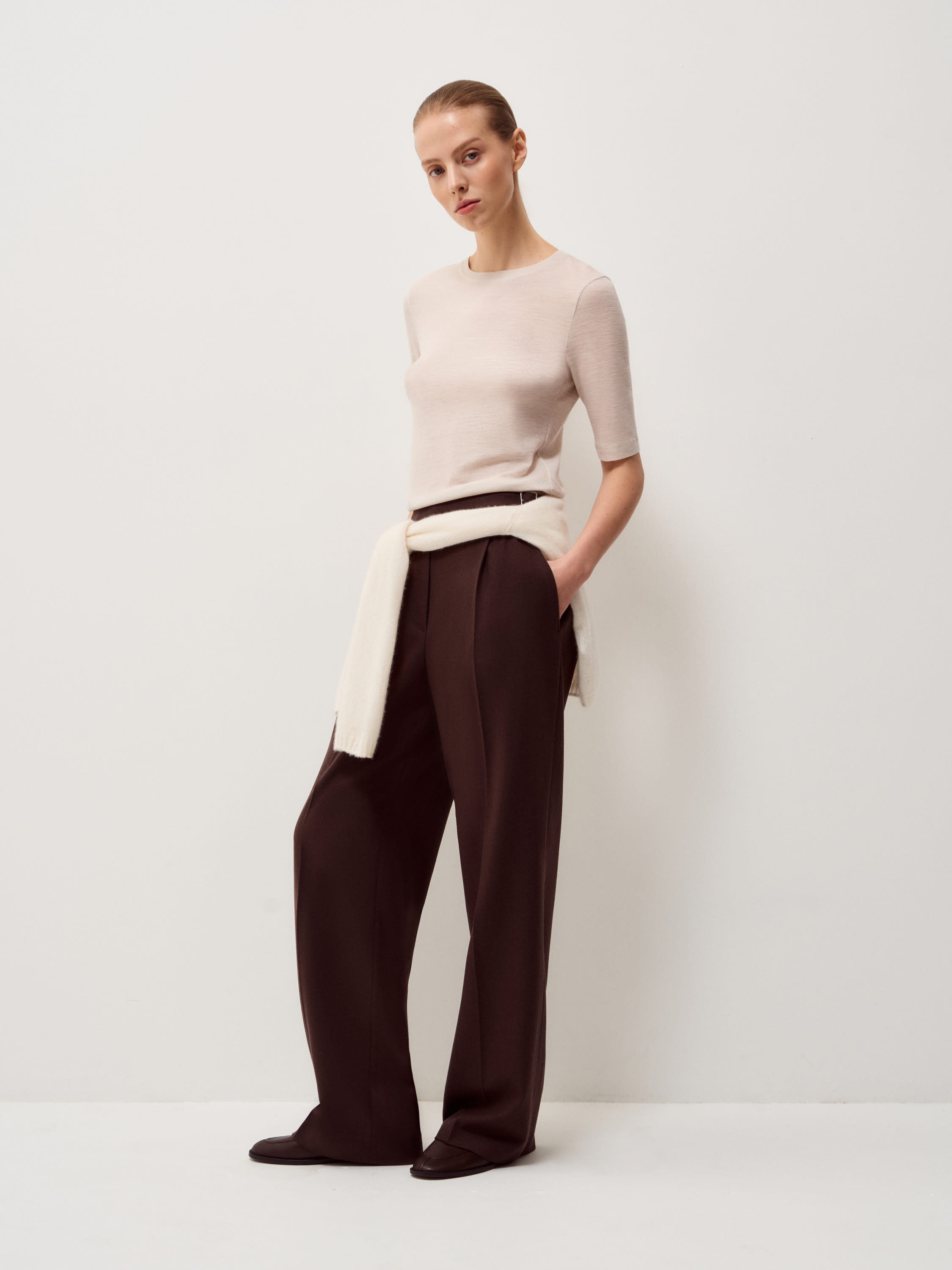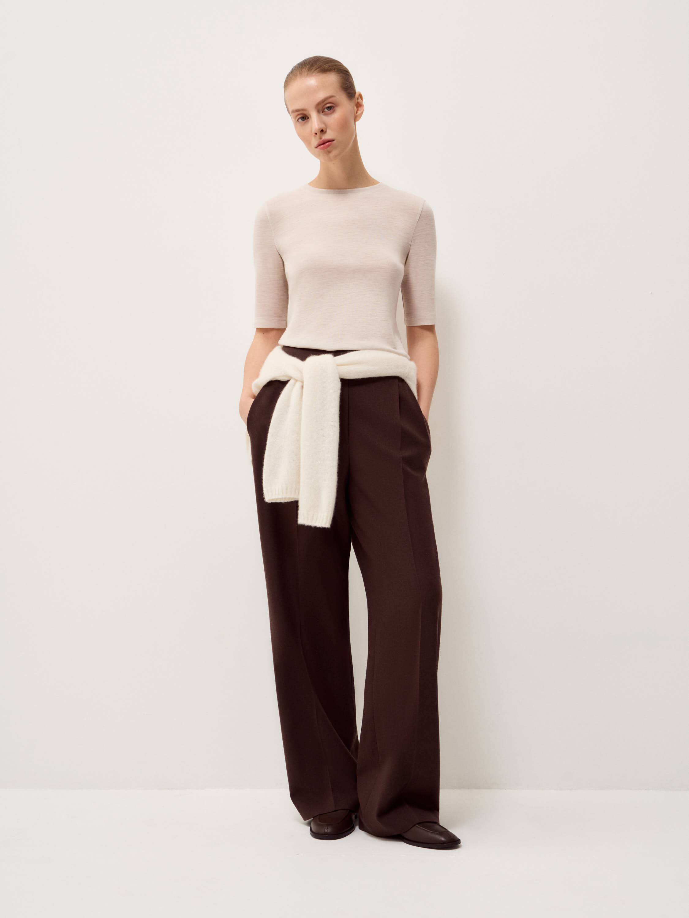 Футболка выполнена из хлопка с добавлением модала и шелка — сочетание натуральных волокон, которое обеспечивает мягкость, пластичность и комфорт в носке. Ткань легкая, дышащая, с деликатной гладкостью и приятной тактильностью, аккуратно держит форму и сохраняет аккуратный силуэт. Модель прямого кроя с округлой линией горловины и удлиненным коротким рукавом выглядит лаконично и универсально. Посадка свободная, без лишнего объема, подходит для повседневных образов и многослойных сочетаний. Оттенок темно-коричневый — глубокий и насыщенный, гармонично сочетается с бежевой, молочной и денимовой палитрой.