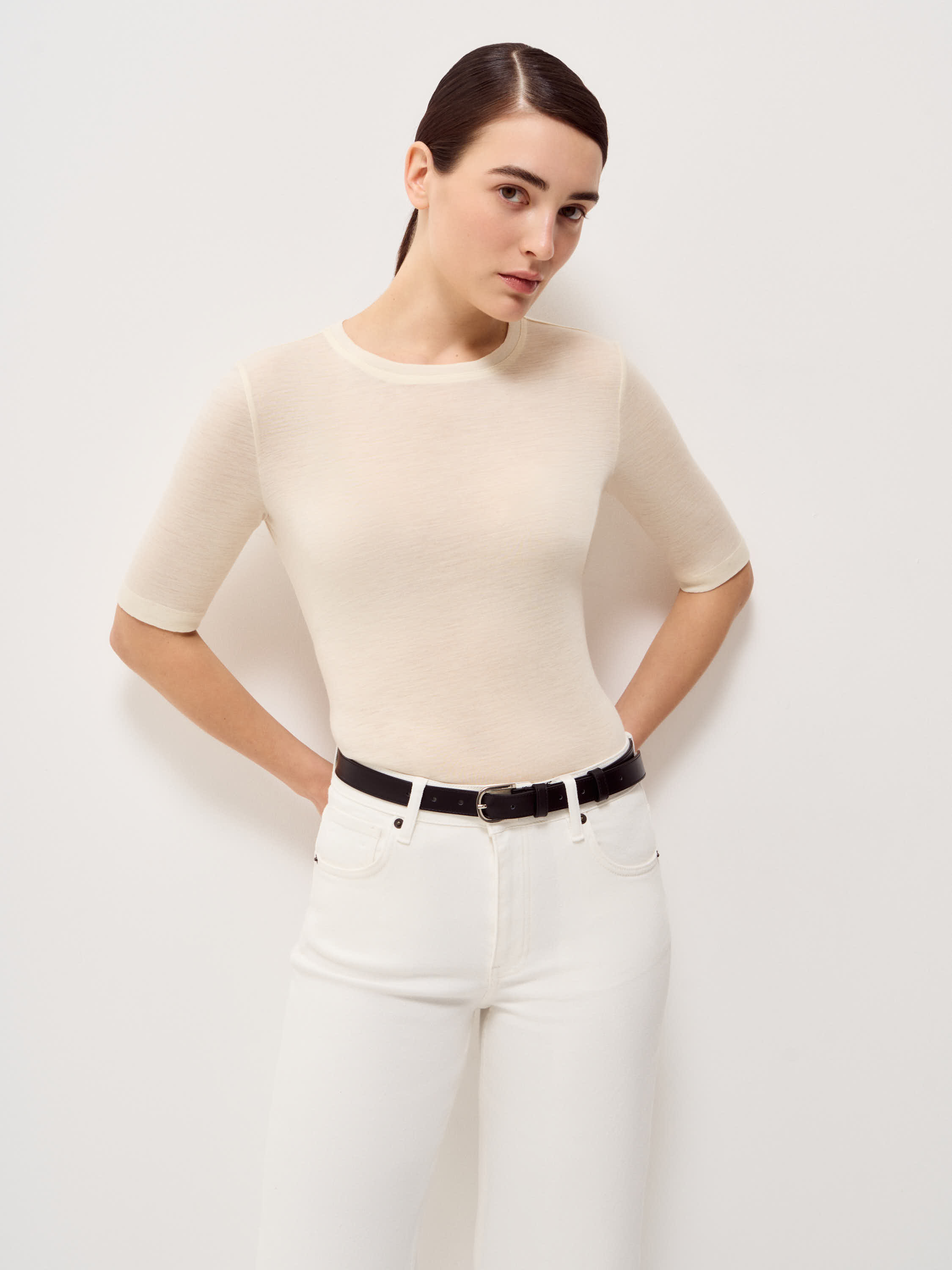 Футболка выполнена из хлопка с добавлением модала и шелка — сочетание натуральных волокон, которое обеспечивает мягкость, пластичность и комфорт в носке. Ткань легкая, дышащая, с деликатной гладкостью и приятной тактильностью, аккуратно держит форму и сохраняет аккуратный силуэт. Модель прямого кроя с округлой линией горловины и удлиненным коротким рукавом выглядит лаконично и универсально. Посадка свободная, без лишнего объема, подходит для повседневных образов и многослойных сочетаний. Оттенок темно-коричневый — глубокий и насыщенный, гармонично сочетается с бежевой, молочной и денимовой палитрой.