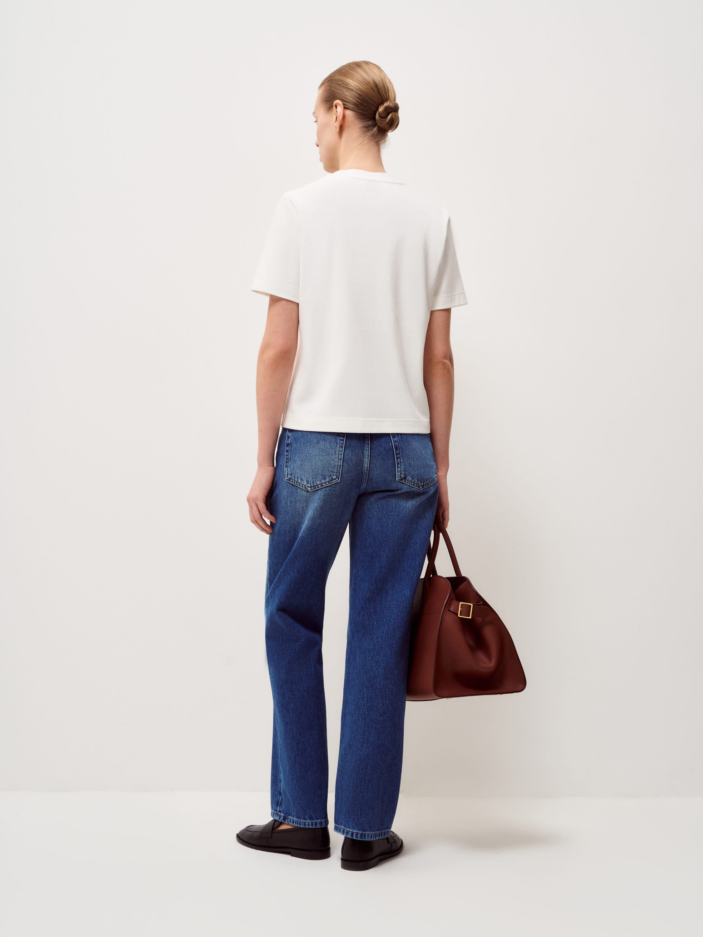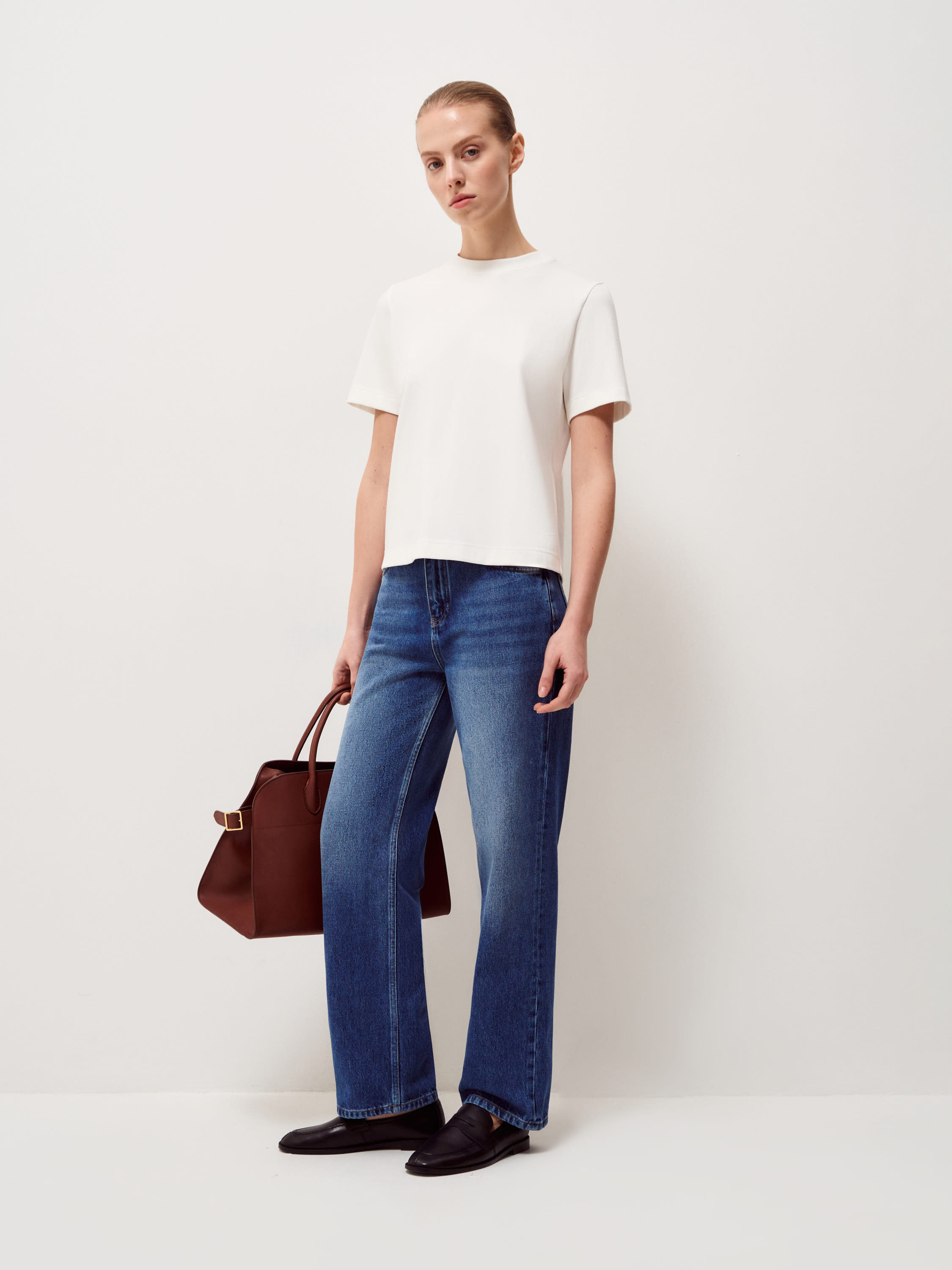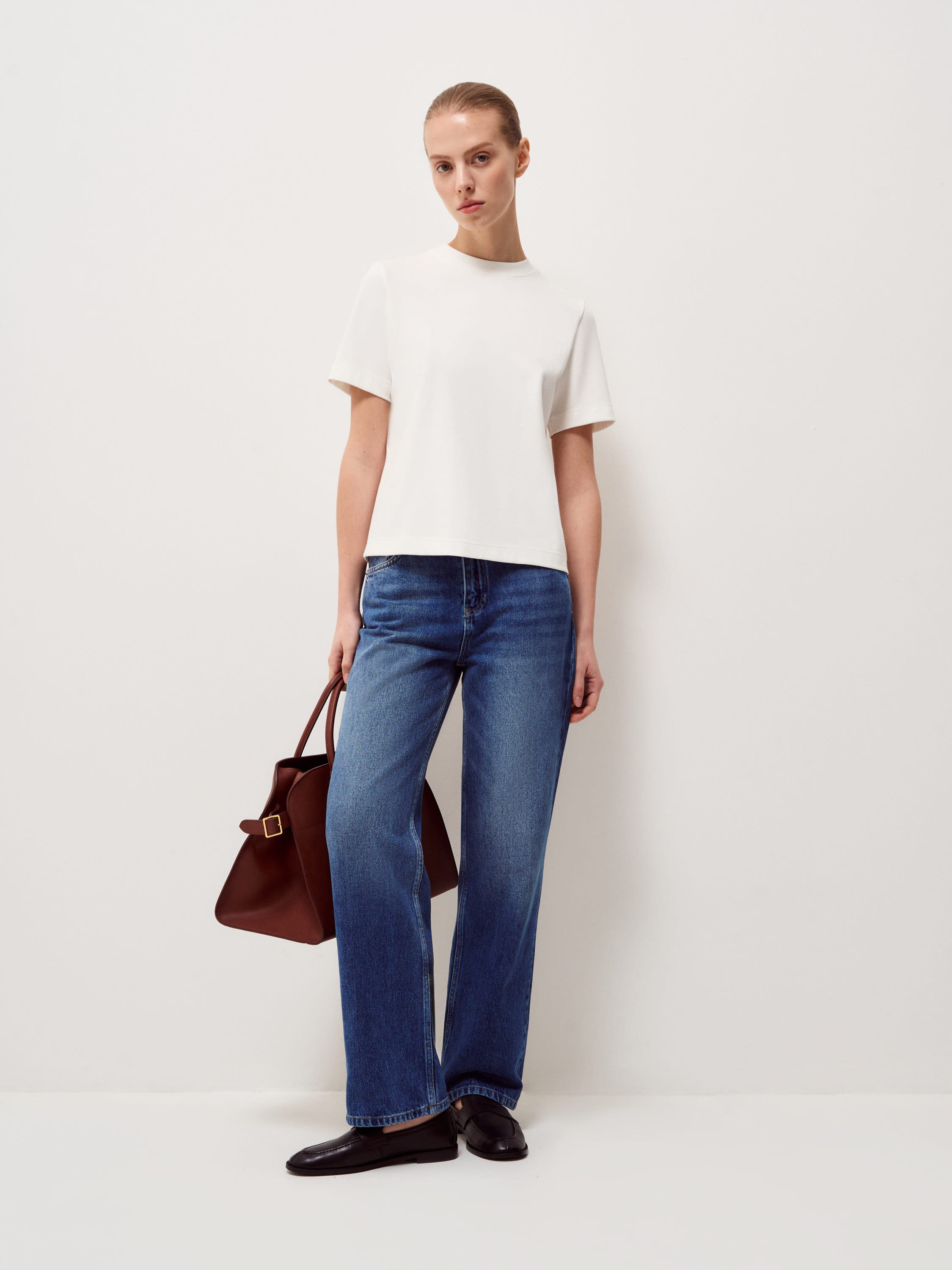Базовая футболка выполнена из плотного хлопкового трикотажа с добавлением эластана, благодаря чему материал сохраняет аккуратный внешний вид в течение дня. Прямой силуэт без лишних деталей формирует ровную вертикаль, короткий рукав и аккуратная обработка горловины подчеркивает чистоту формы. Длина позволяет носить модель навыпуск или заправлять, не создавая лишнего объема в области талии. Глубокий черный оттенок выглядит собранно и служит нейтральной базой для сочетаний с костюмными брюками, денимом, юбками миди или многослойными комплектами с жакетом и трикотажем.