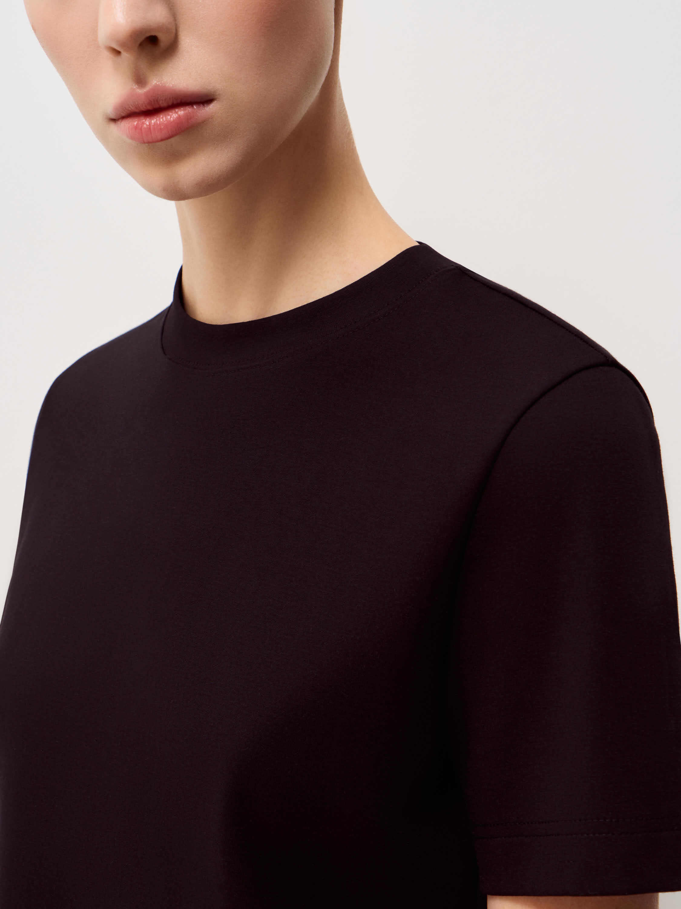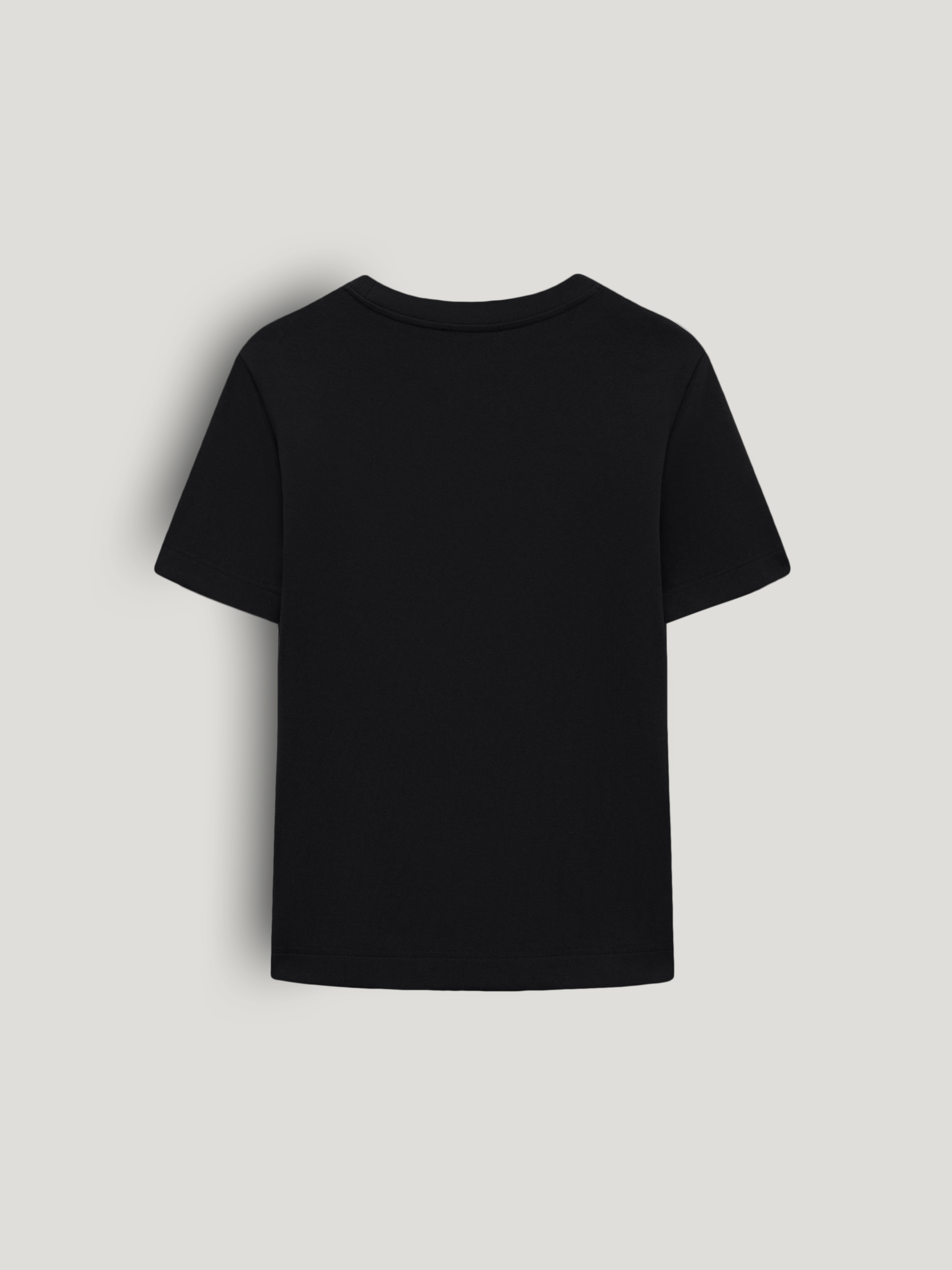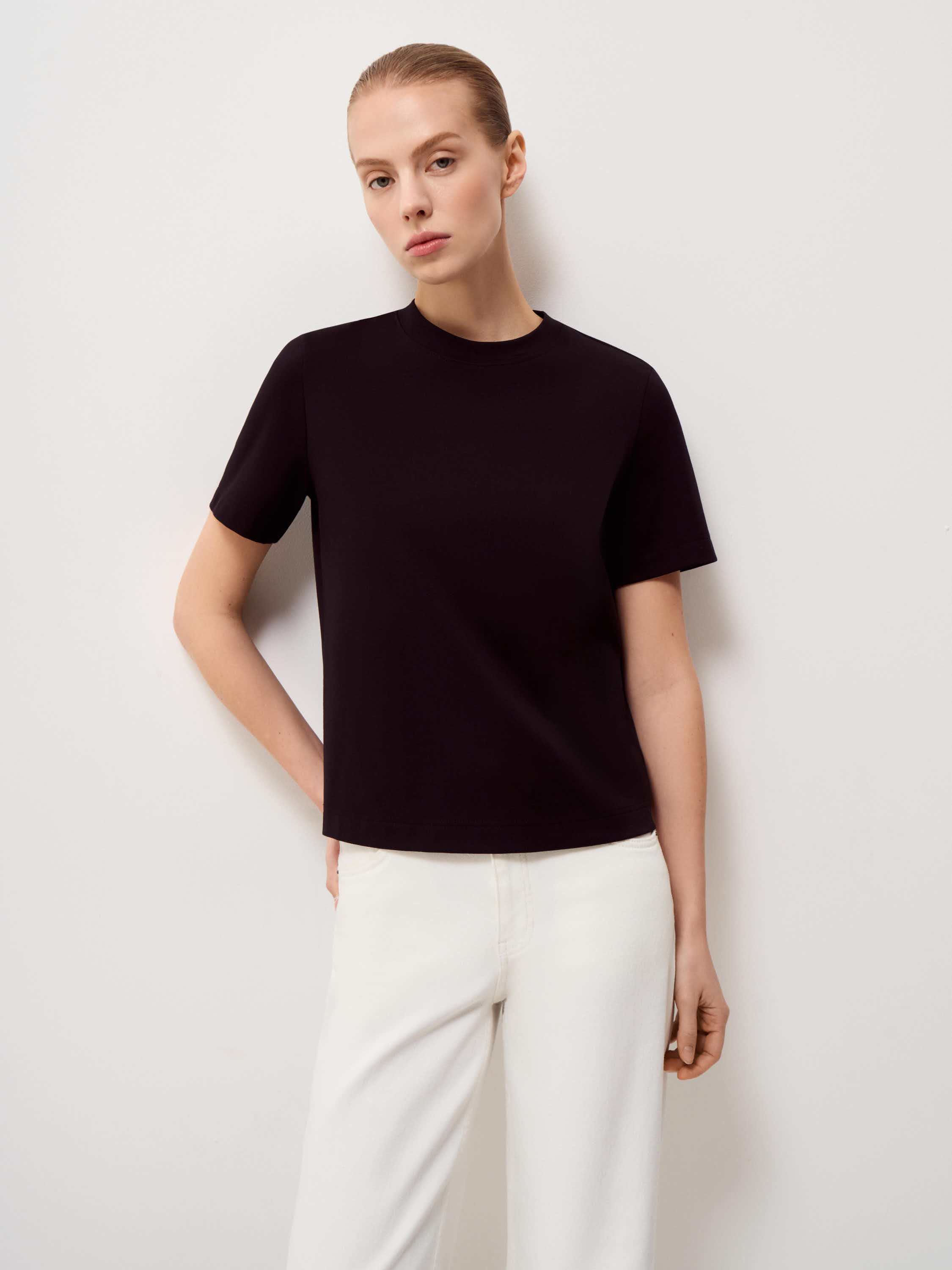 Базовая футболка выполнена из плотного хлопкового трикотажа с добавлением эластана, благодаря чему материал сохраняет аккуратный внешний вид в течение дня. Прямой силуэт без лишних деталей формирует ровную вертикаль, короткий рукав и аккуратная обработка горловины подчеркивает чистоту формы. Длина позволяет носить модель навыпуск или заправлять, не создавая лишнего объема в области талии. Глубокий черный оттенок выглядит собранно и служит нейтральной базой для сочетаний с костюмными брюками, денимом, юбками миди или многослойными комплектами с жакетом и трикотажем.