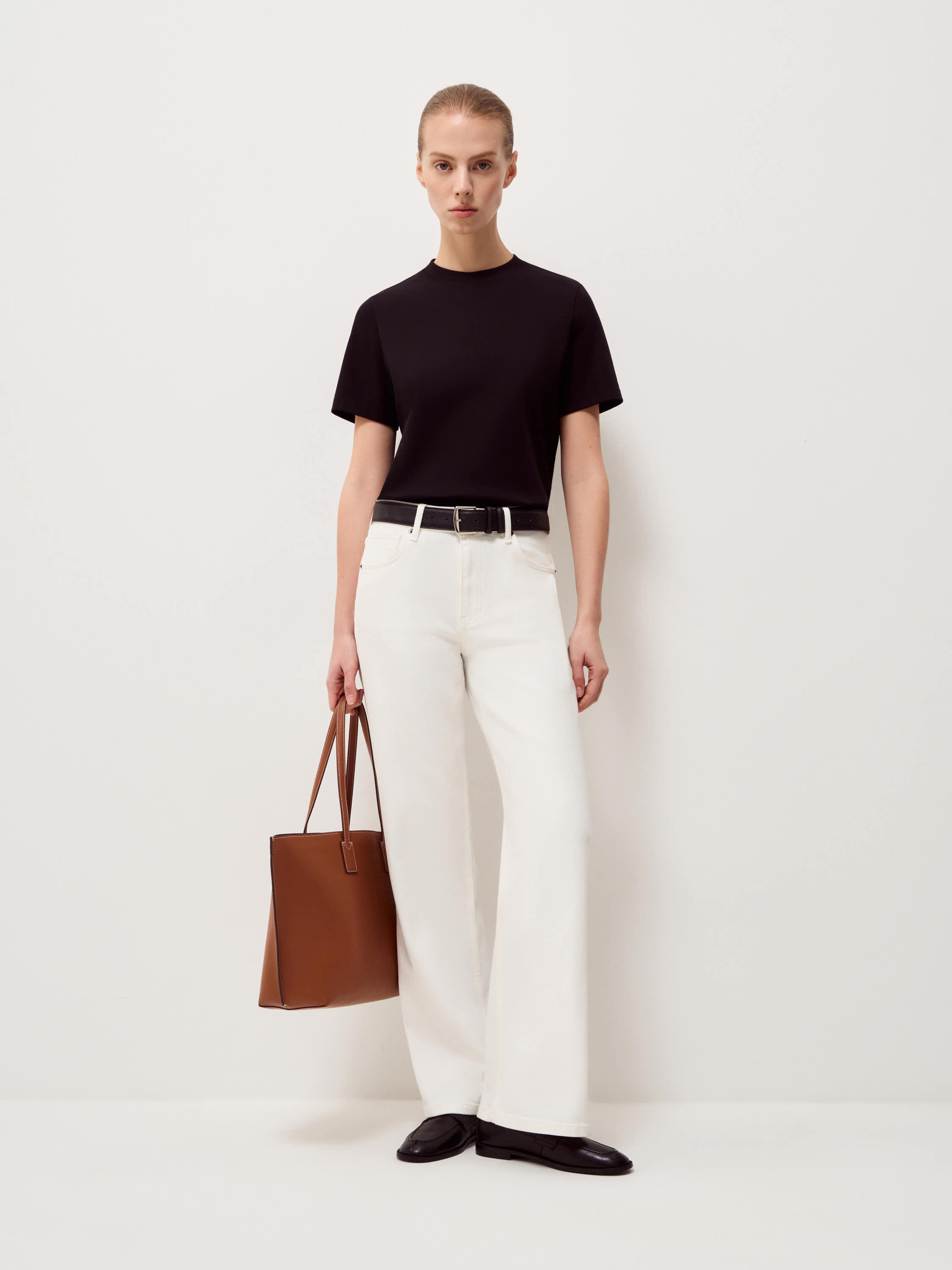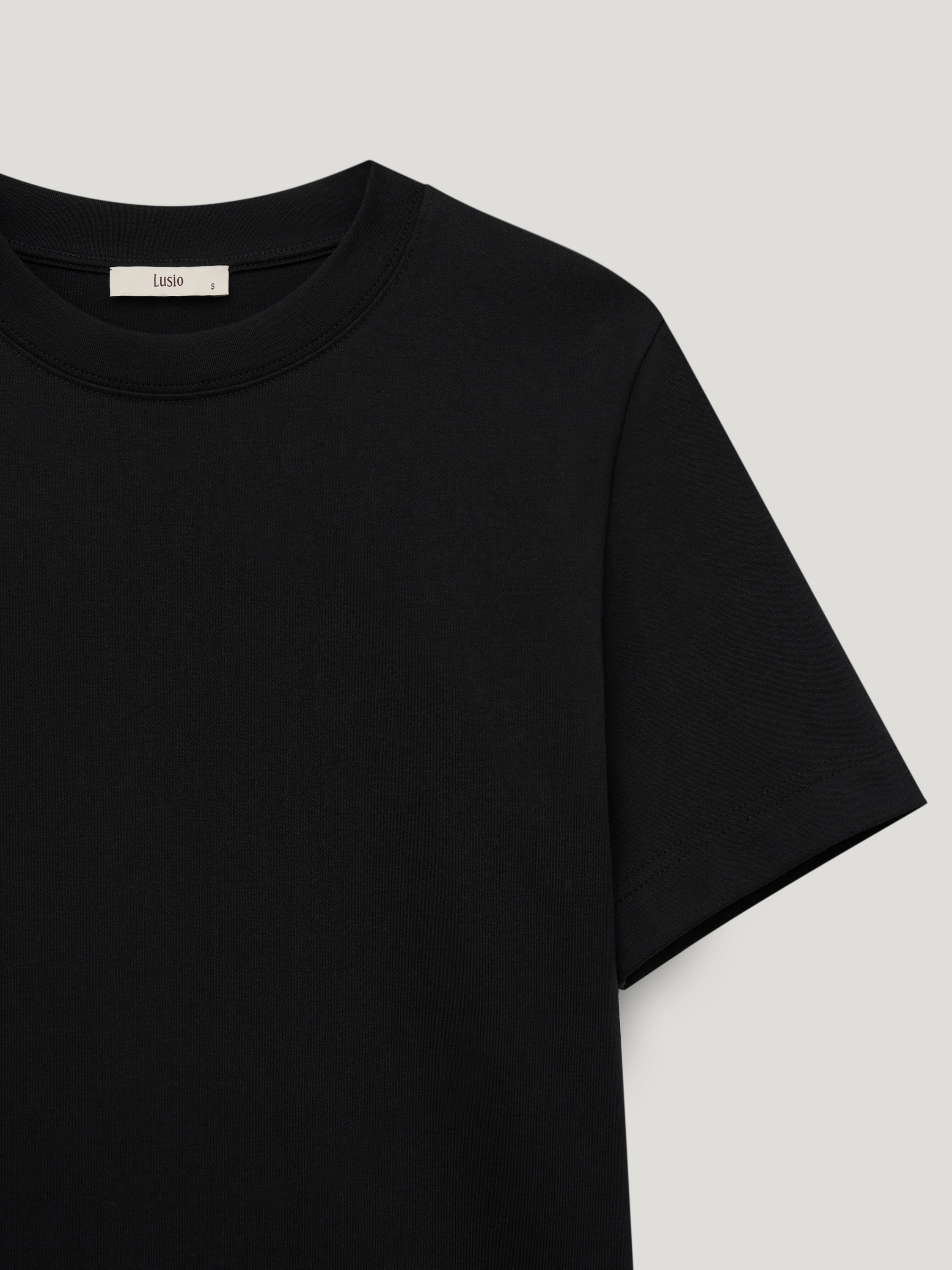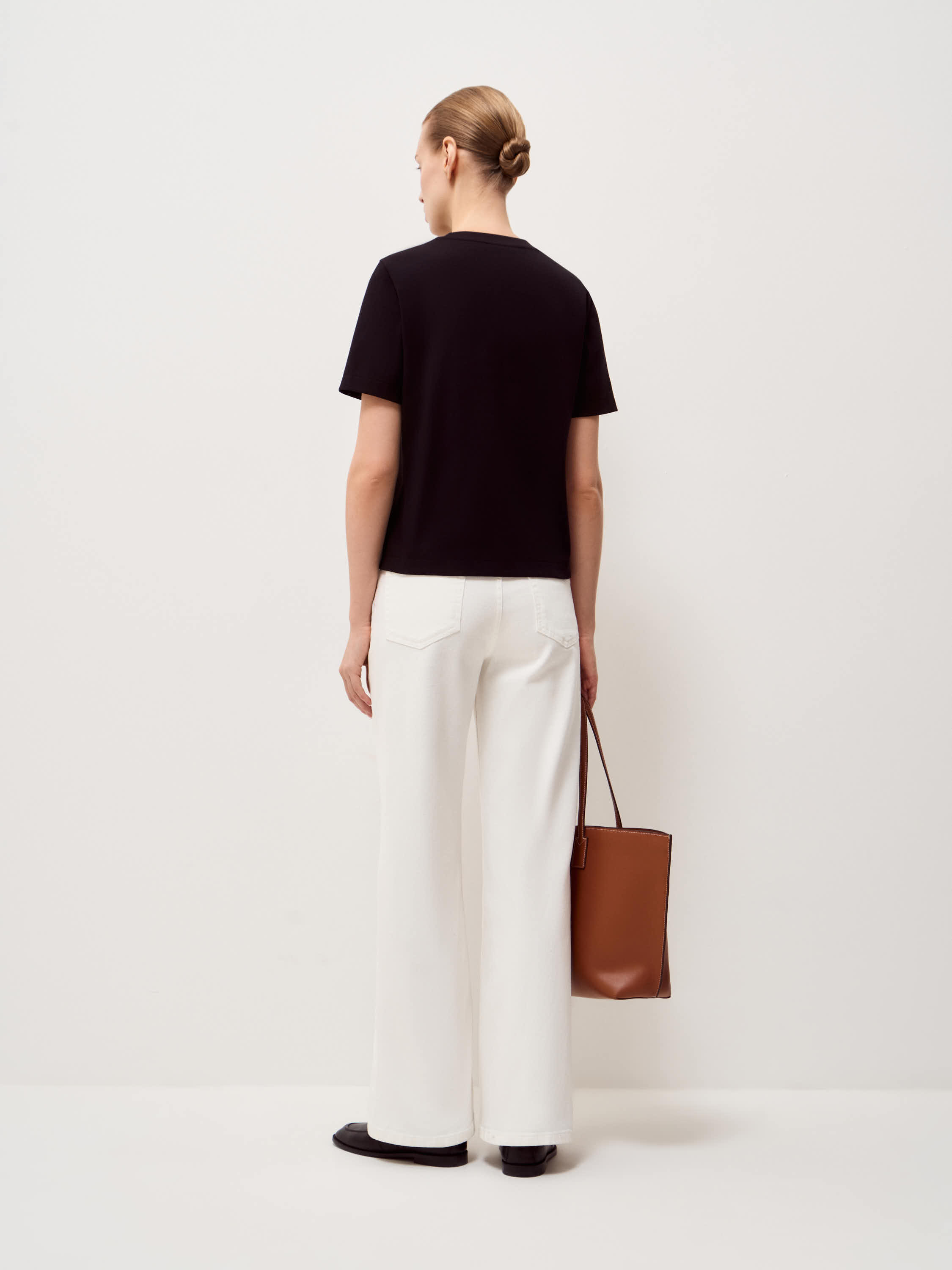Базовая футболка выполнена из плотного хлопкового трикотажа с добавлением эластана, благодаря чему материал сохраняет аккуратный внешний вид в течение дня. Прямой силуэт без лишних деталей формирует ровную вертикаль, короткий рукав и аккуратная обработка горловины подчеркивает чистоту формы. Длина позволяет носить модель навыпуск или заправлять, не создавая лишнего объема в области талии. Глубокий черный оттенок выглядит собранно и служит нейтральной базой для сочетаний с костюмными брюками, денимом, юбками миди или многослойными комплектами с жакетом и трикотажем.