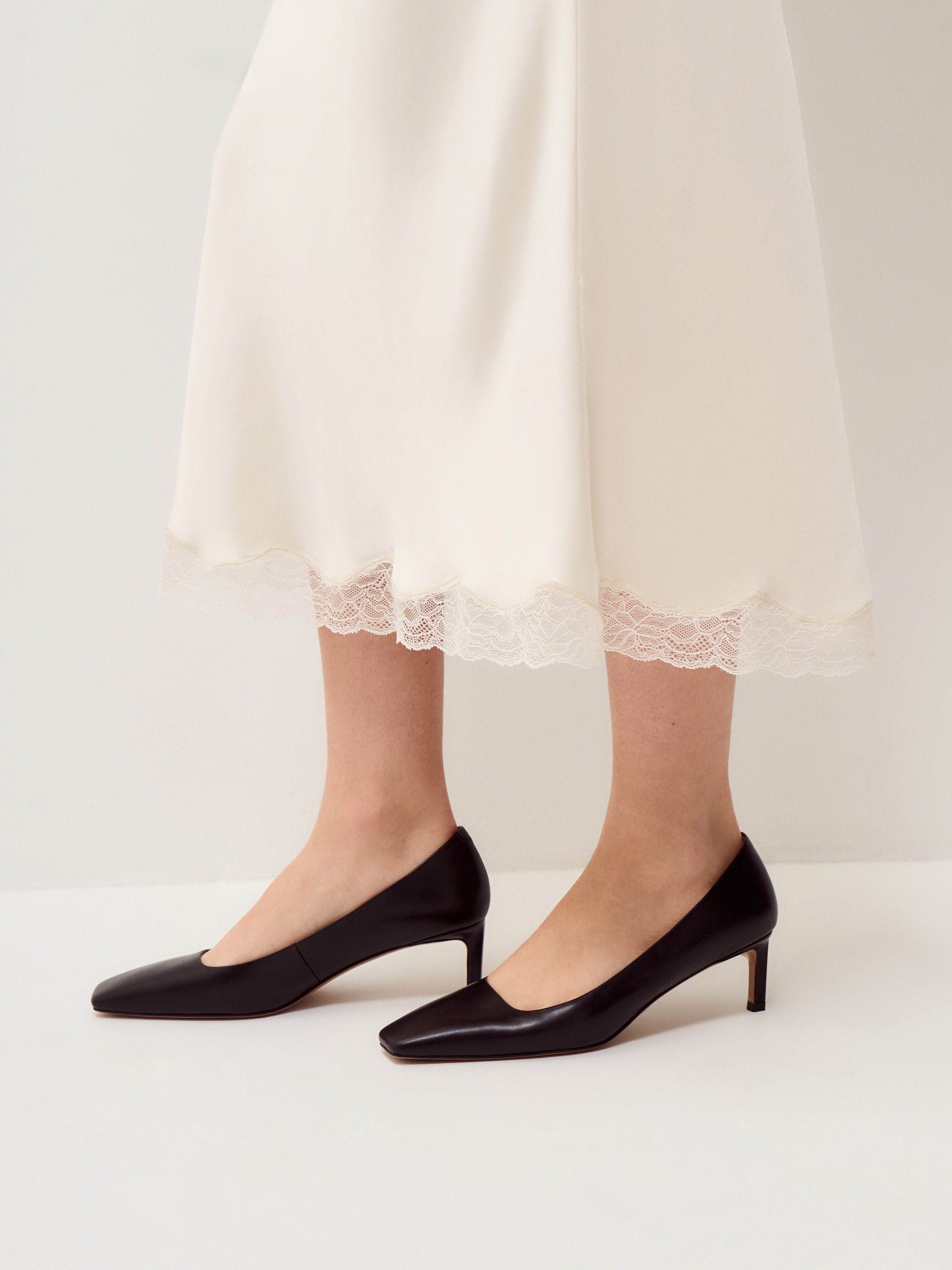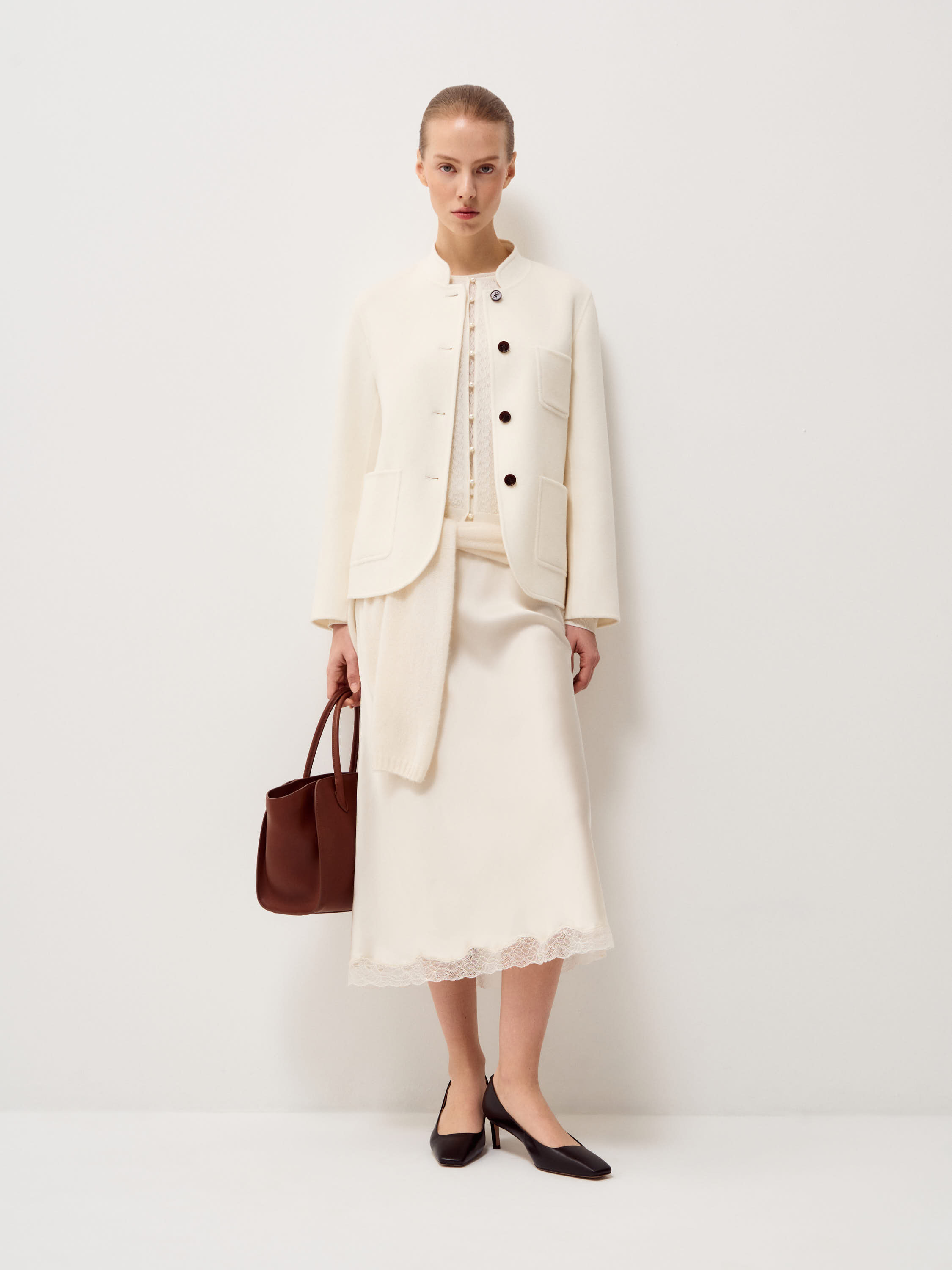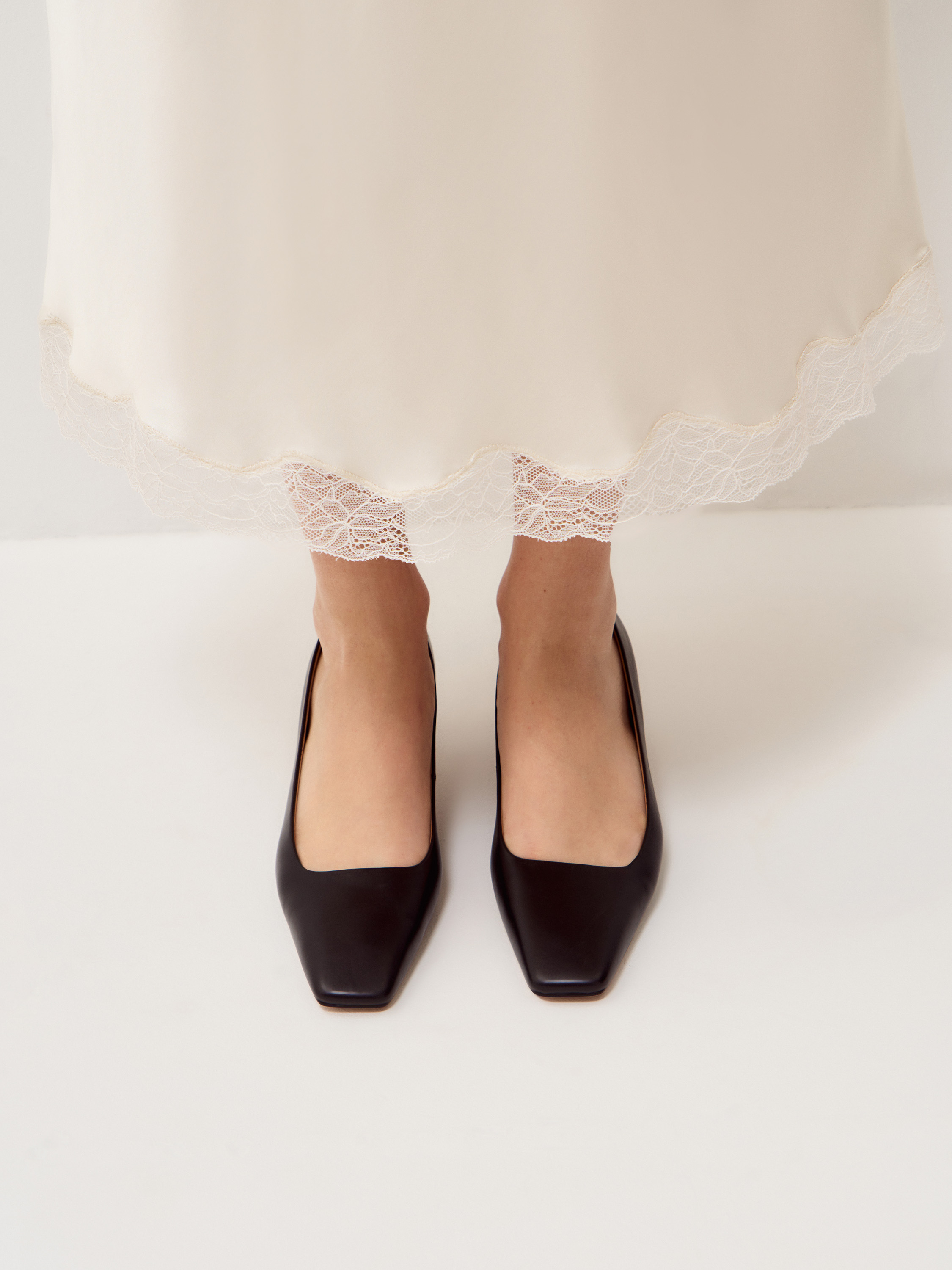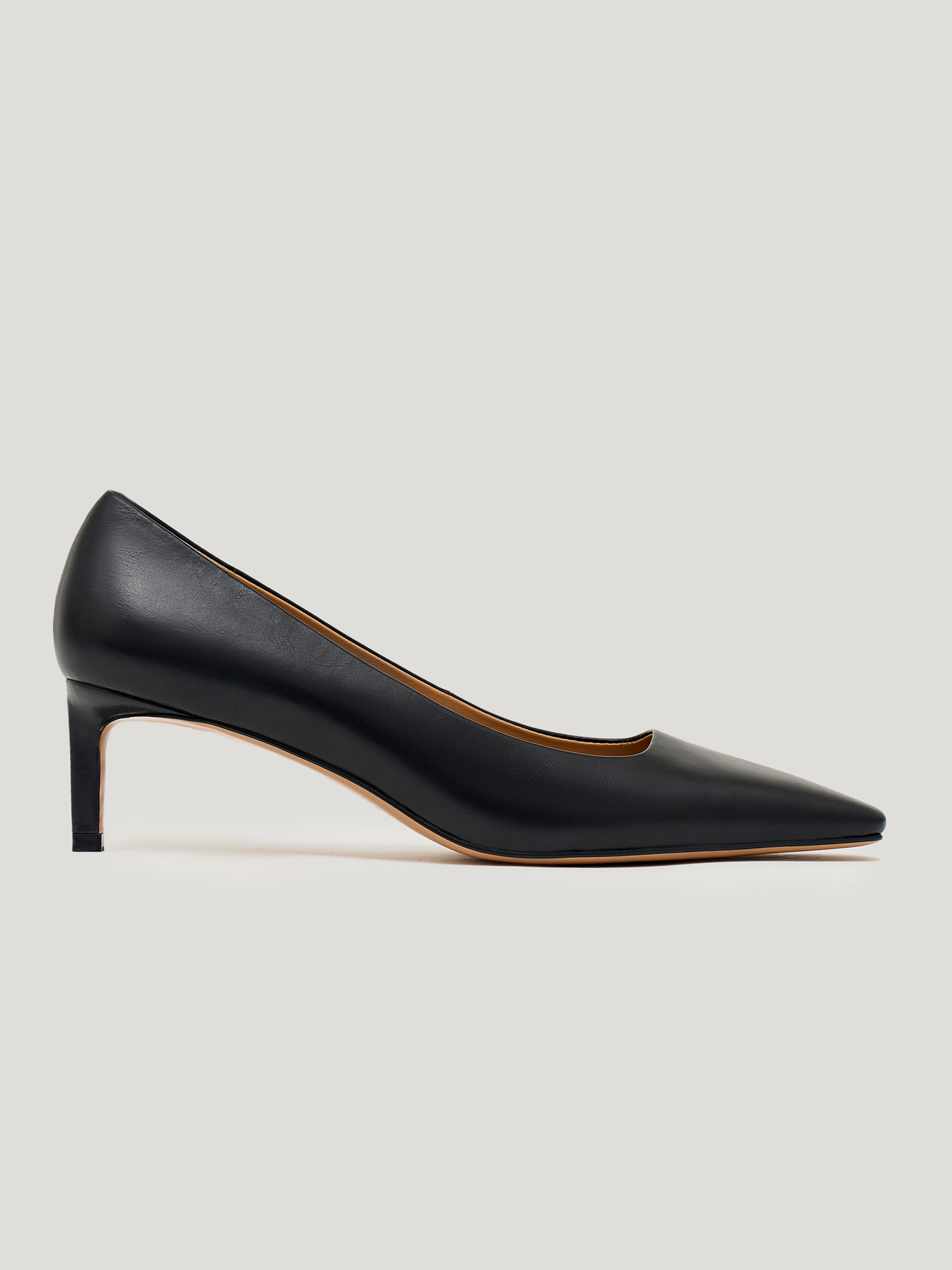 Туфли выполнены из гладкой натуральной кожи в глубоком темно-коричневом оттенке с холодным подтоном. Поверхность ровная, без выраженной текстуры, с деликатным естественным блеском. Модель с заостренным мысом и открытым верхним вырезом формирует вытянутую линию стопы, устойчивый каблук средней высоты обеспечивает комфорт при повседневной носке. Силуэт лаконичный, без декоративных элементов, акцент сделан на чистоте формы и точности пропорций. Туфли органично сочетаются с юбками миди и макси, классическими брюками и денимом, сохраняя строгий, собранный характер образа.