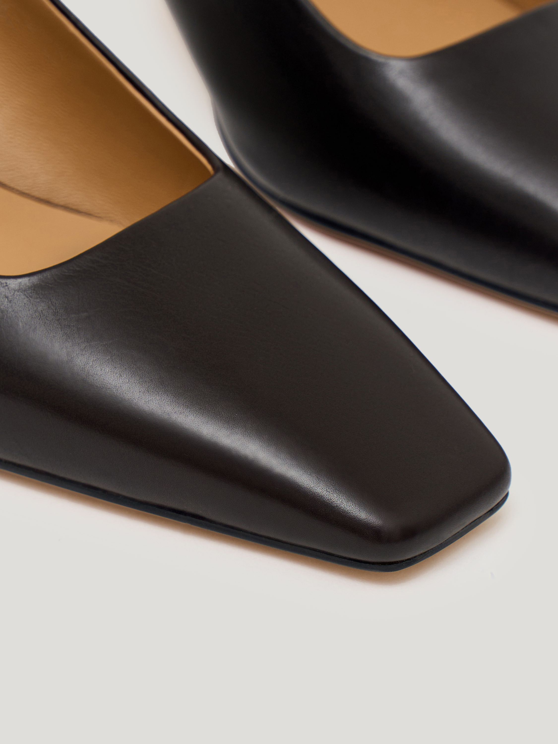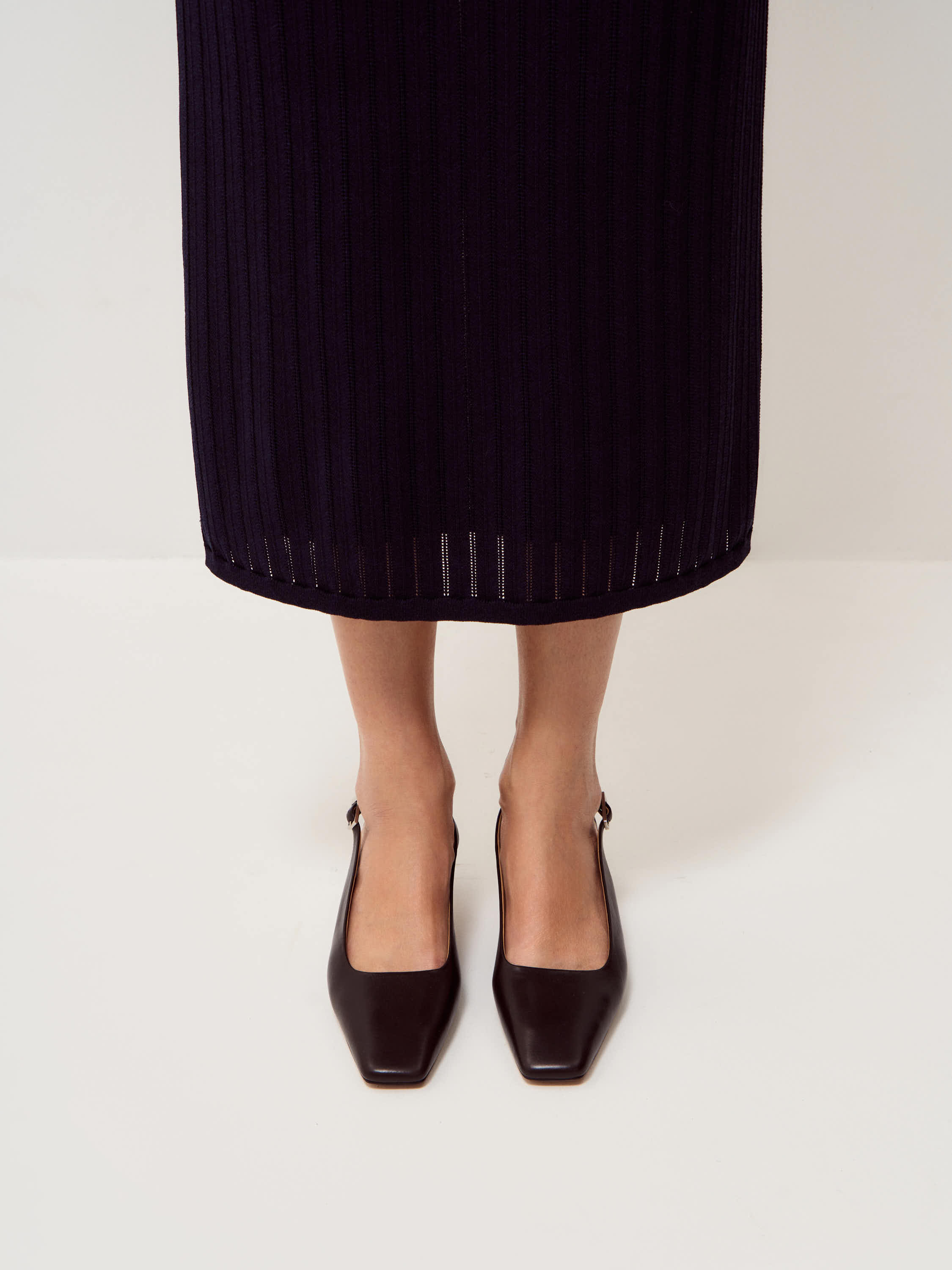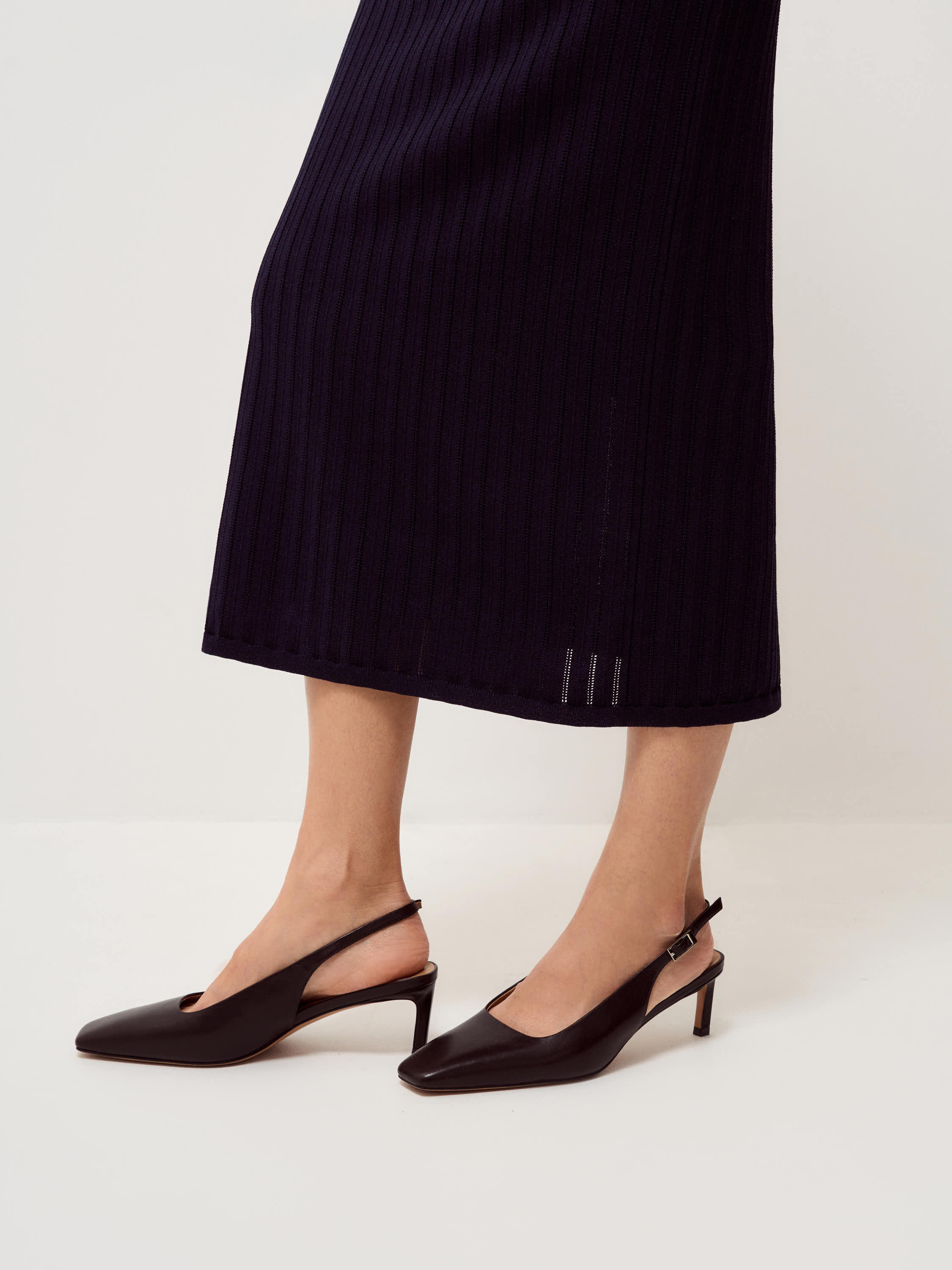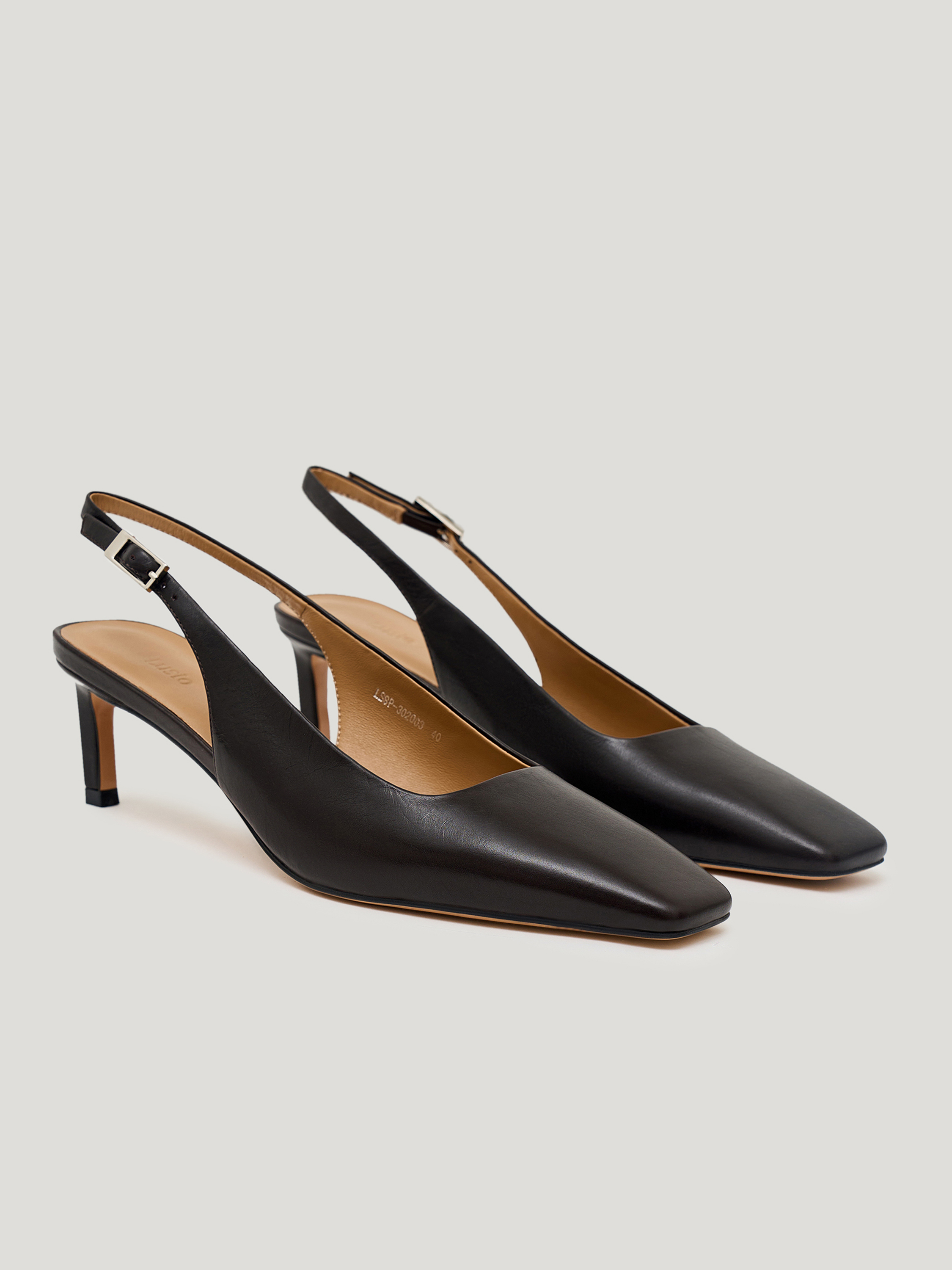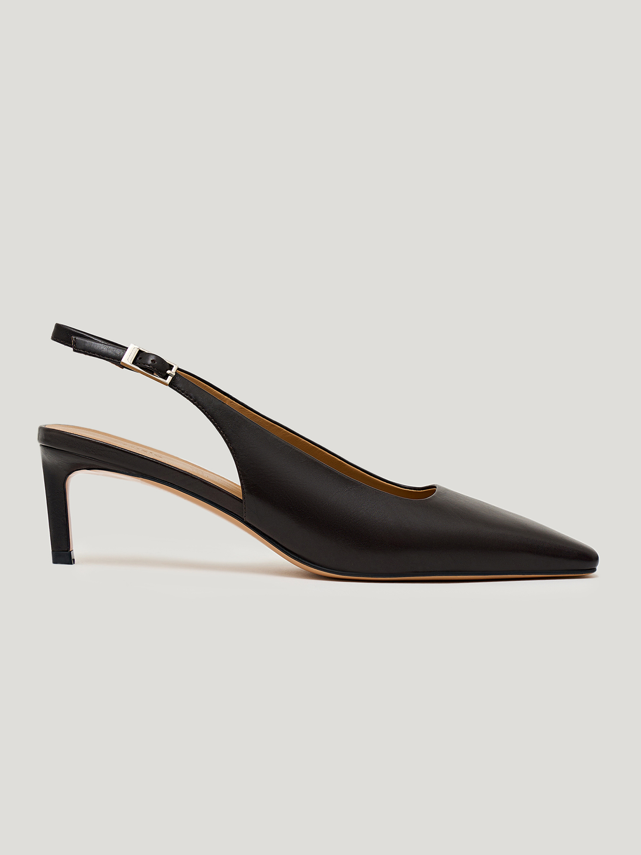 Туфли-слингбэки выполнены из 100% натуральной кожи, с подкладкой и стелькой из натуральной кожи и резиновой подошвой. Кожа гладкая, с деликатным естественным блеском, сохраняет форму и аккуратно выглядит в носке, внутренняя отделка обеспечивает комфорт, резиновая подошва добавляет устойчивость. Модель с заостренным мысом и открытой пяткой, фиксируется регулируемым ремешком, каблук средней высоты, устойчивый и удобный для ежедневных комплектов. Оттенок насыщенный бордовый. Туфли-слингбэки сочетаются с костюмными брюками и юбками, платьями, а также подходят к дениму в более повседневных образах.