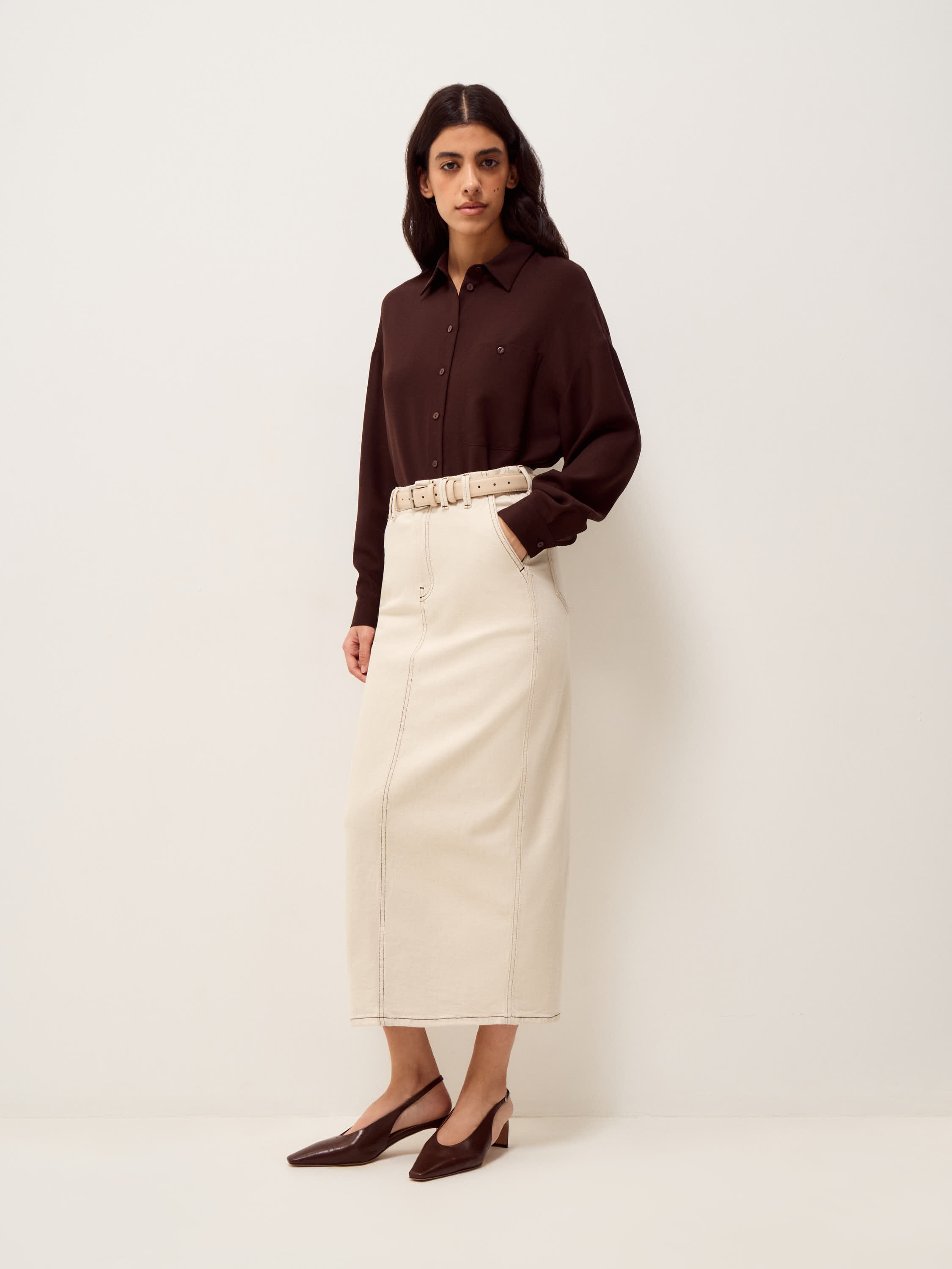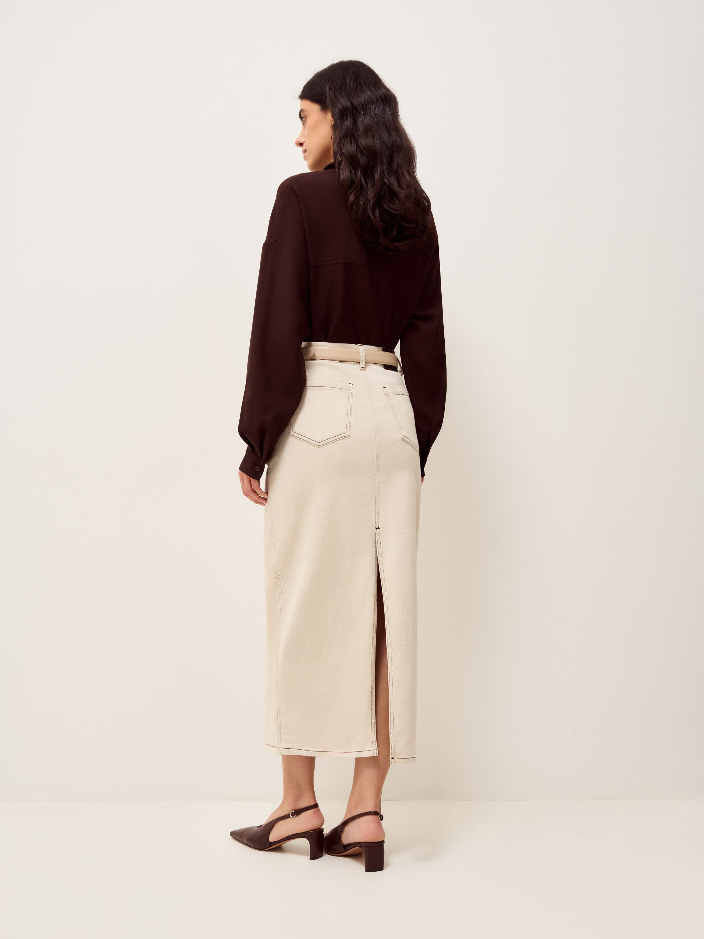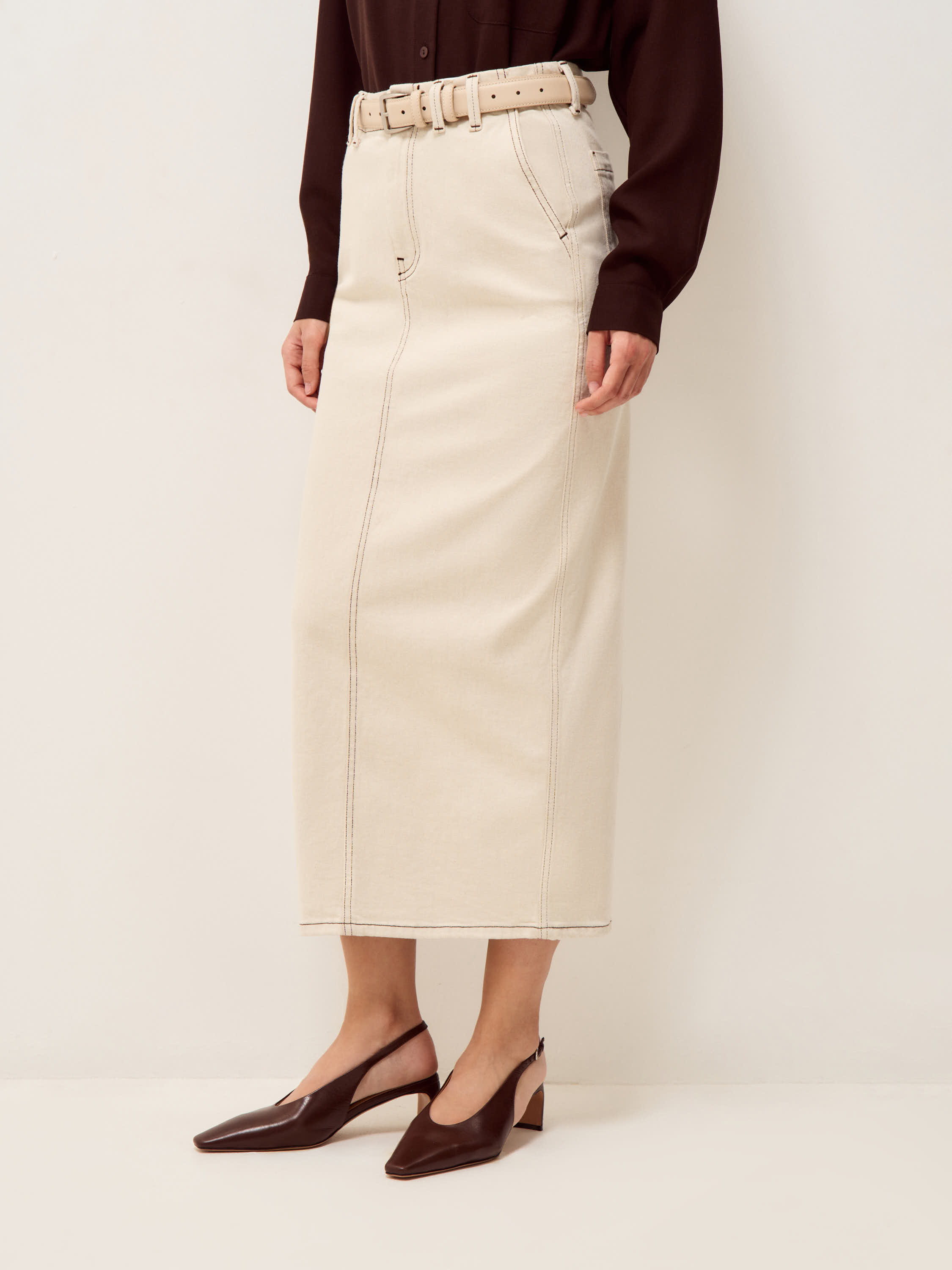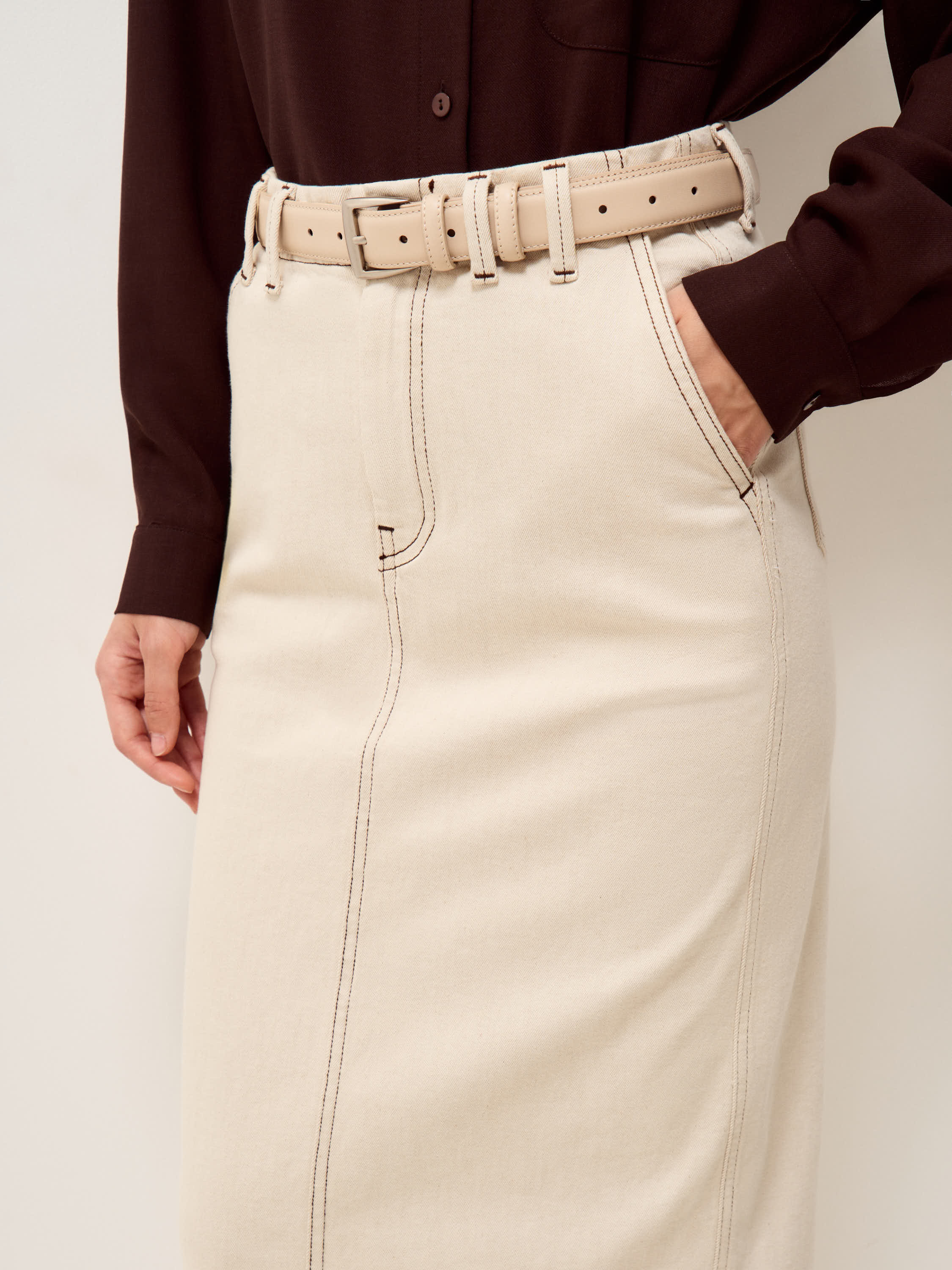 Юбка прямого силуэта с высокой посадкой и четко оформленной линией талии. Конструкция выстроена через рельефные швы, которые задают вертикаль и формируют аккуратную посадку по фигуре. Длина миди закрывает колено и сохраняет ровную линию низа. Сзади — разрез, обеспечивающий свободу движения и добавляющий функциональность. Пояс дополнен шлевками под ремень, карманы расположены сзади и поддерживают лаконичную структуру. Материал — плотный деним с характерной фактурой, держит форму и со временем становится мягче в носке. Светлый оттенок выглядит сдержанно и сочетается с базовой и более контрастной гаммой.