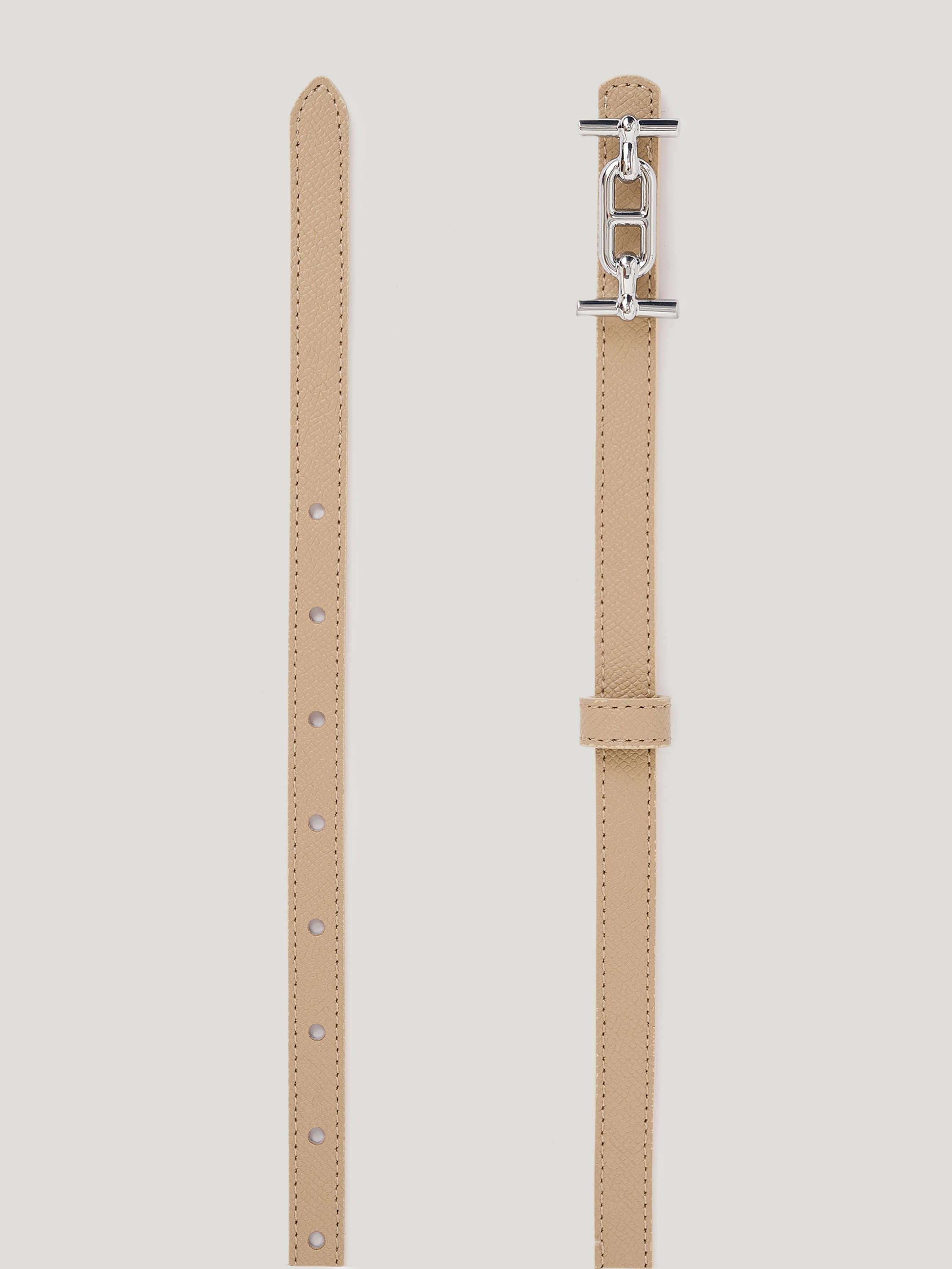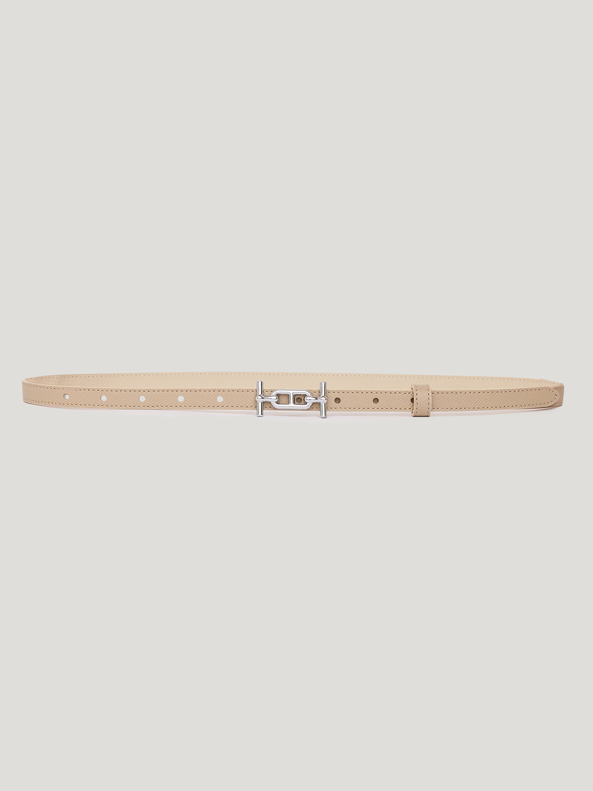 Ремень из натуральной кожи с выраженной зернистой фактурой. Поверхность плотная, сохраняет форму и аккуратный внешний вид при ежедневной носке. Регулируемая длина обеспечивается рядом отверстий, классическая шлевка фиксирует свободный край. Фурнитура в золотистом оттенке оформлена лаконично: центральный декоративный элемент в виде звена придает модели акцент, не перегружая конструкцию. Оттенок глубокий коричневый с теплым подтоном, легко сочетается с бежевой, молочной, темно-синей и графитовой палитрой. Ремень подходит для сочетаний с классическими брюками, денимом, а также может использоваться для акцента на талии поверх платья или жакета.