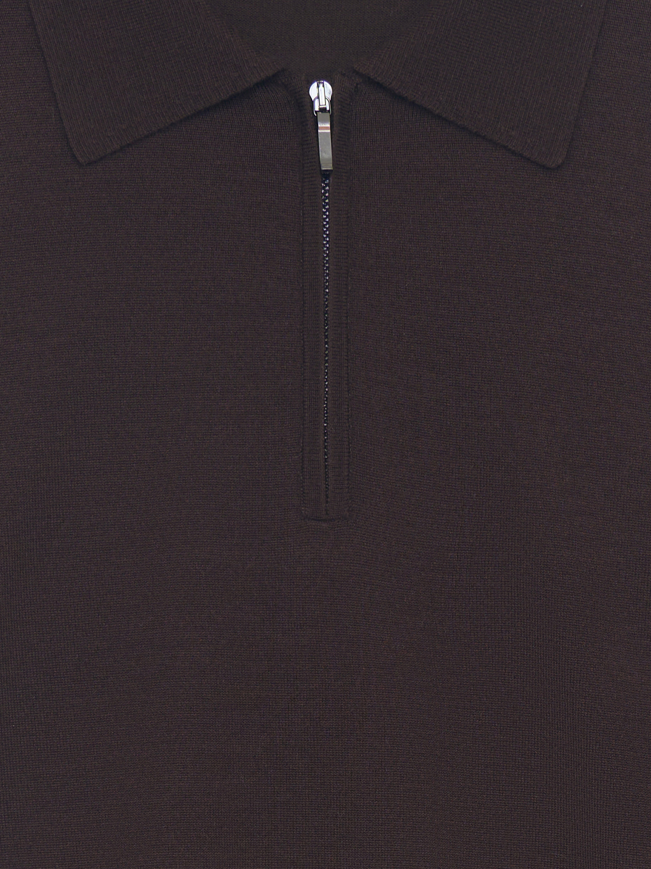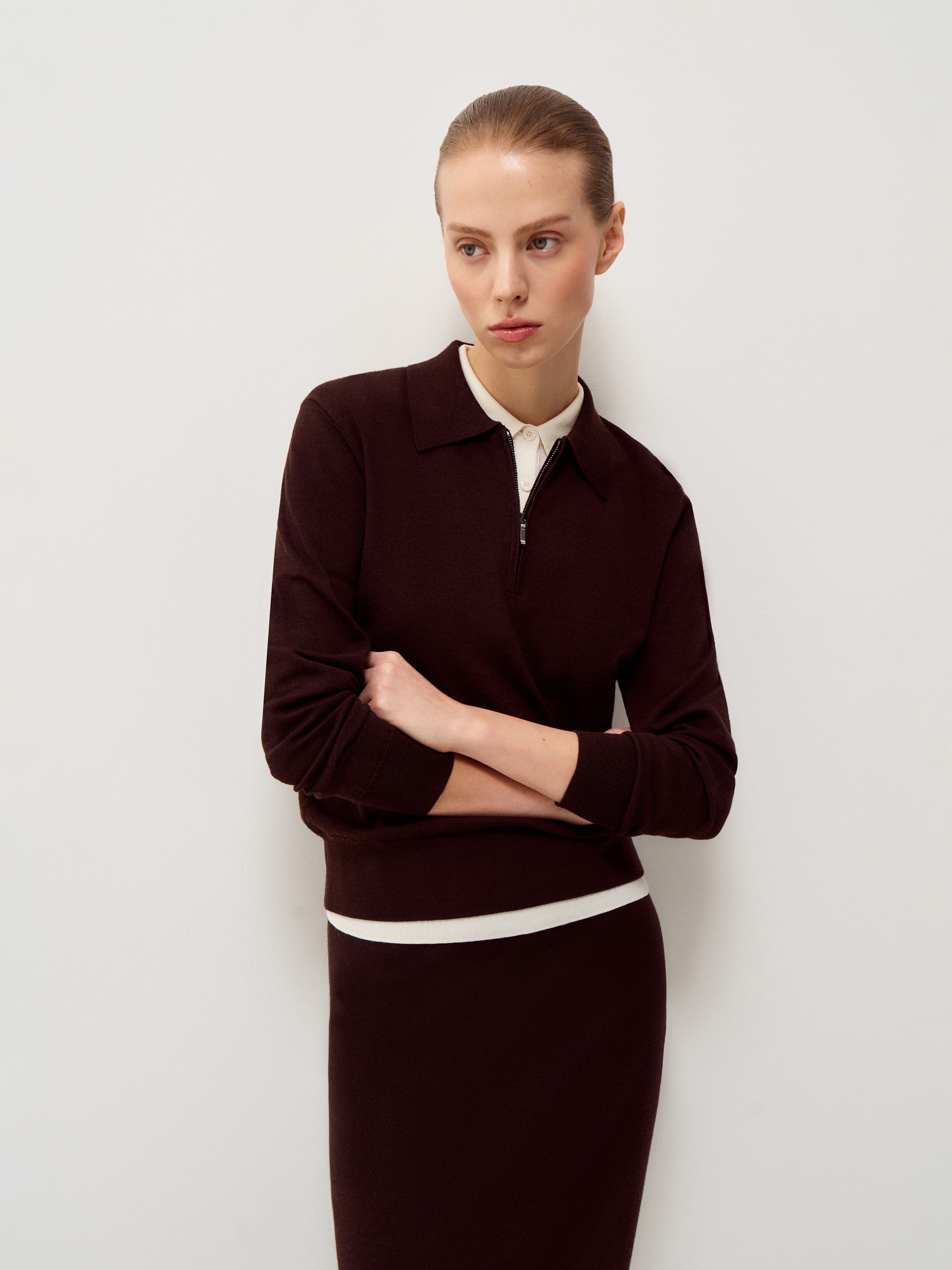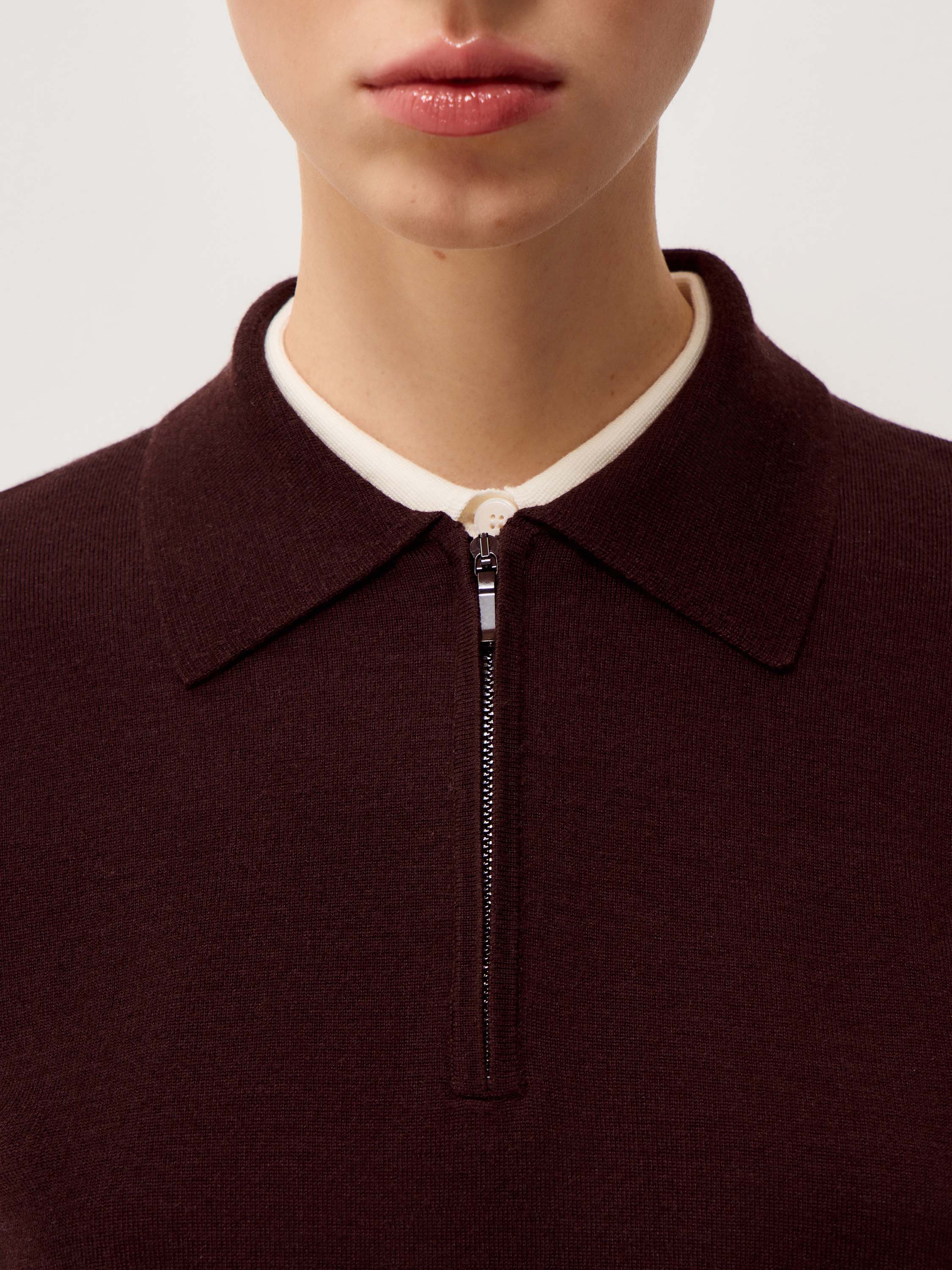 Джемпер выполнен из тонкого трикотажа на основе мериносовой шерсти с добавлением шелка. Полотно гладкое, мягкое, с деликатной матовой поверхностью и естественной пластичностью. Модель прямого кроя, без избыточного объема, с аккуратным отложным воротником и короткой молнией, которая позволяет варьировать глубину выреза. Рукава полной длины, манжеты и нижний край оформлены эластичной вязкой для аккуратной фиксации. Оттенок глубокий бордовый, с теплым винным подтоном, насыщенный и сдержанный, хорошо сочетается с молочными, кремовыми и темно-коричневыми тонами.