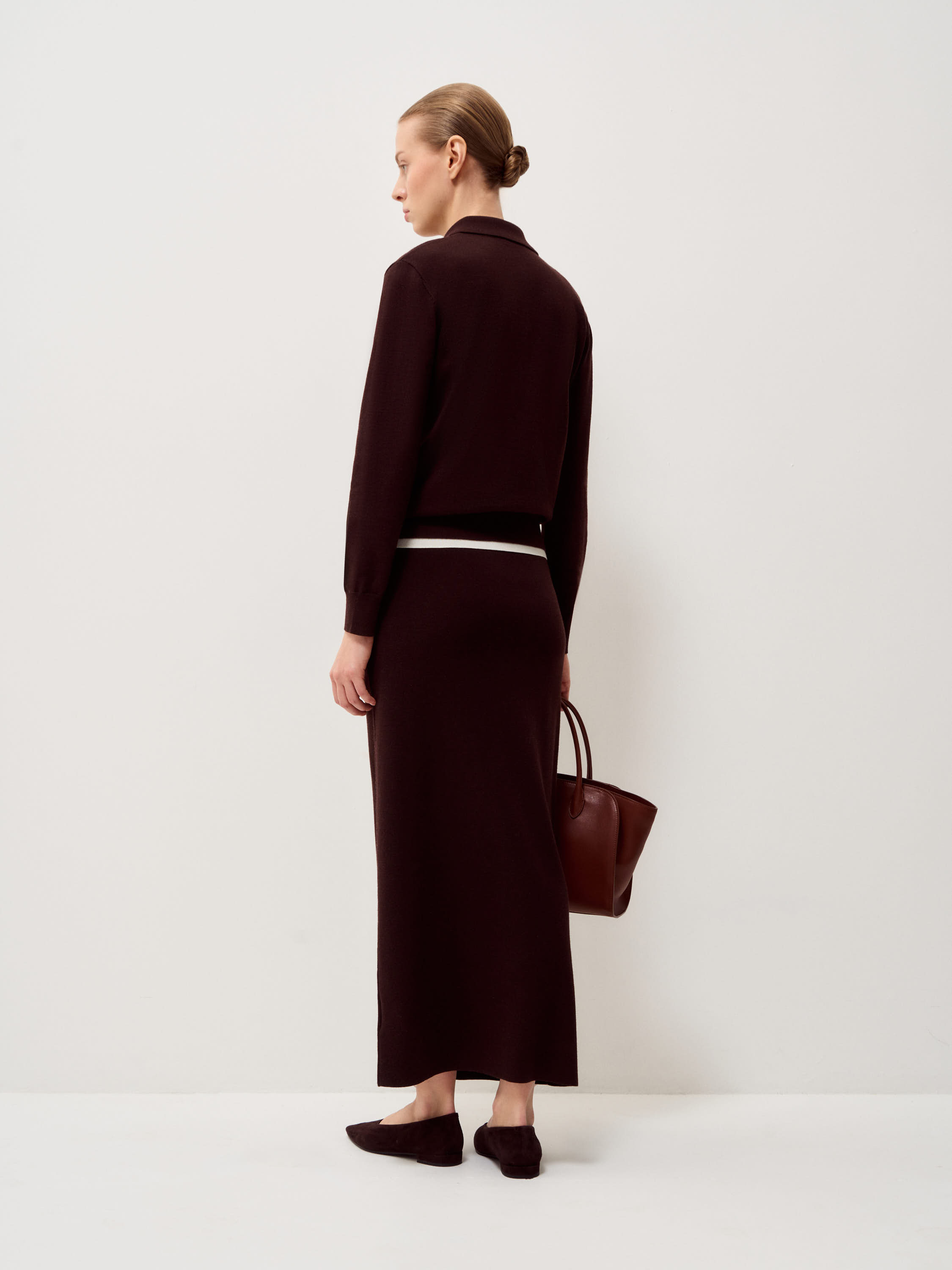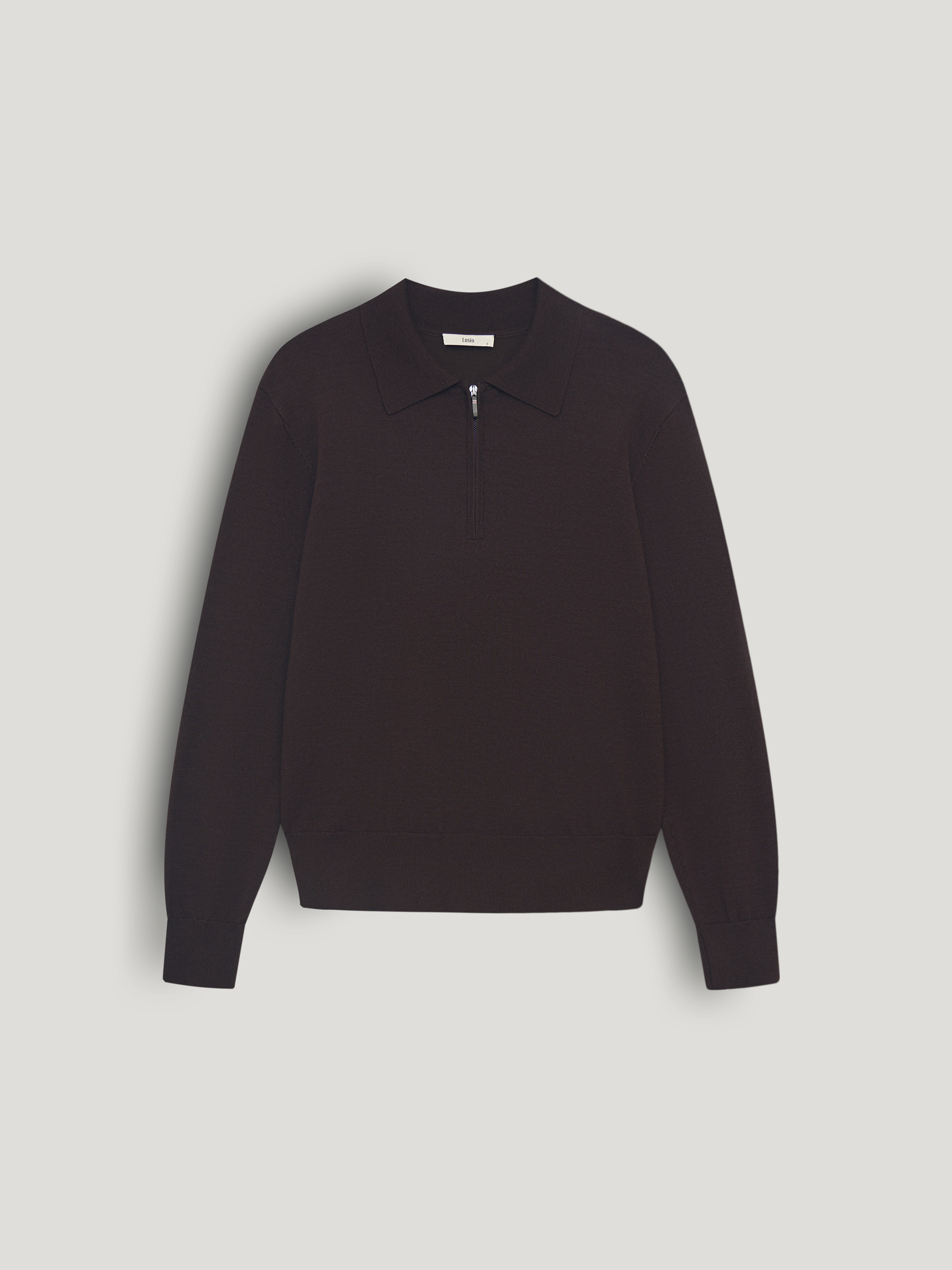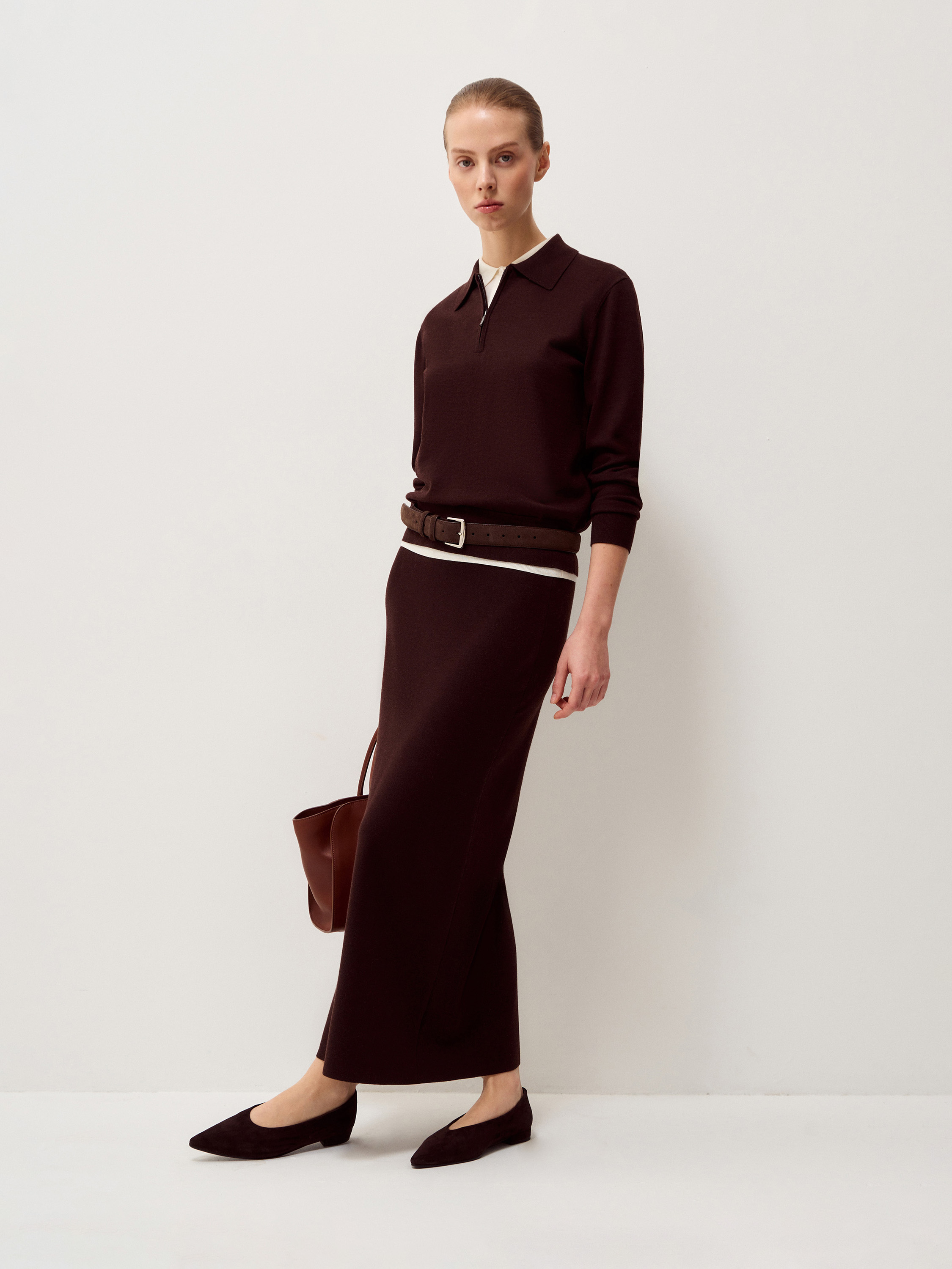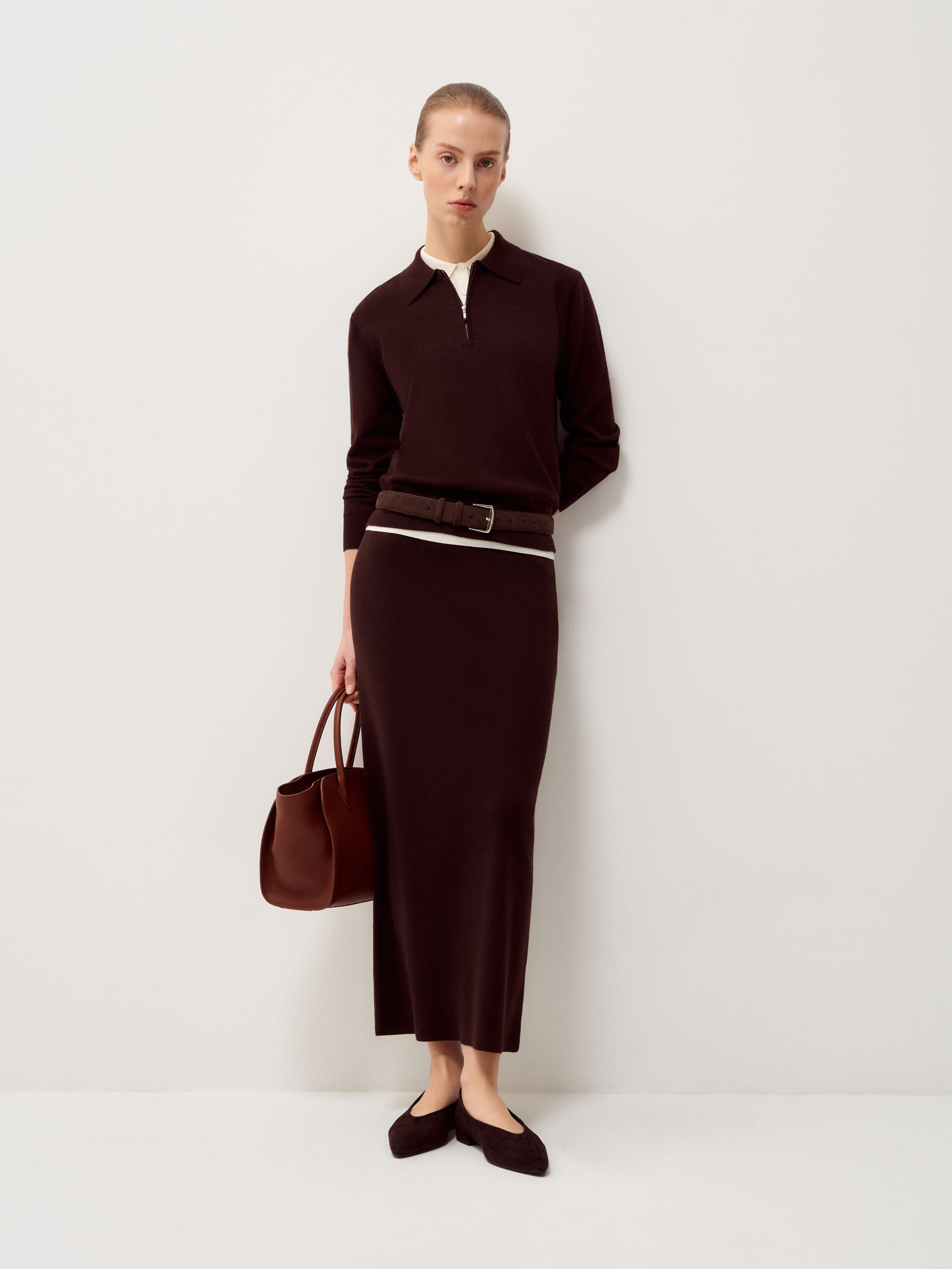 Джемпер выполнен из тонкого трикотажа на основе мериносовой шерсти с добавлением шелка. Полотно гладкое, мягкое, с деликатной матовой поверхностью и естественной пластичностью. Модель прямого кроя, без избыточного объема, с аккуратным отложным воротником и короткой молнией, которая позволяет варьировать глубину выреза. Рукава полной длины, манжеты и нижний край оформлены эластичной вязкой для аккуратной фиксации. Оттенок глубокий бордовый, с теплым винным подтоном, насыщенный и сдержанный, хорошо сочетается с молочными, кремовыми и темно-коричневыми тонами.