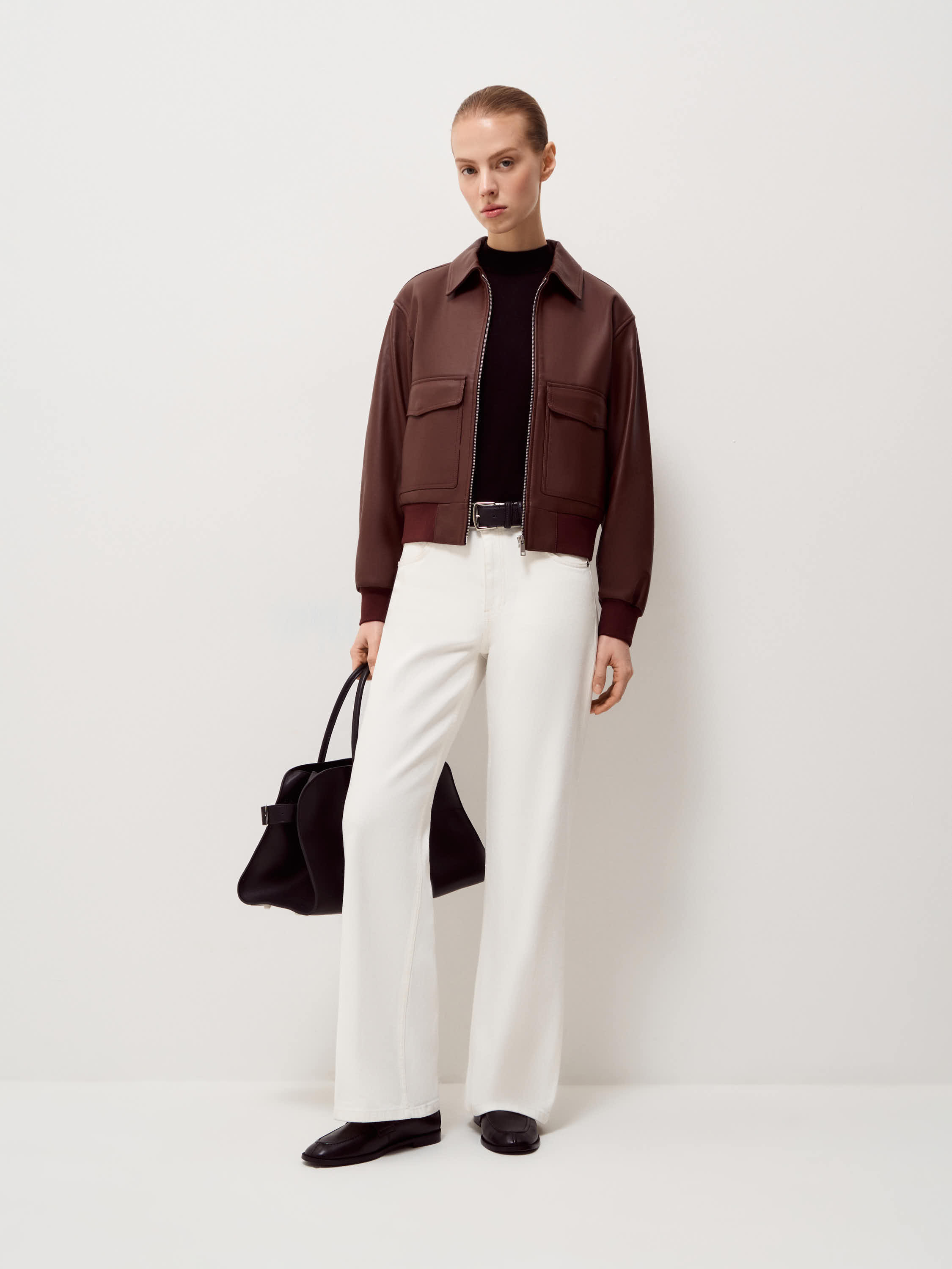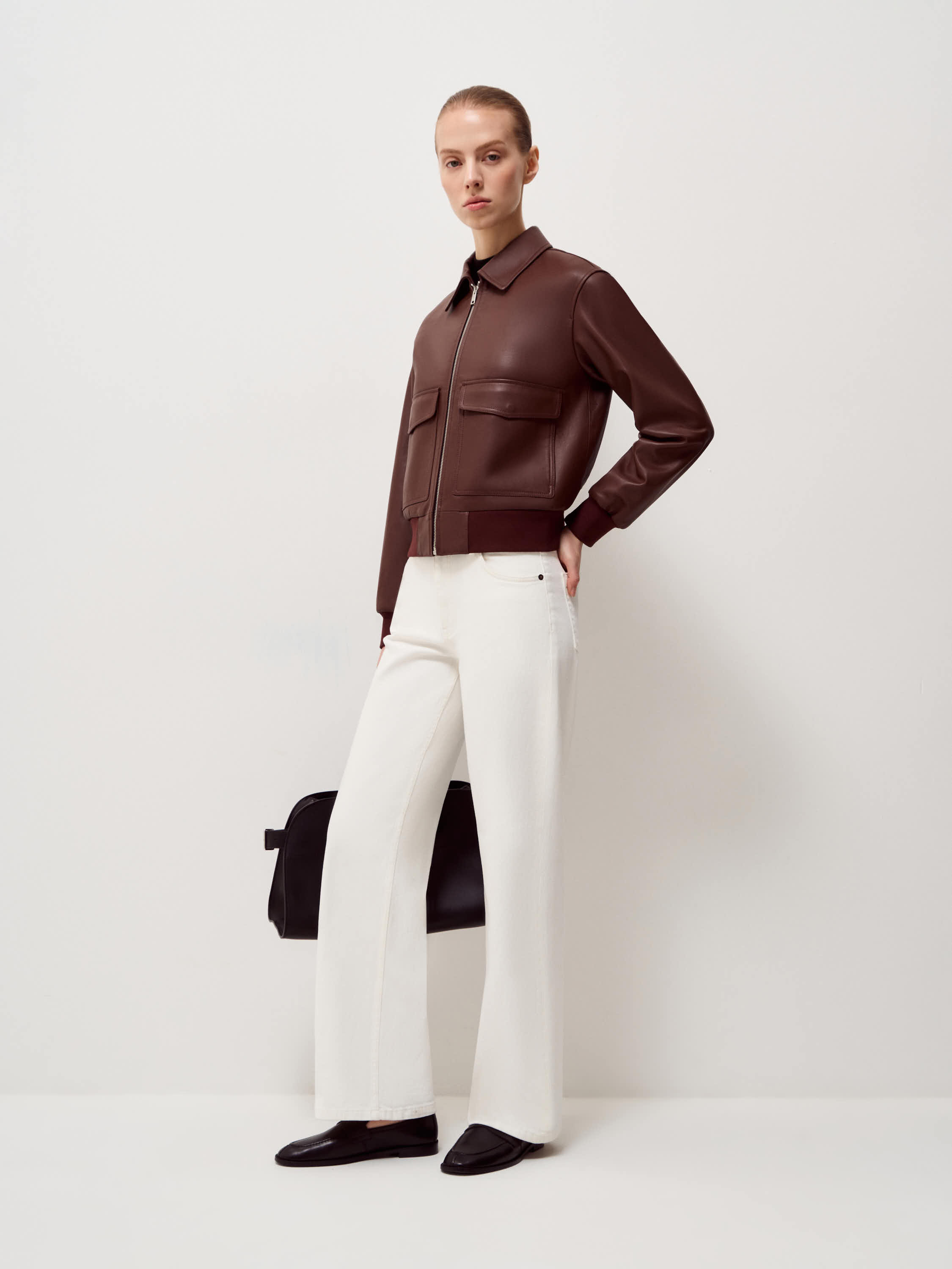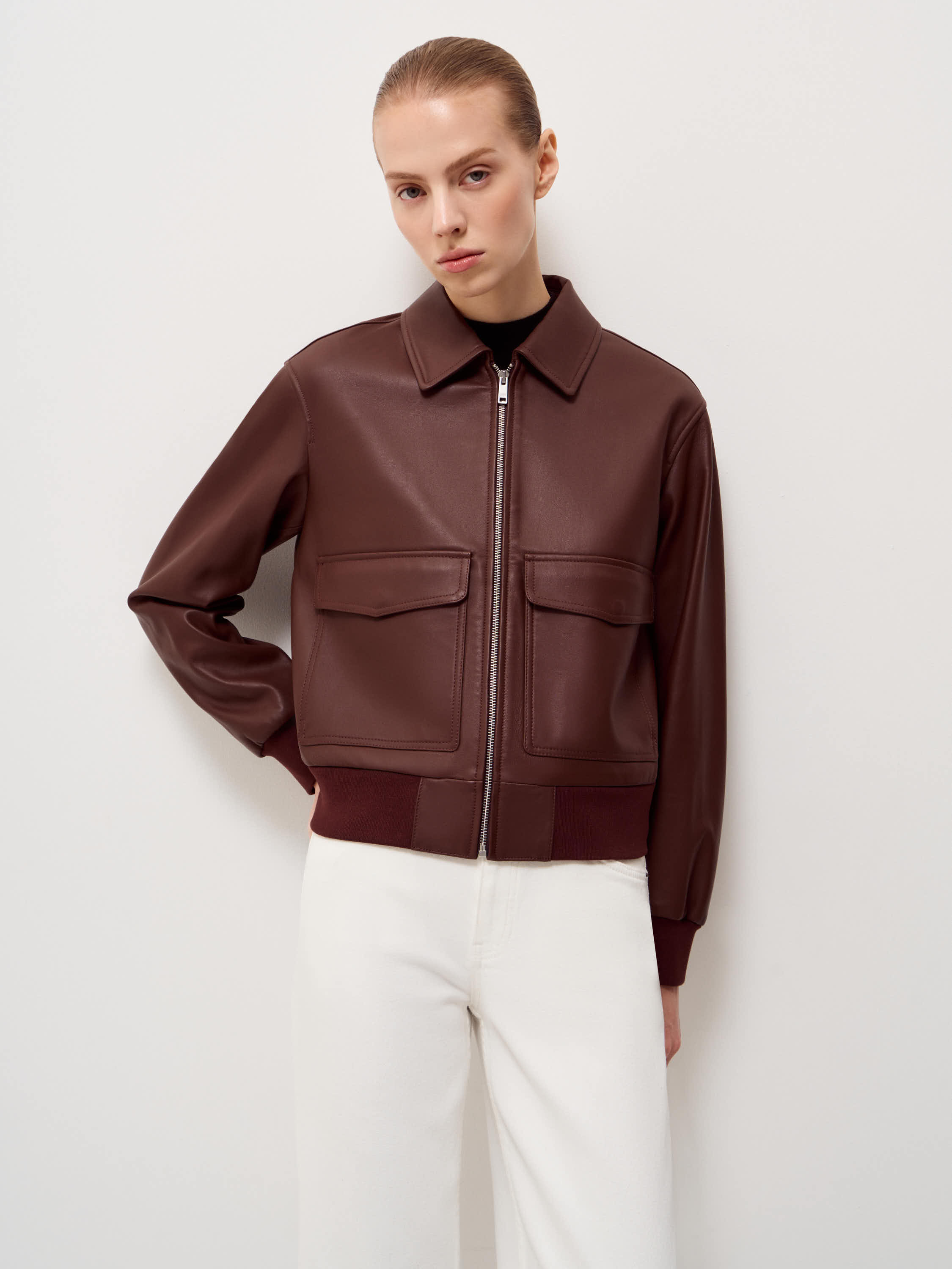 Куртка выполнена из натуральной кожи с гладкой поверхностью и выраженной фактурой. Материал упругий, держит форму и выглядит аккуратно в носке. Модель построена по принципу бомбера: прямой силуэт, застежка на молнию, эластичные манжеты и пояс, формирующие четкую линию низа и рукавов. Классический отложной воротник добавляет конструкции ясность и балансирует объем. На передней части расположены два накладных кармана с клапанами, которые усиливают архитектуру модели и делают силуэт более собранным. Оттенок теплый коричневый с коньячным подтоном. Он сочетается с денимом, шерстяными брюками и светлым трикотажем, формируя выверенные повседневные образы.