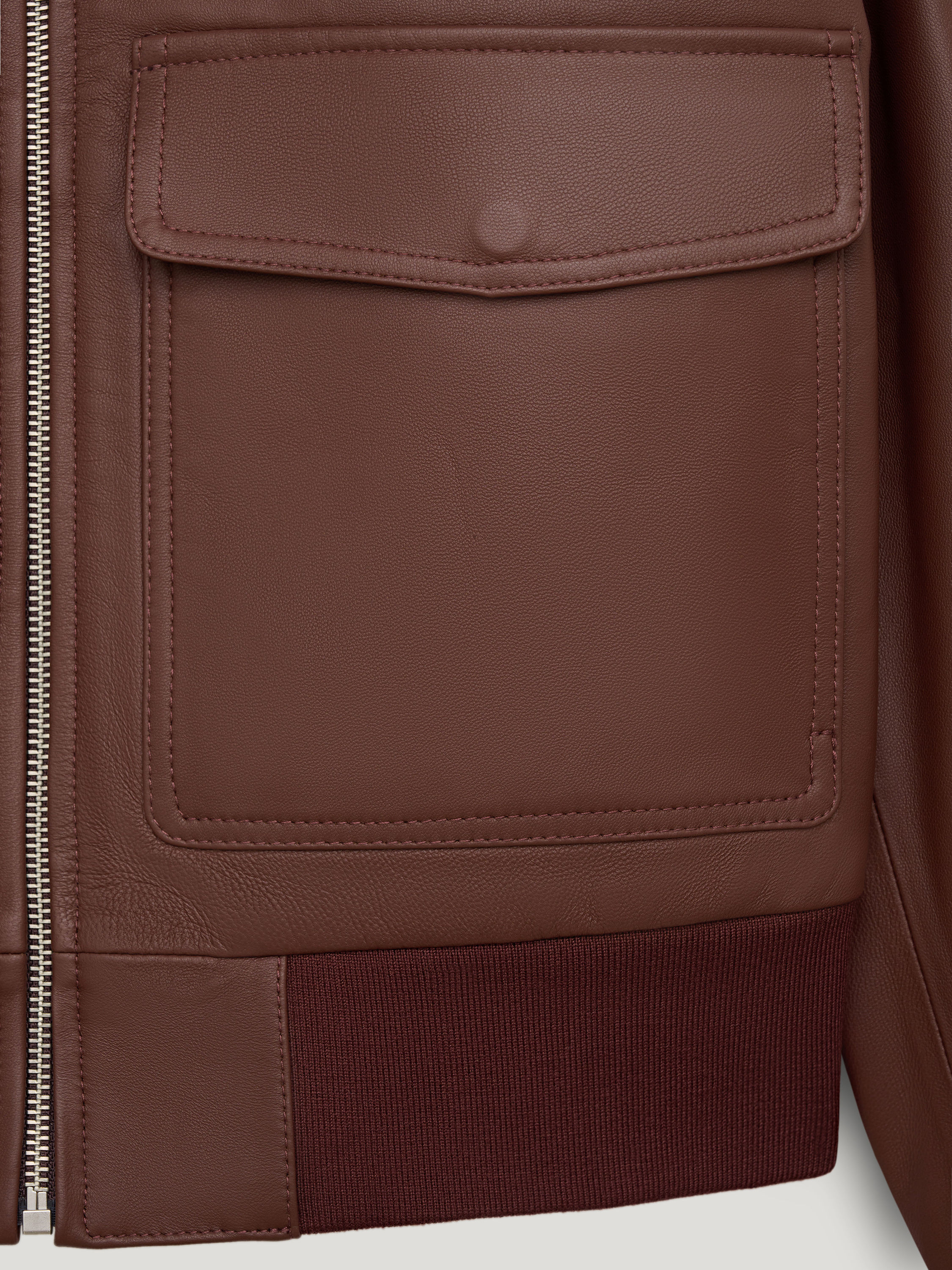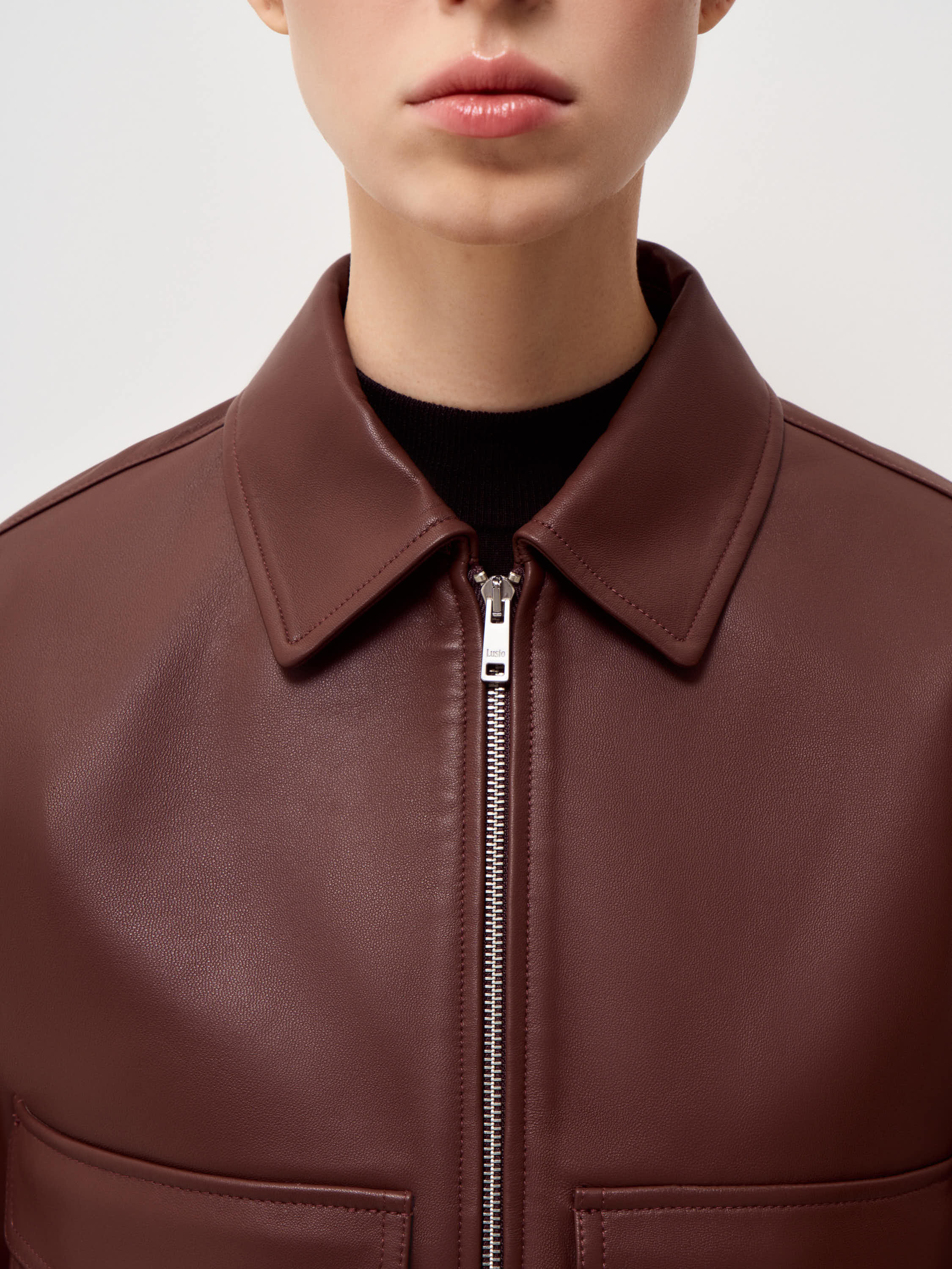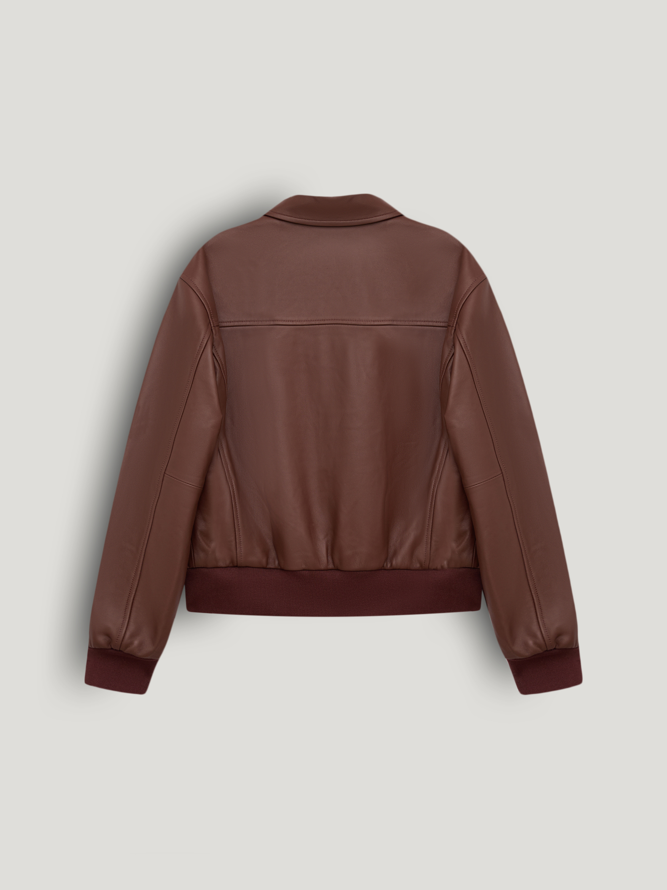 Куртка выполнена из натуральной кожи с гладкой поверхностью и выраженной фактурой. Материал упругий, держит форму и выглядит аккуратно в носке. Модель построена по принципу бомбера: прямой силуэт, застежка на молнию, эластичные манжеты и пояс, формирующие четкую линию низа и рукавов. Классический отложной воротник добавляет конструкции ясность и балансирует объем. На передней части расположены два накладных кармана с клапанами, которые усиливают архитектуру модели и делают силуэт более собранным. Оттенок теплый коричневый с коньячным подтоном. Он сочетается с денимом, шерстяными брюками и светлым трикотажем, формируя выверенные повседневные образы.