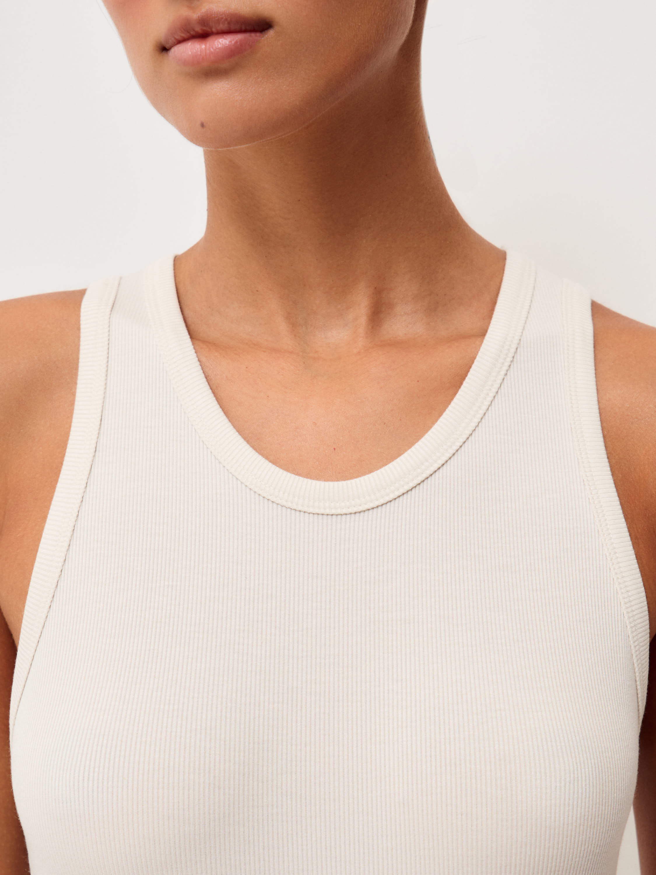 Топ прилегающего силуэта выполнен из смесового материала на основе модала с добавлением шелка и эластана. Модал придает ткани гладкость и мягкость, делает ее особенно приятной на ощупь и позволяет материалу красиво прилегать к телу. Шелк добавляет деликатный природный блеск и повышает тактильный комфорт, а эластан обеспечивает необходимую эластичность и поддерживает форму изделия. Материал отличается мягкой, гладкой фактурой и хорошо тянется, благодаря чему топ аккуратно садится по фигуре и удобен в повседневной носке. Лаконичный крой с округлой линией горловины и широкими бретелями подчеркивает чистоту силуэта и делает модель универсальной основой для многослойных комплектов.